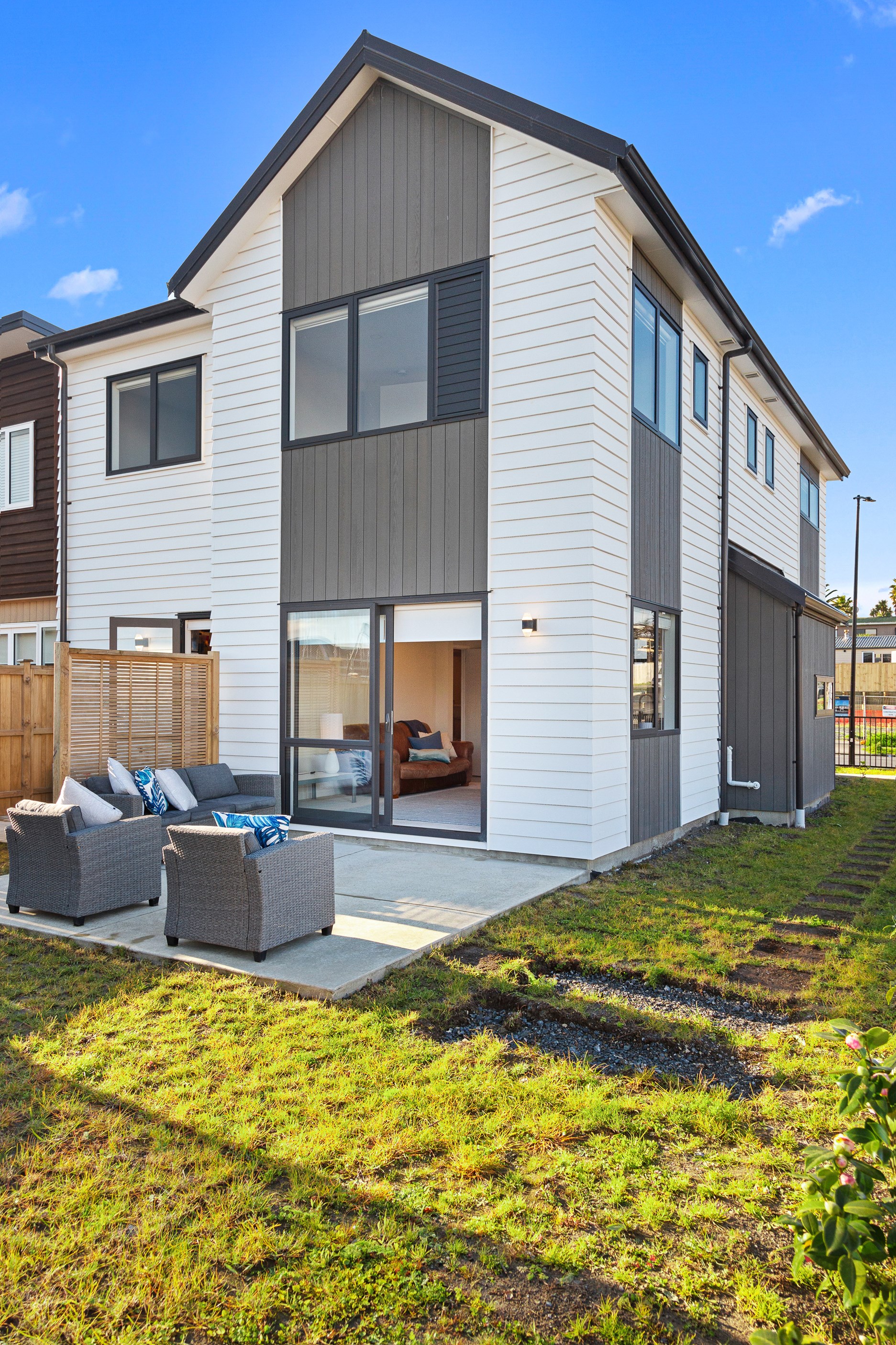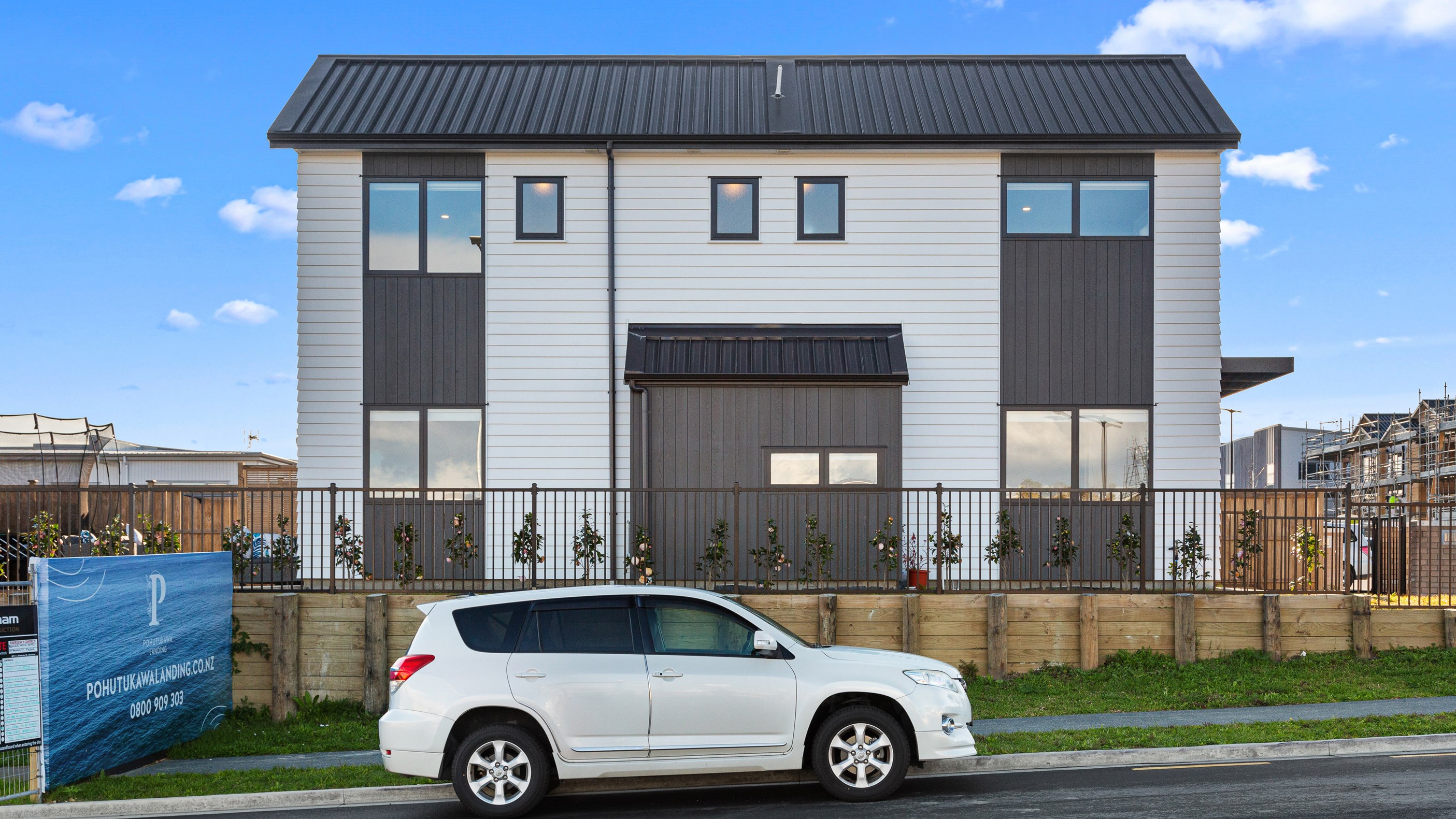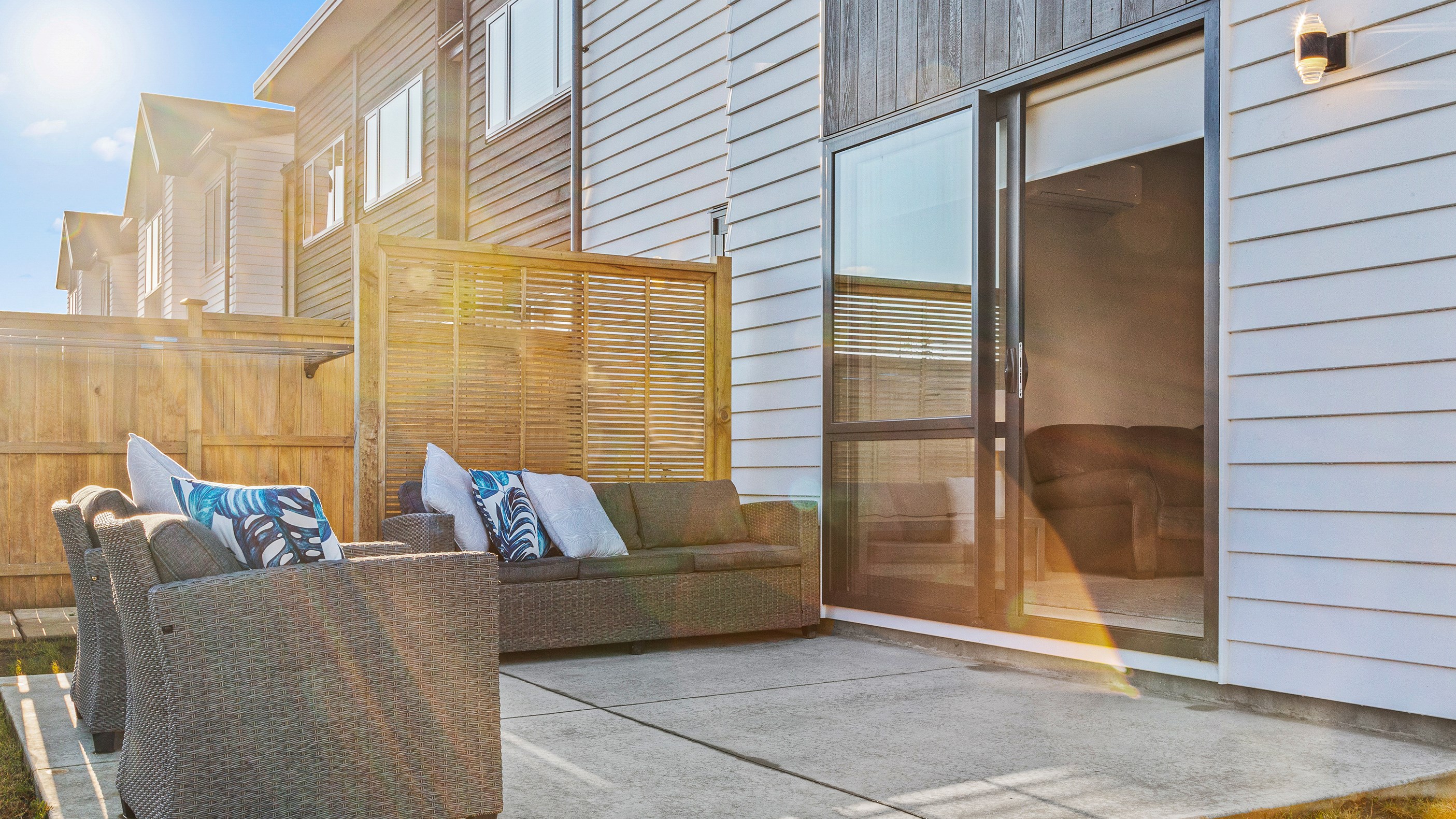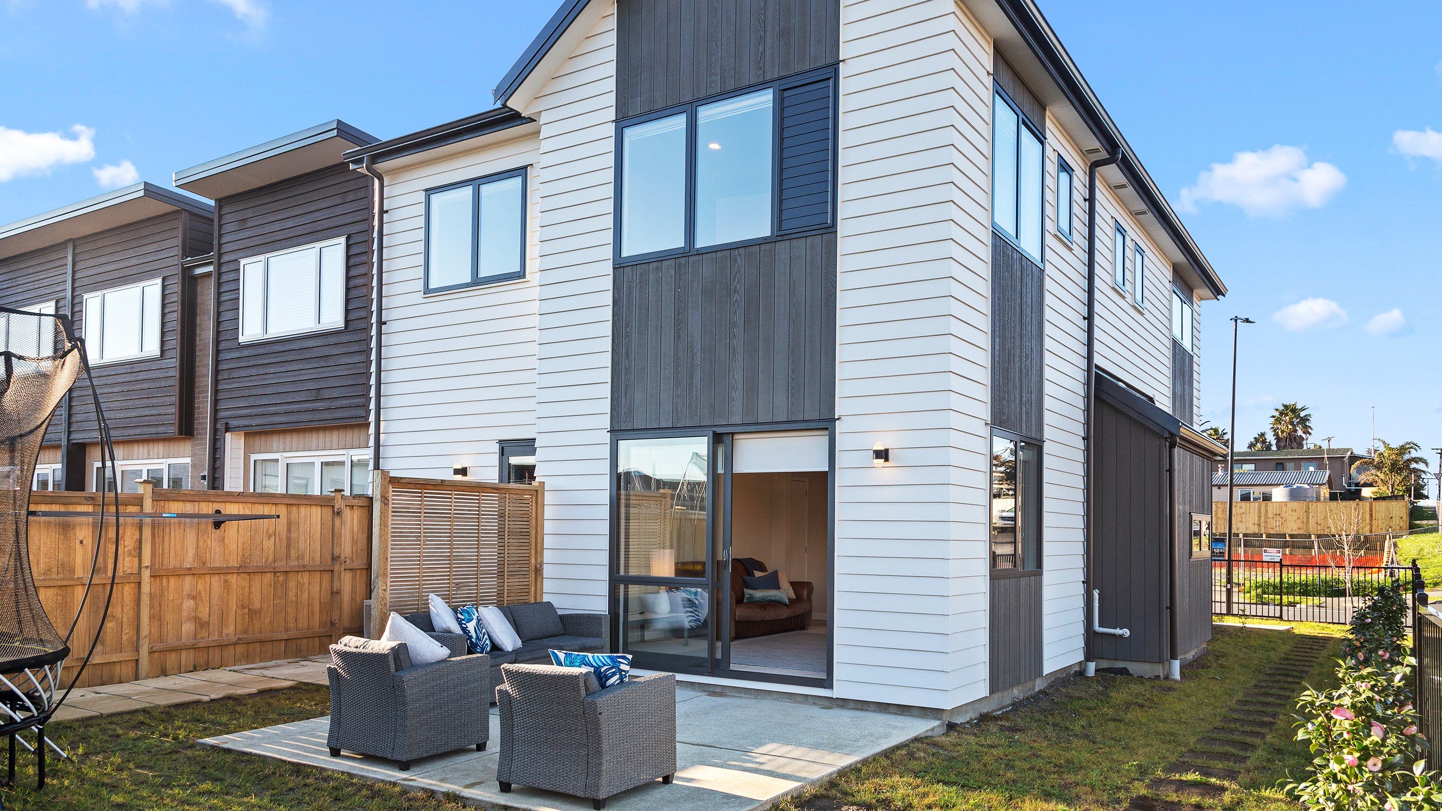 Three four-bedroom and five two-bedroom homes come covered in three distinct types of cladding – Abodo timber, James Hardie Linea weatherboards and vertical shiplap. The roofing is Colorsteel Maxx.