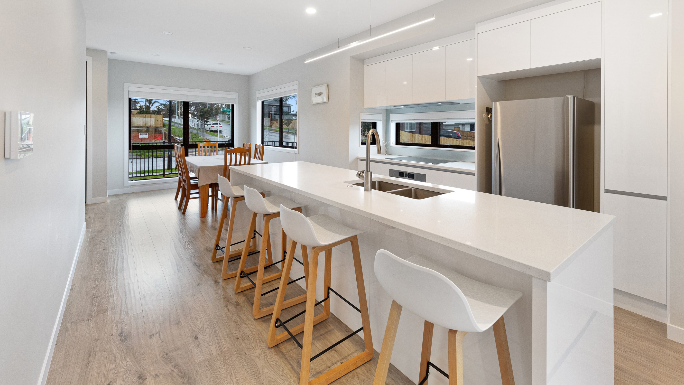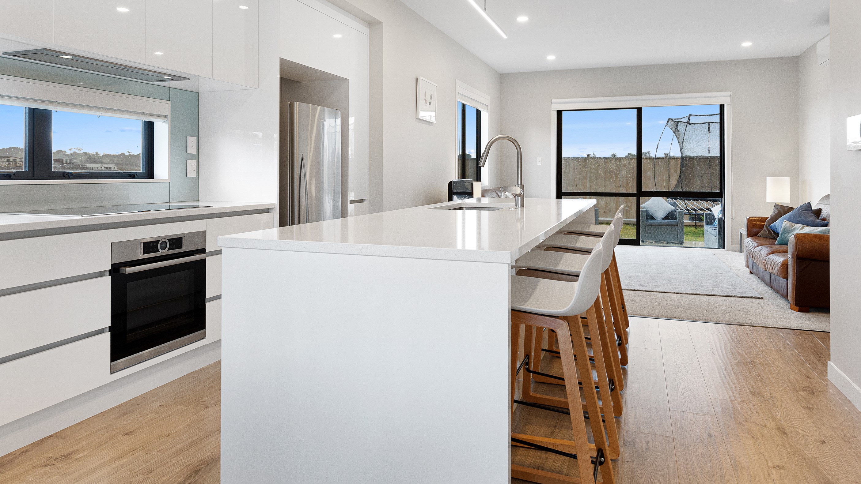 Kitchens have a sleek design with double sinks, soft-close cabinetry and hidden elements, all combining to help maintain a sense of cohesion in the light, airy open-plan area. The island is ideal for family breakfasts
