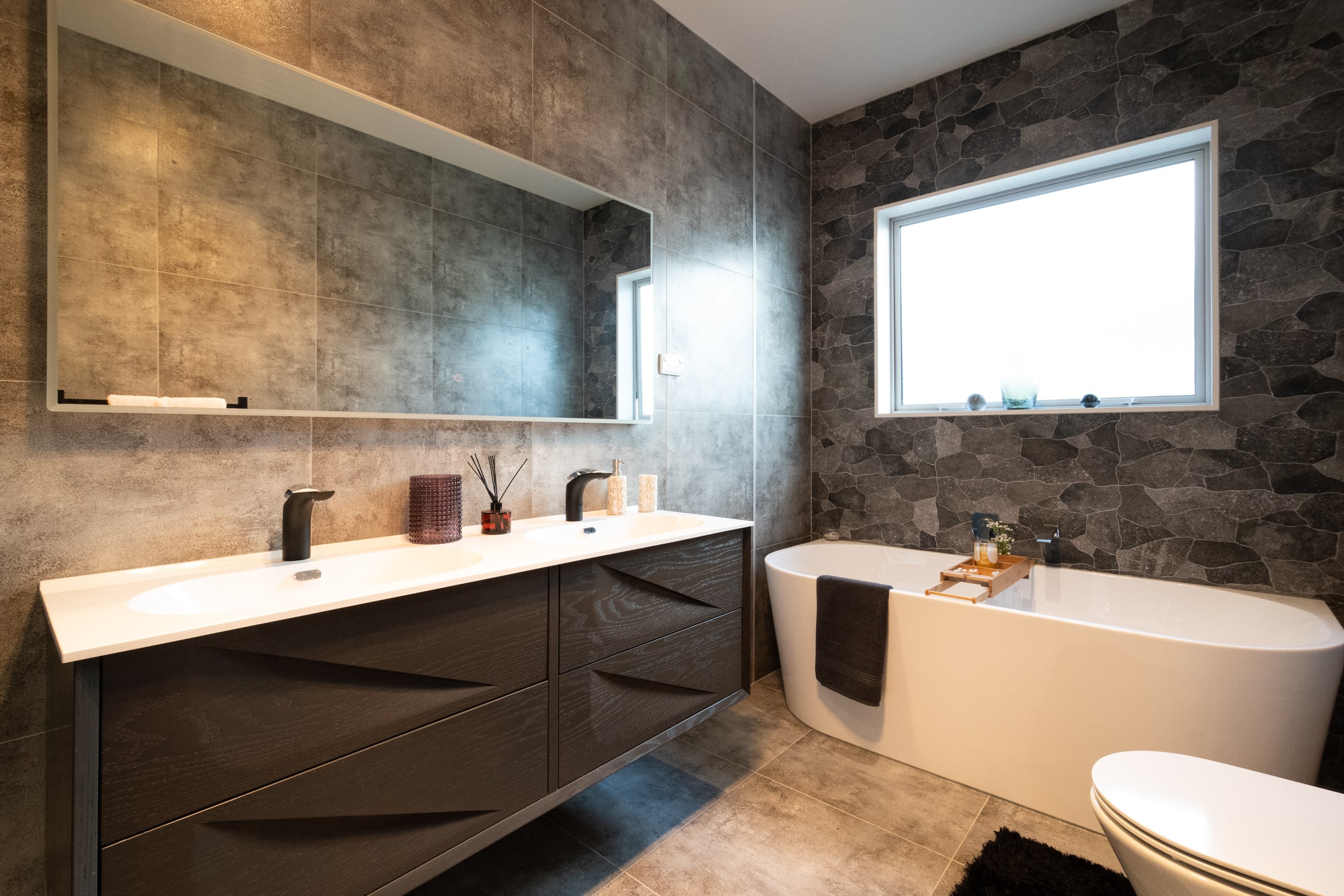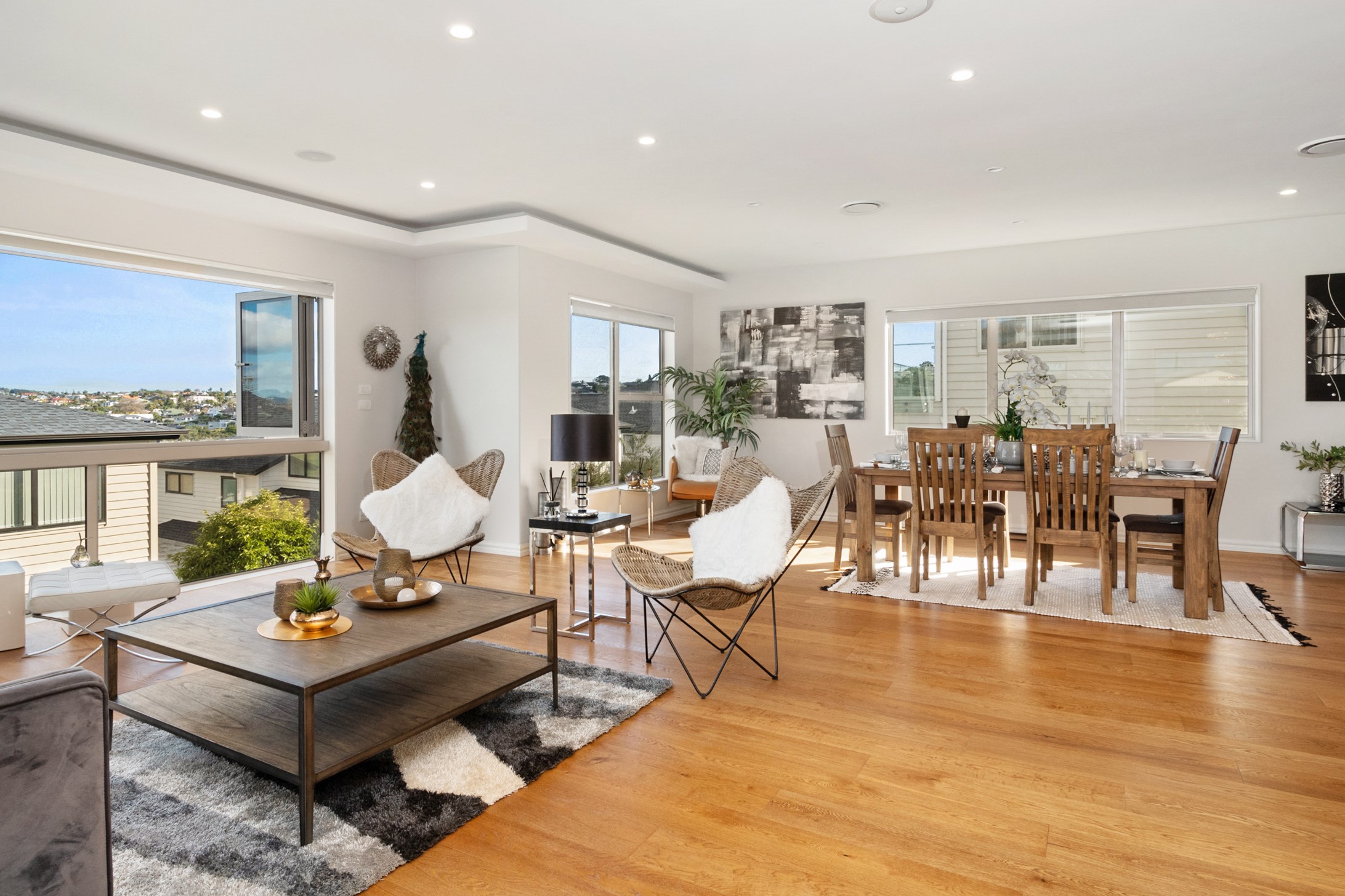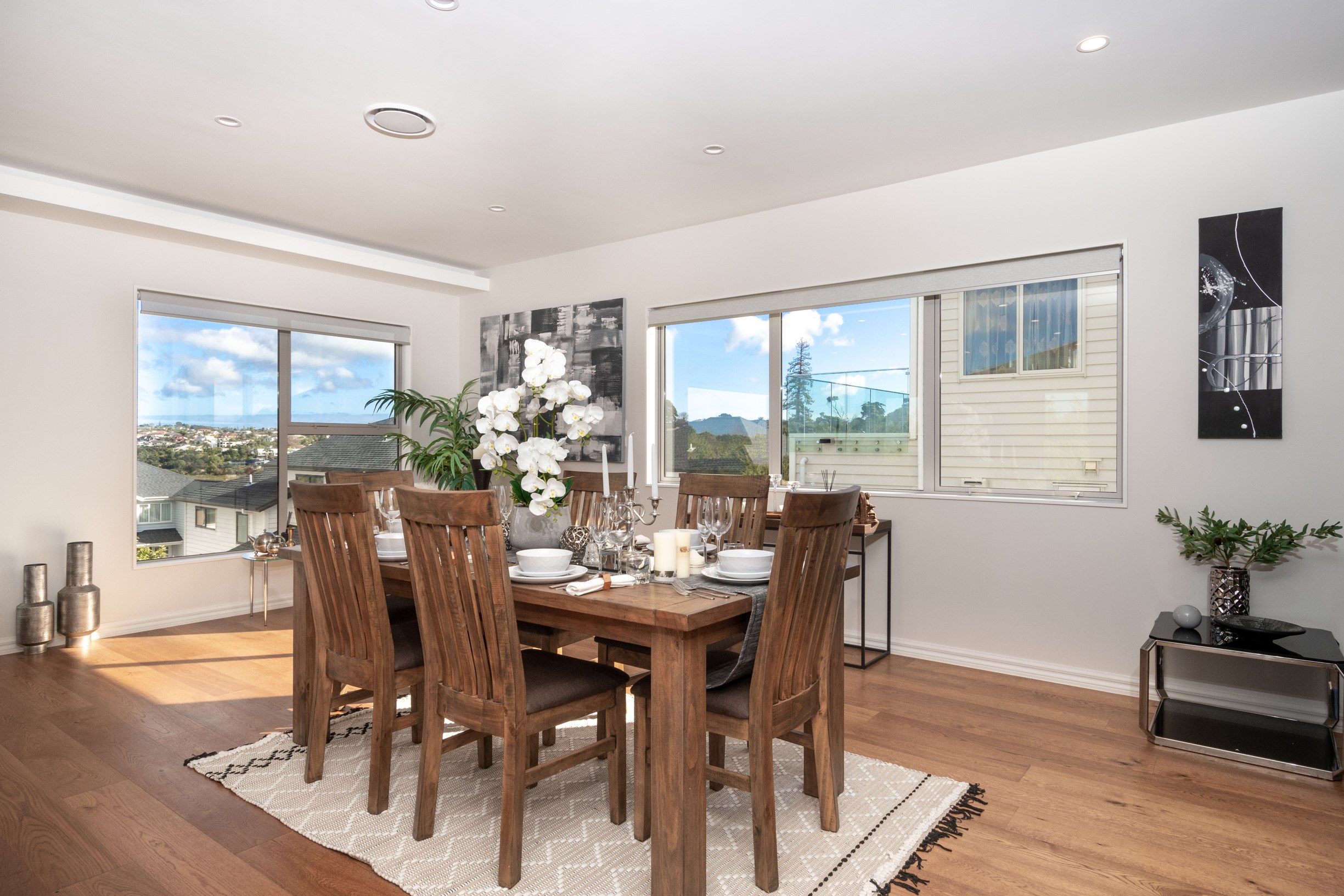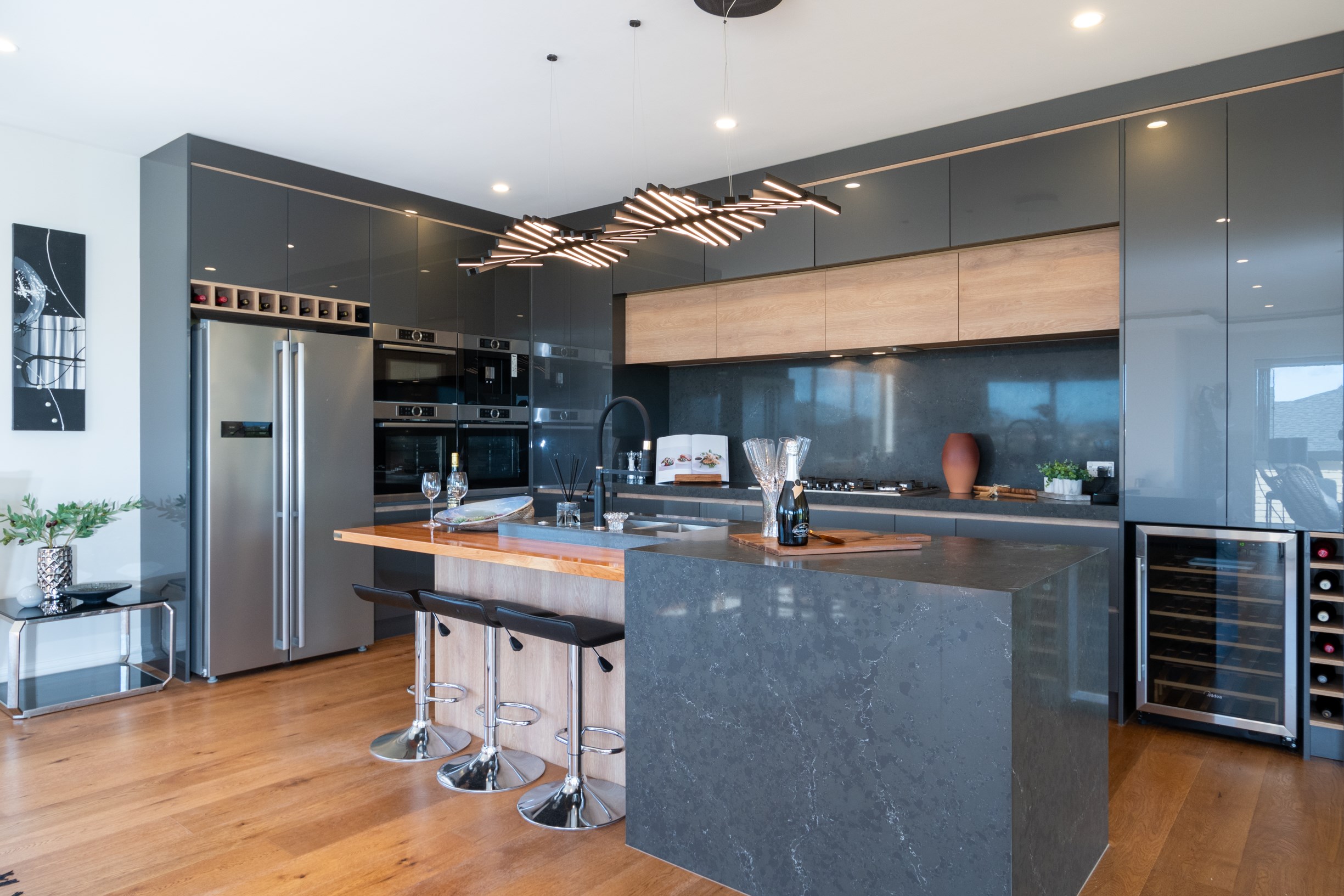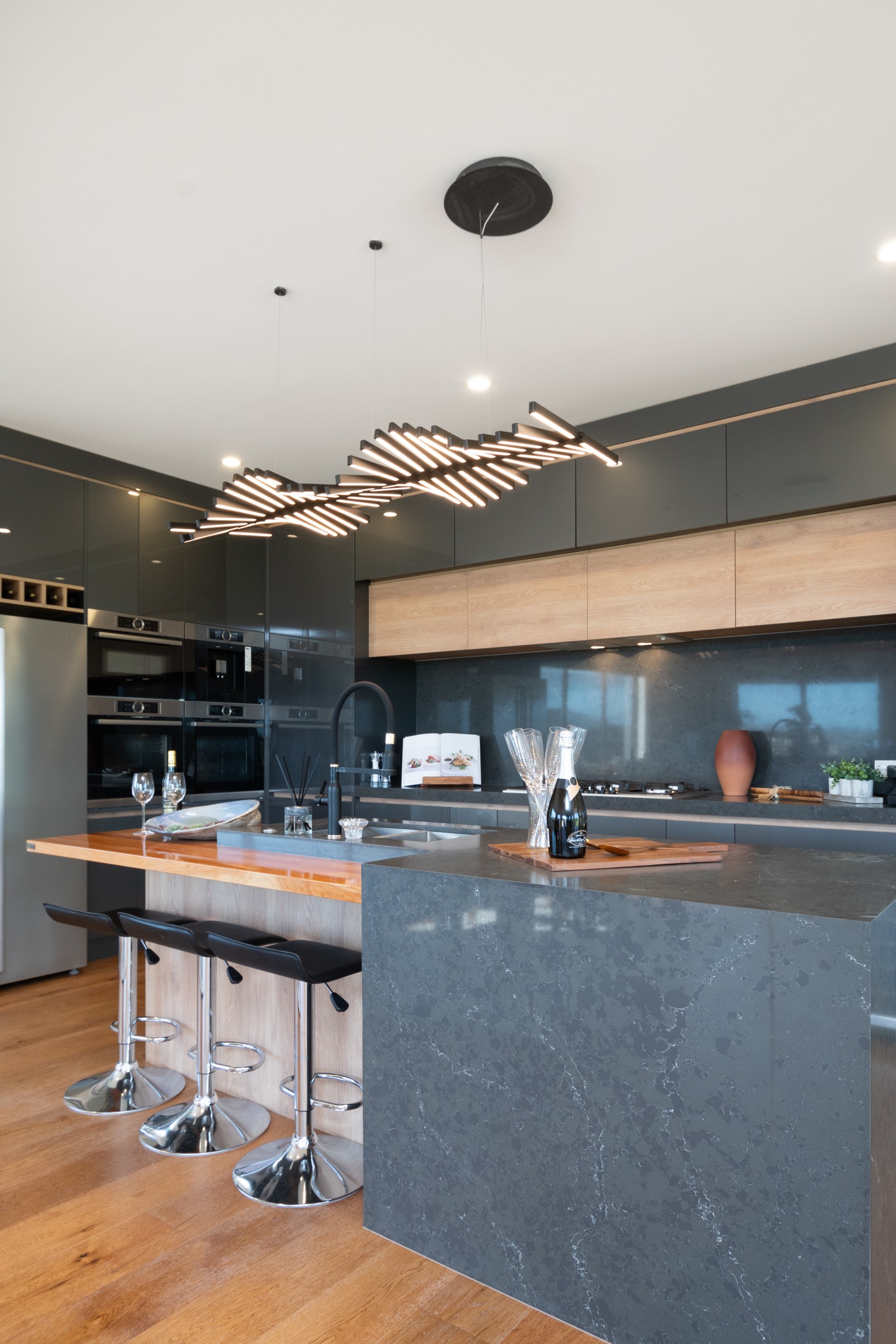 Upstairs is the heart of this modern family home – the living area and kitchen. These areas are bathed in sunlight and enjoy elevated views. In the gleaming kitchen there’s plenty of bench space – ideal for smooth work flow. Storage is easy to access, while seating at the island is perfect for those who want to be part of this dark, high-gloss, attractive space.