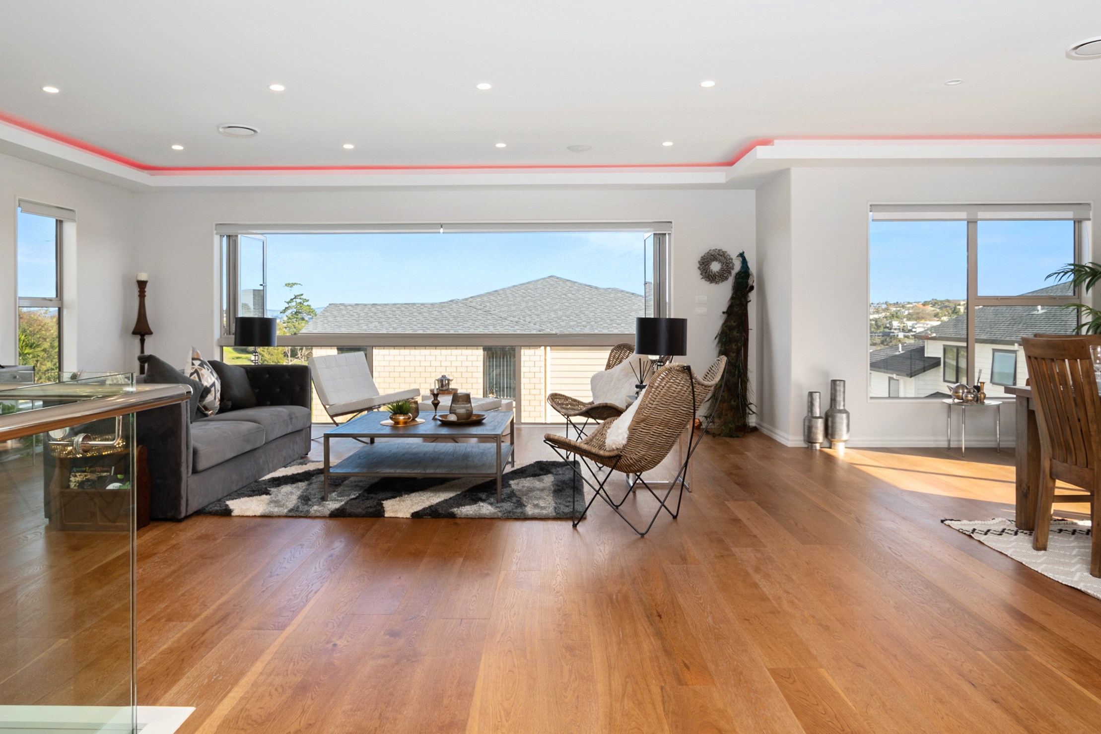 The moment you step into this builder’s home, you’ll notice the space. The contemporary split-level house has plenty of it over three floors: six bedrooms, four bathrooms and two living spaces.
