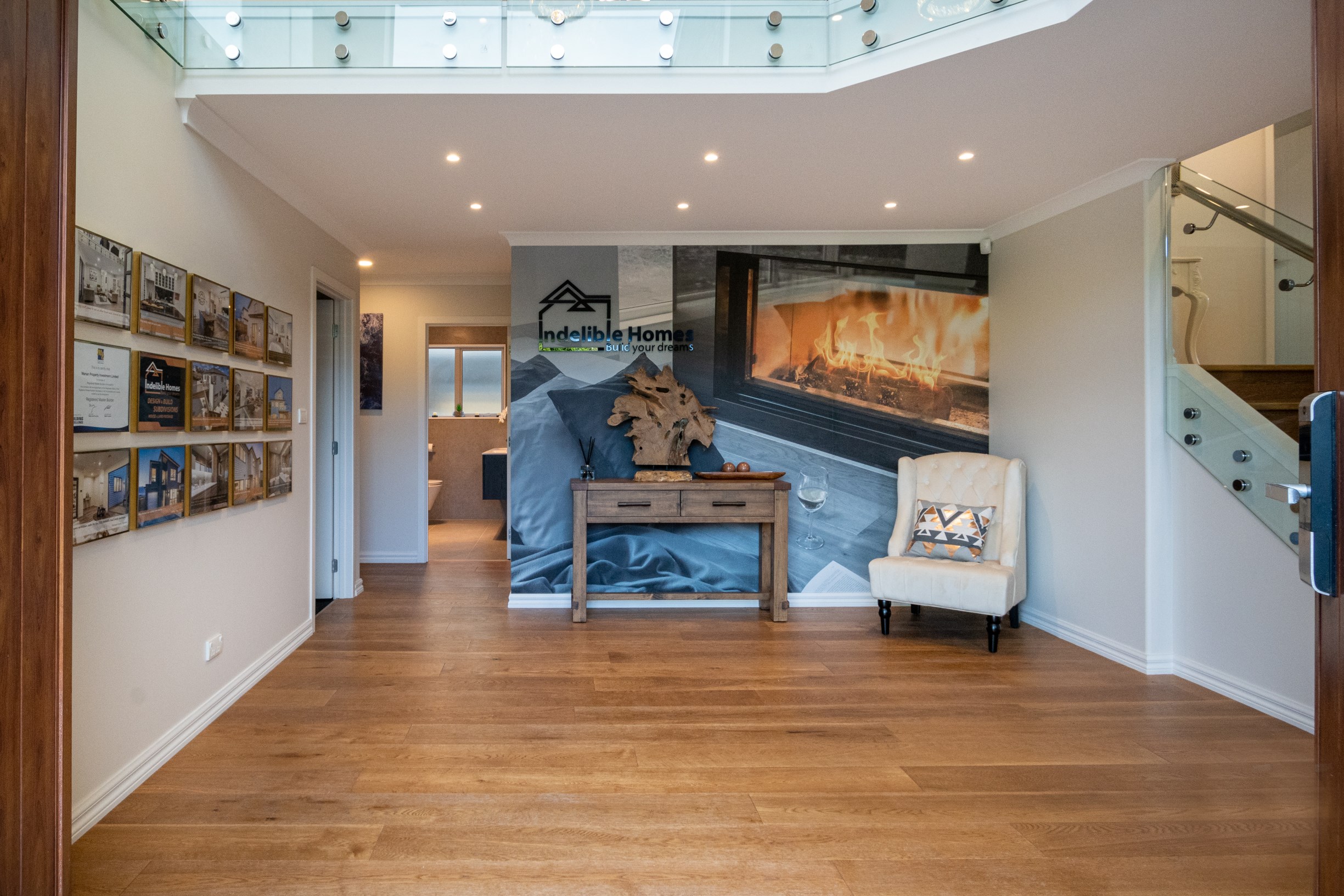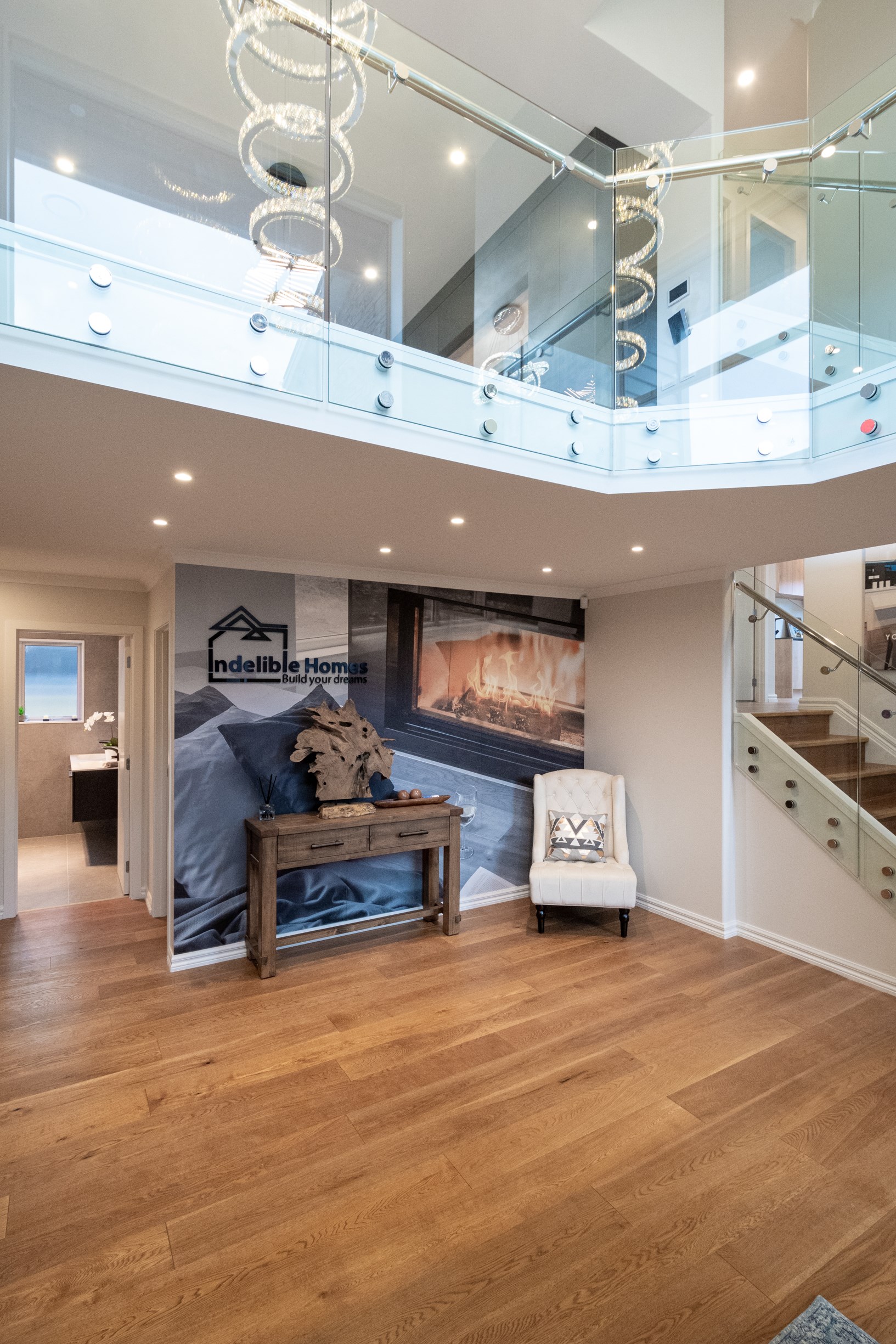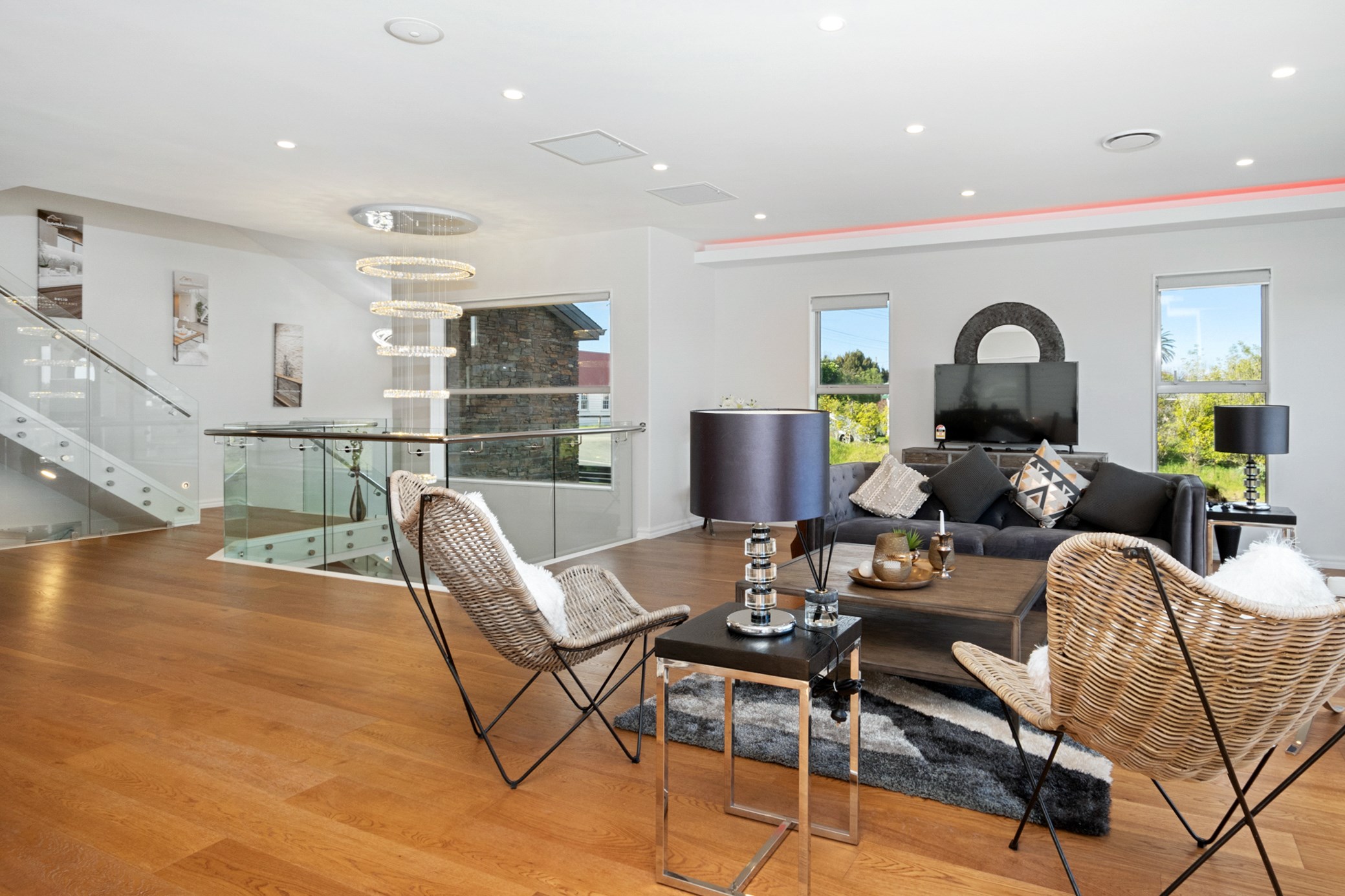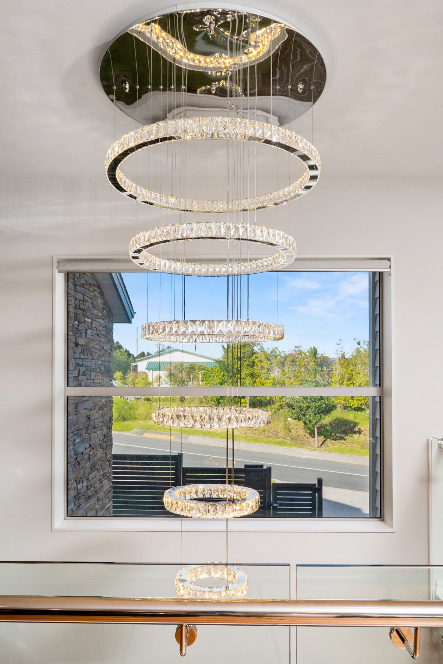 A light-filled stairwell anchors the house and features one of the statement lighting pieces that are showcased. For convenience, smart technology has been installed throughout.