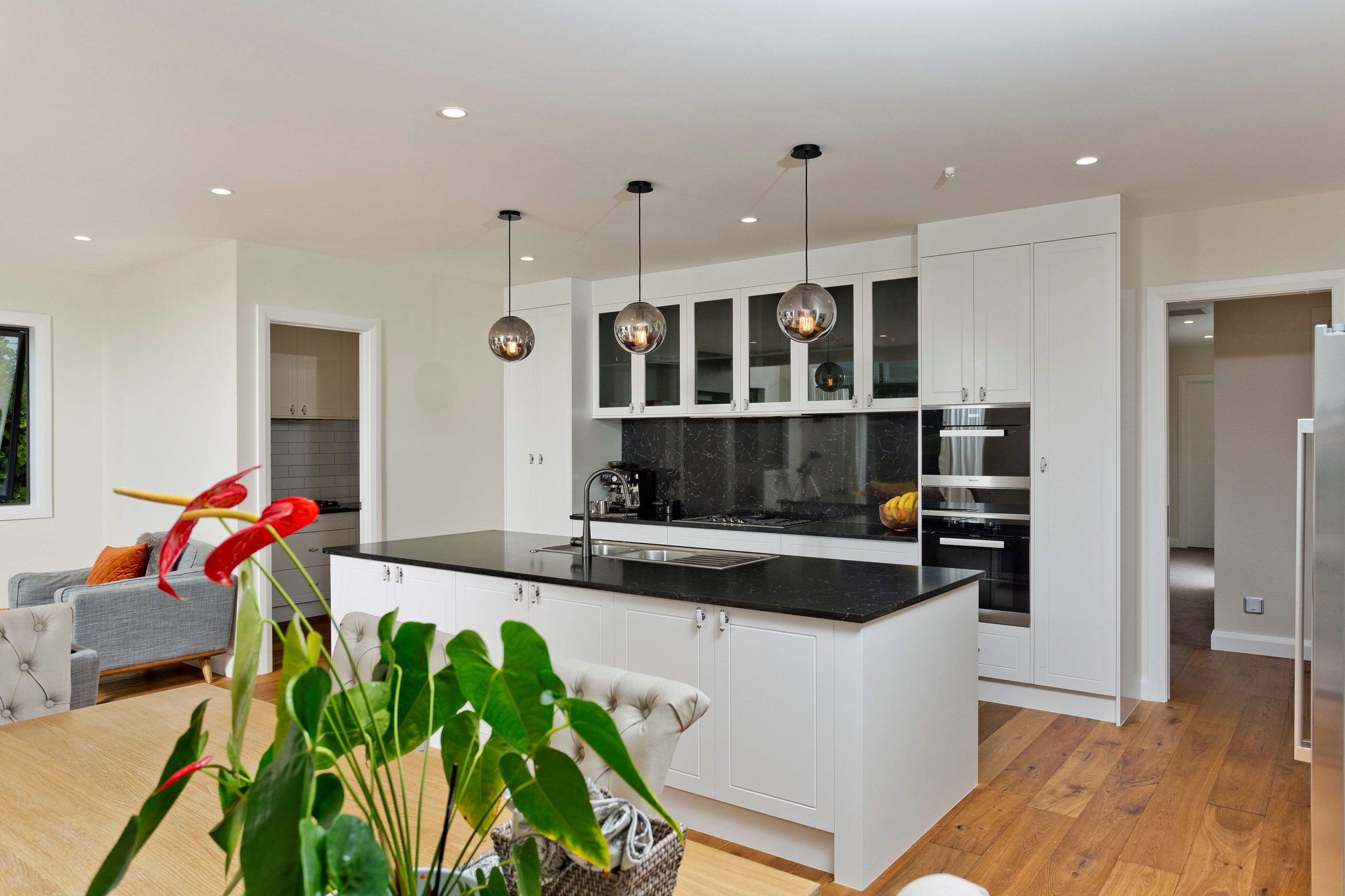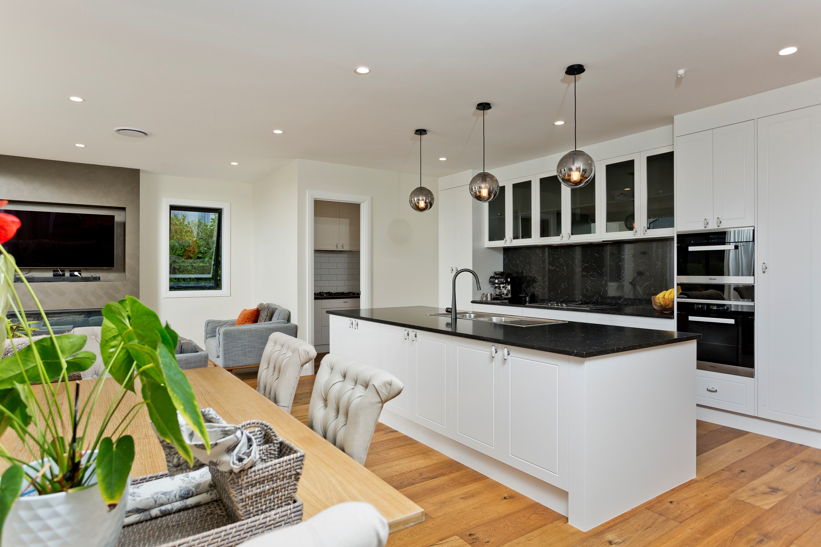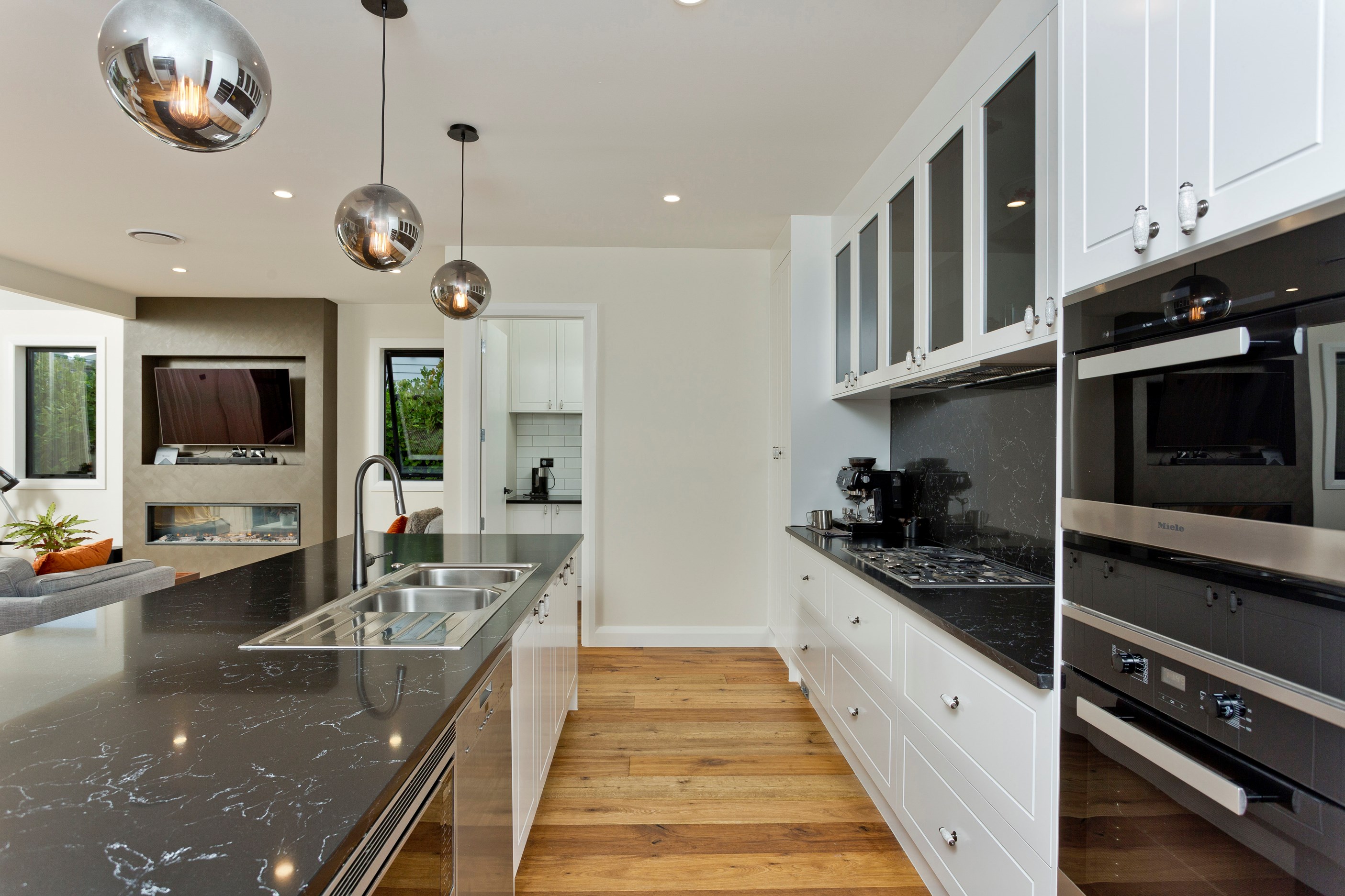 A high-spec farmhouse kitchen has premium Miele appliances for those who love to entertain, whether it’s hosting guests indoors or alfresco in one of several outdoor entertaining areas. With Auckland’s unpredictable weather in mind, these have thoughtfully been covered. Solar panels and low-maintanence landscaping also feature, as well as generous garaging and off-street parking for additional vehicles and even the boat.