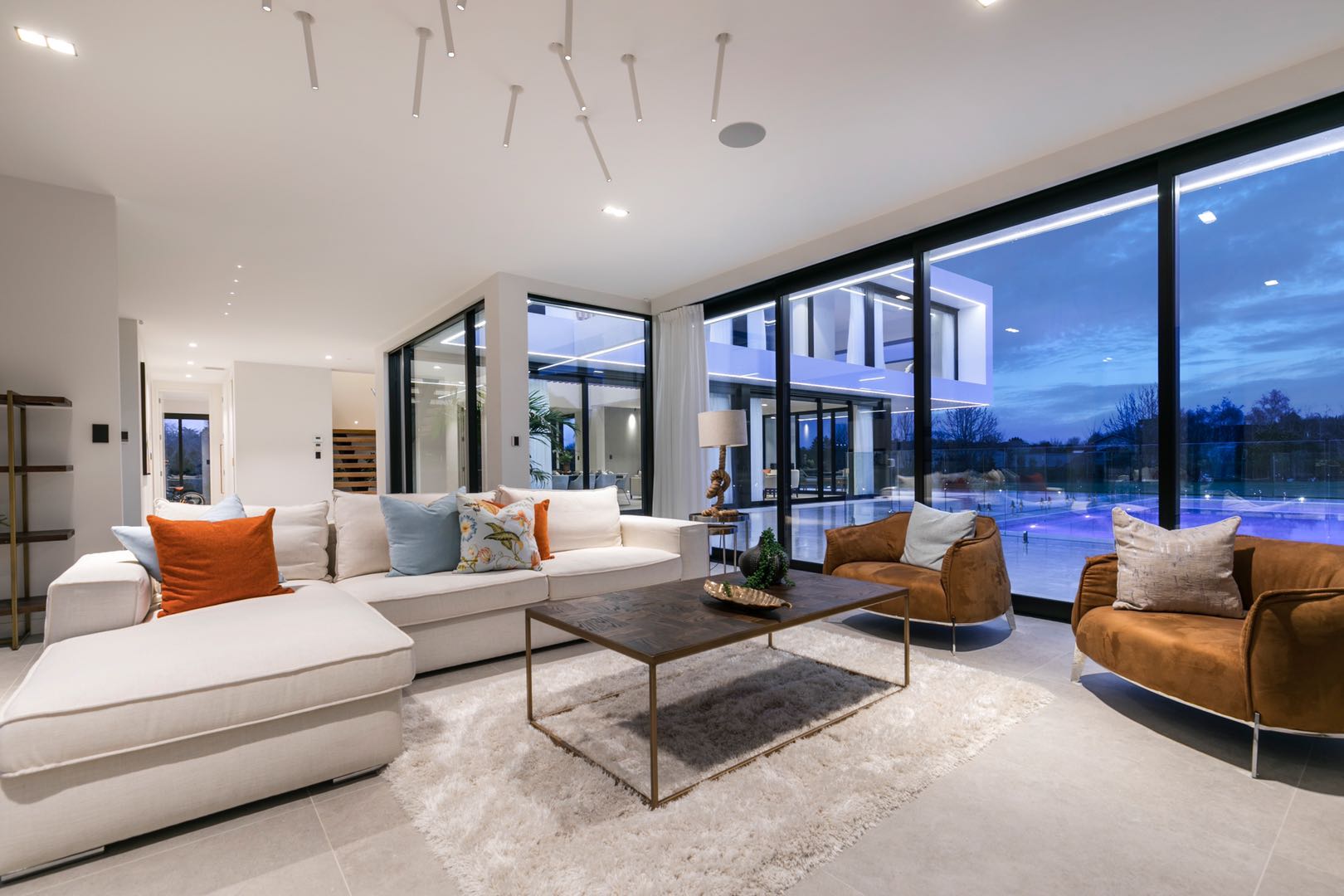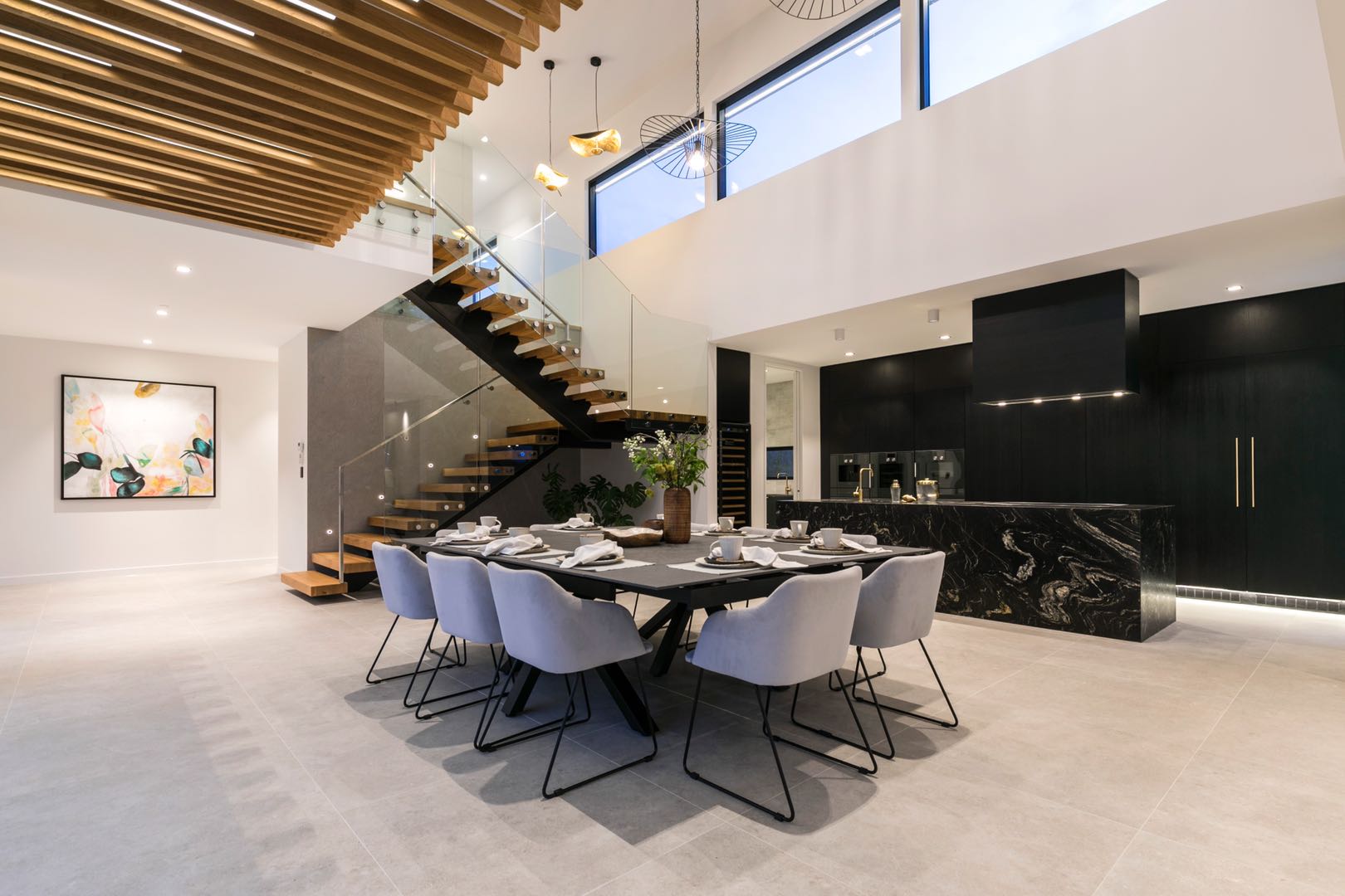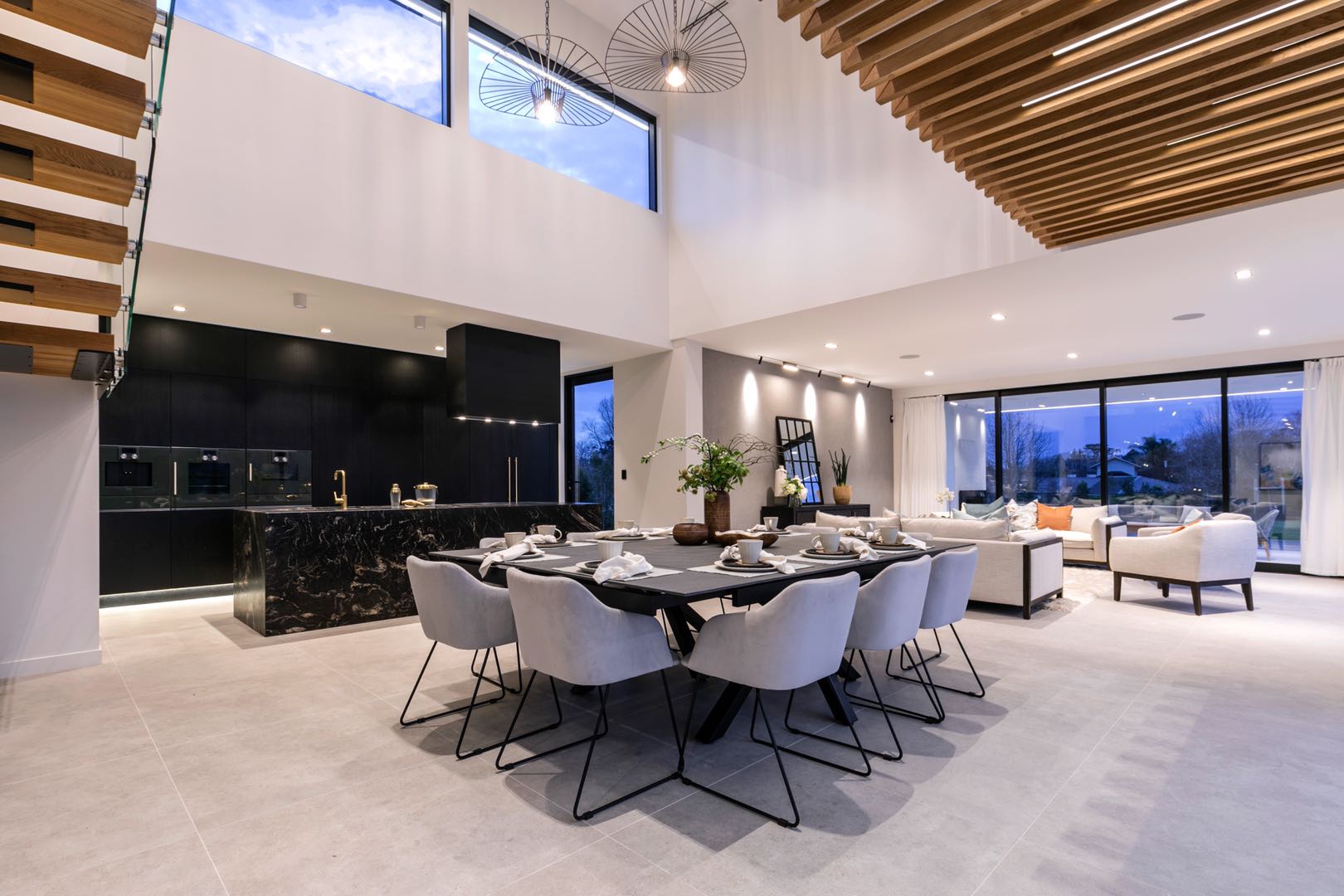 Architectural boxed forms and floor-to-ceiling windows define the light-filled spaces, with a monochrome palette tastefully softened by hints of timber. The large high-spec kitchen caters for every culinary need, boasting top-of-the-range appliances and statement black cabinetry. This heart of the residence gracefully opens onto superb open-plan dining and living areas.