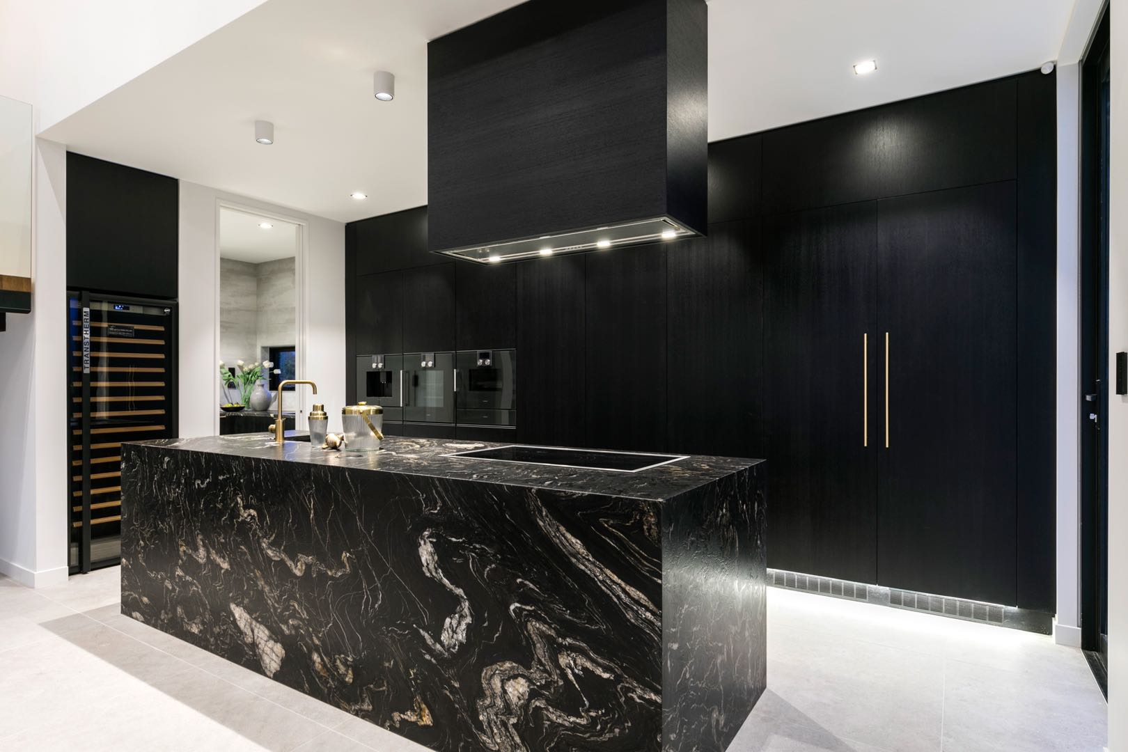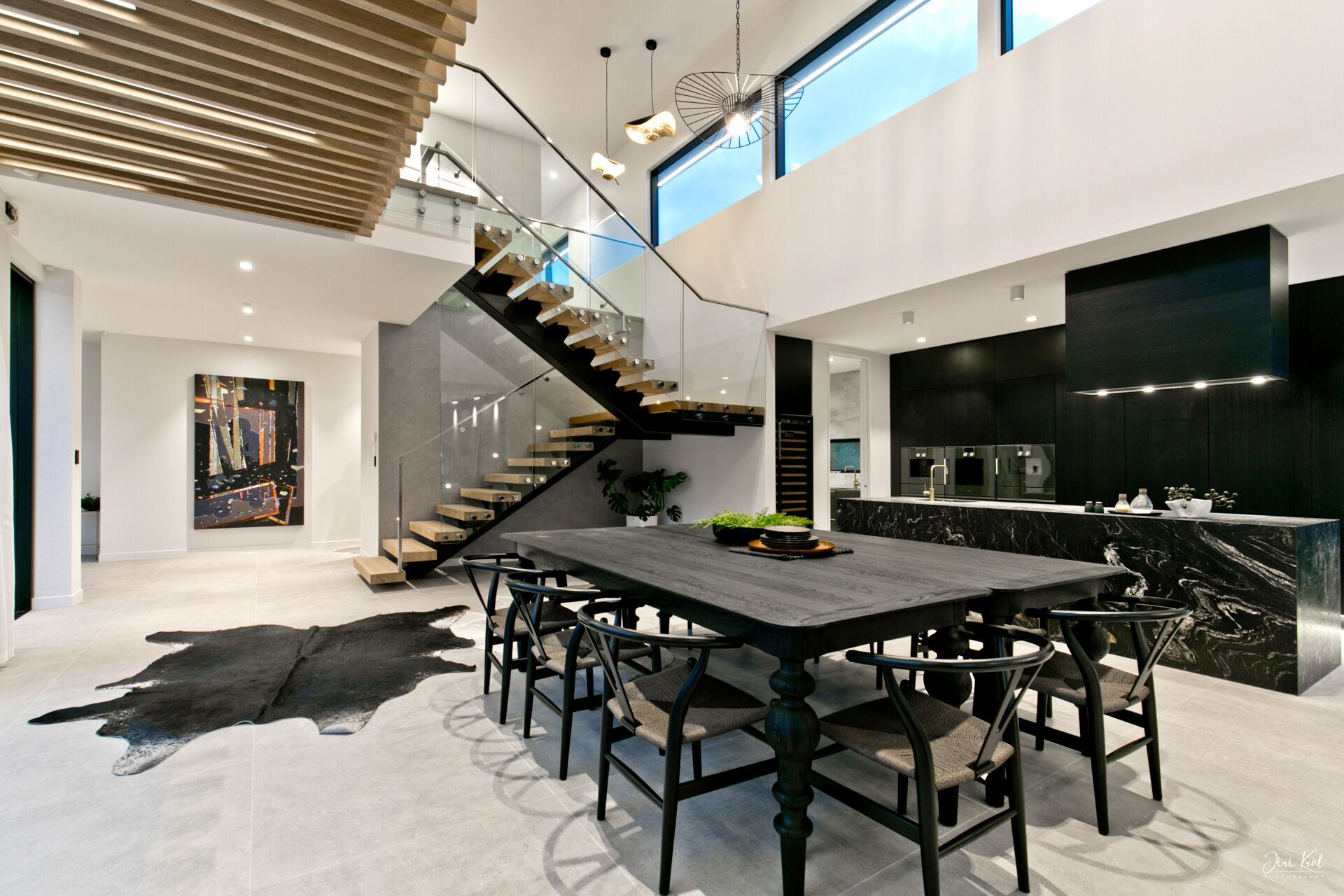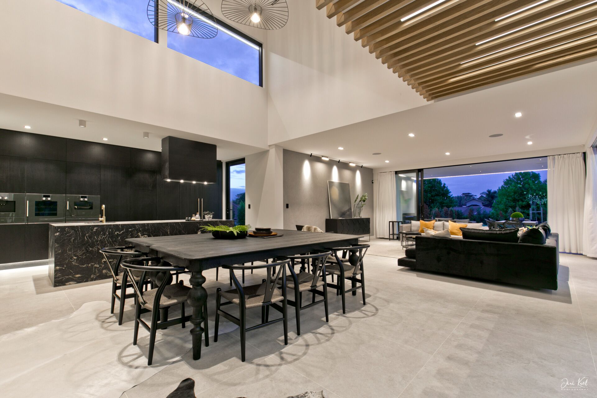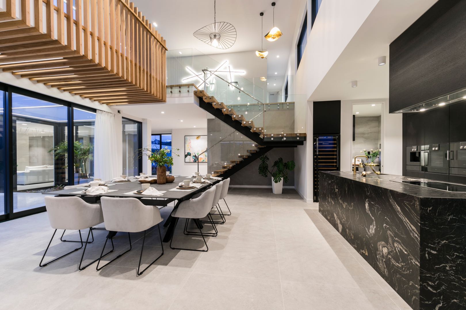 Architectural boxed forms and floor-to-ceiling windows define the light-filled spaces, with a monochrome palette tastefully softened by hints of timber. The large high-spec kitchen caters for every culinary need, boasting top-of-the-range appliances and statement black cabinetry. This heart of the residence gracefully opens onto superb open-plan dining and living areas.