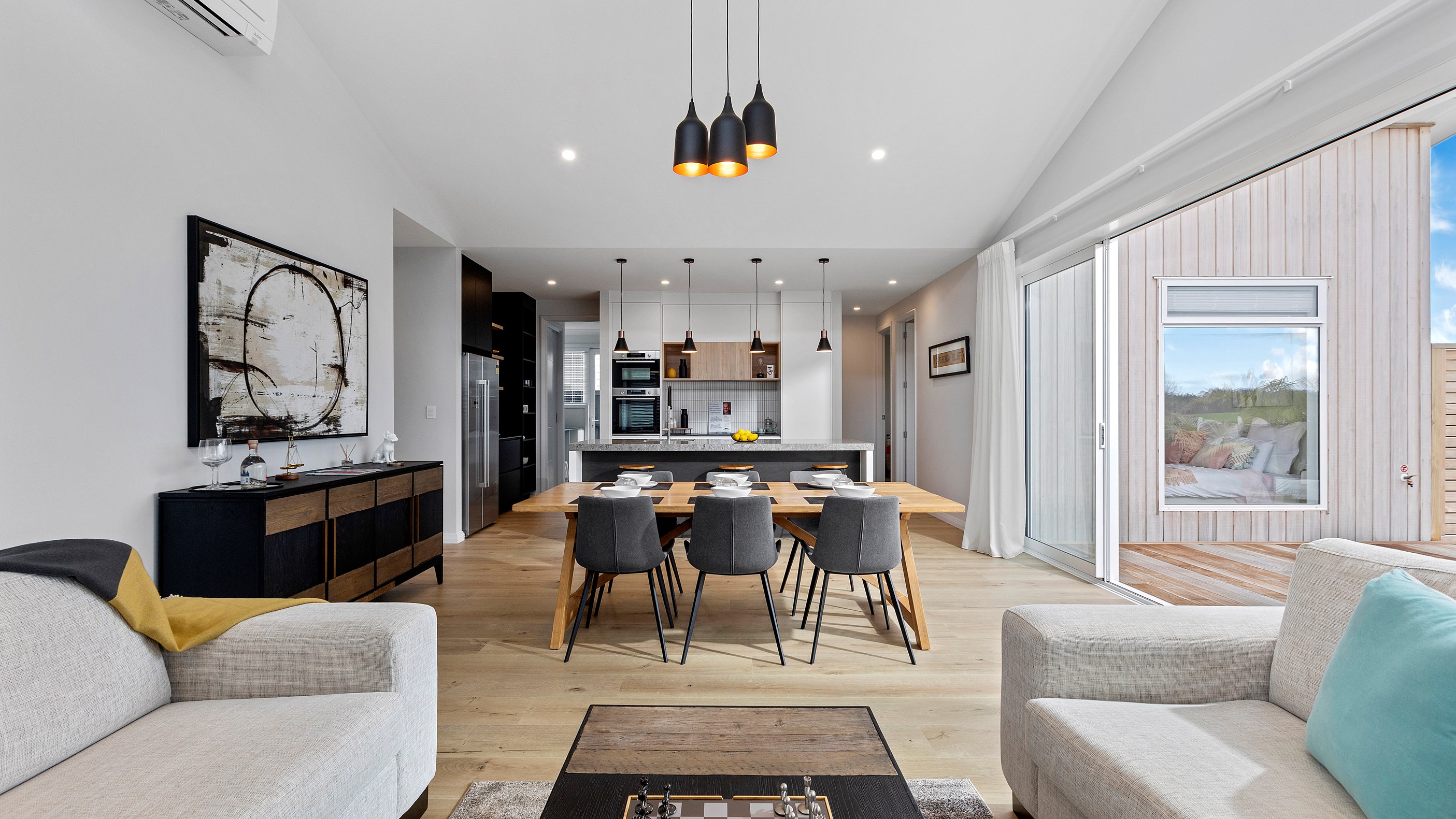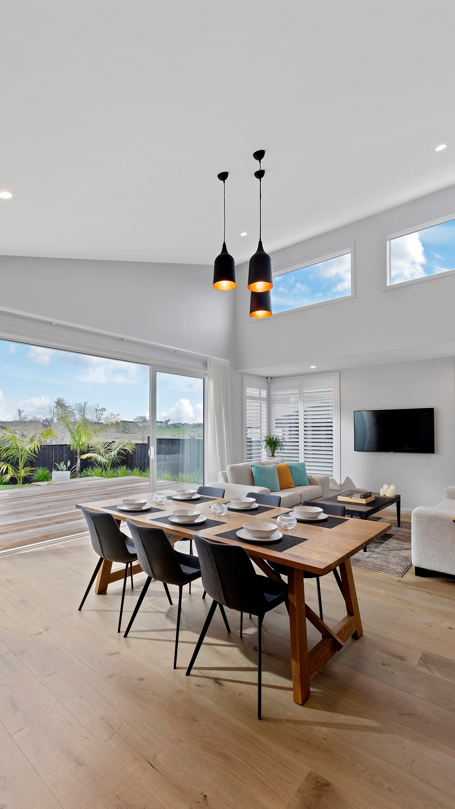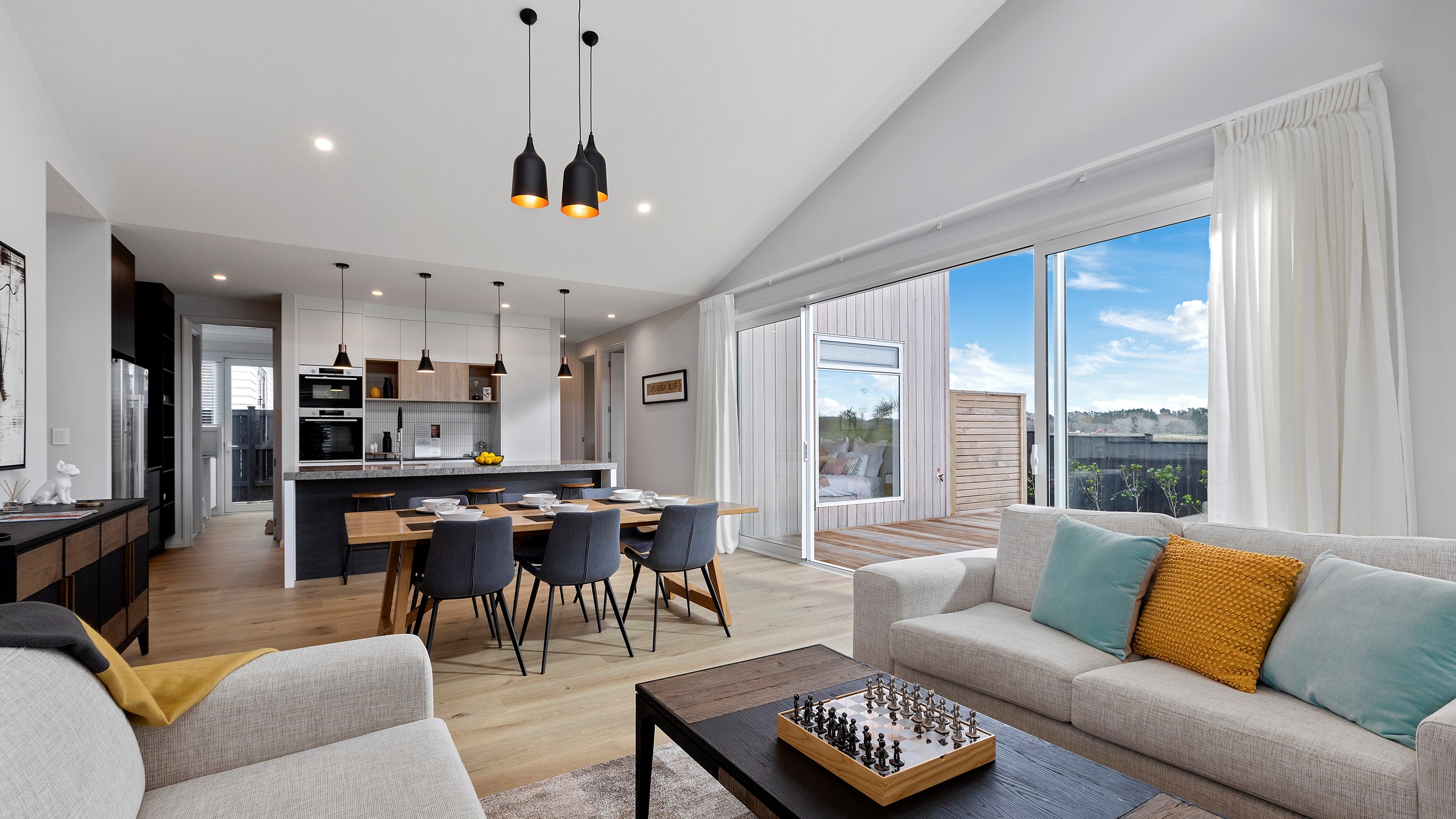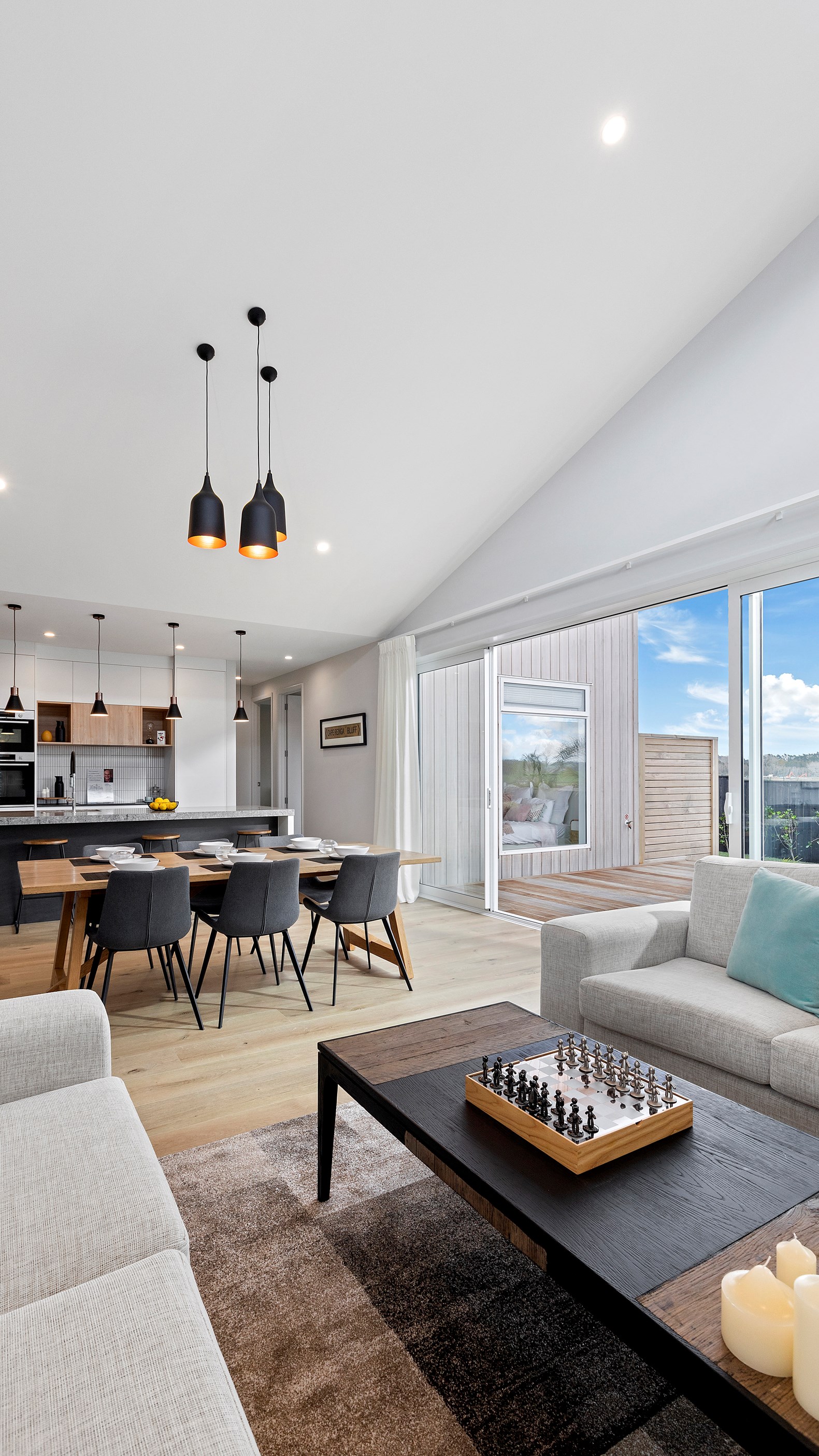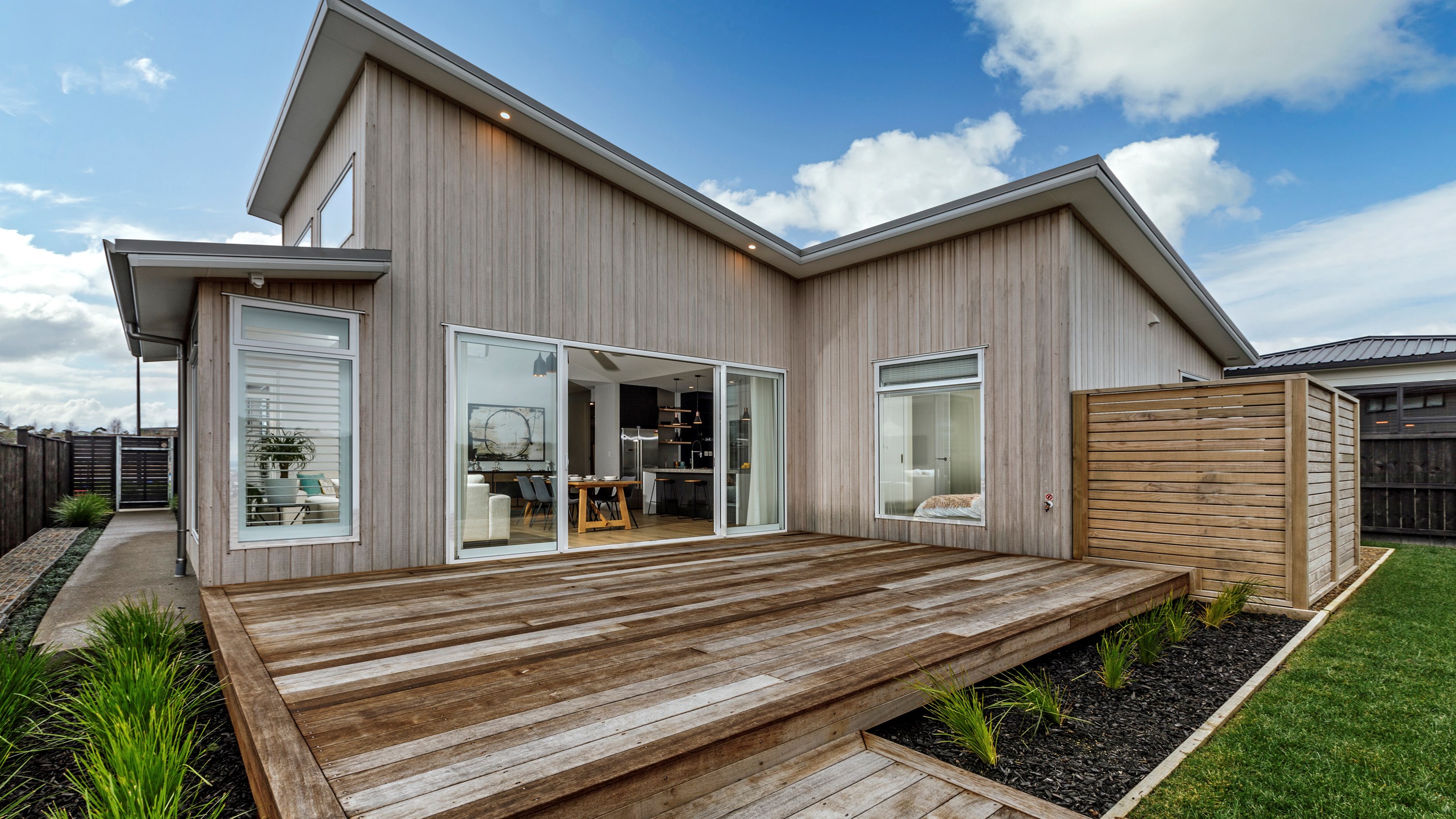 A large deck is easily accessed from the open-plan kitchen/dining/living space. Separated from the rest of the home through a large sliding door, the media room is another space for the family to gather, especially on movie nights. When it’s time for some downtime, the house’s three bedrooms means there is plenty of space for everyone.