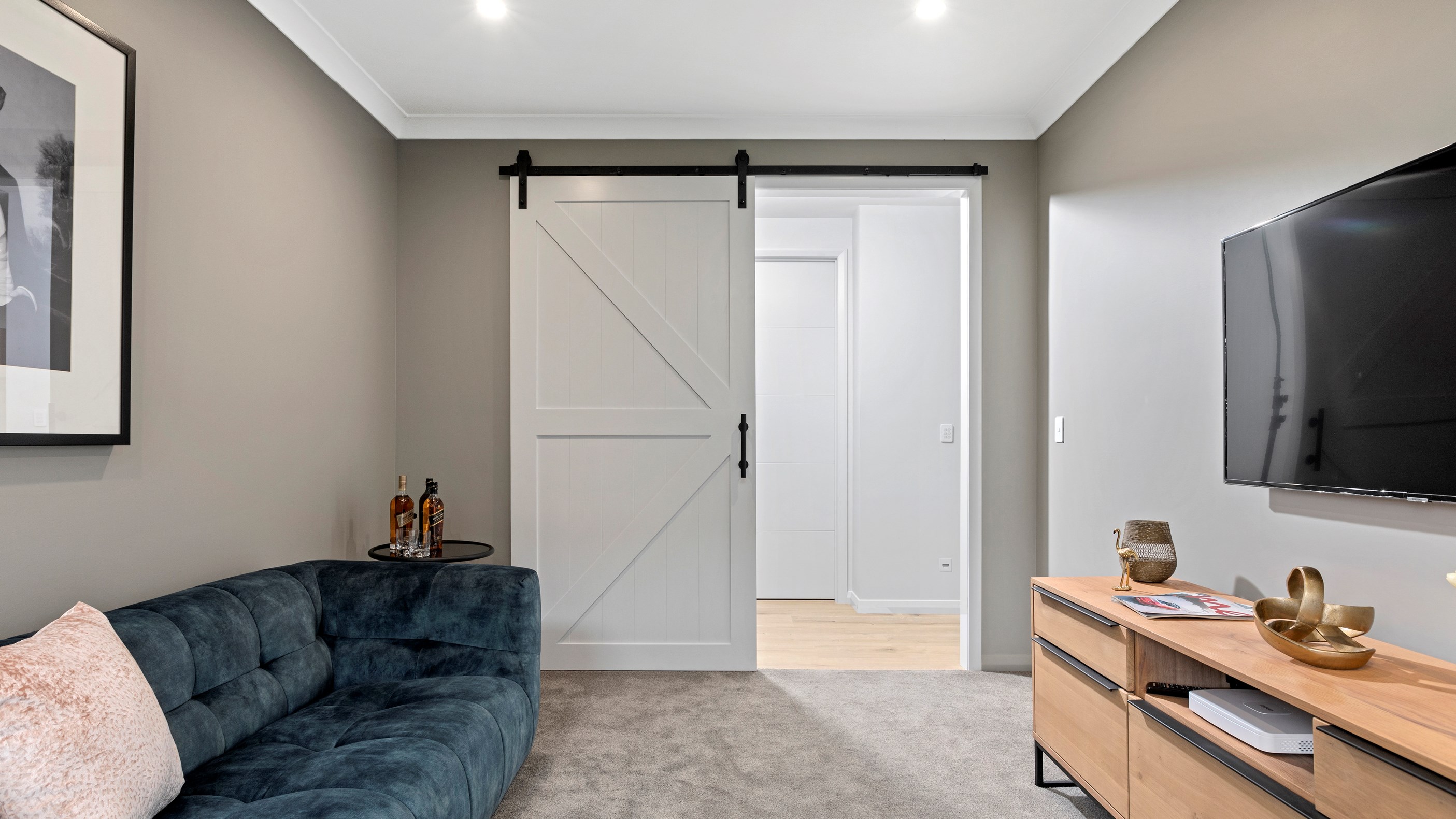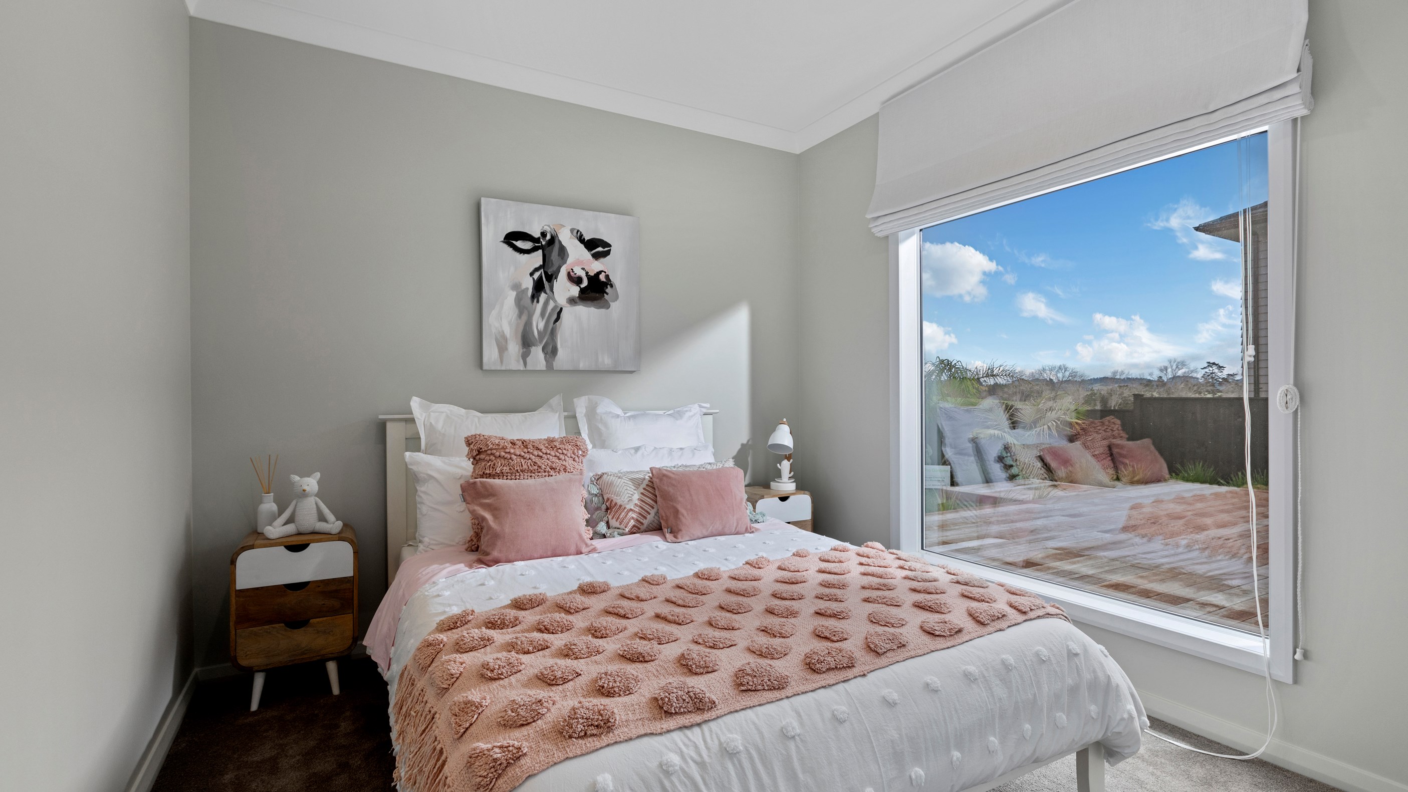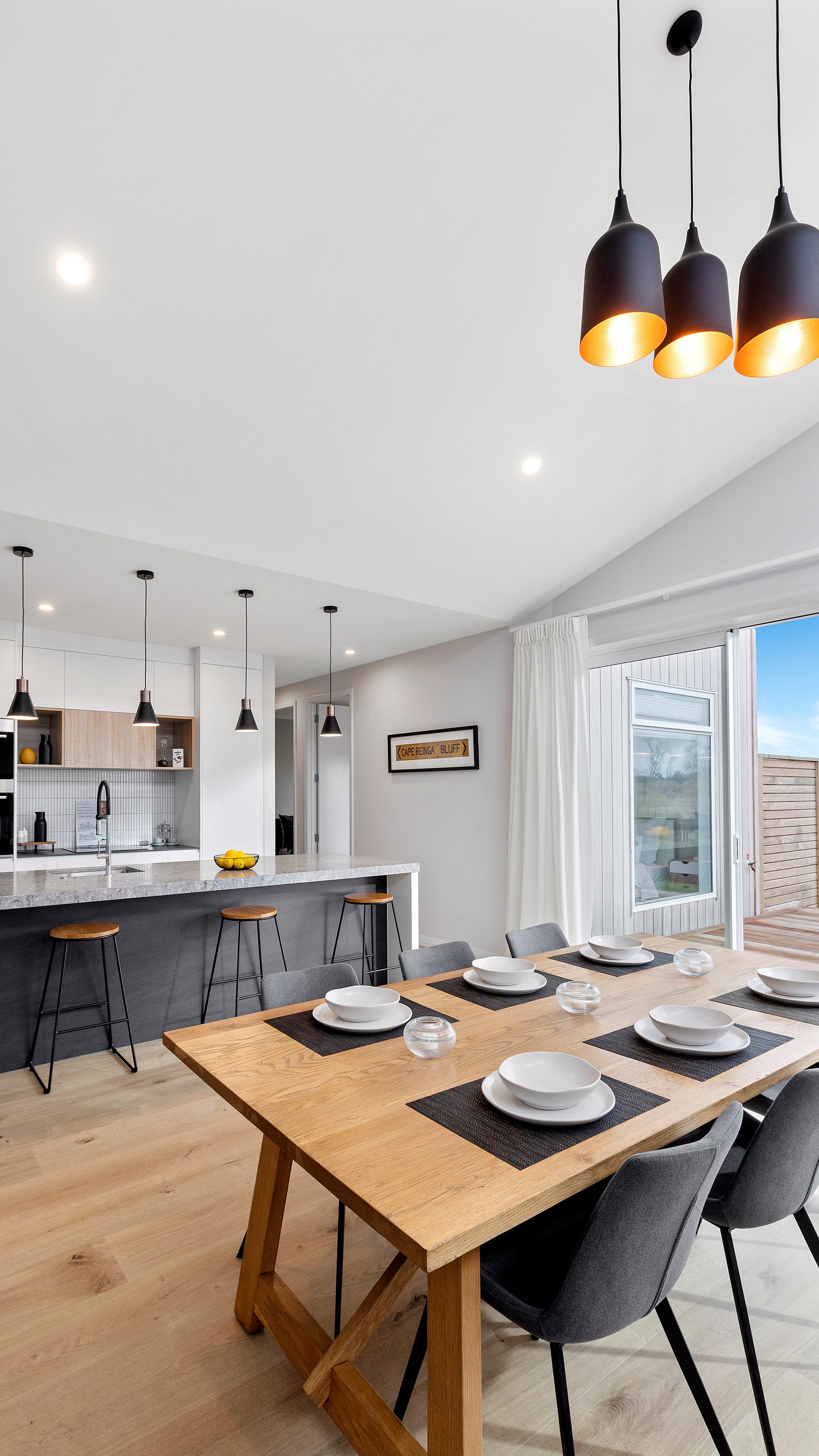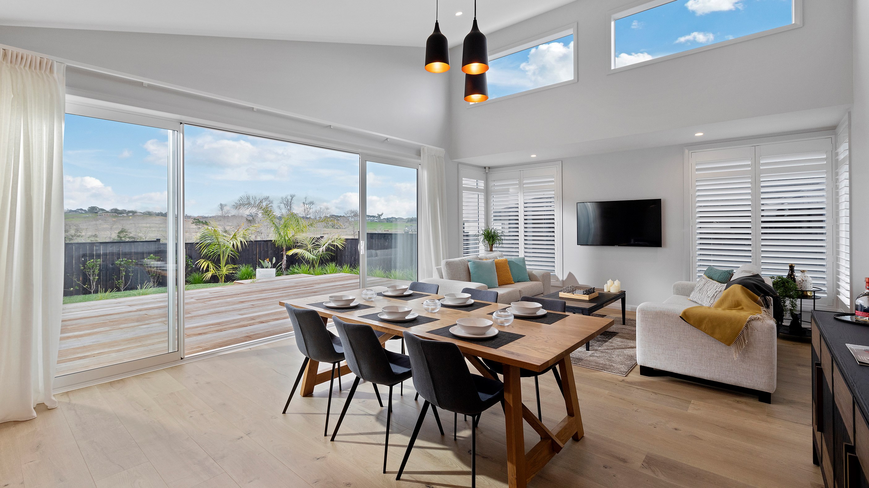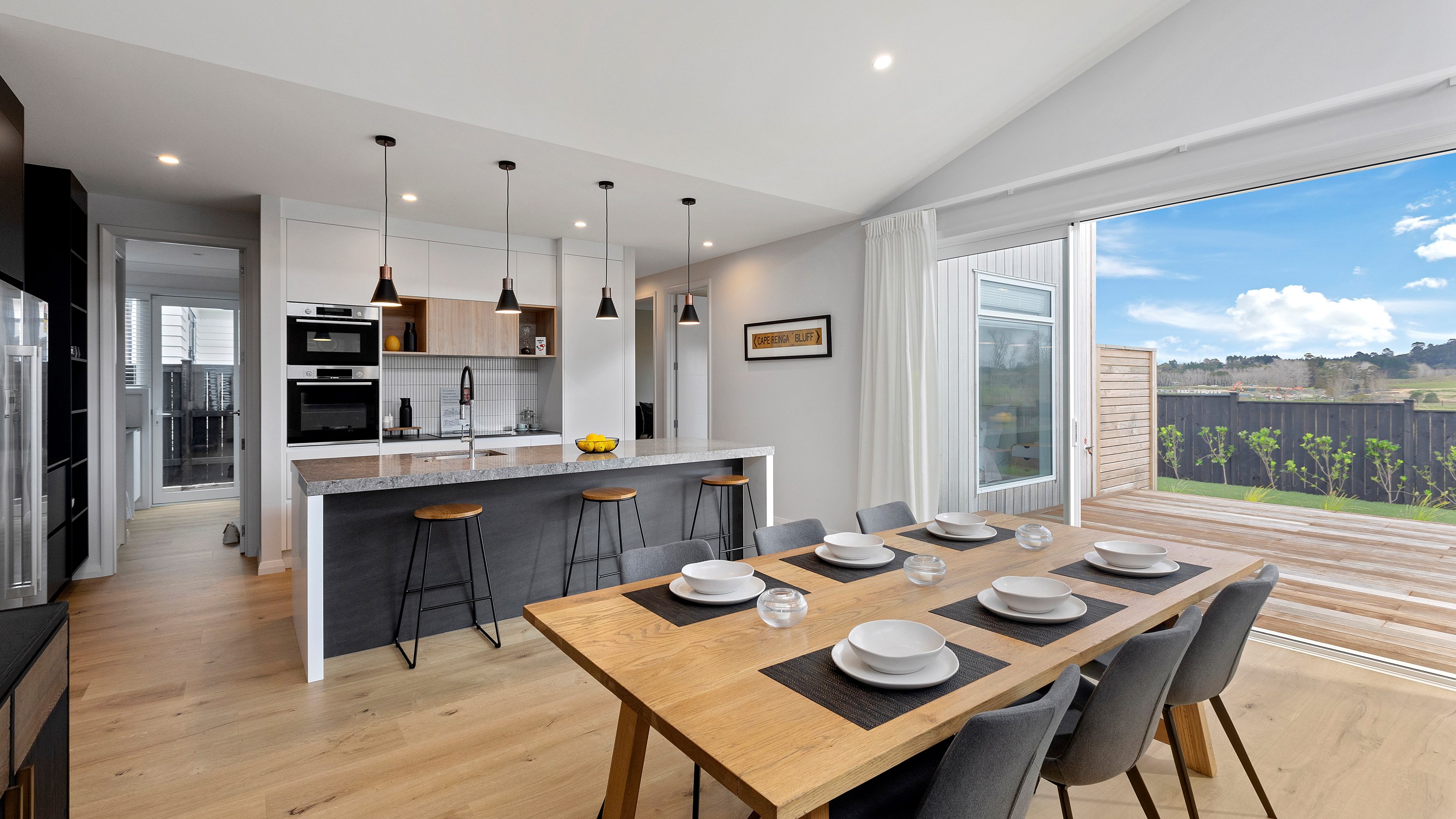 A large deck is easily accessed from the open-plan kitchen/dining/living space. Separated from the rest of the home through a large sliding door, the media room is another space for the family to gather, especially on movie nights. When it’s time for some downtime, the house’s three bedrooms means there is plenty of space for everyone.
