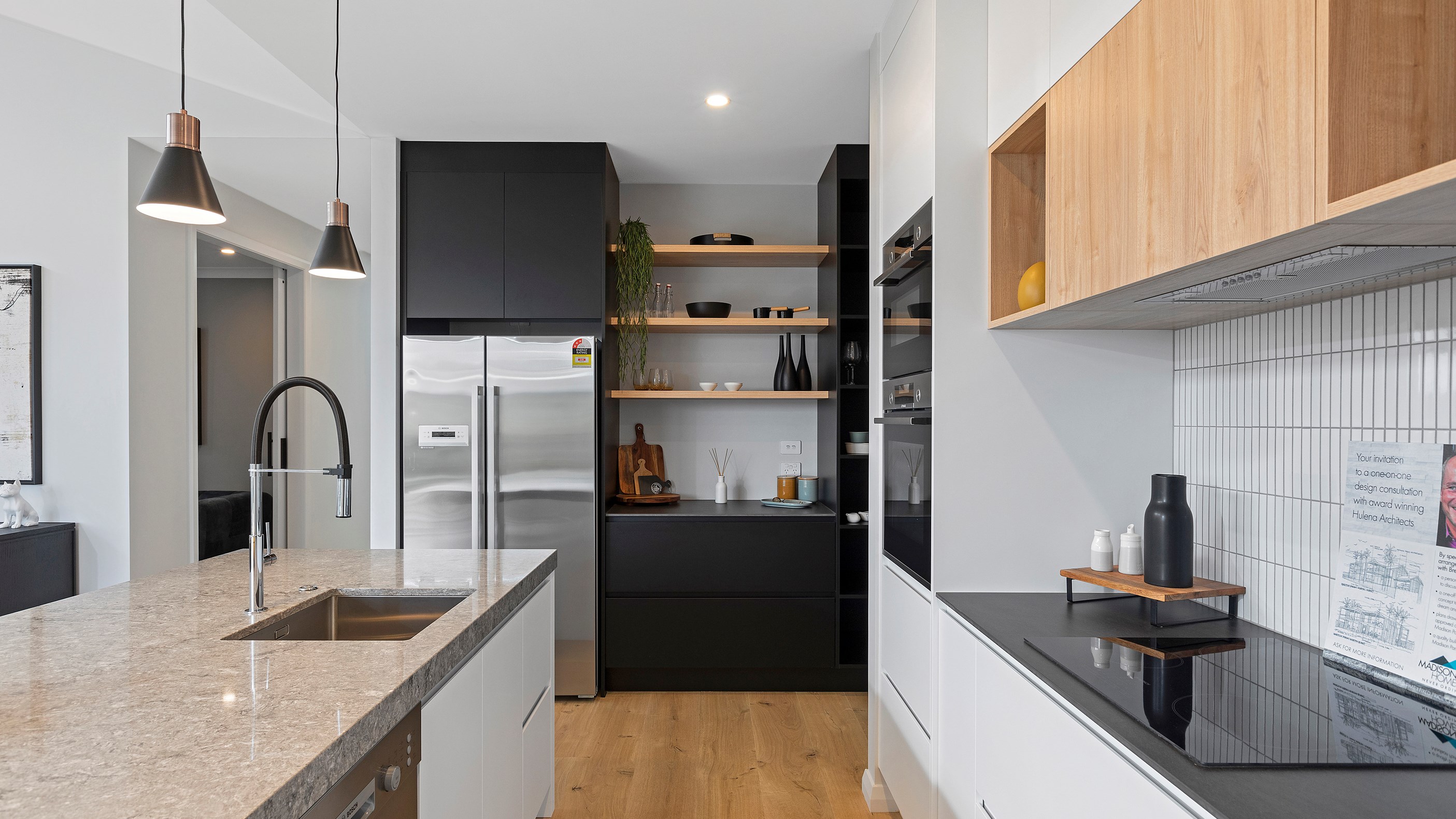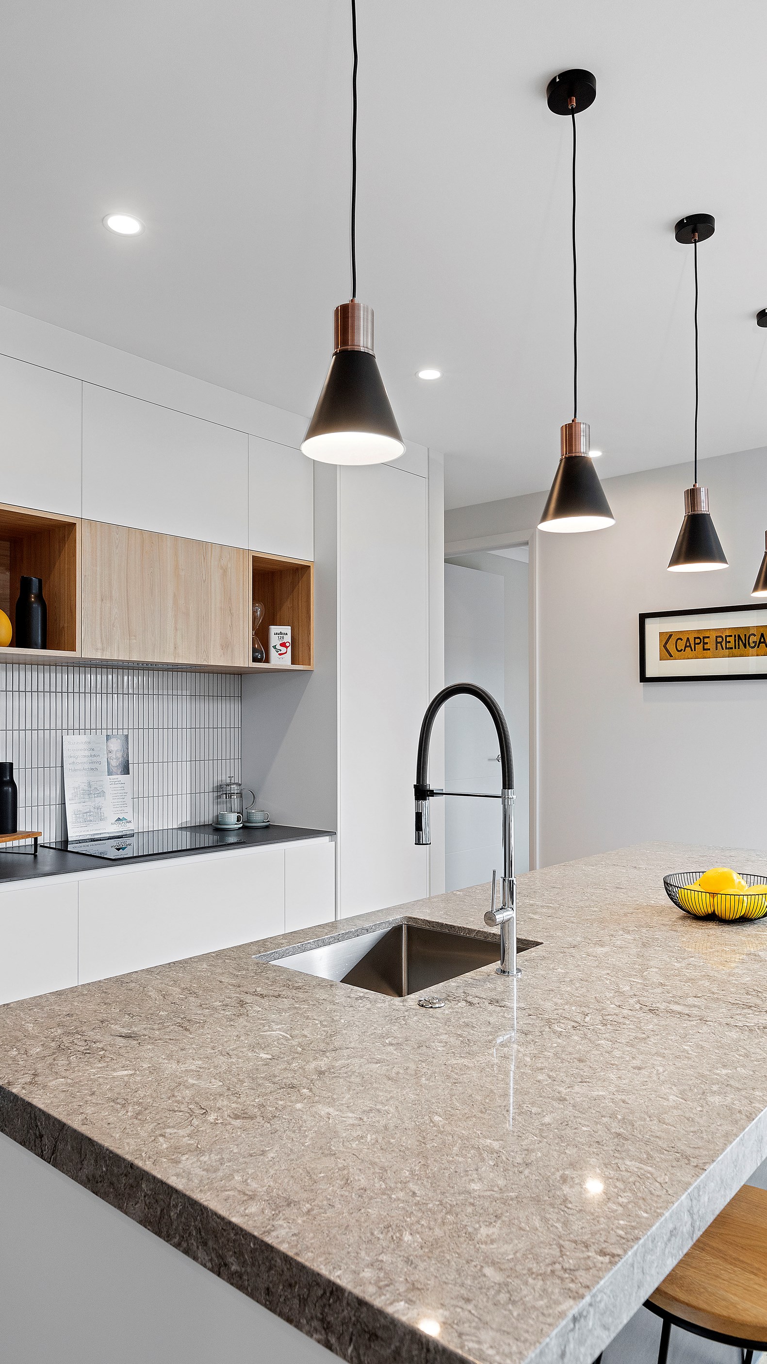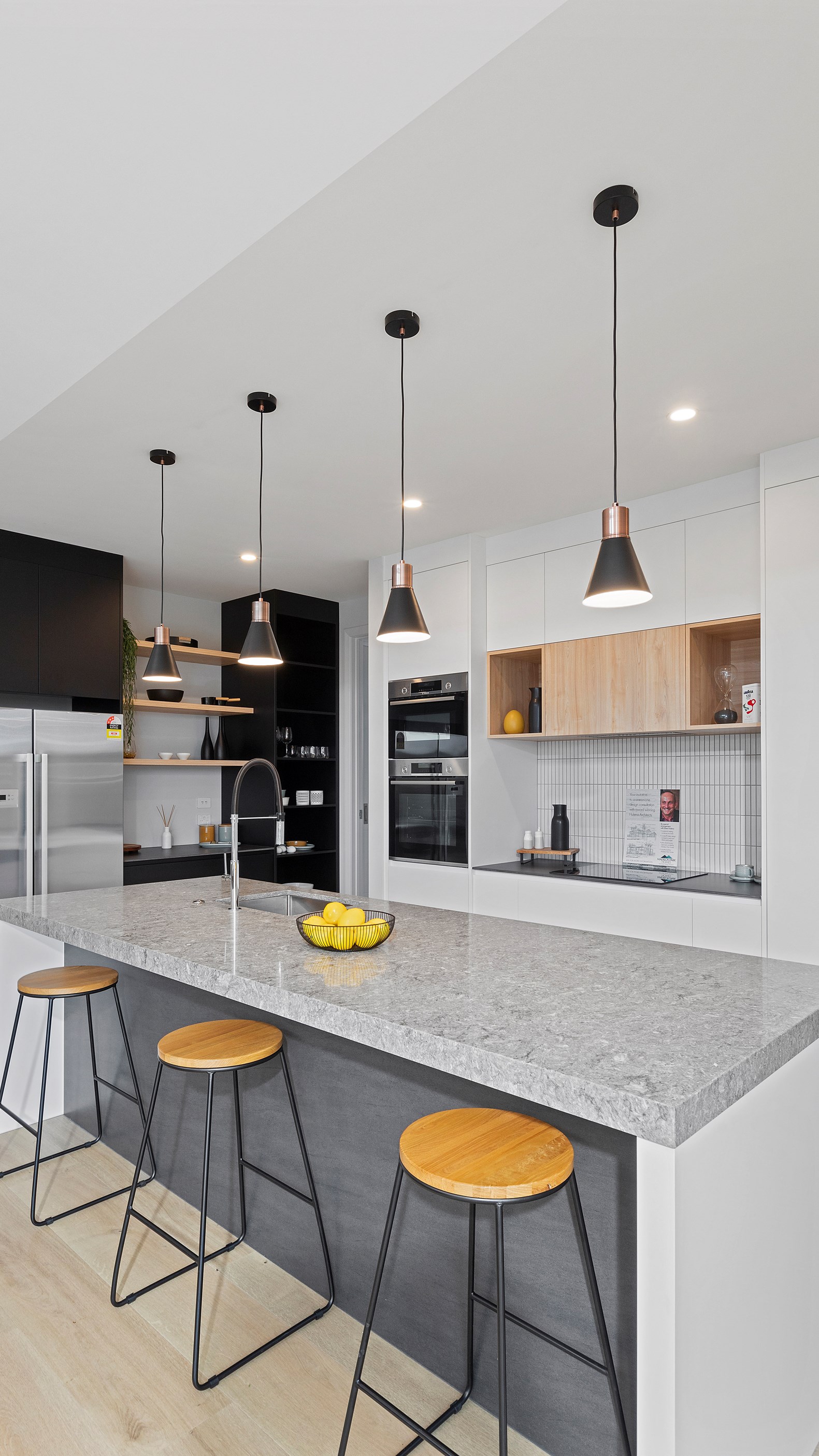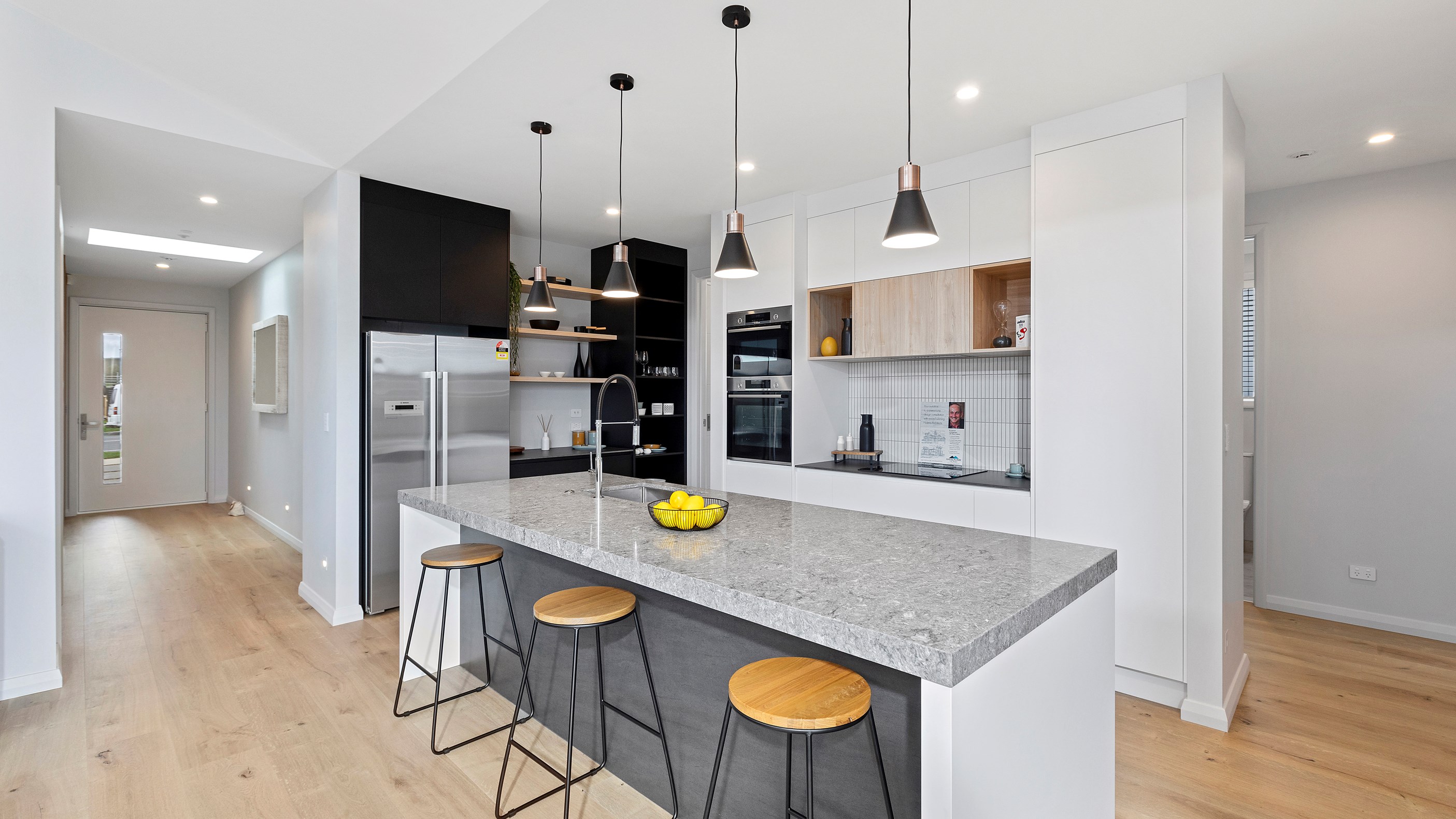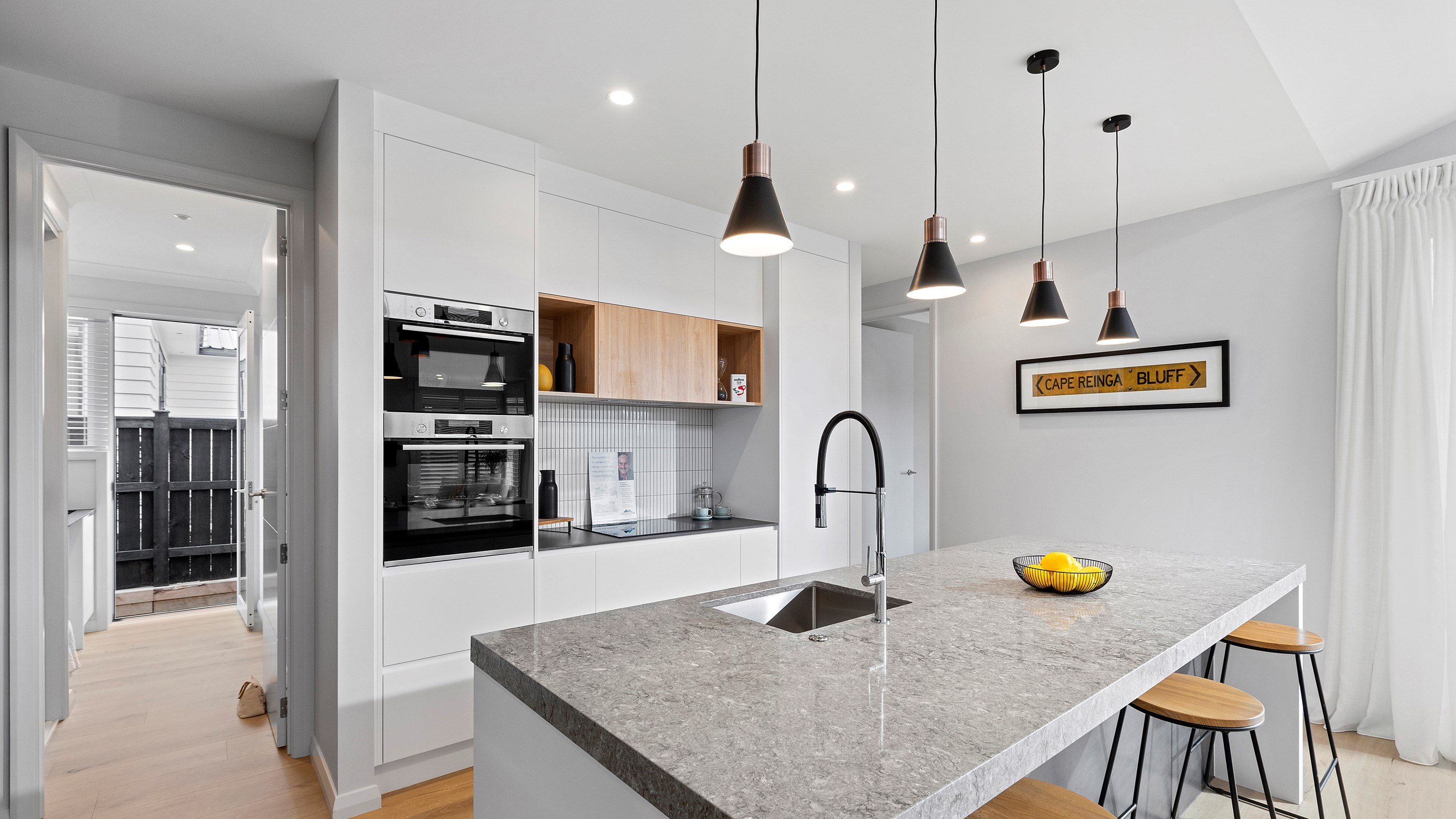 Visitors are welcomed by high ceilings and a Velux skylight in the entrance and a wonderful sense of space is immediately apparent. The centre of the dwelling is the generous living area with a raked ceiling, great exposure to the outdoors and an eye-catching kitchen. Featuring porcelain benchtops, stainless steel appliances, pendant lighting and black, white and timber cabinetry, the kitchen is modern and well-equipped.