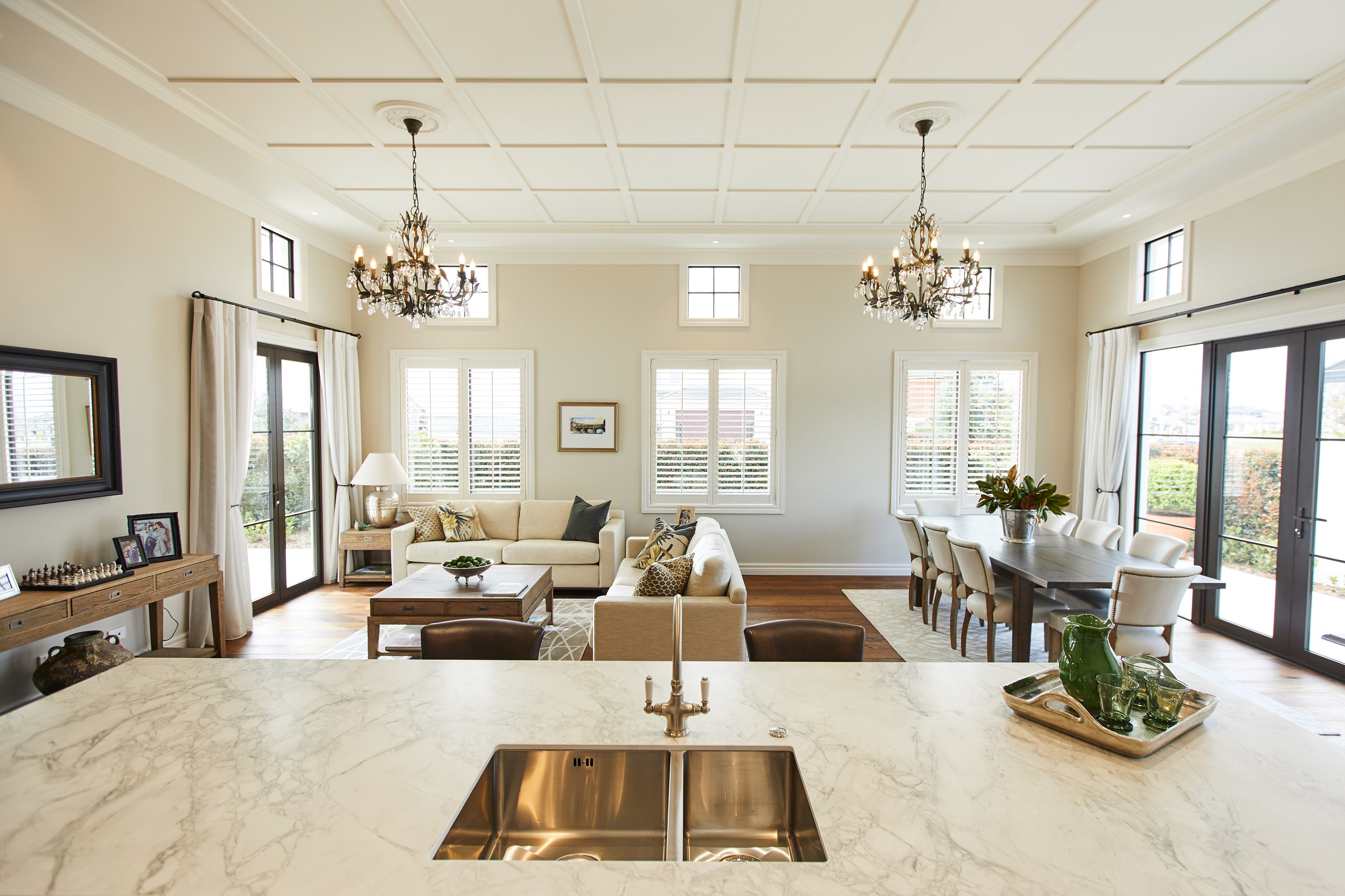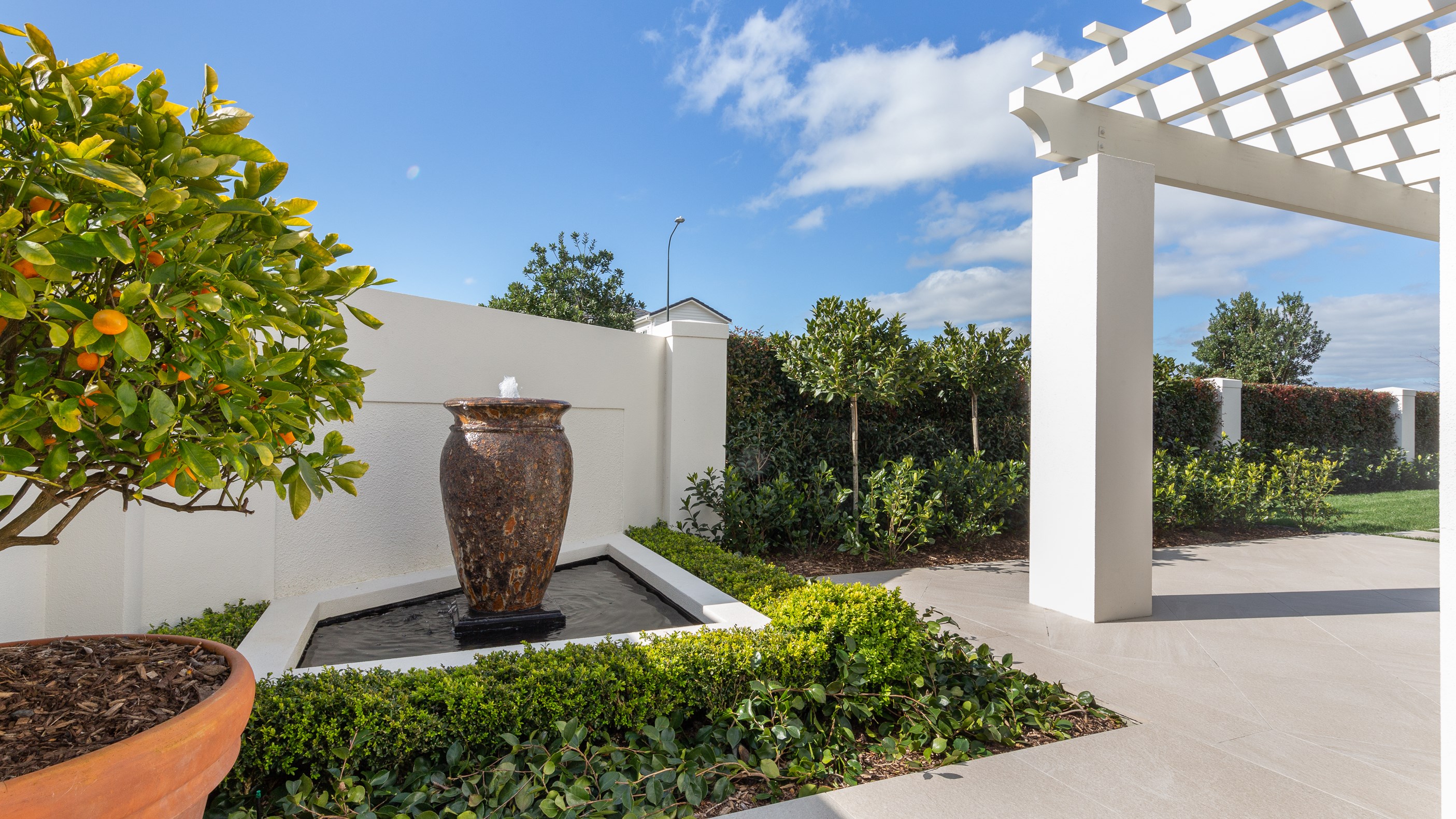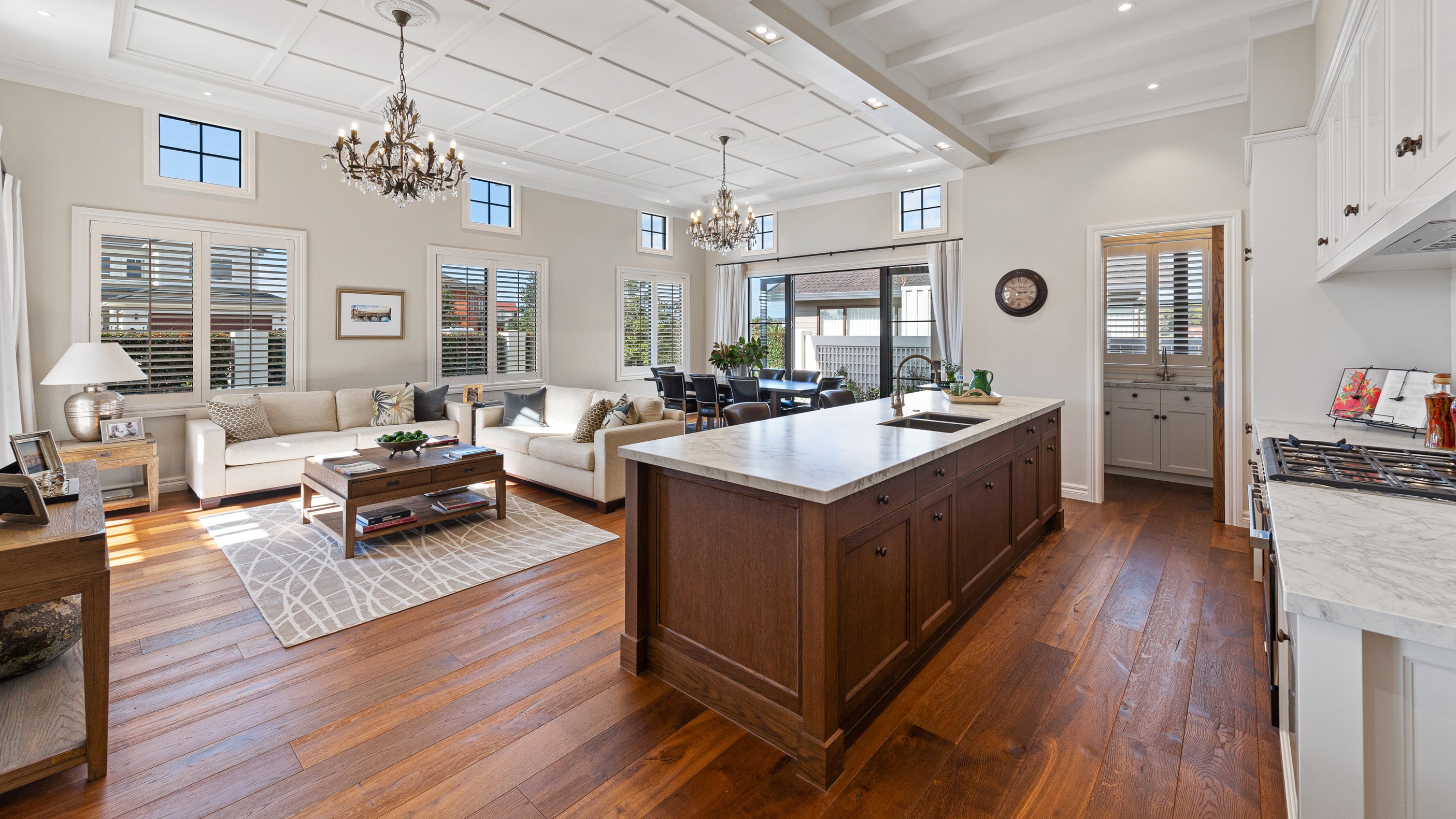 Standout design features inside the four-bedroom home include a hand-crafted ceiling window with a skylight in a gallery foyer, oak floors, hand-crafted Italian-style doors and pocket sliding doors, an over- height entry door and warm water in-floor heating. Among the interior design highlights are four glittering chandeliers, bespoke cabinetry, stone benchtops and a feature fireplace. In true Mediterranean villa style, outdoor spaces consist of multiple courtyard living spaces and include a water feature, specimen trees and topiary. A custom-built barbecue ensures easy living, indoors and out.