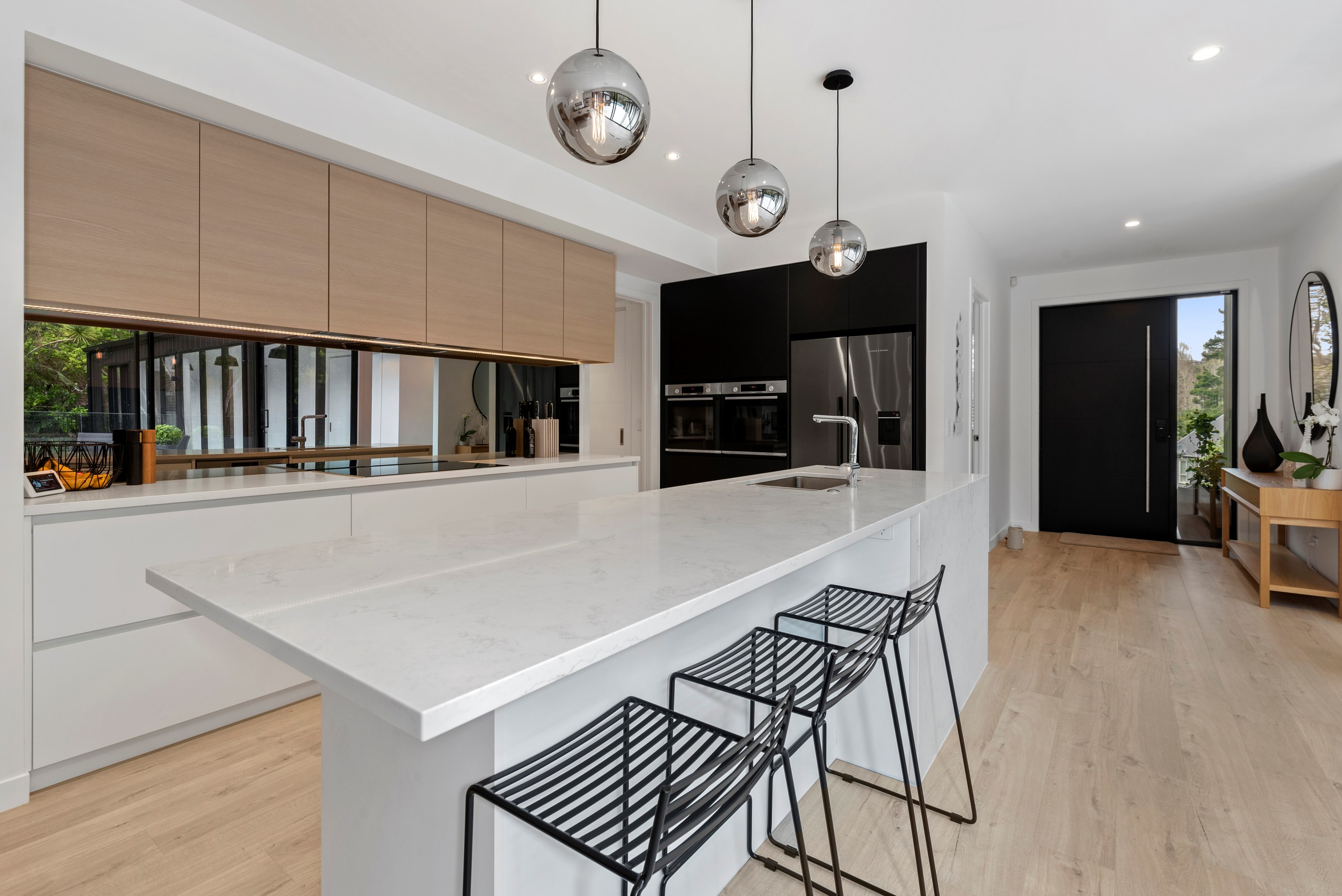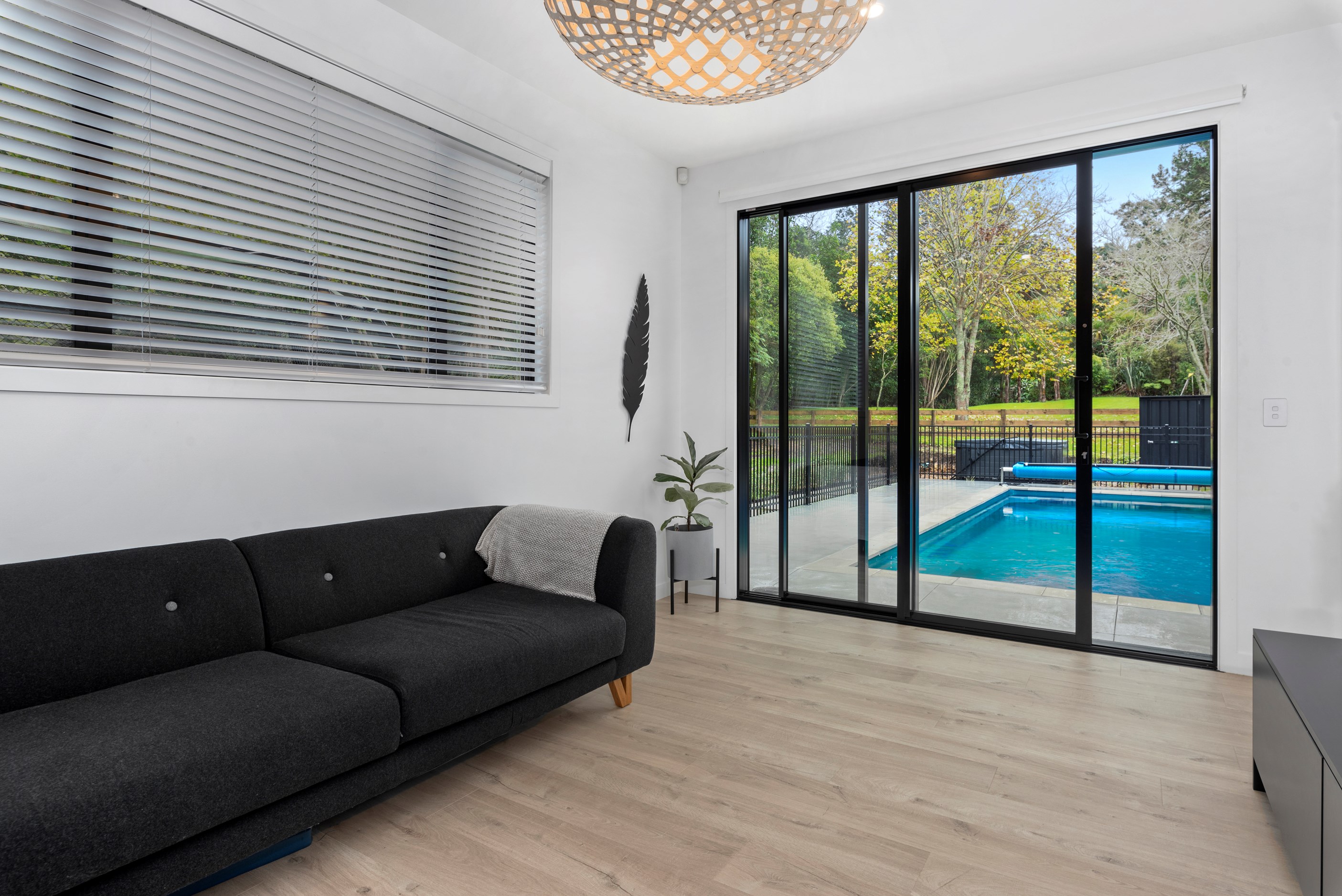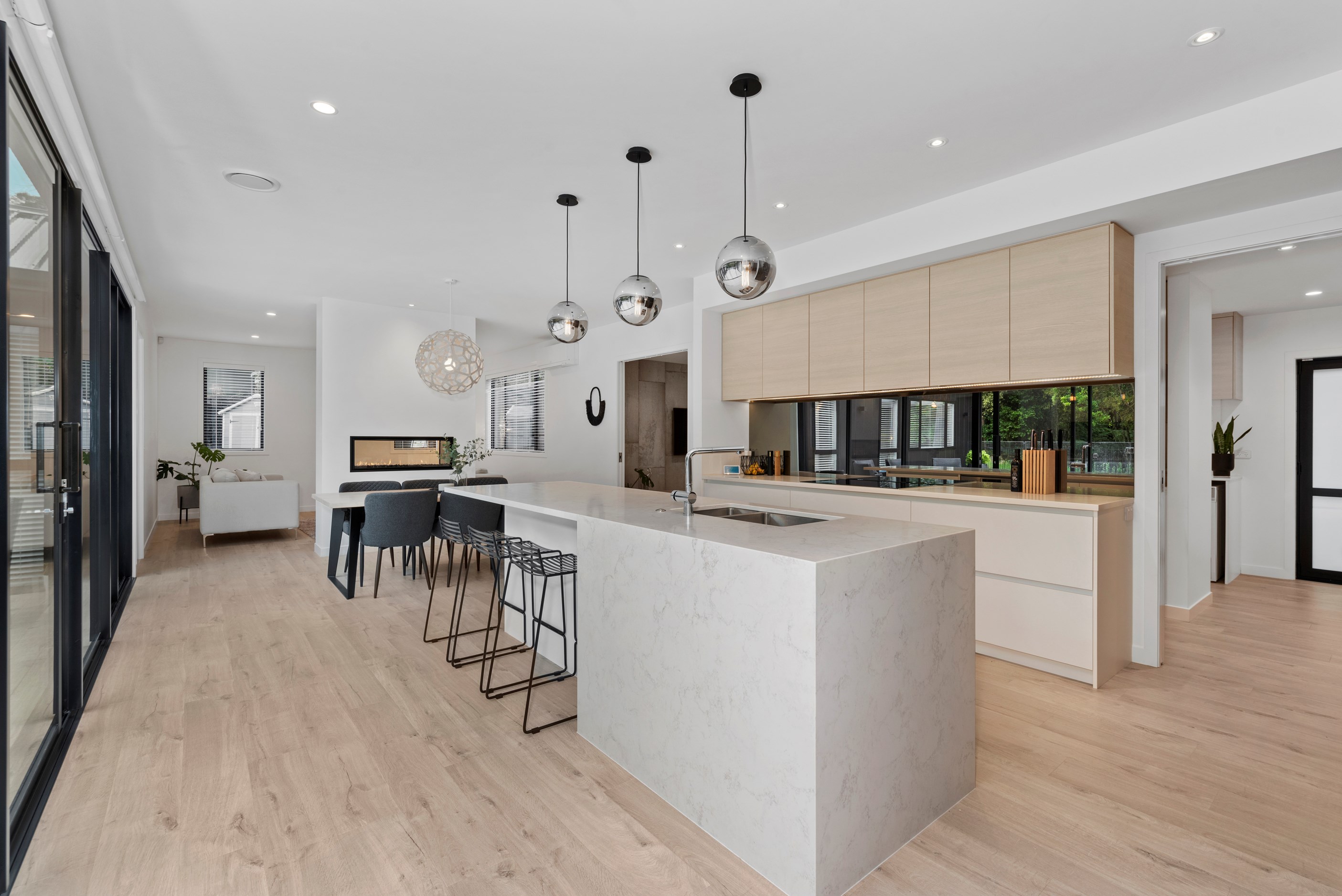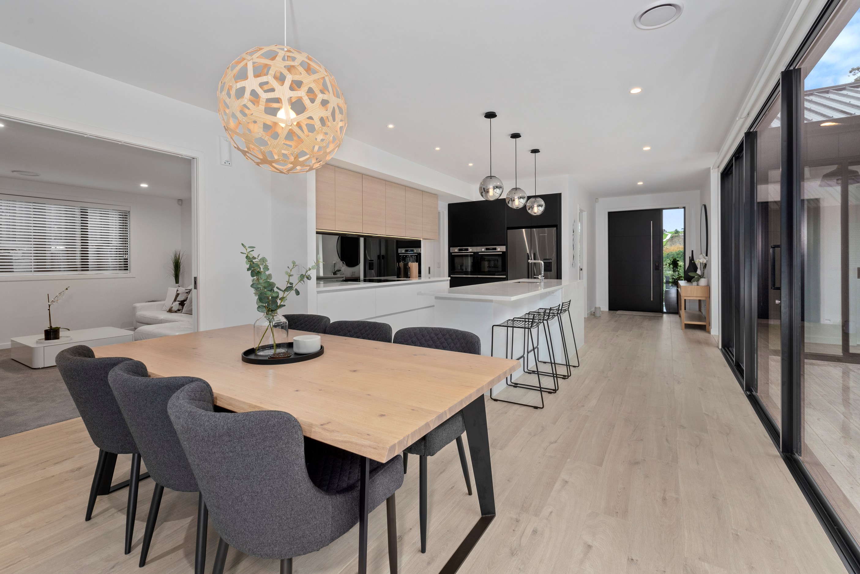 All fixtures and fittings have been chosen with real thought, and this shows in the quality of the end product. The kitchen features a stone island bench with built-in breakfast bar. A mirrored splashback adds a touch of luxe, and ties in well with the pendant lighting. Concrete-look tiling in the bathrooms complement the timber vanities and white benchtops. The home cleverly wraps around the pool and patio, making a staycation all the more appealing this summer. This area connects beautifully with the interior via sliding doors in the kitchen/dining area, hallway, main bedroom and second family room. This flawless home takes family life to the next level.