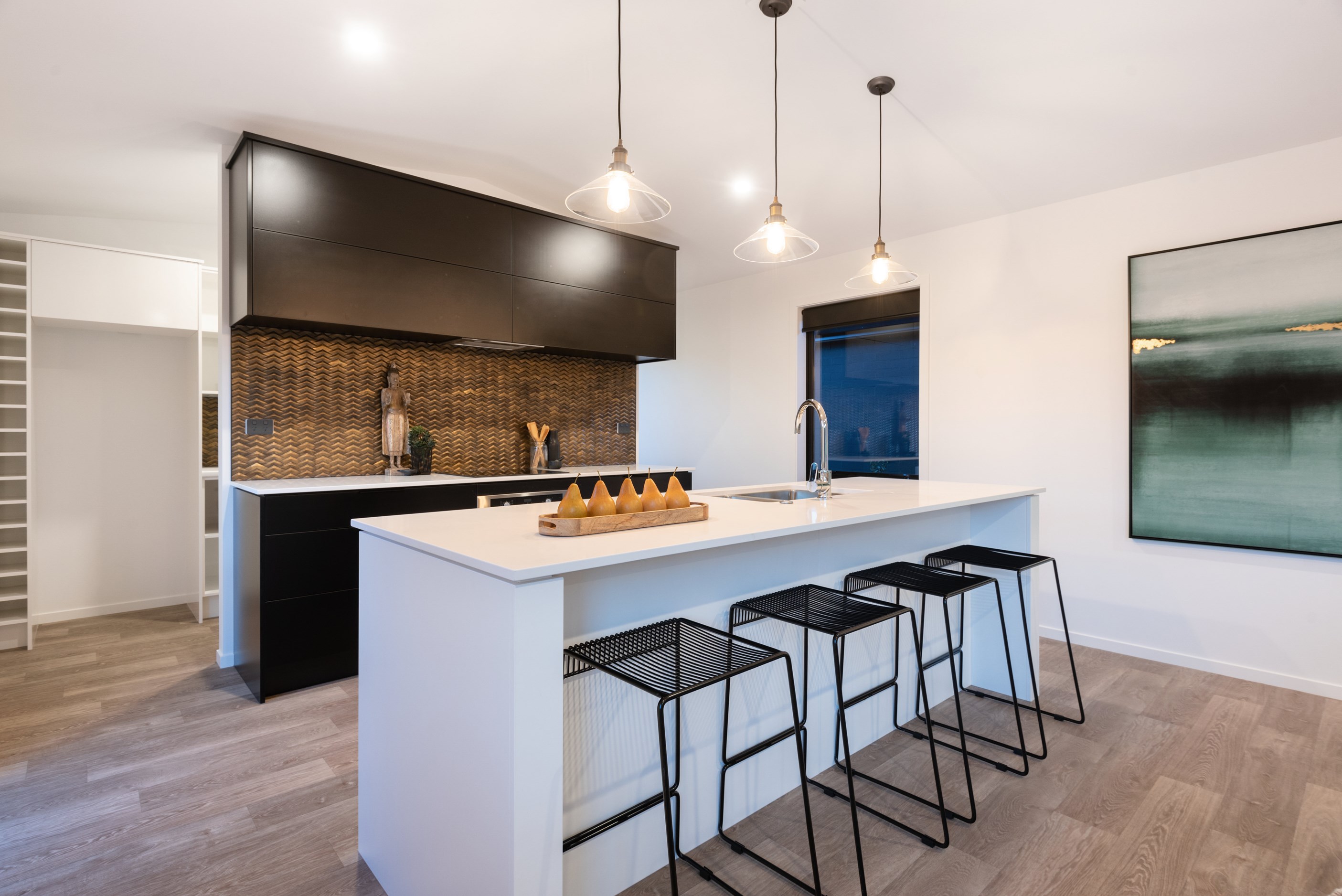 Gable ends with painted brick outside, and feature lighting and a play on texture inside, ensure a restful aesthetic flows throughout the 177 sqm footprint. Peace and practicality is prioritised, with the three bedrooms separated from the living and entertaining area, and the main bedroom, with ensuite, opens onto a private patio.