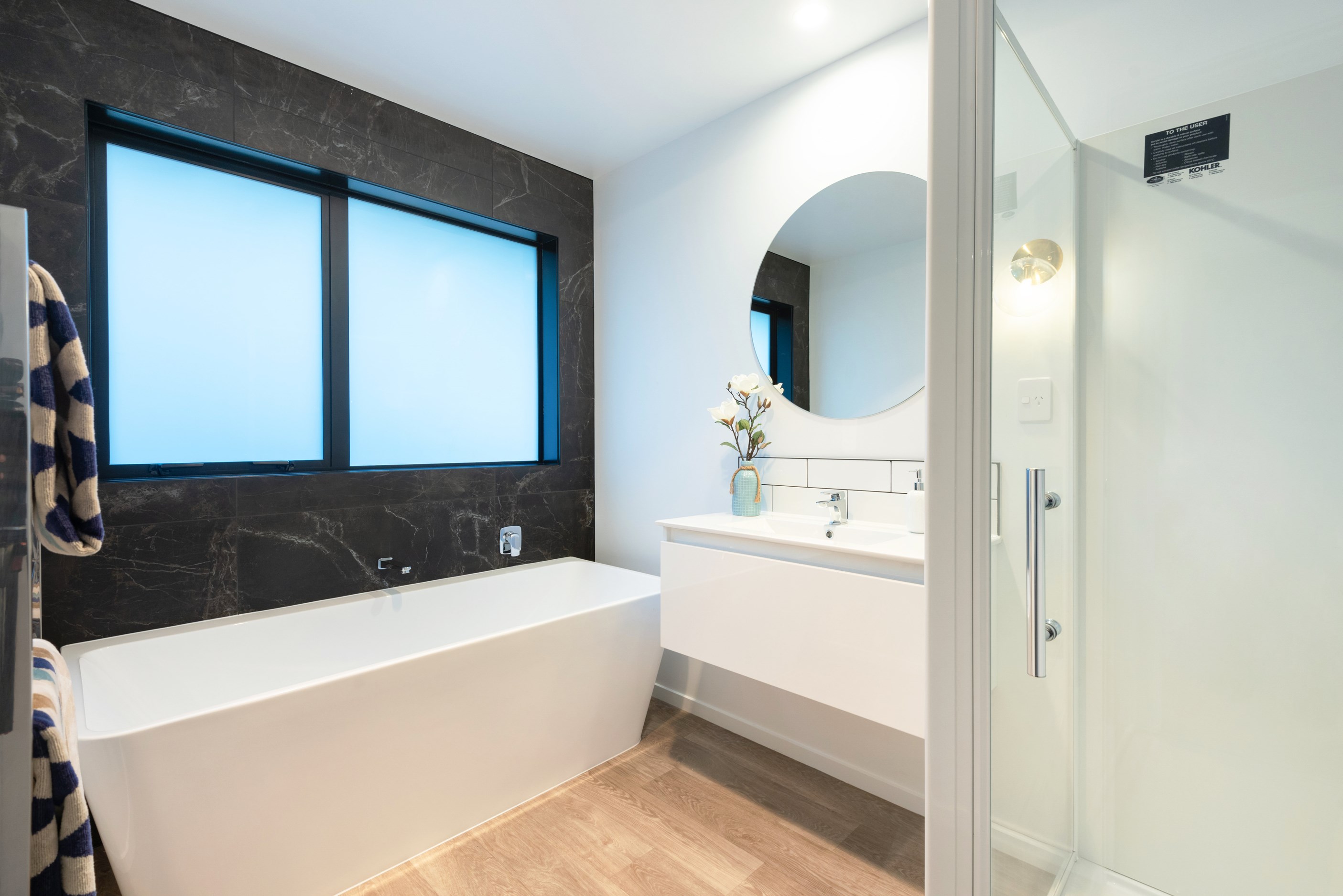 A combination of dark and light tones extends into the modern bathroom where a black feature wall contrasts with the white bathtub and vanity.
