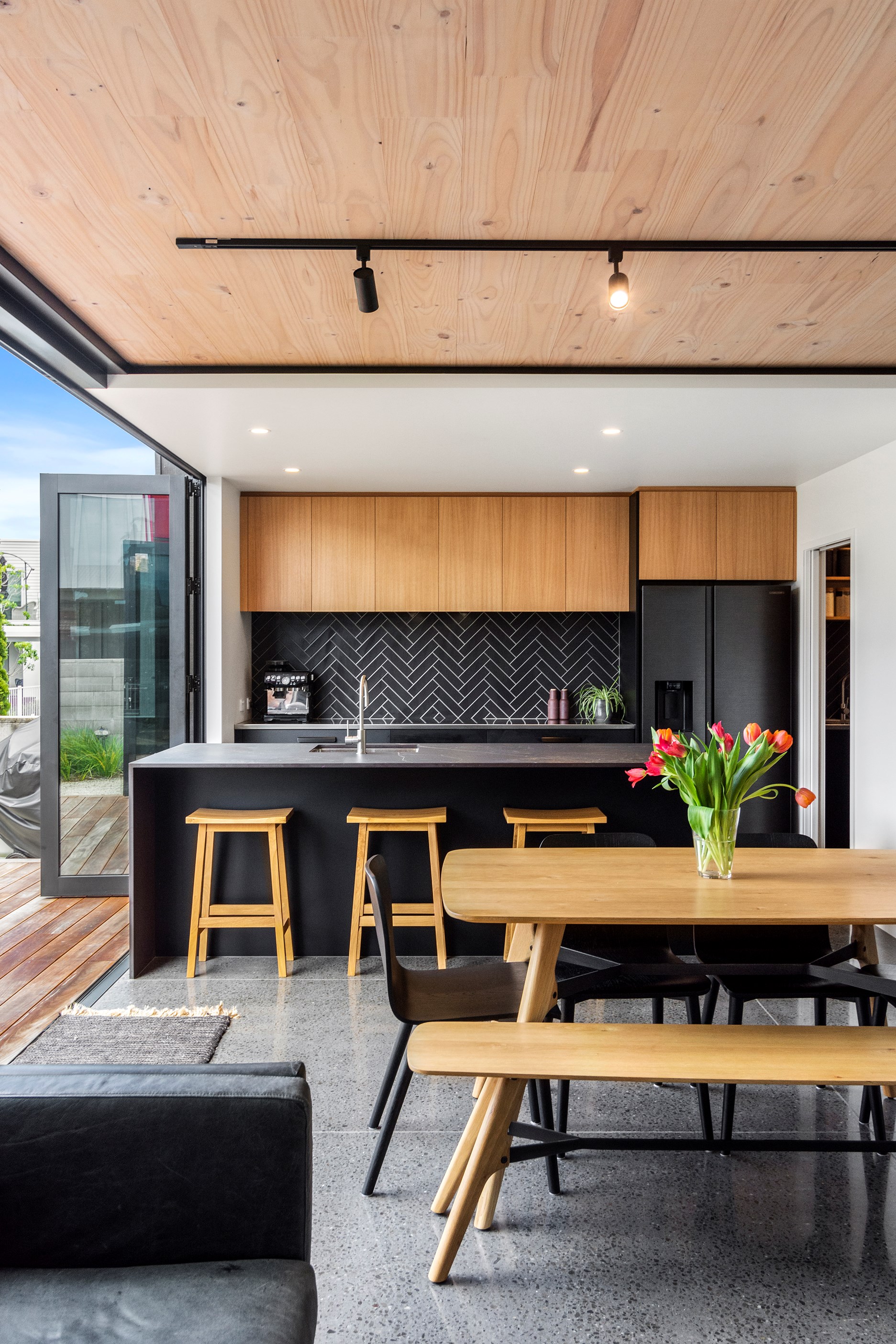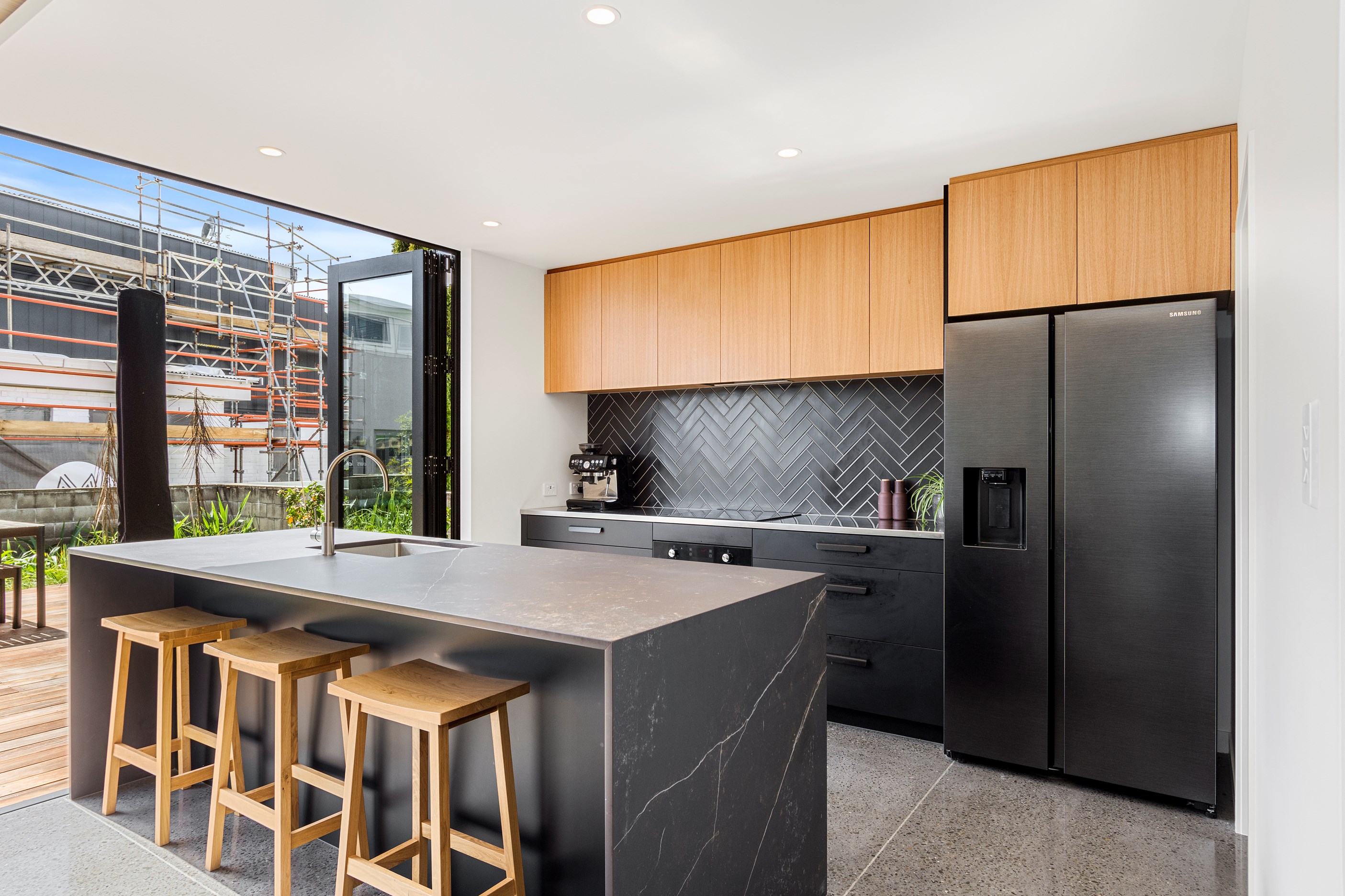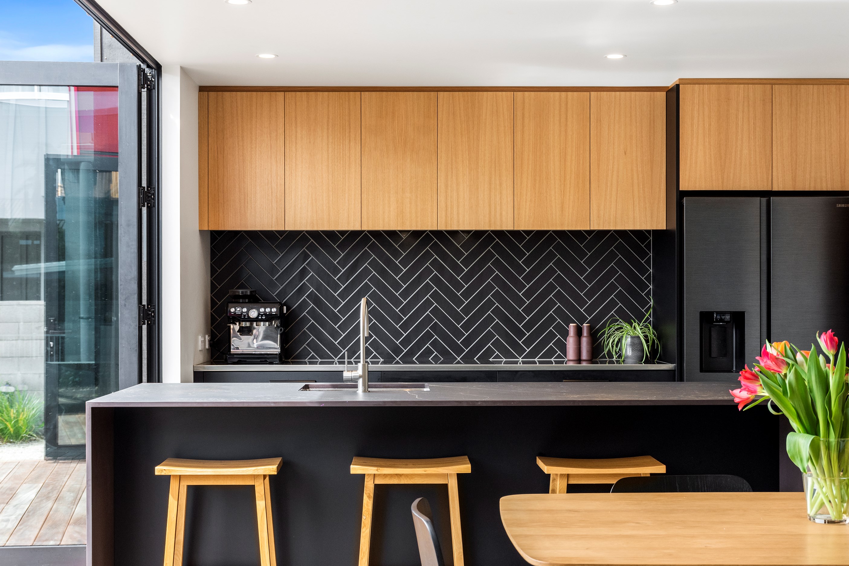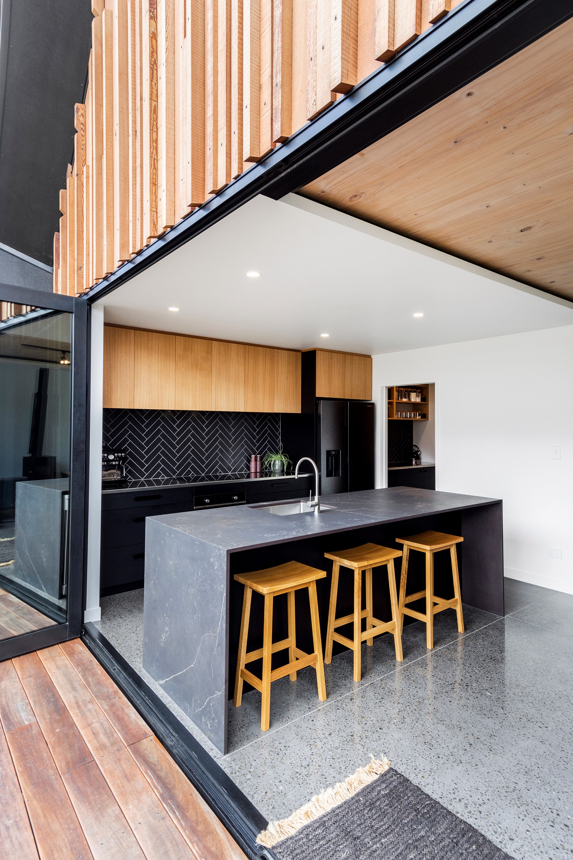 The black stone island in the kitchen draws on the owner’s connection to Tuhua/Mayor Island, where the glassy stone obsidian is found. Rangarua weave is repeated in the tiled splashback, and can also be found in the downstairs powder room and laundry.