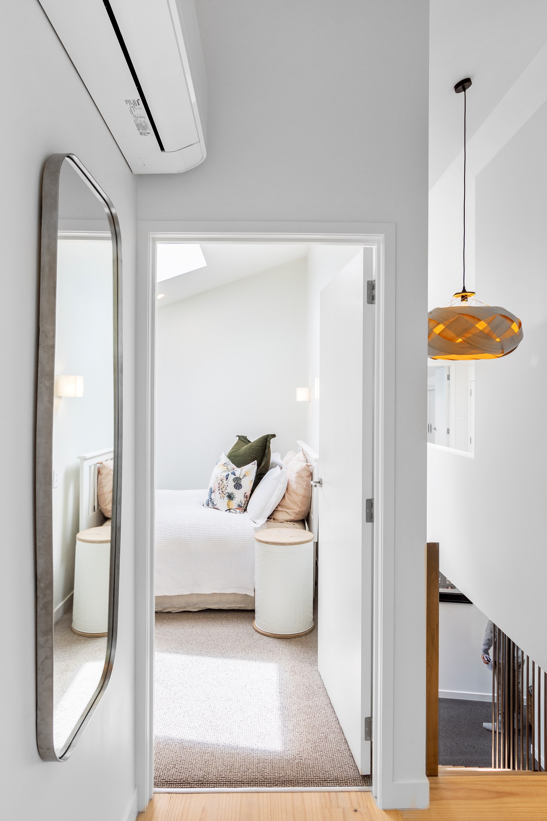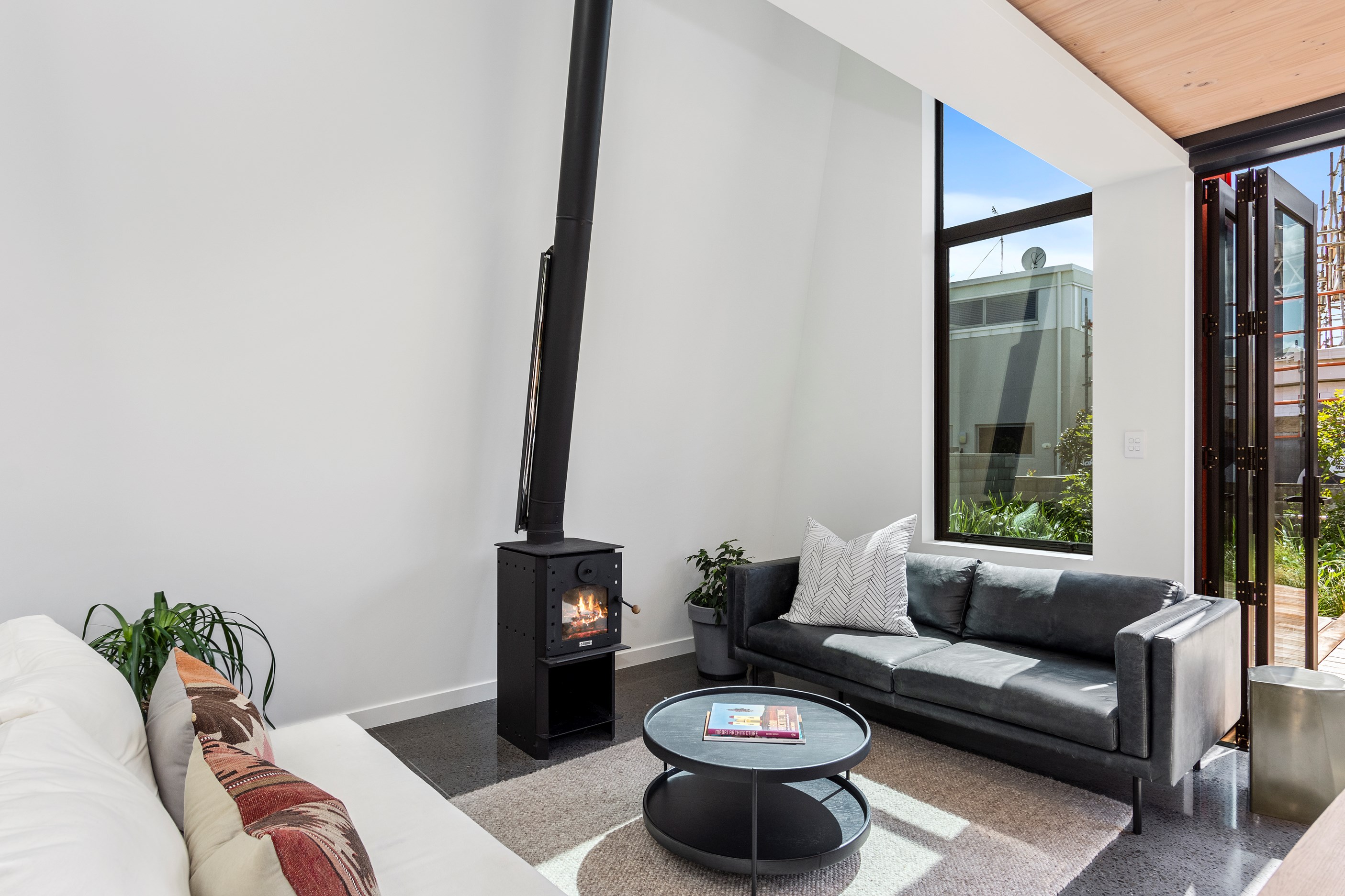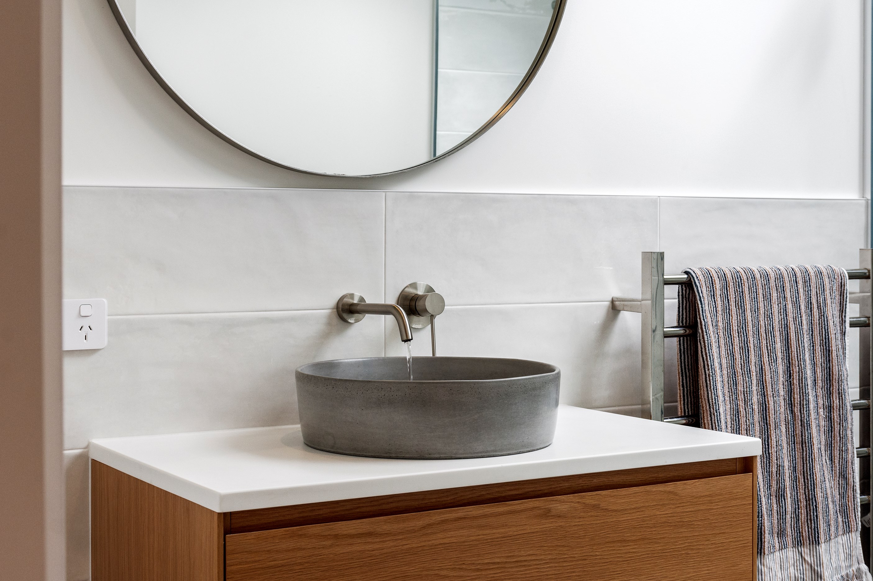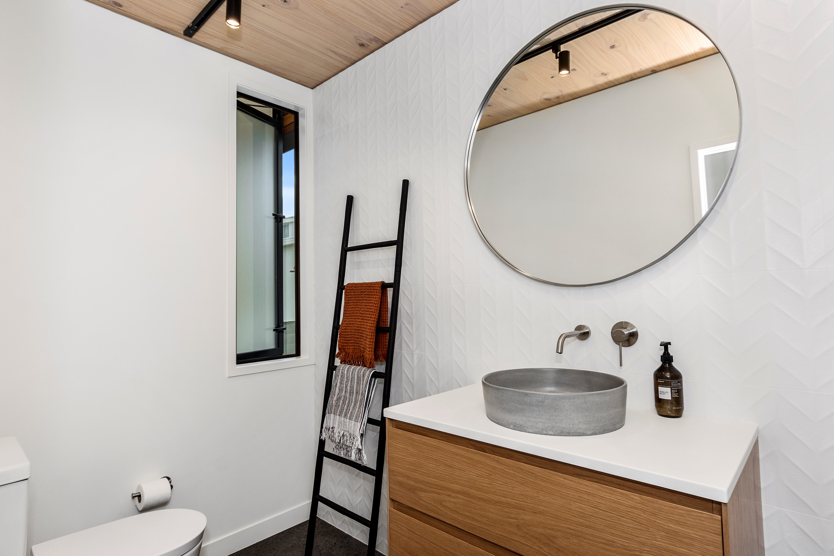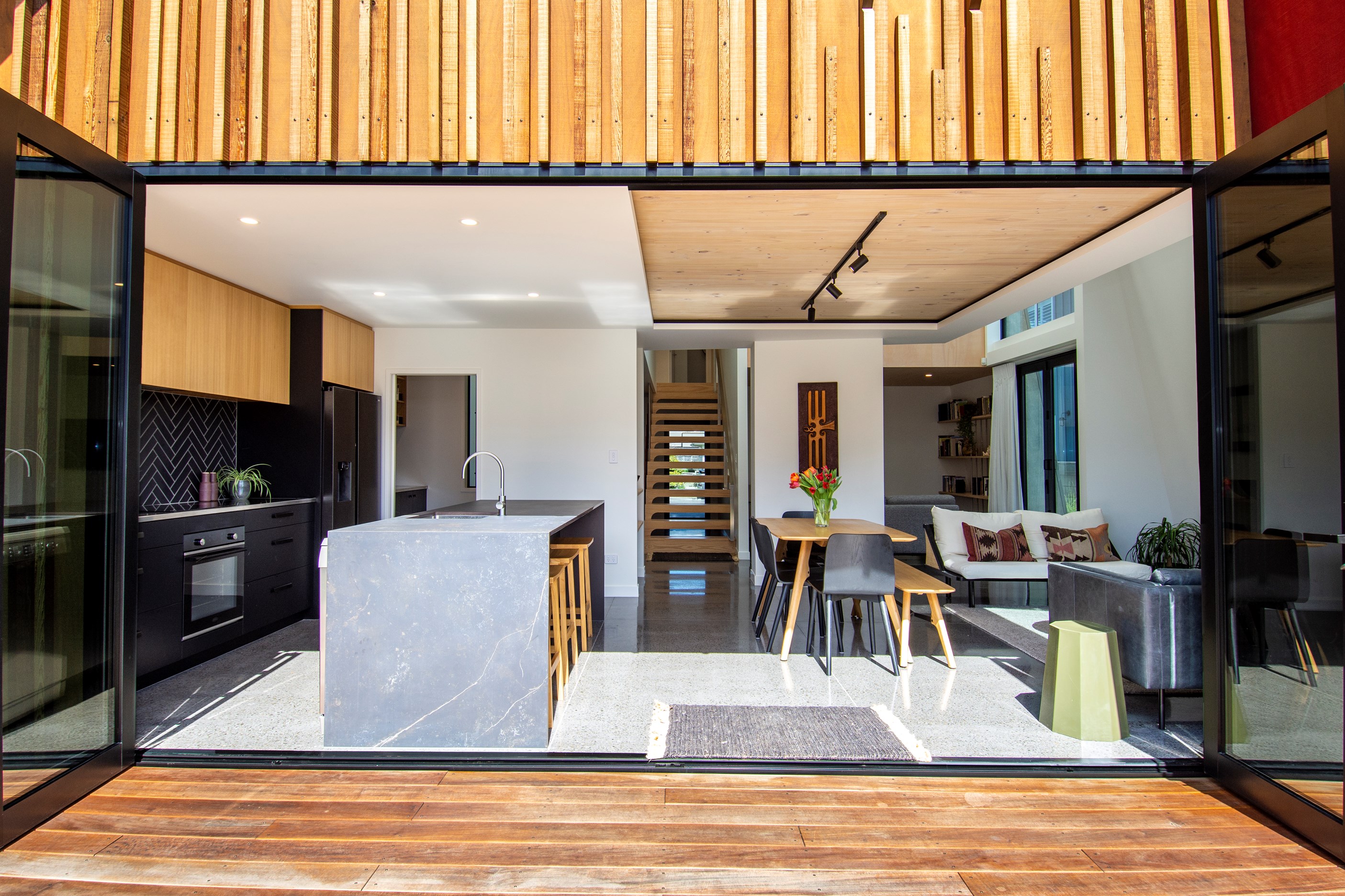The black stone island in the kitchen draws on the owner’s connection to Tuhua/Mayor Island, where the glassy stone obsidian is found. Rangarua weave is repeated in the tiled splashback, and can also be found in the downstairs powder room and laundry.