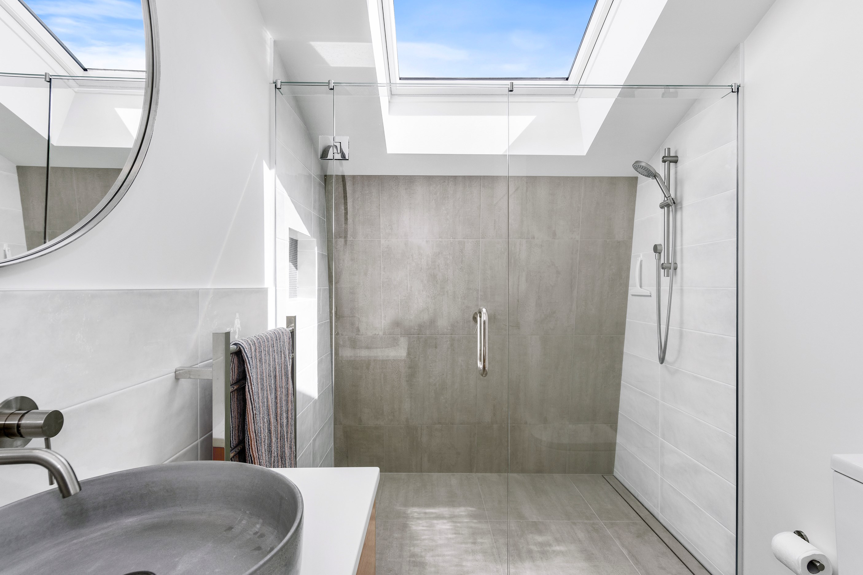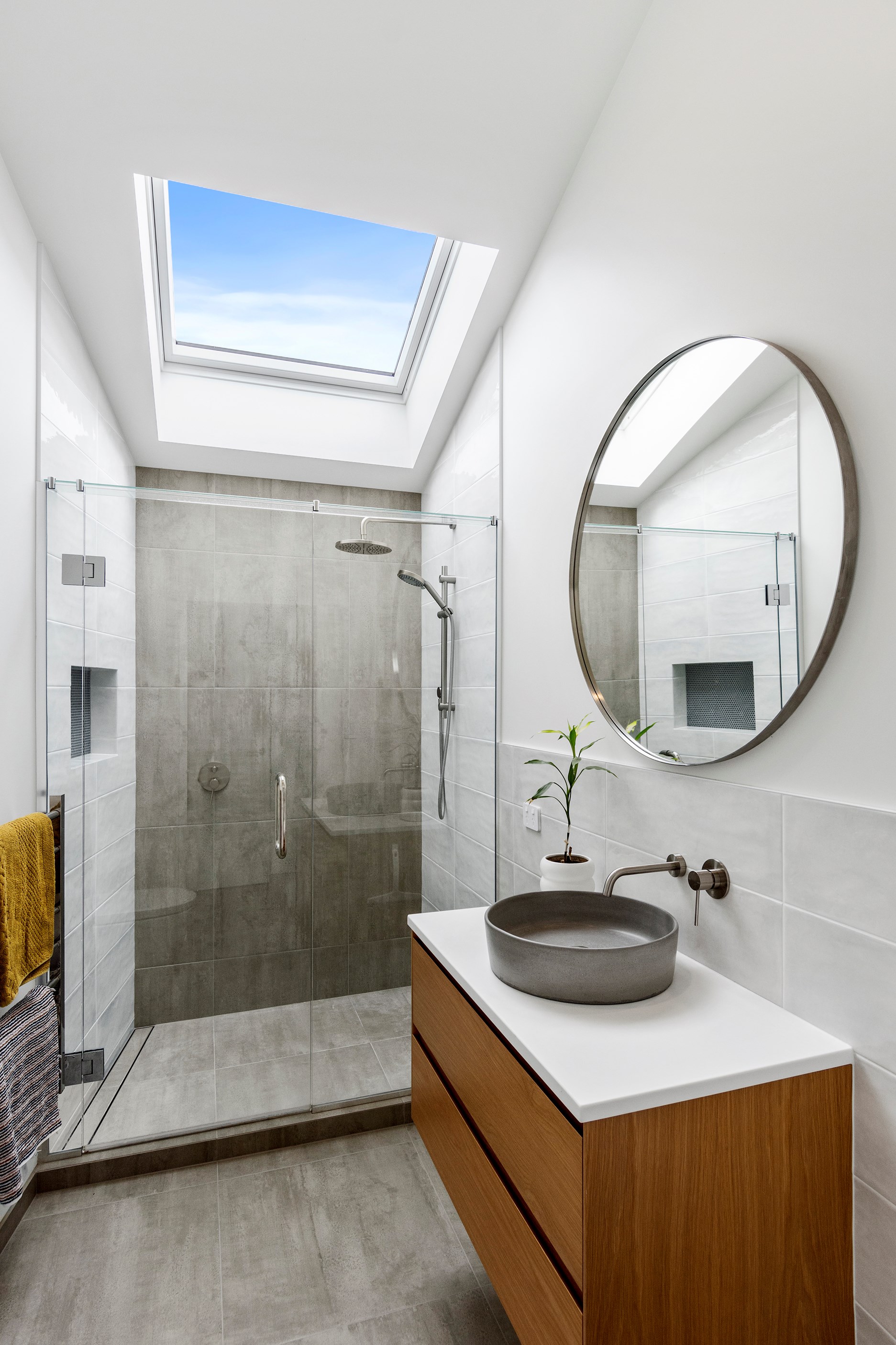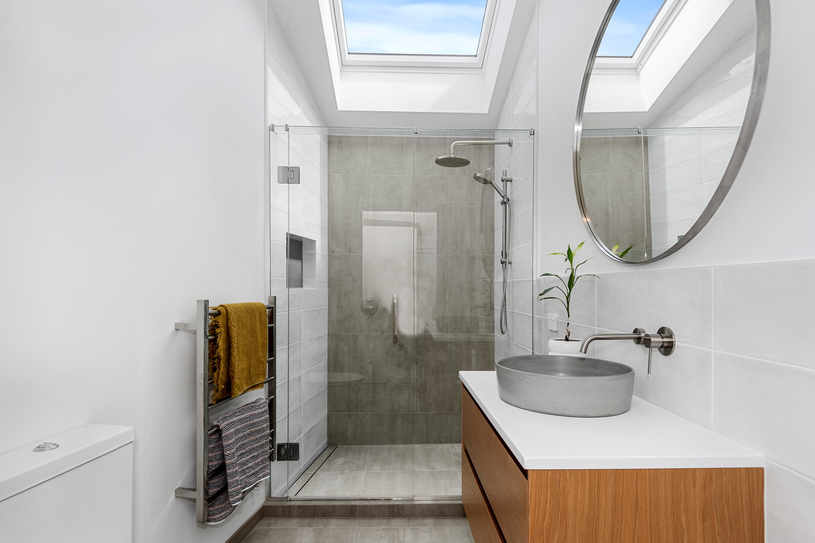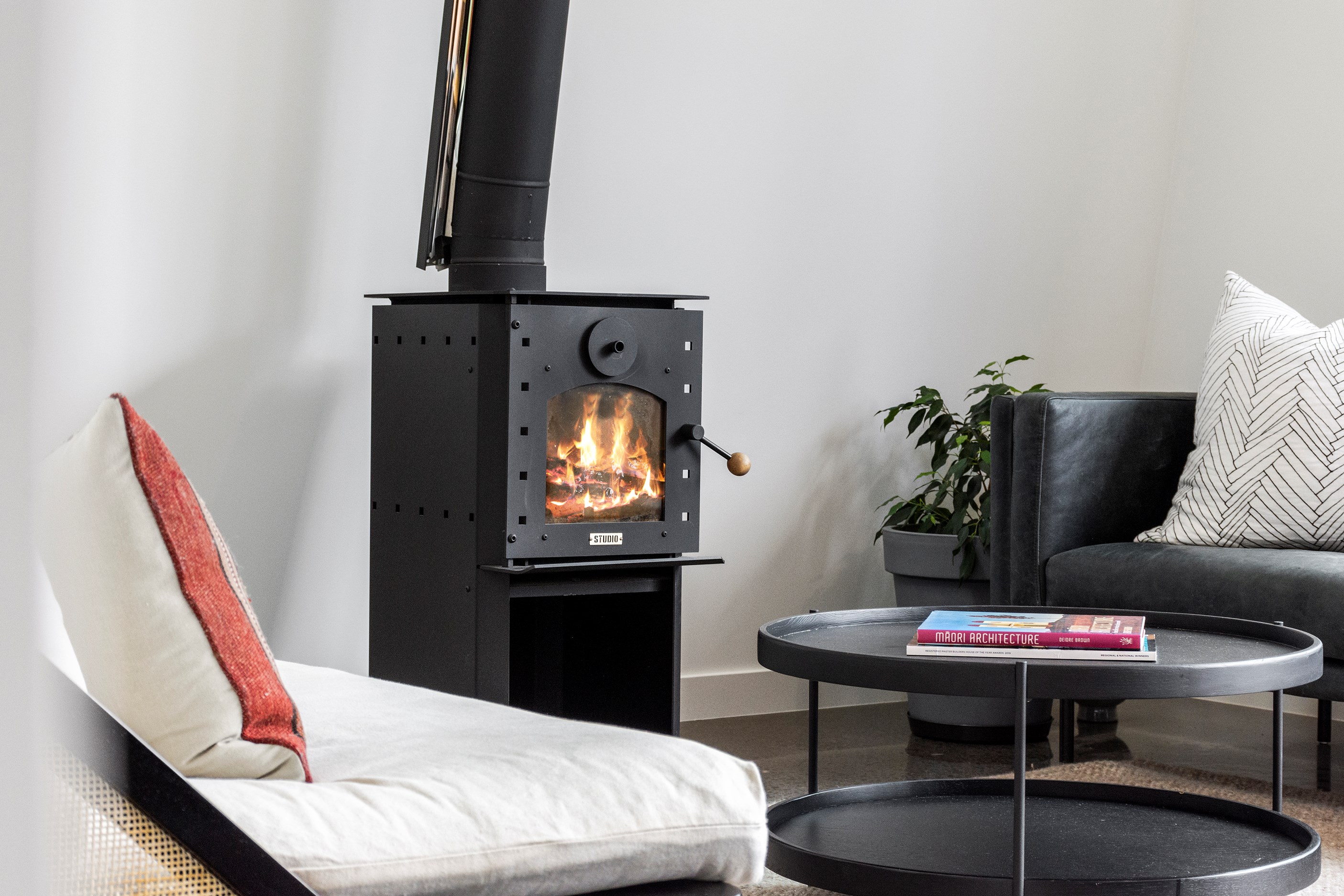 The black stone island in the kitchen draws on the owner’s connection to Tuhua/Mayor Island, where the glassy stone obsidian is found. Rangarua weave is repeated in the tiled splashback, and can also be found in the downstairs powder room and laundry.
