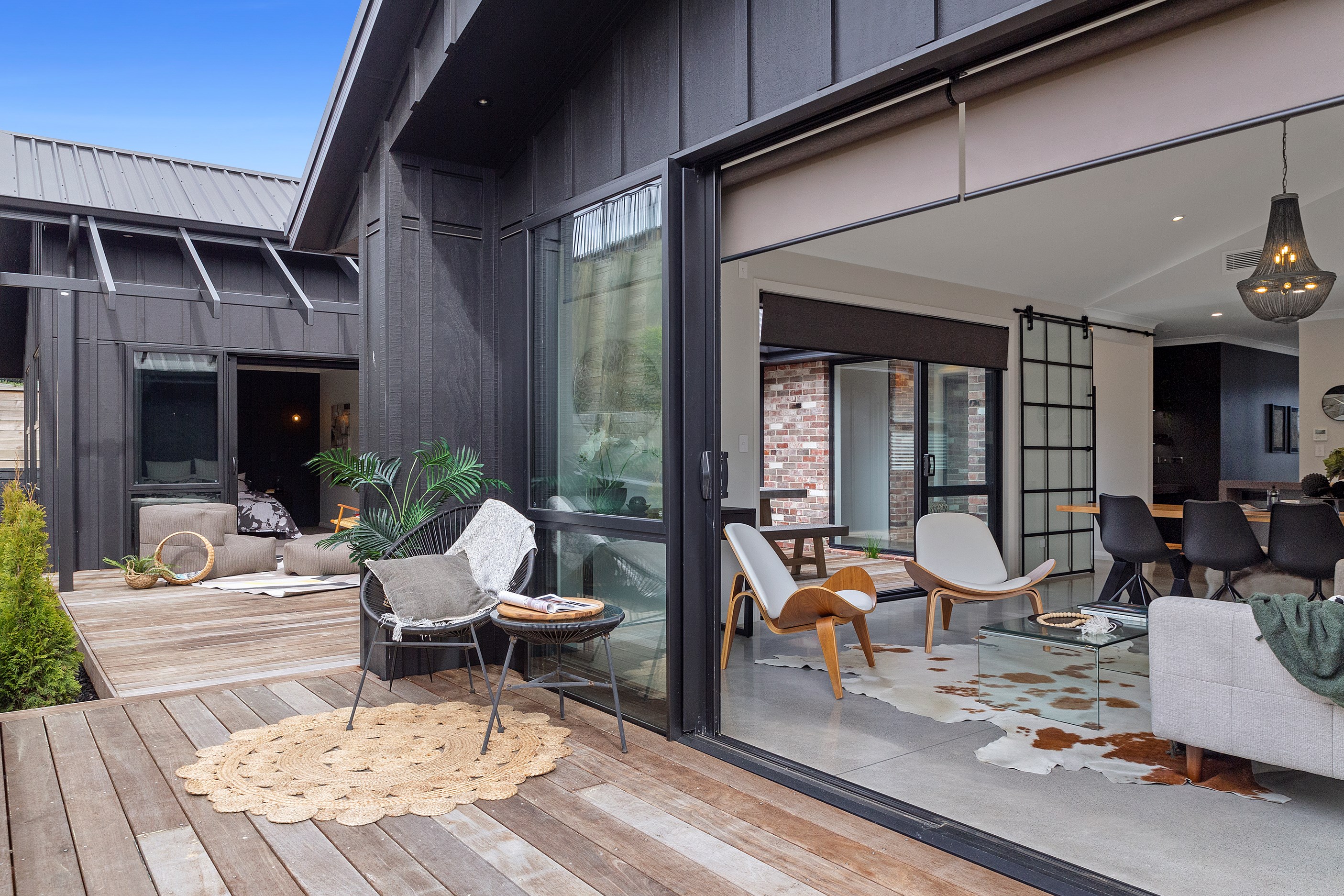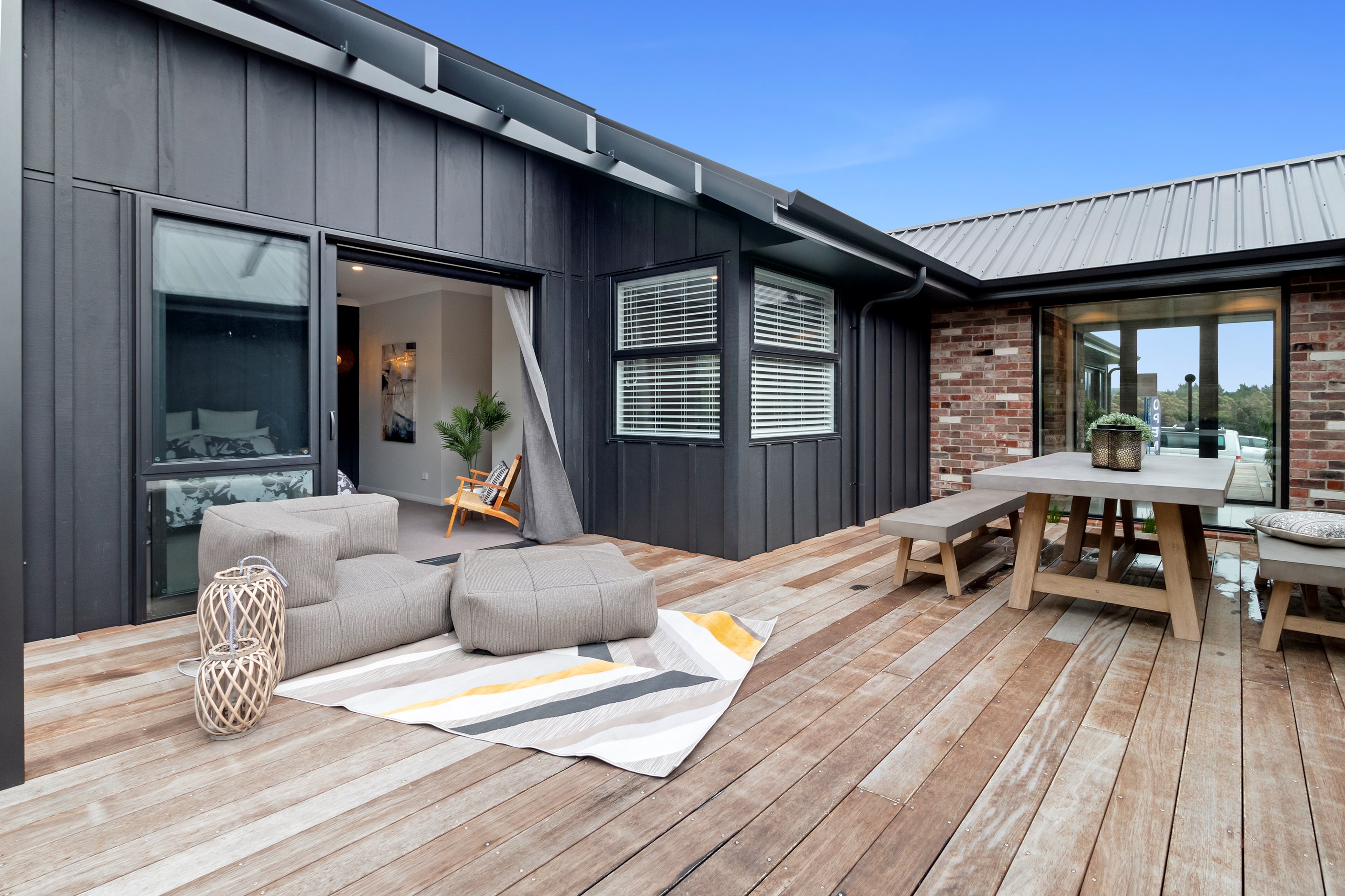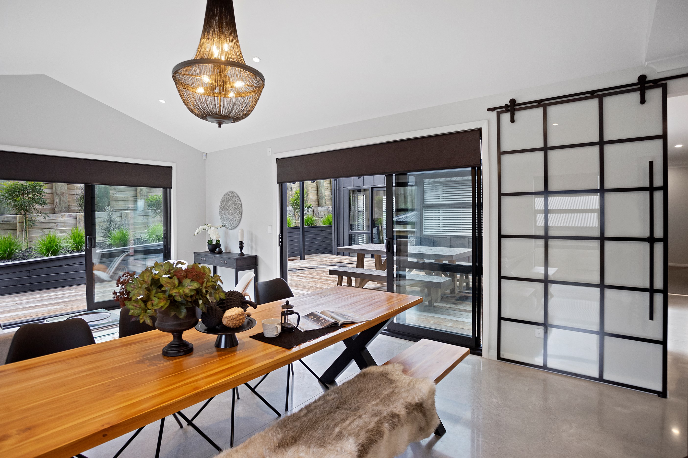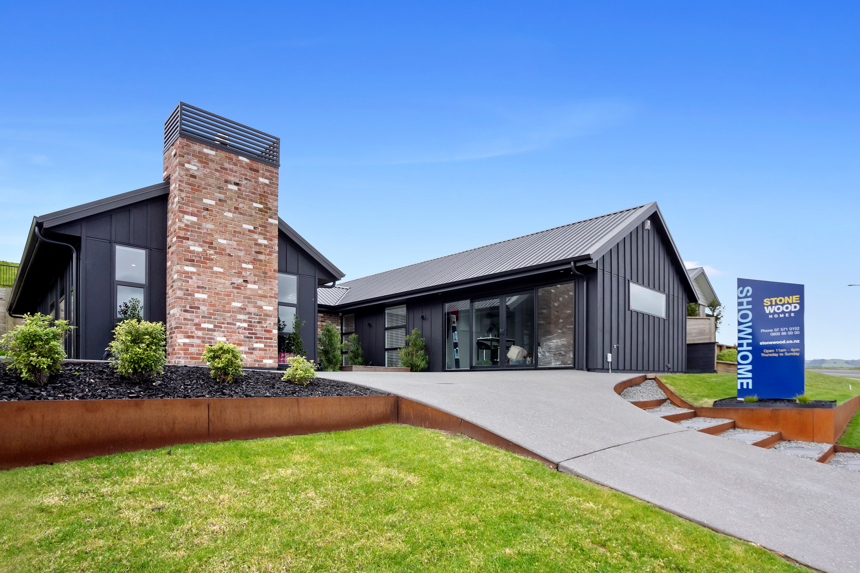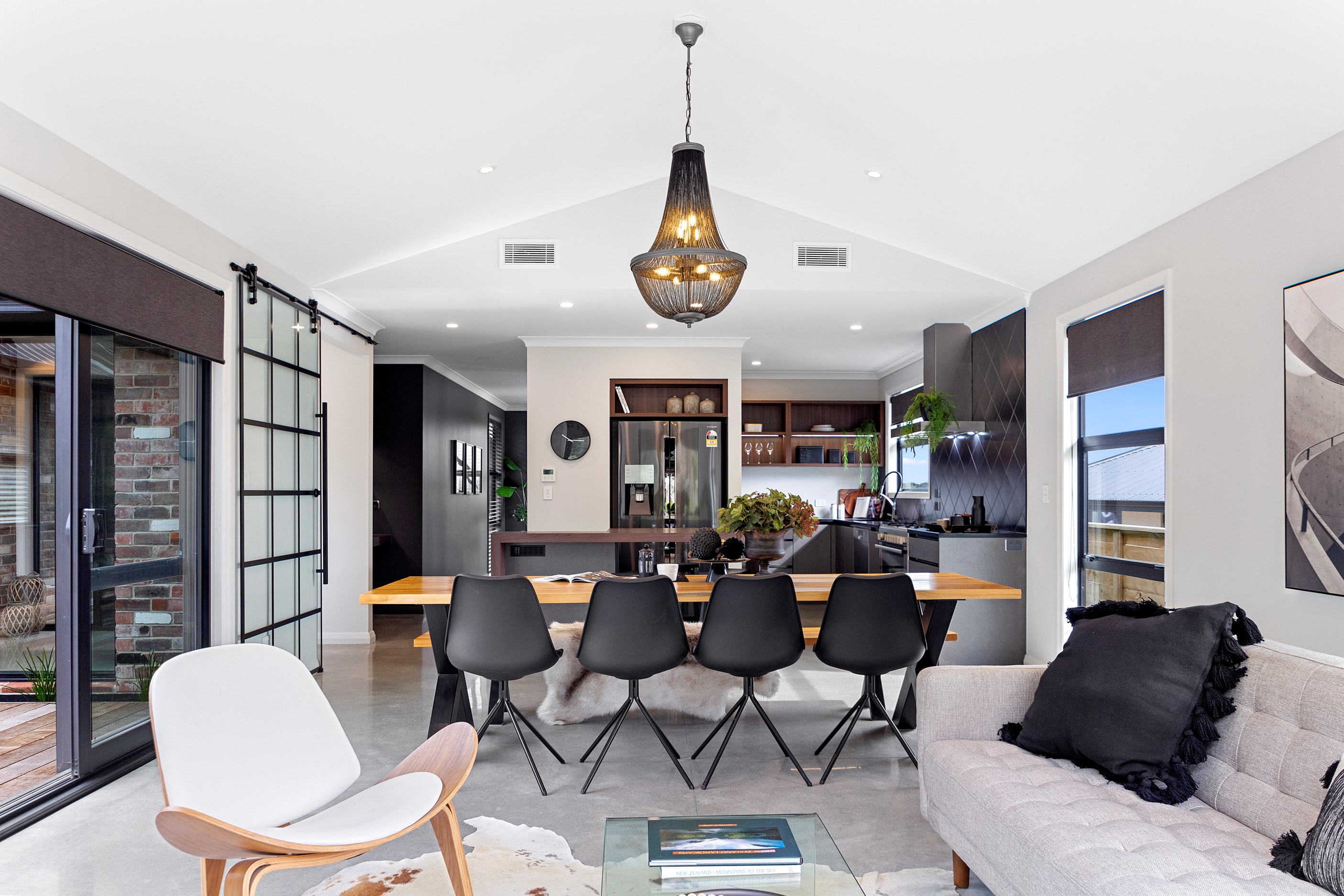 The ‘Pavillion’ design is popular for its layout and strong lines, but there are plenty more reasons why it has become a customer favourite. Solar panels mean this Tauranga show home can be run throughout the day, without having to draw electricity from the grid. Polished concrete floors are warmed by the morning sun.