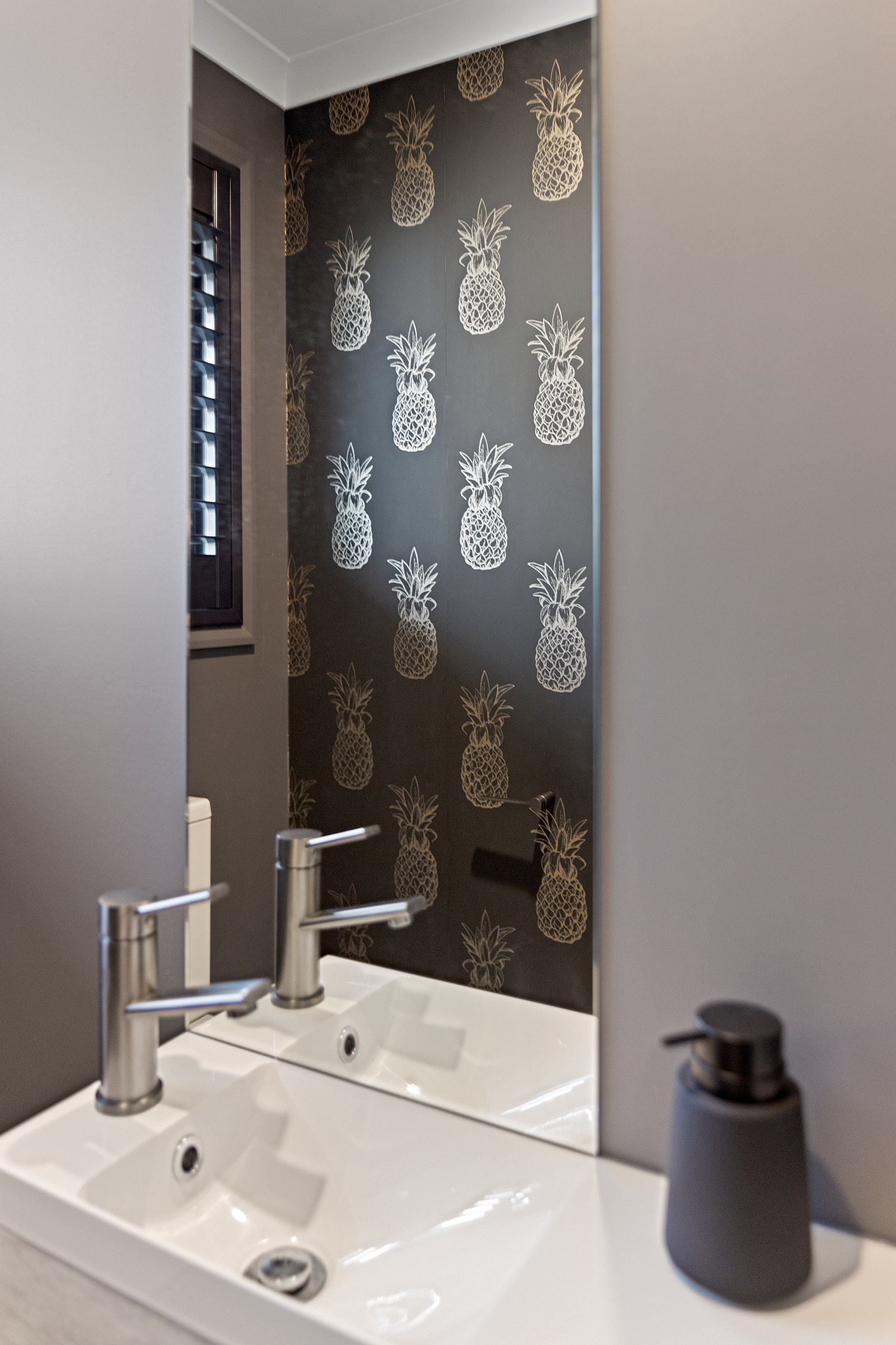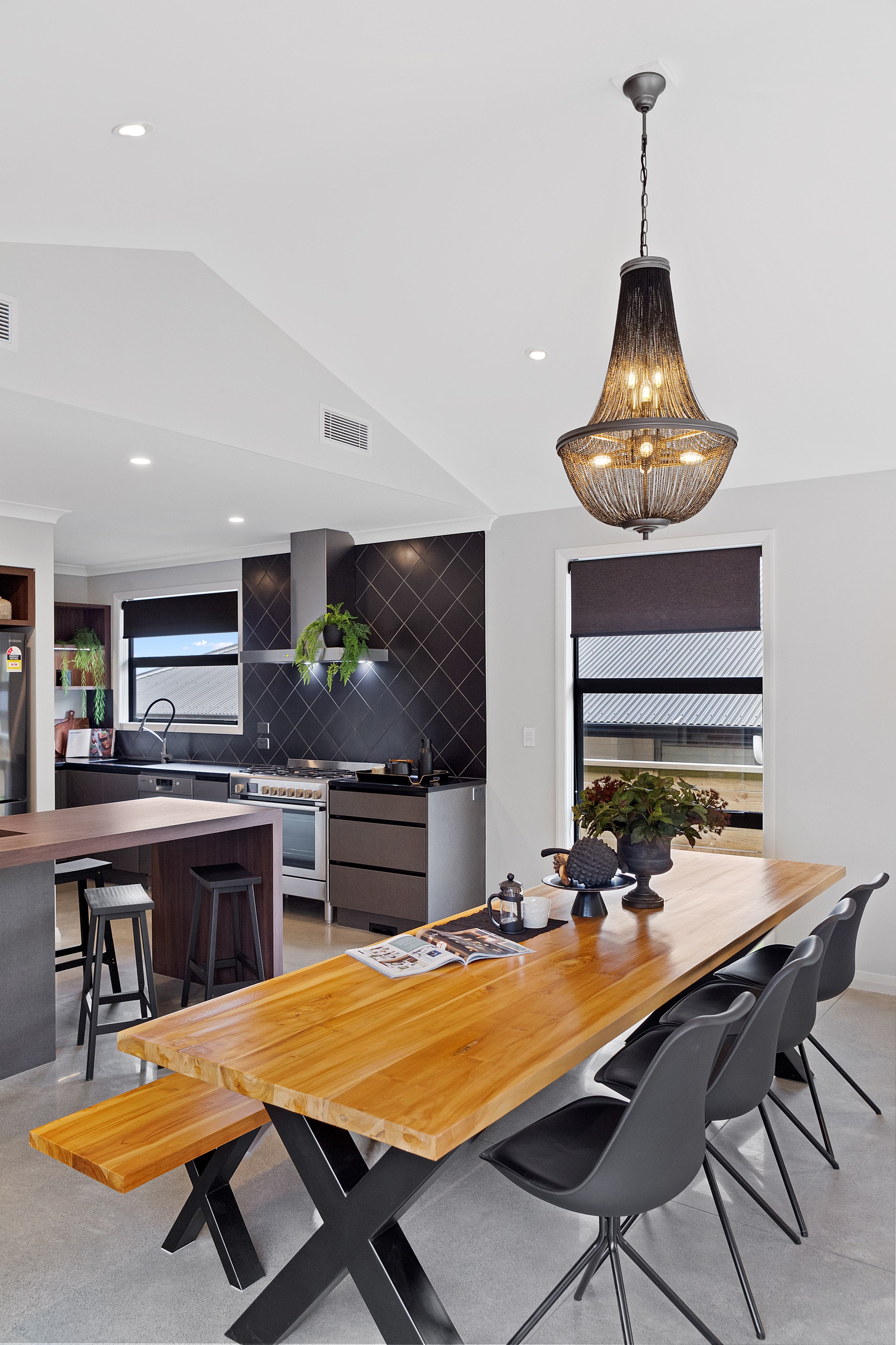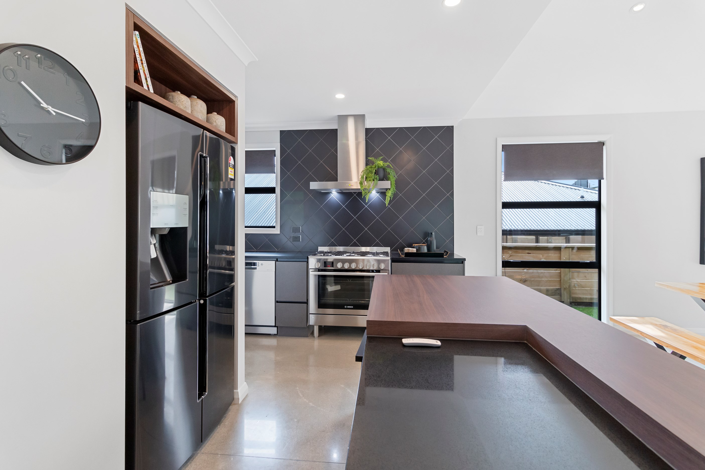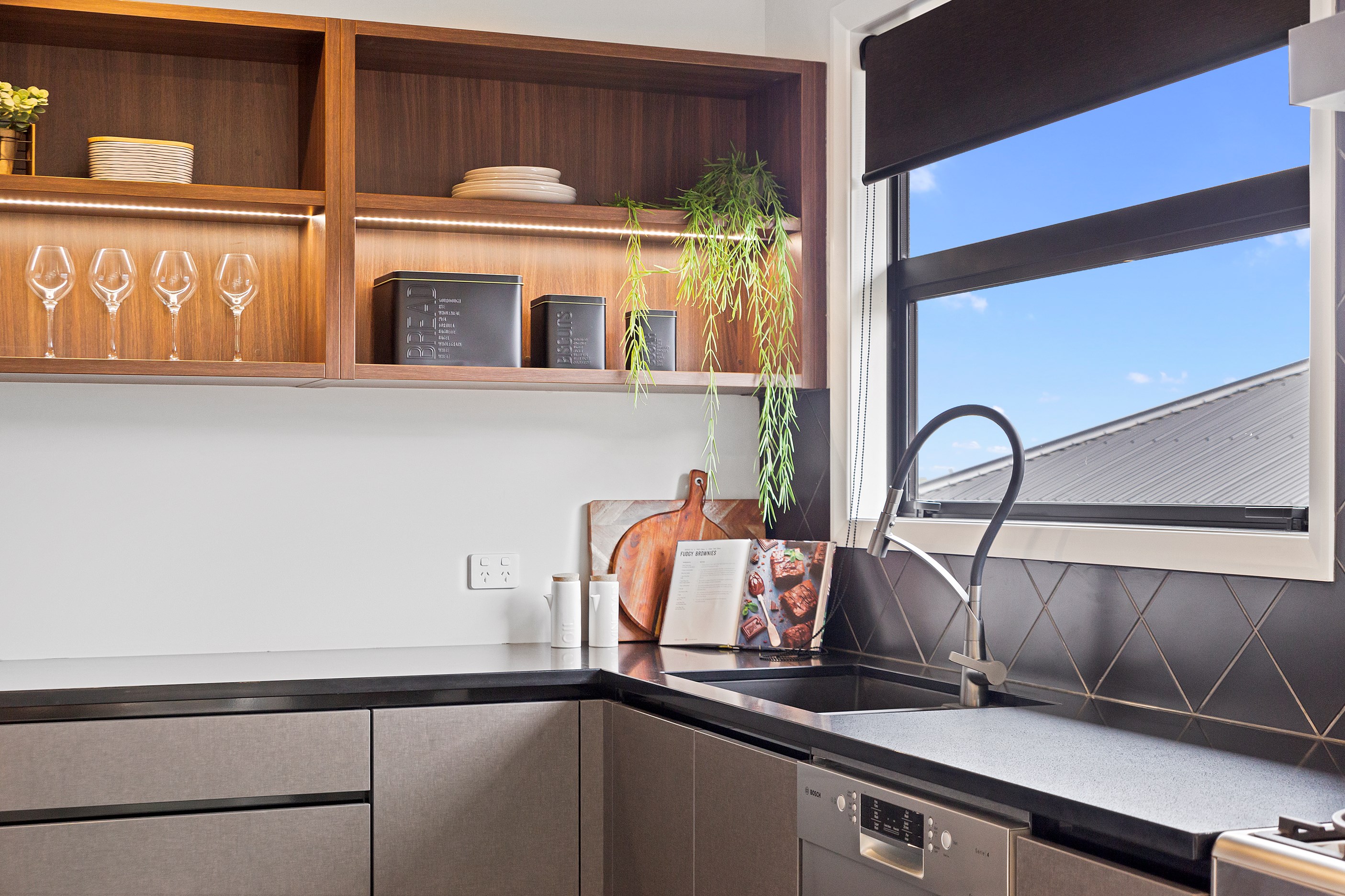 The charcoal, black and jarrah kitchen combination is simple yet supremely stylish. You’ll find concealed LED light trips, a wraparound scullery and a breakfast/conversation island.