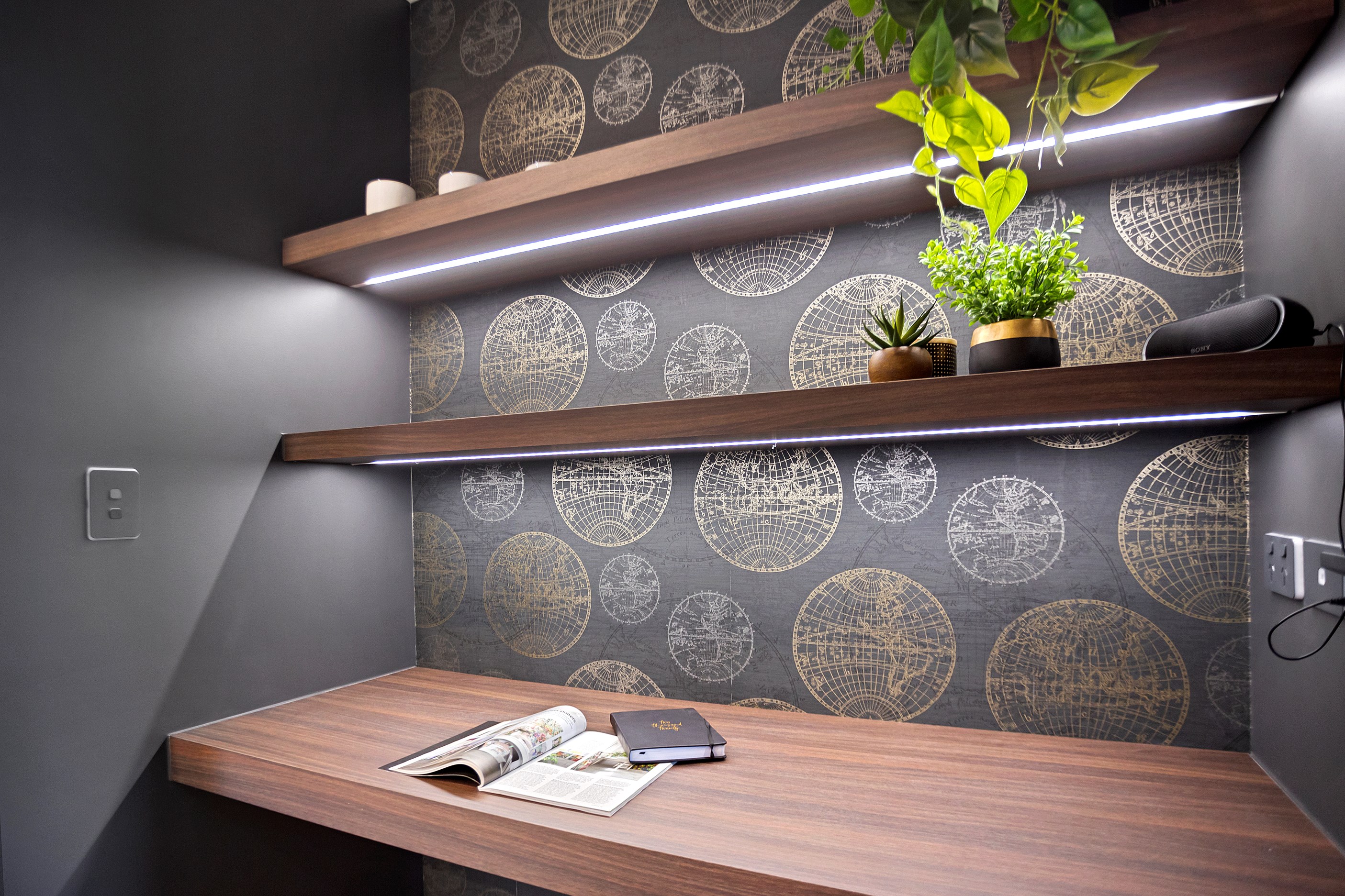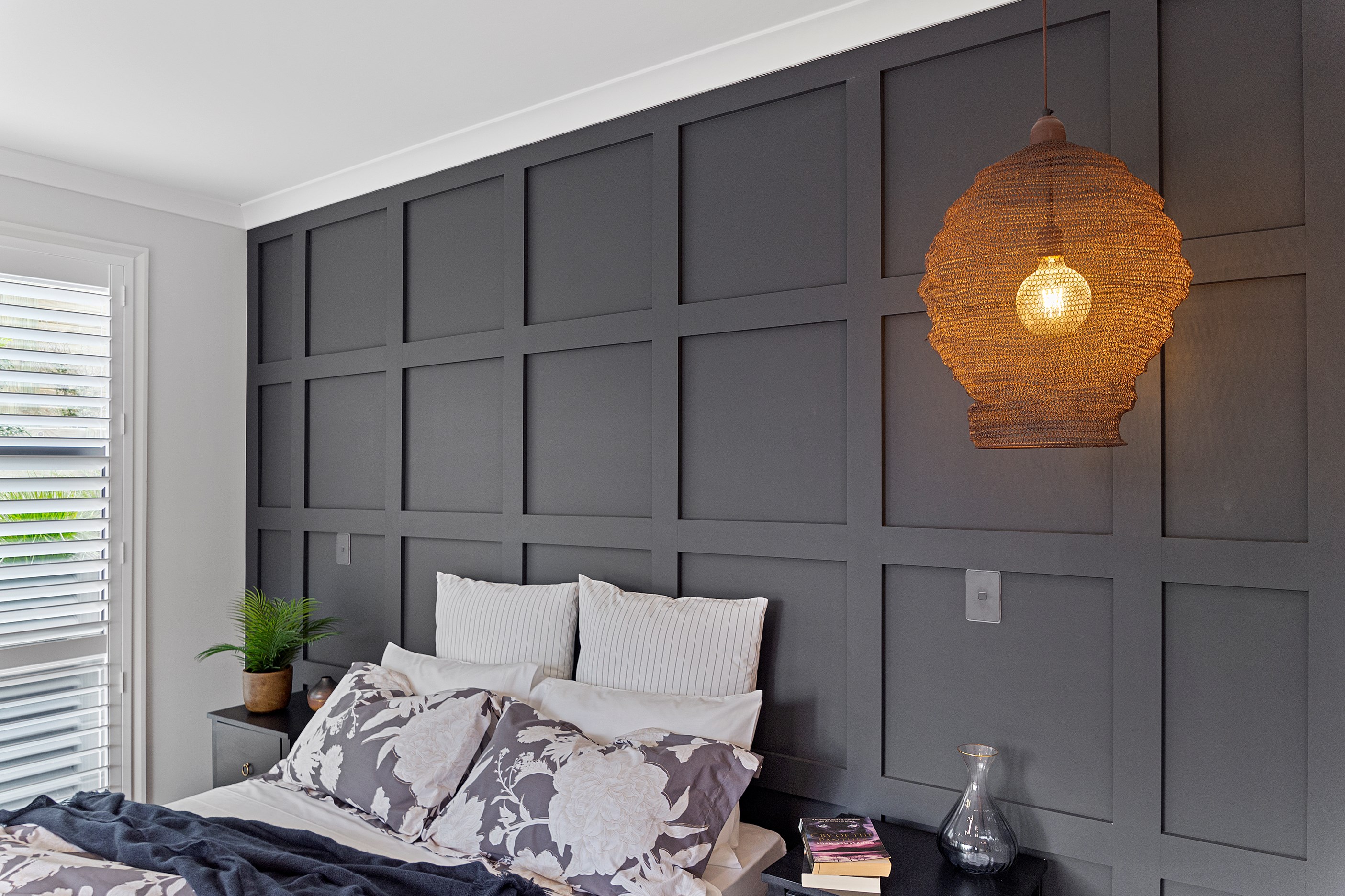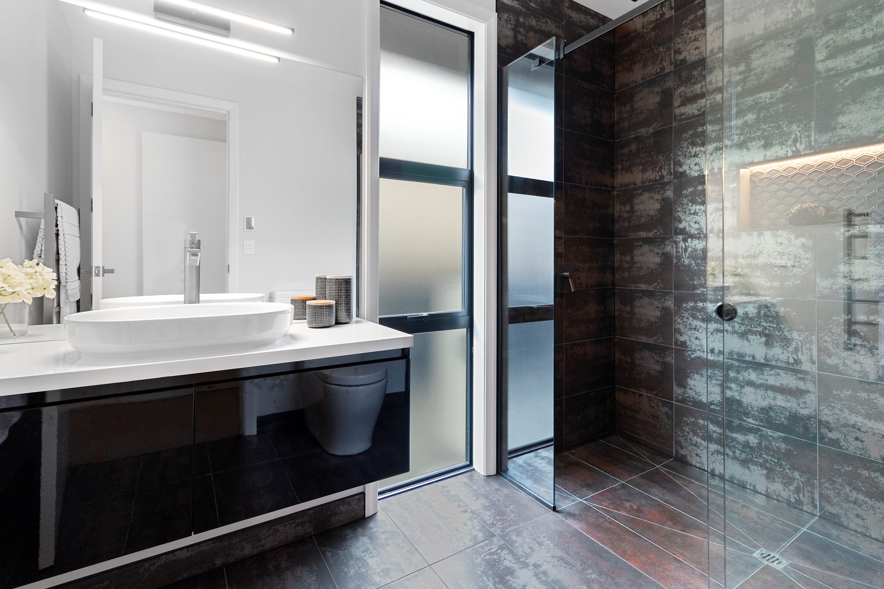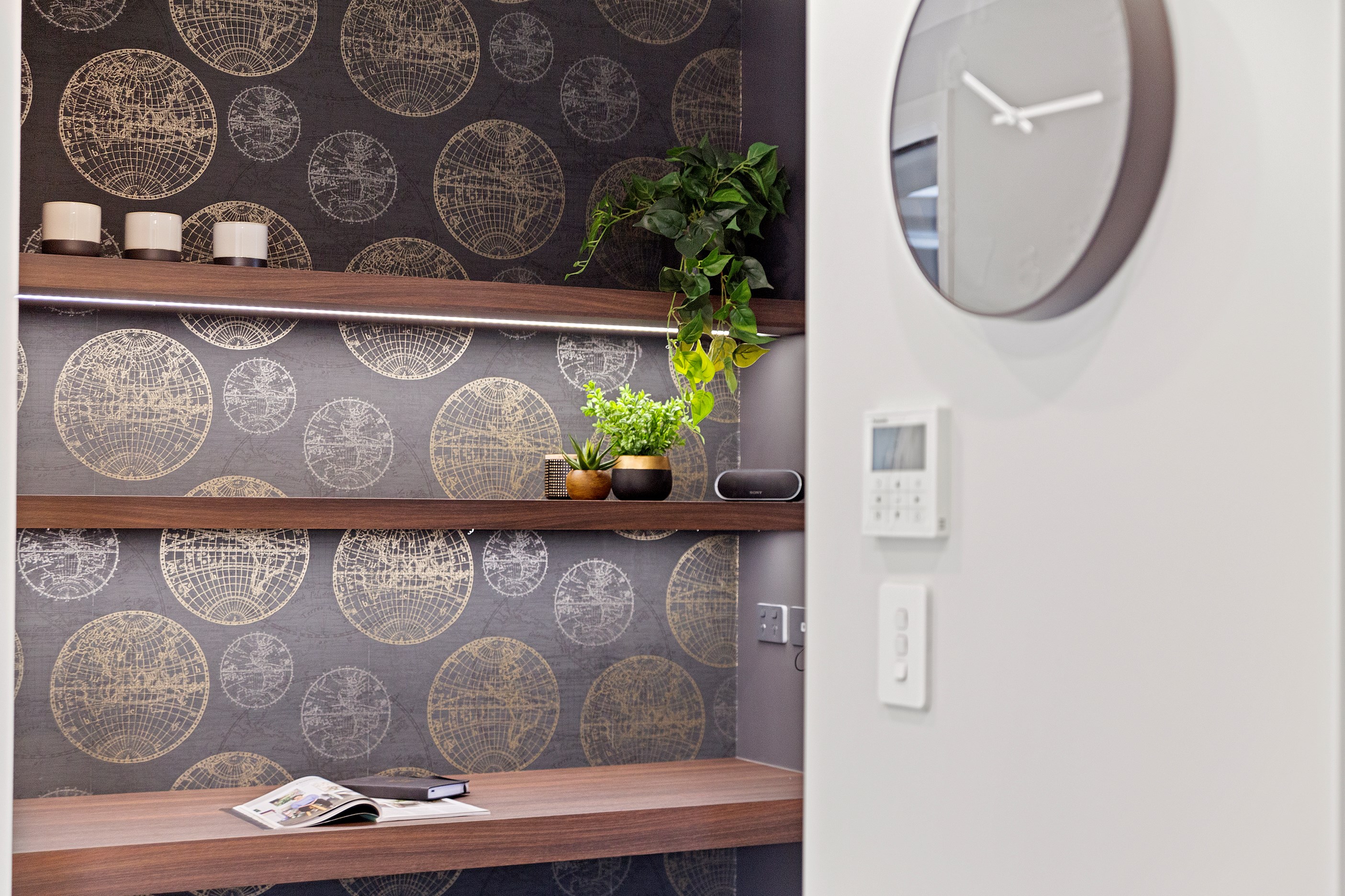 The charcoal, black and jarrah kitchen combination is simple yet supremely stylish. You’ll find concealed LED light trips, a wraparound scullery and a breakfast/conversation island.