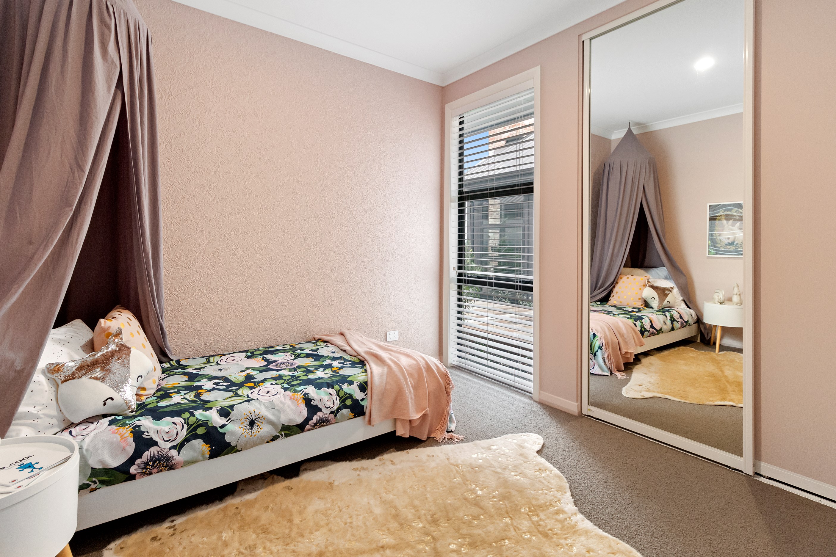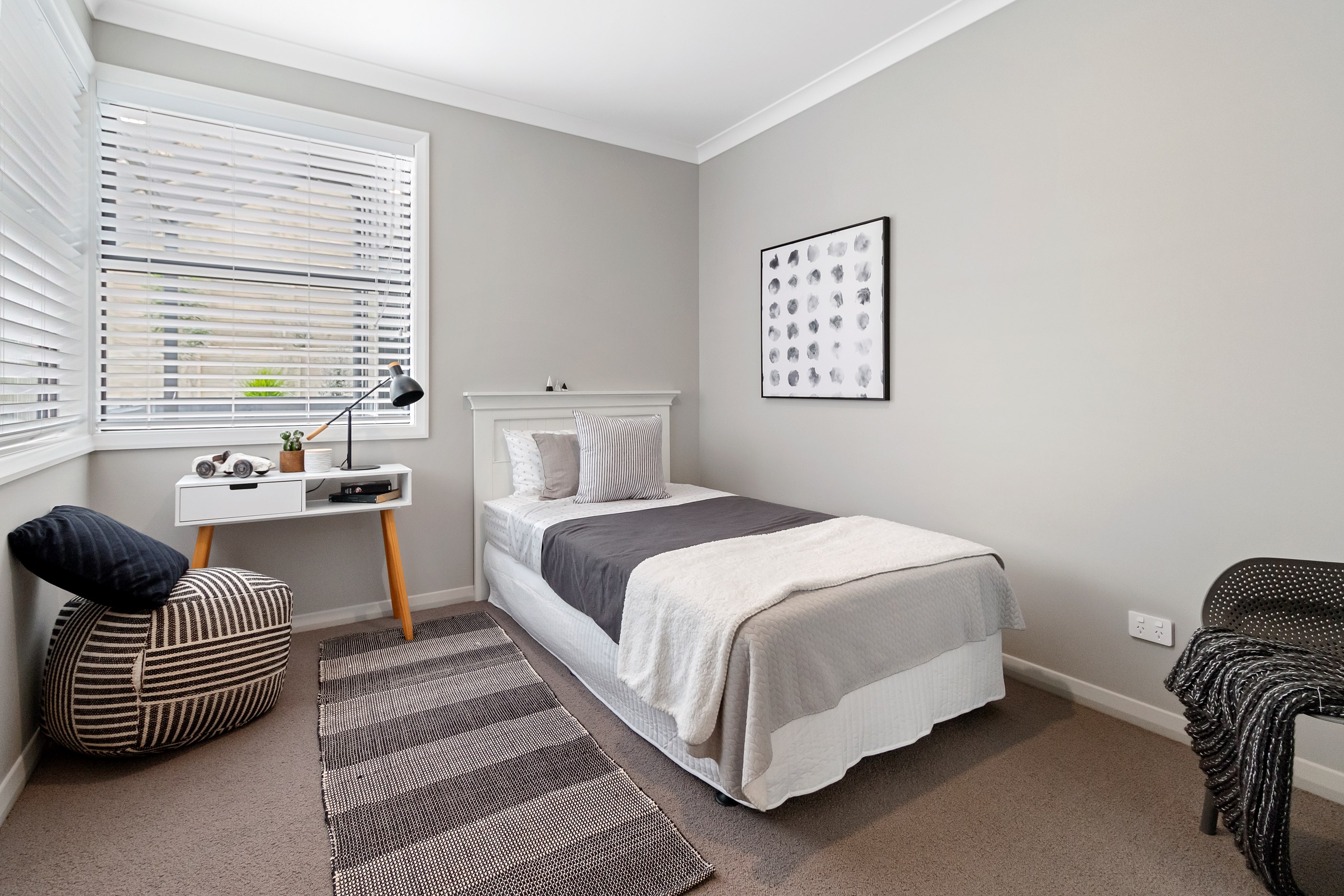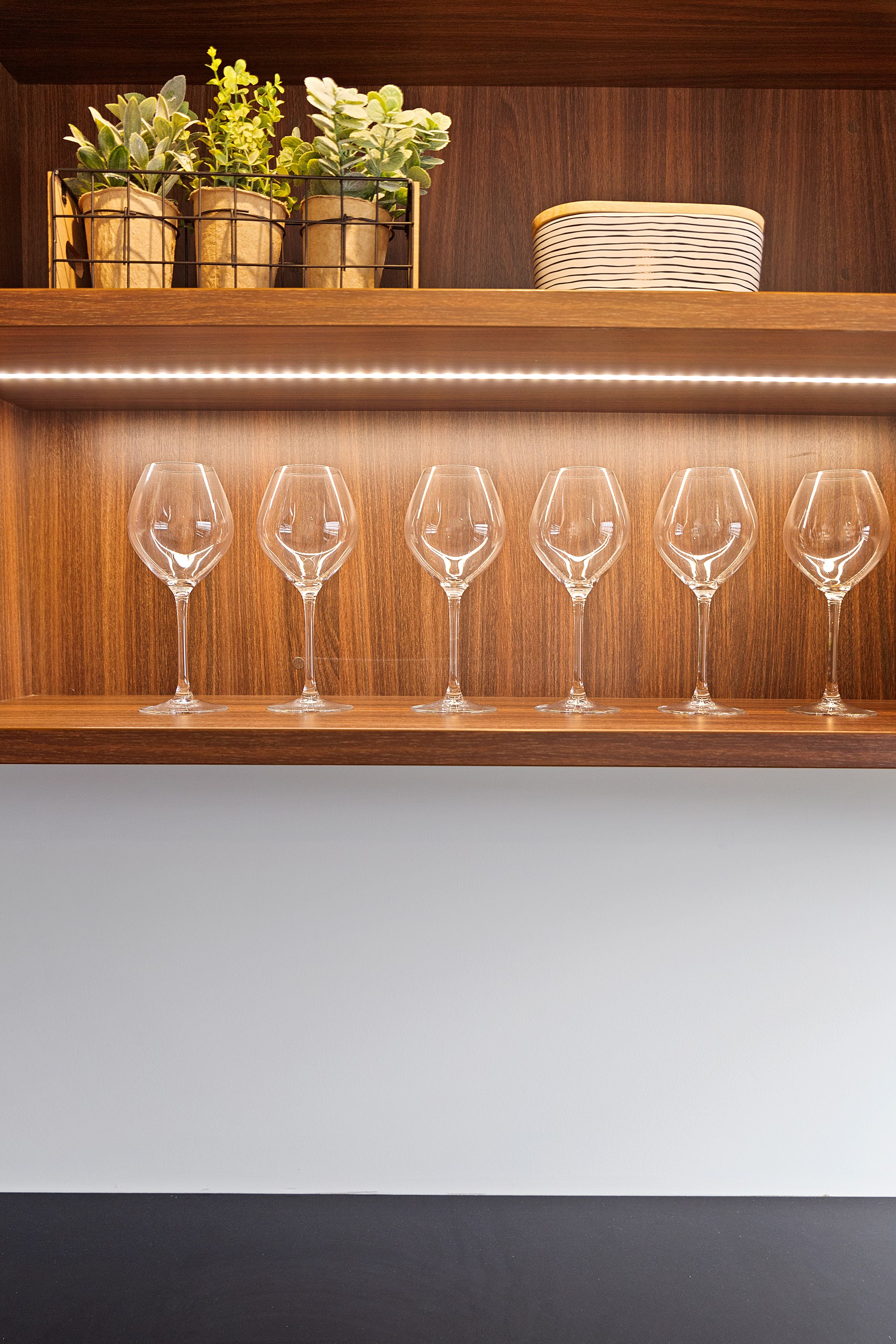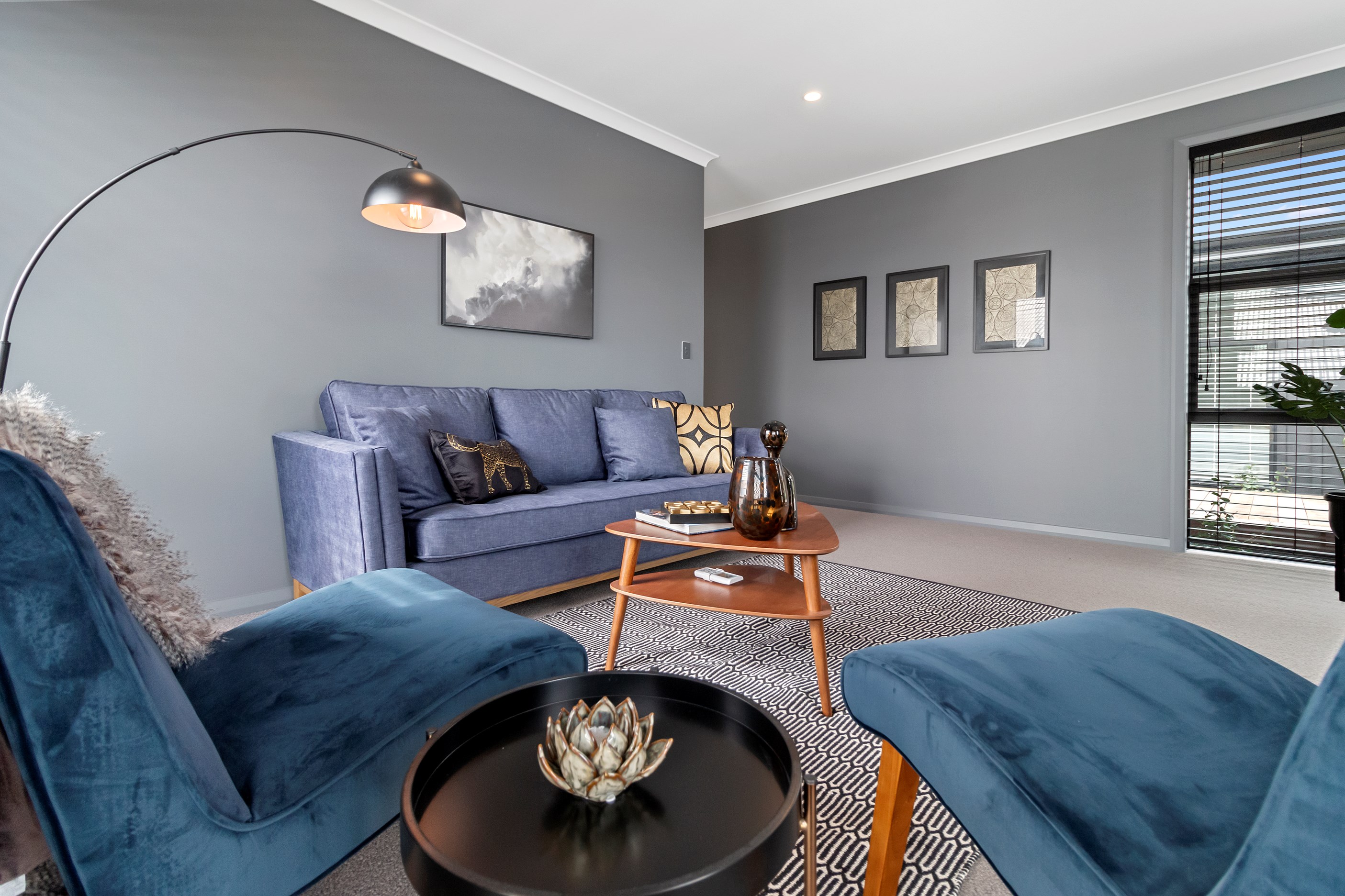 The charcoal, black and jarrah kitchen combination is simple yet supremely stylish. You’ll find concealed LED light trips, a wraparound scullery and a breakfast/conversation island.