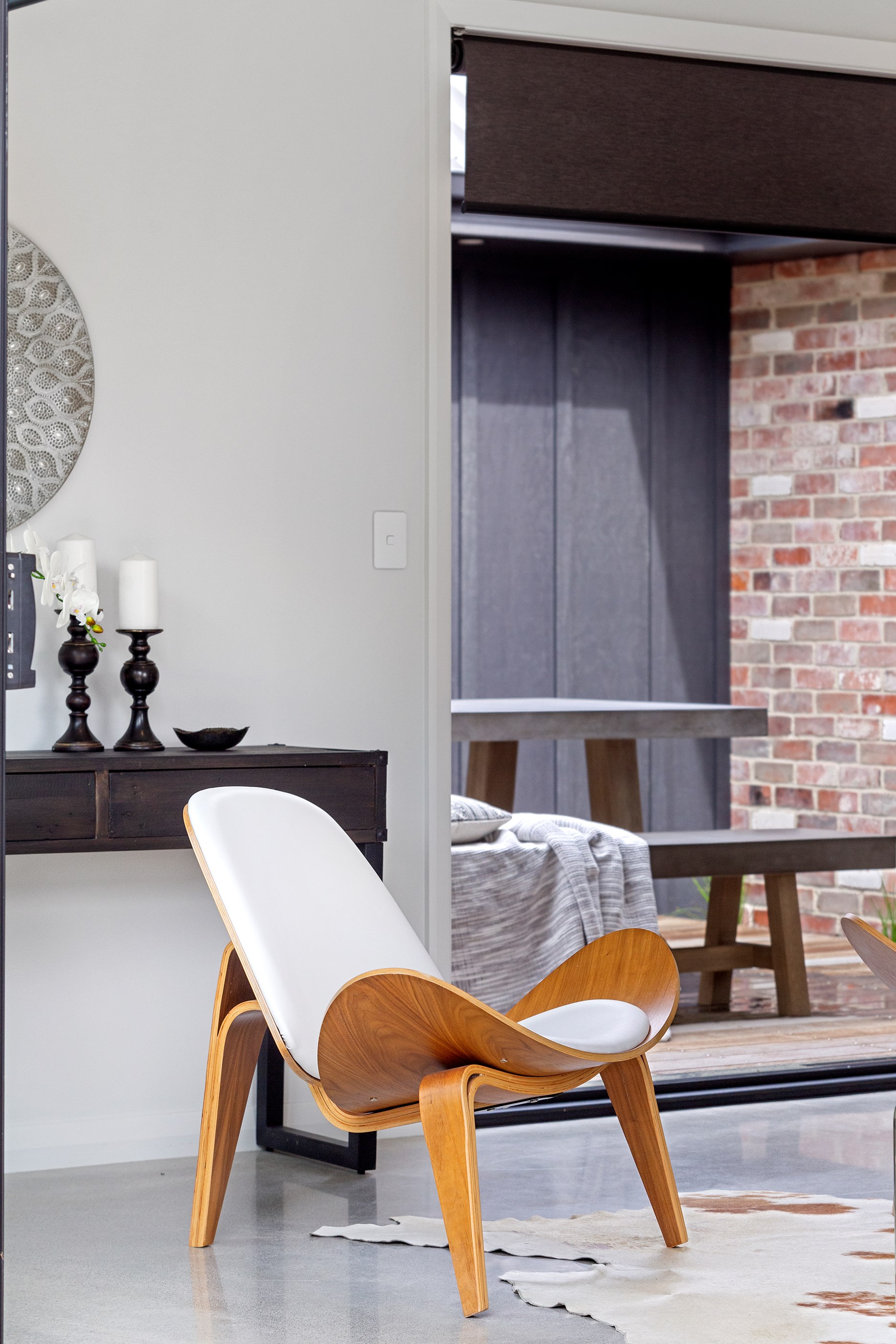 The 224sqm floorplan – two pavilions and a link forming an H shape – offers sheltered outdoor living areas with views. Step through the front door and you’re in a foyer with a study nook. A bespoke glass sliding door leads into the kitchen, dining, family and lounge areas, that make up one pavilion. The dining-family zone opens out to an alfresco entertaining area.