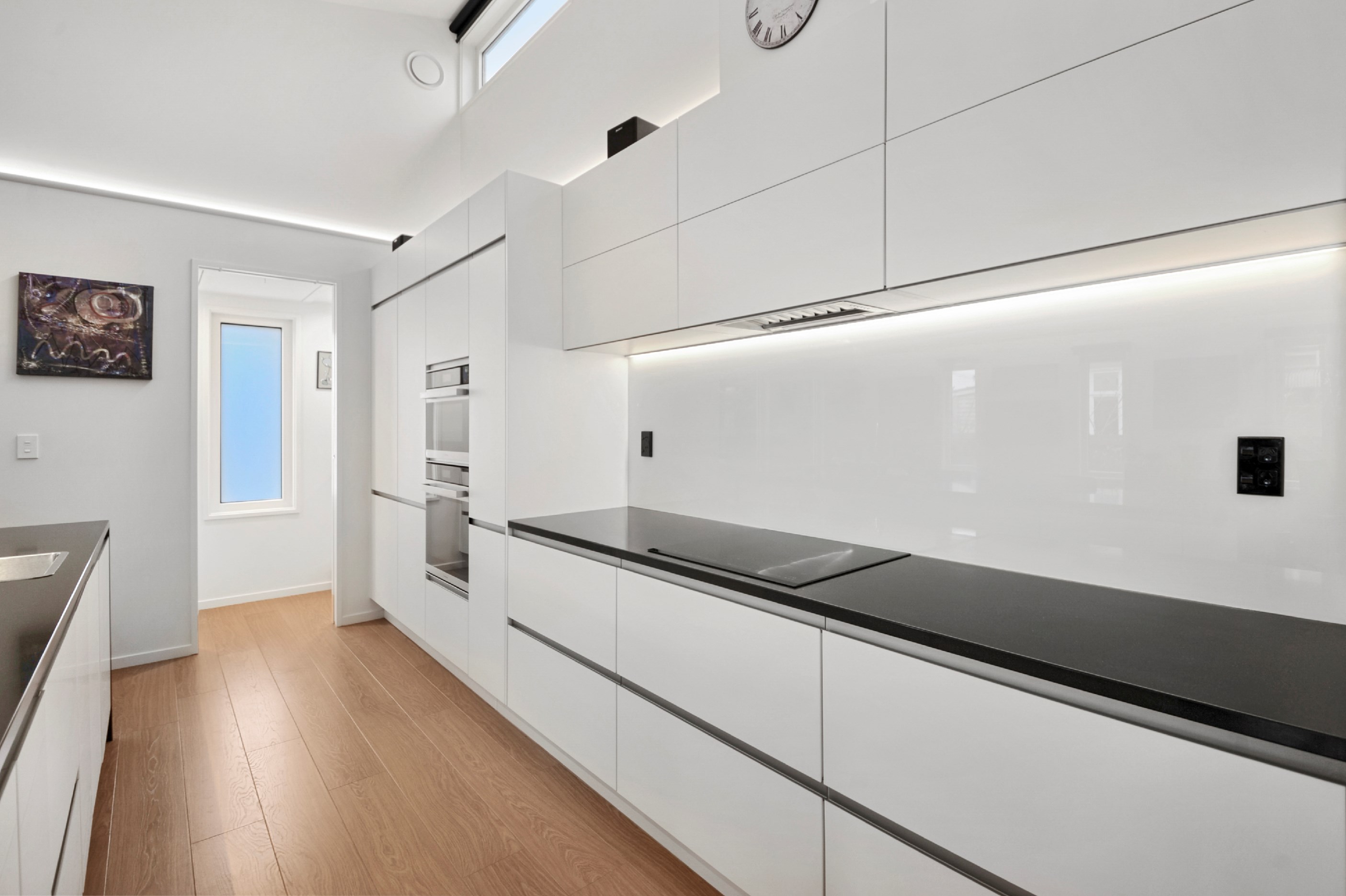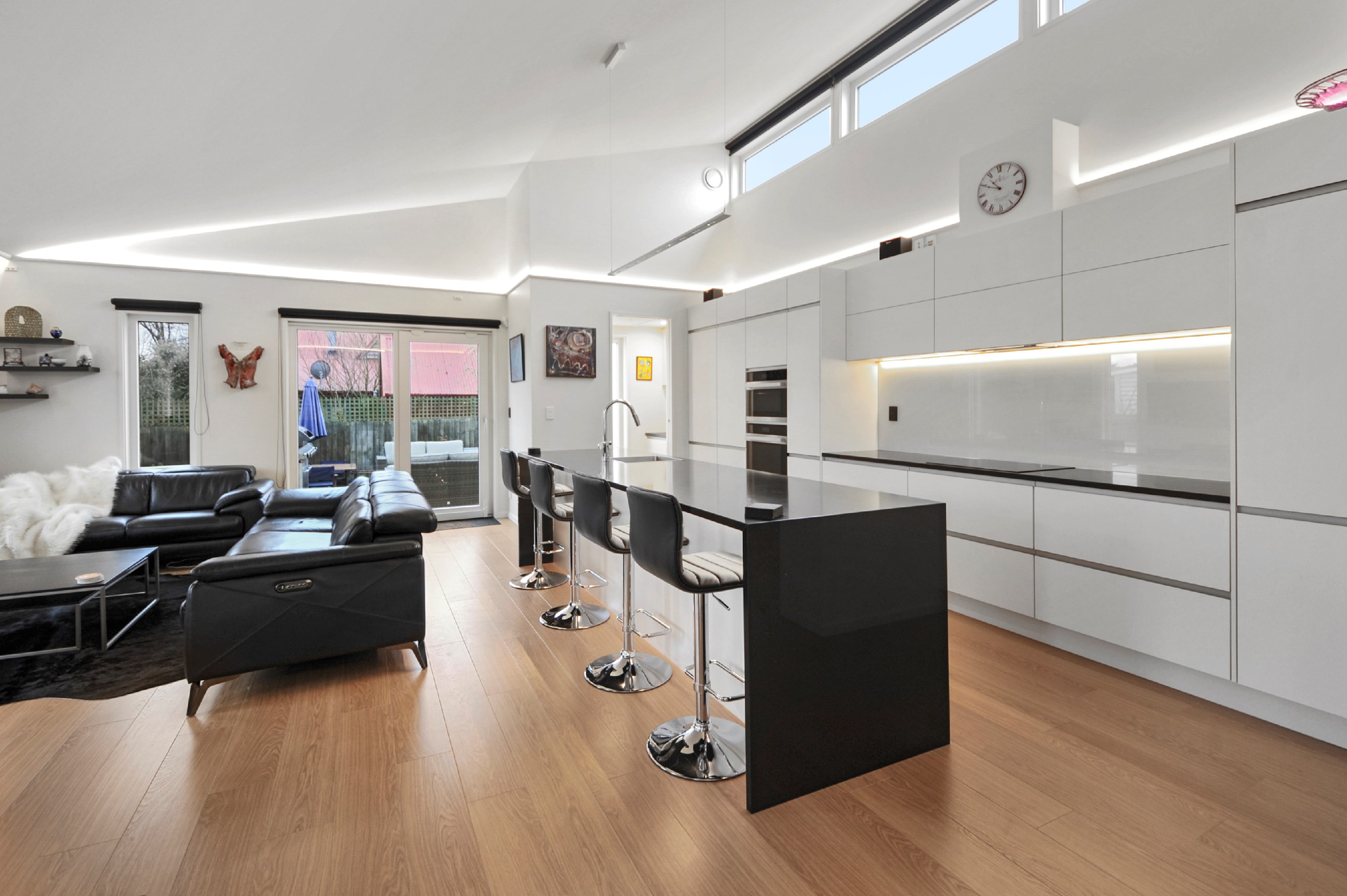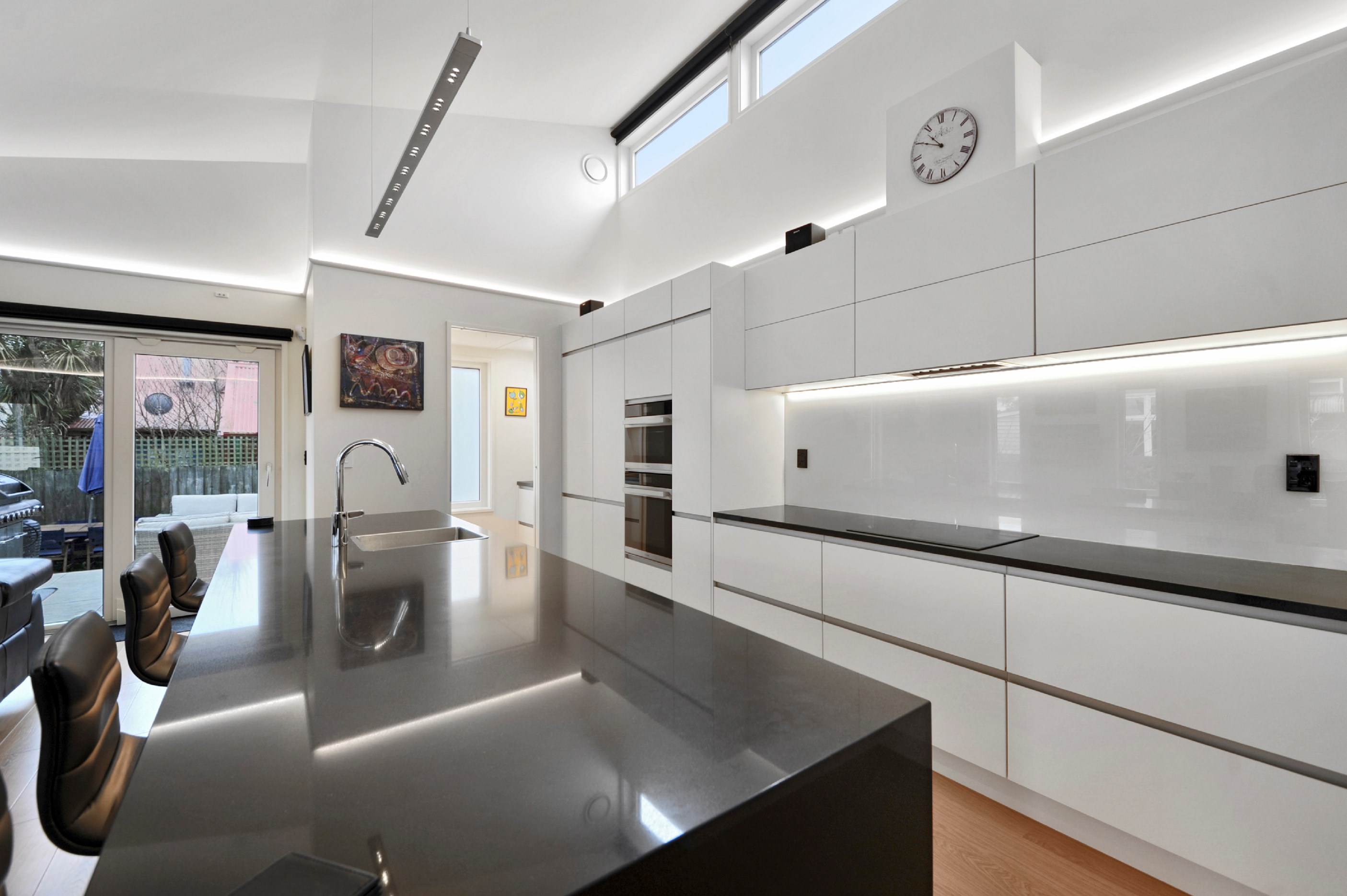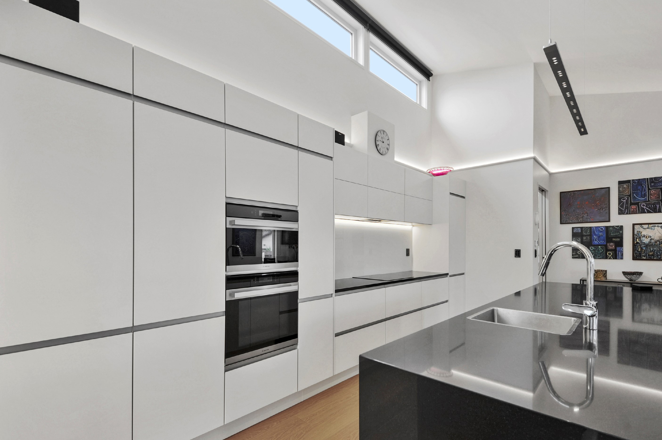 The owners of this home wanted an energy-efficient and eco-friendly build, combined with state-of-the-art features and a modern design. An attractive weatherboard exterior and angular roofline gives a great impression on arrival. Inside, modern fittings, handle-free cupboards and a black and white colour palette make for a stylish kitchen.