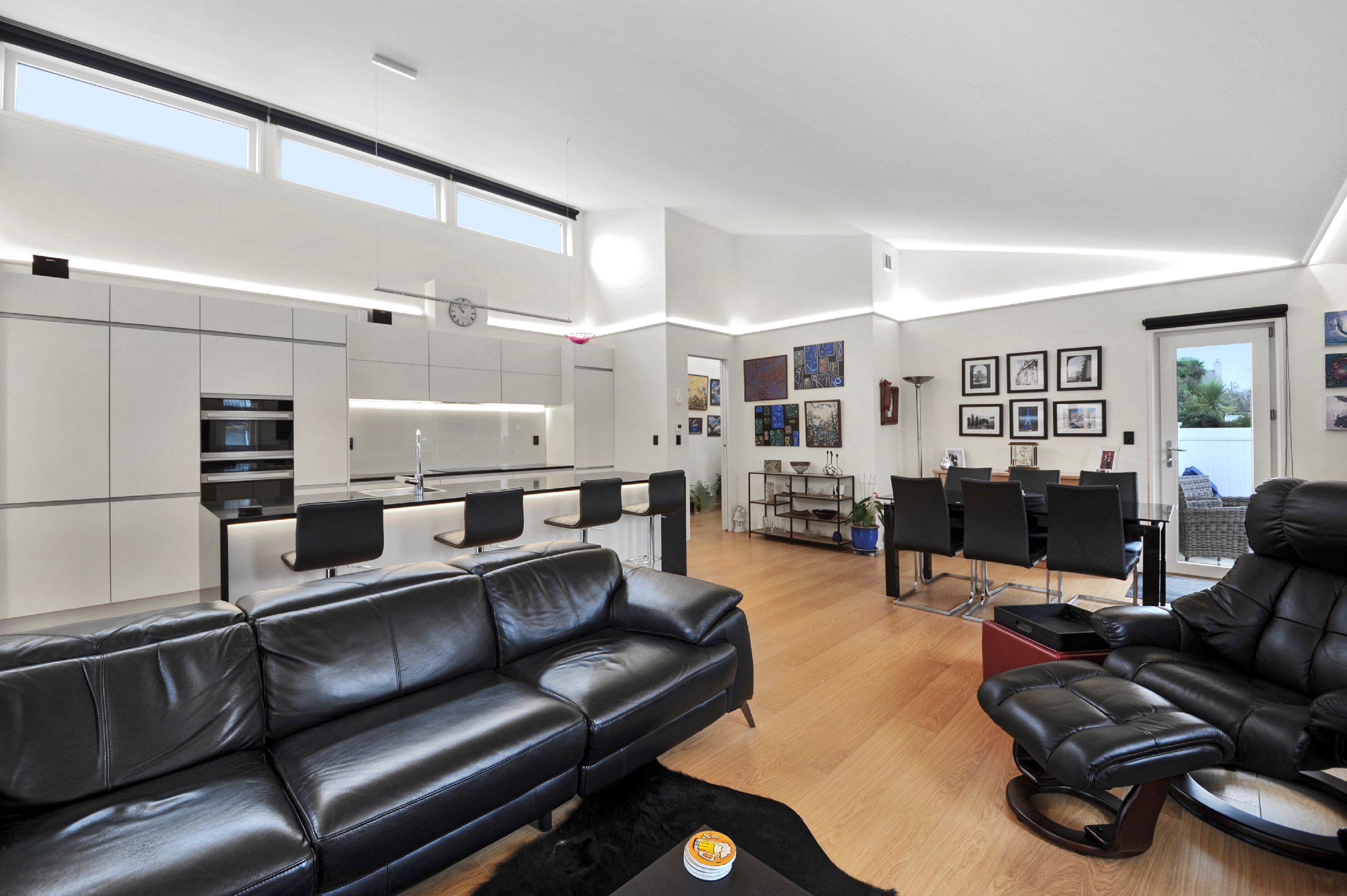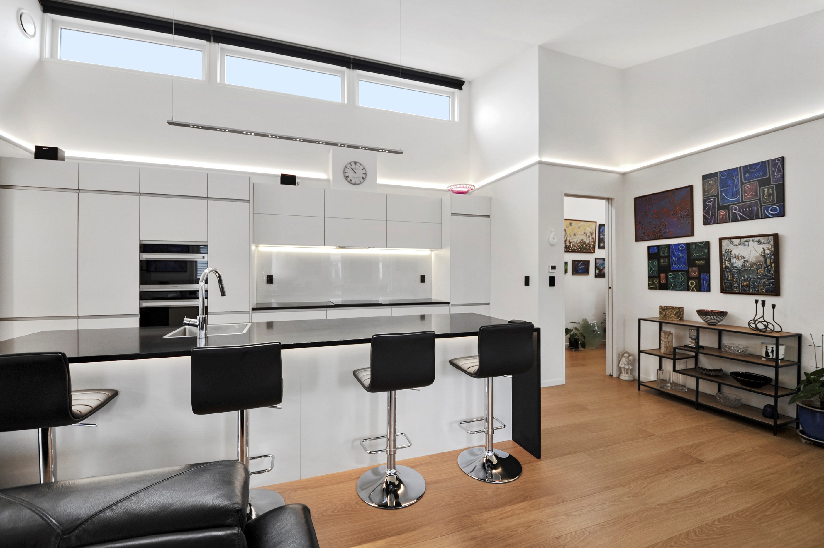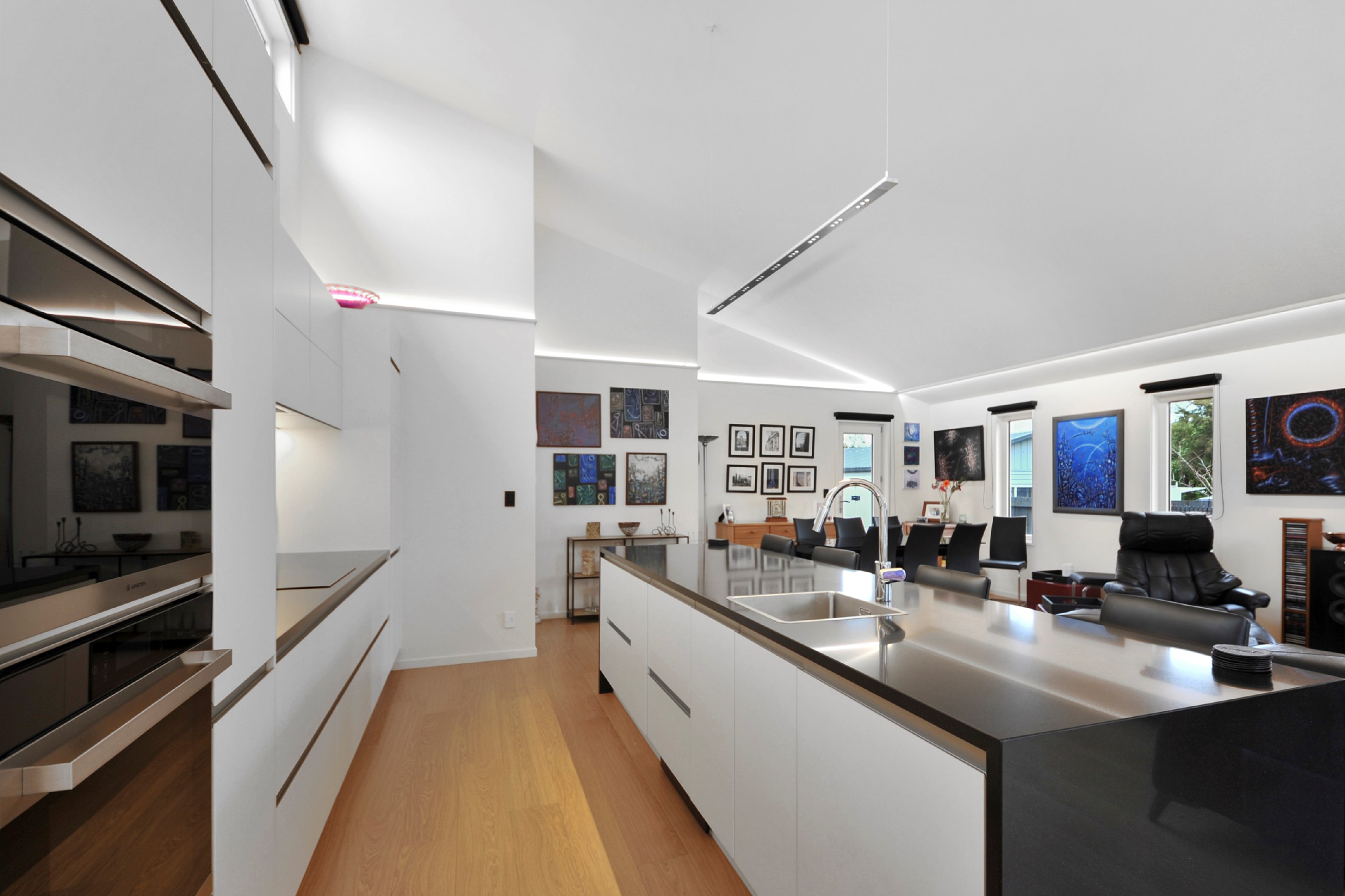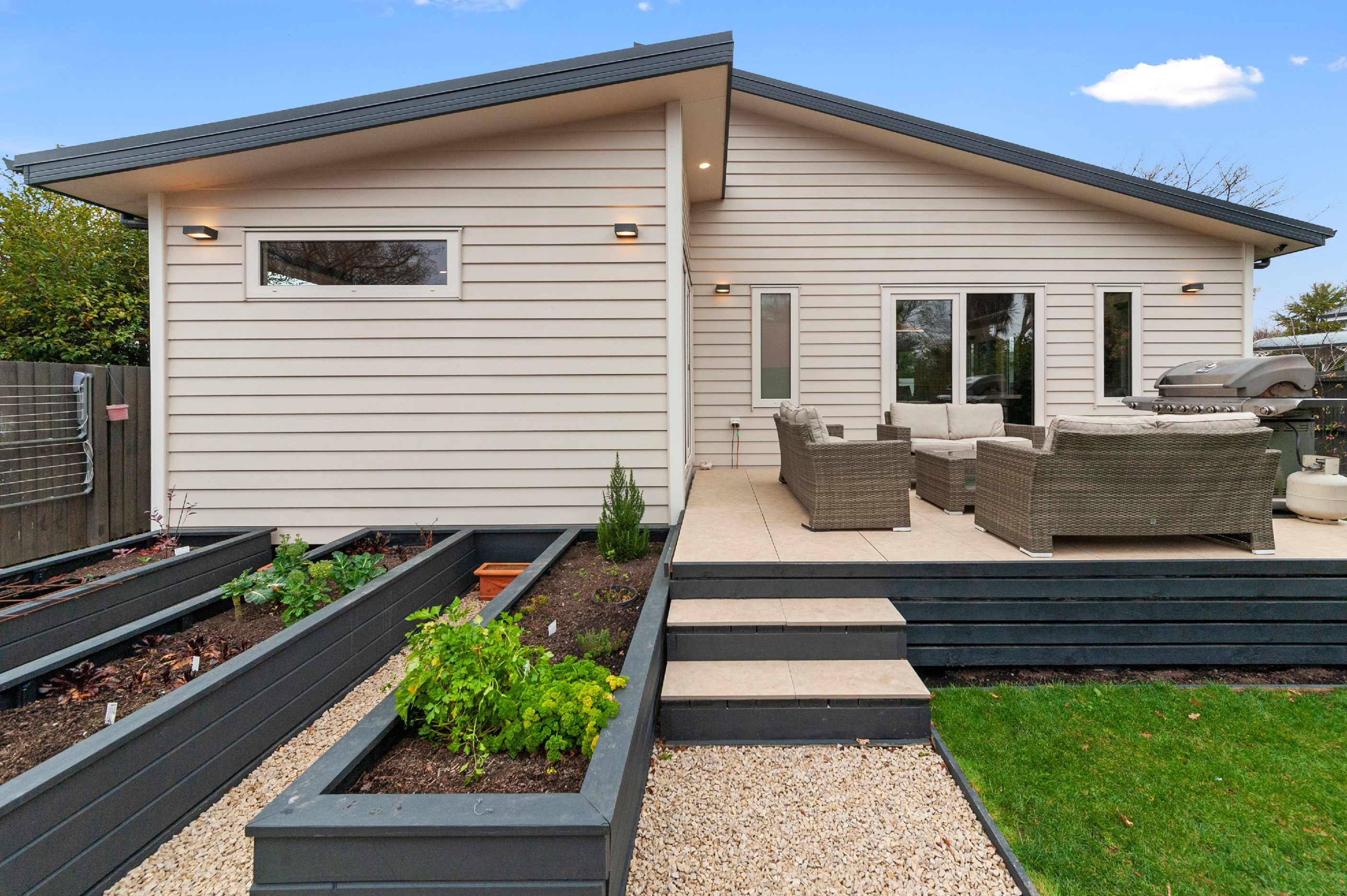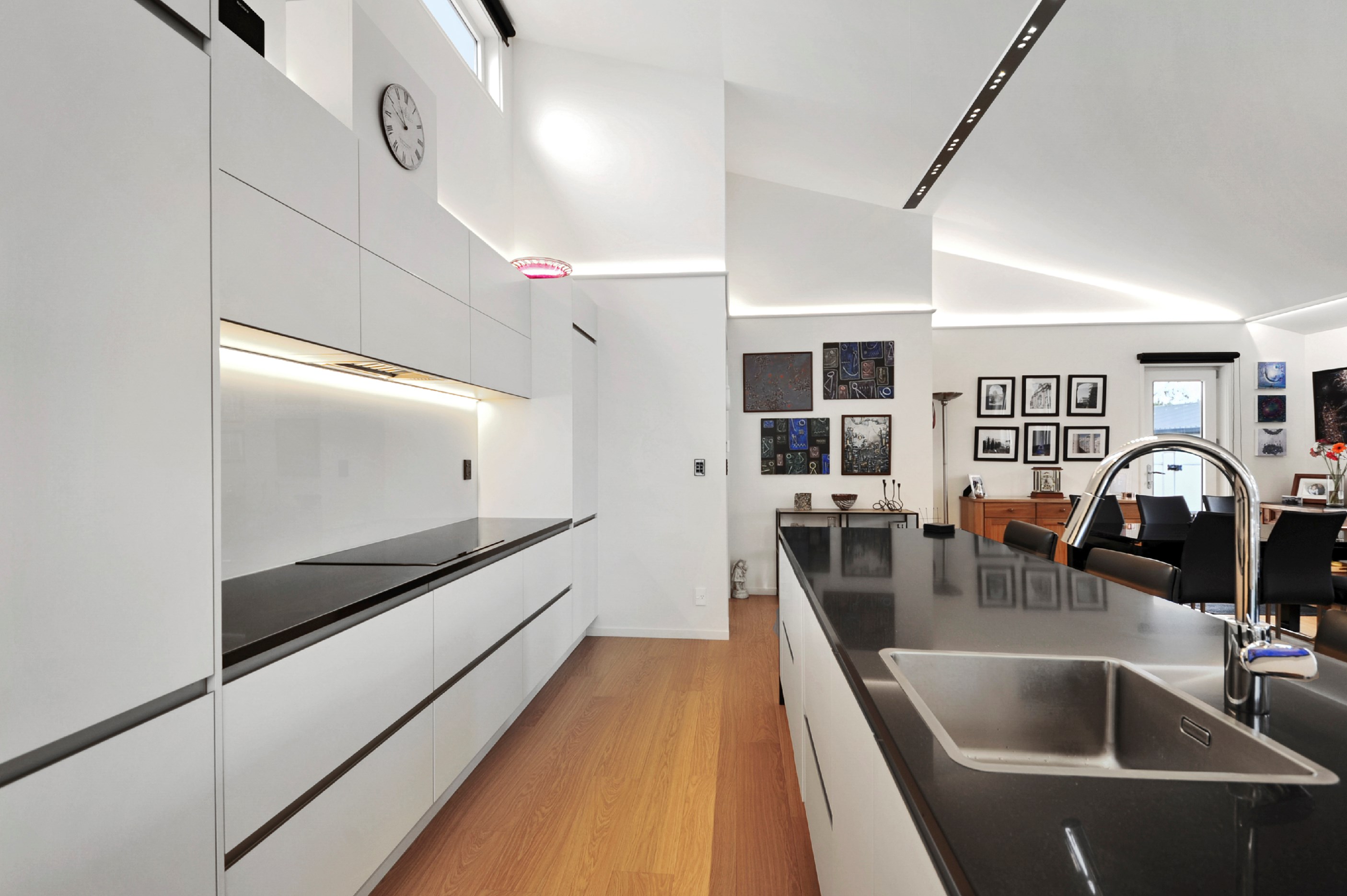 The owners of this home wanted an energy-efficient and eco-friendly build, combined with state-of-the-art features and a modern design. An attractive weatherboard exterior and angular roofline gives a great impression on arrival. Inside, modern fittings, handle-free cupboards and a black and white colour palette make for a stylish kitchen.