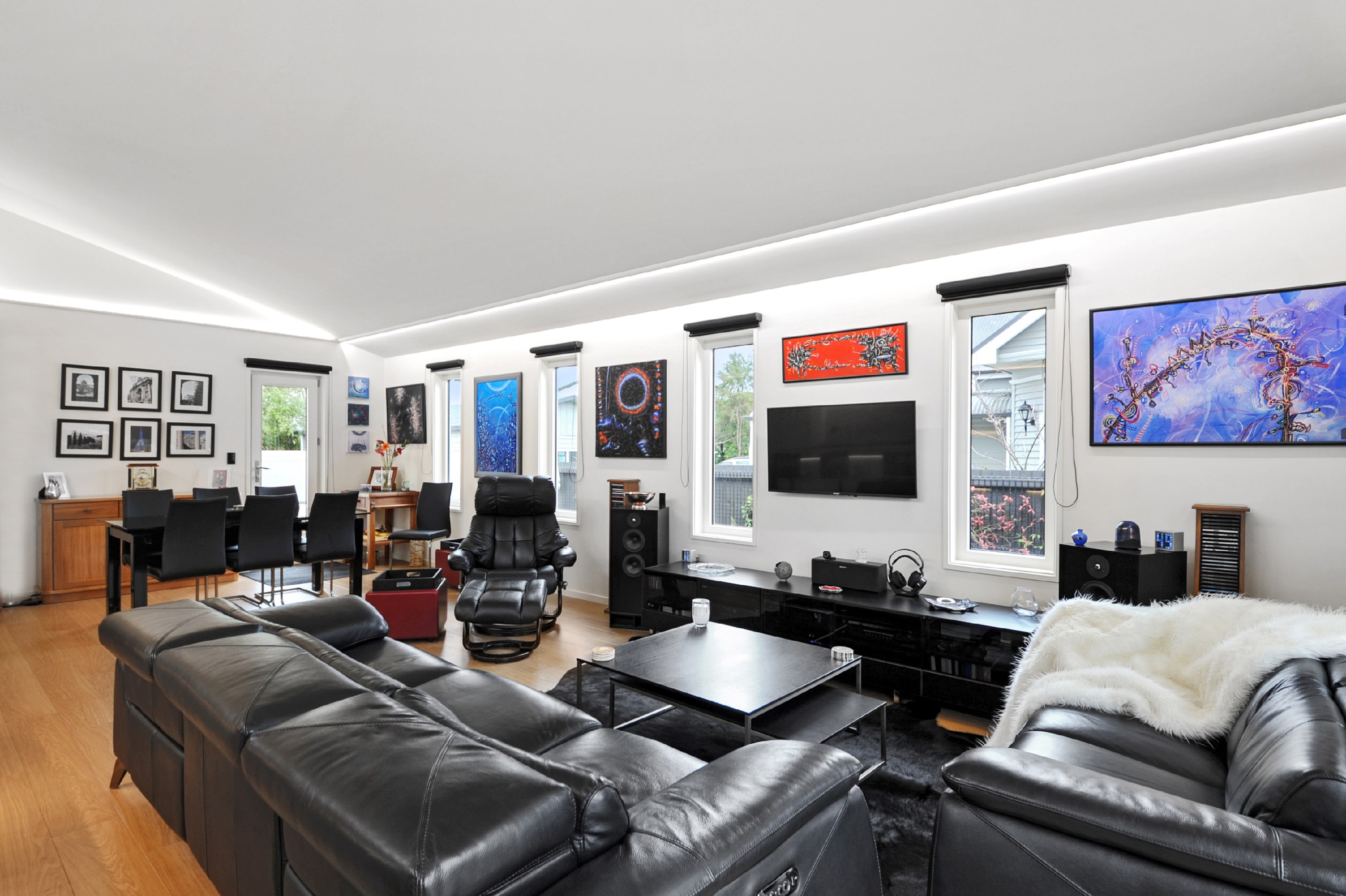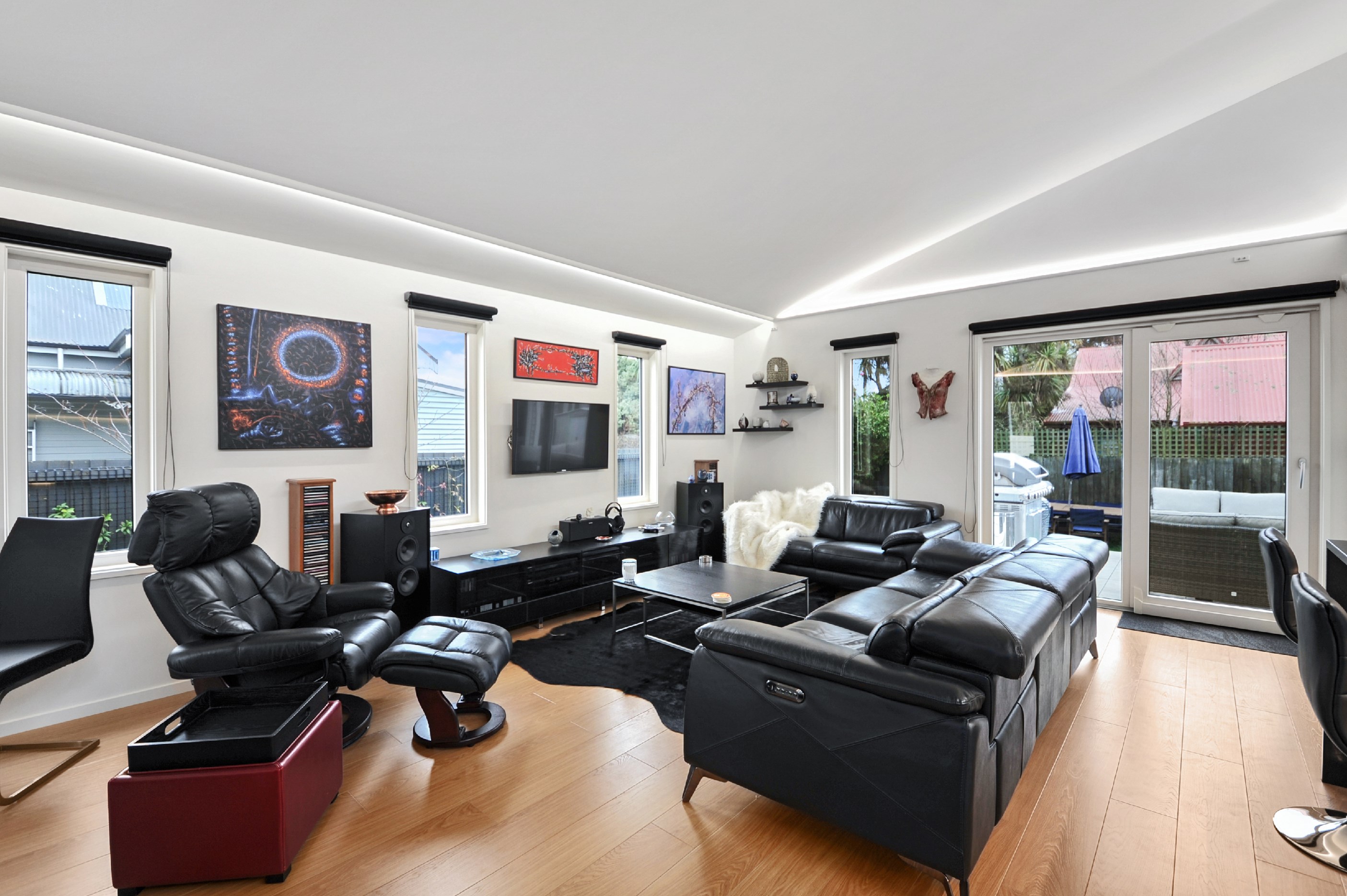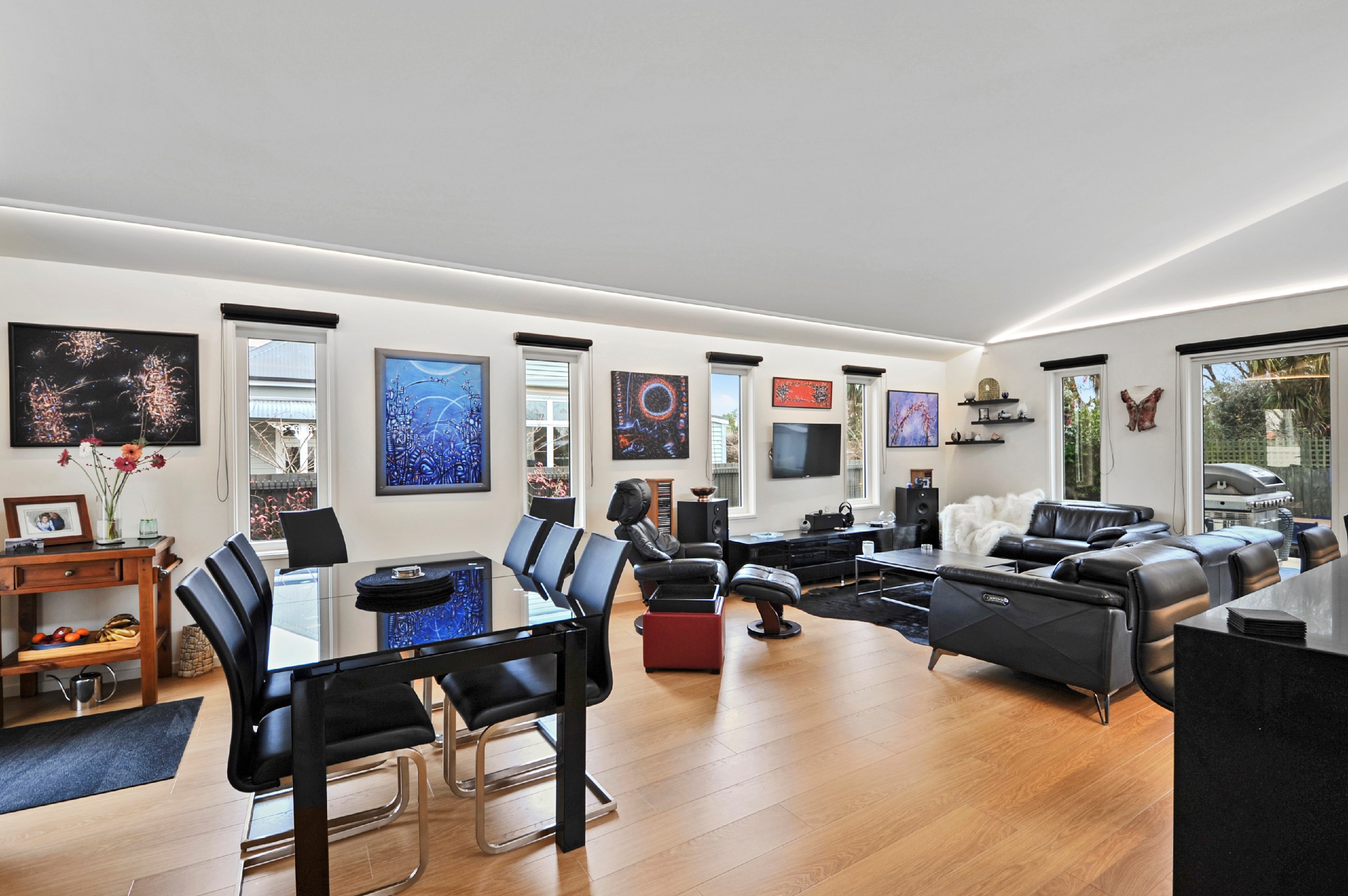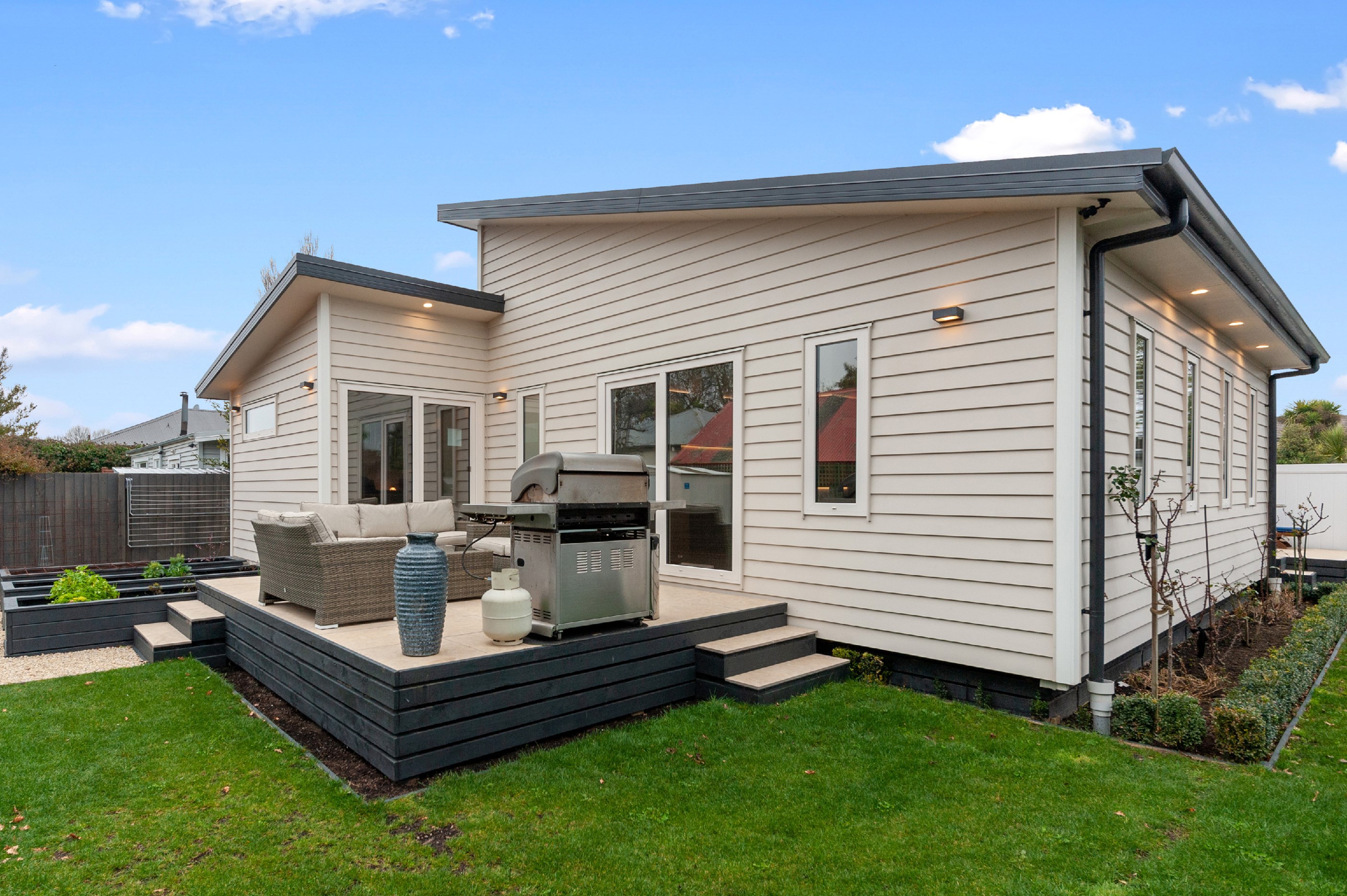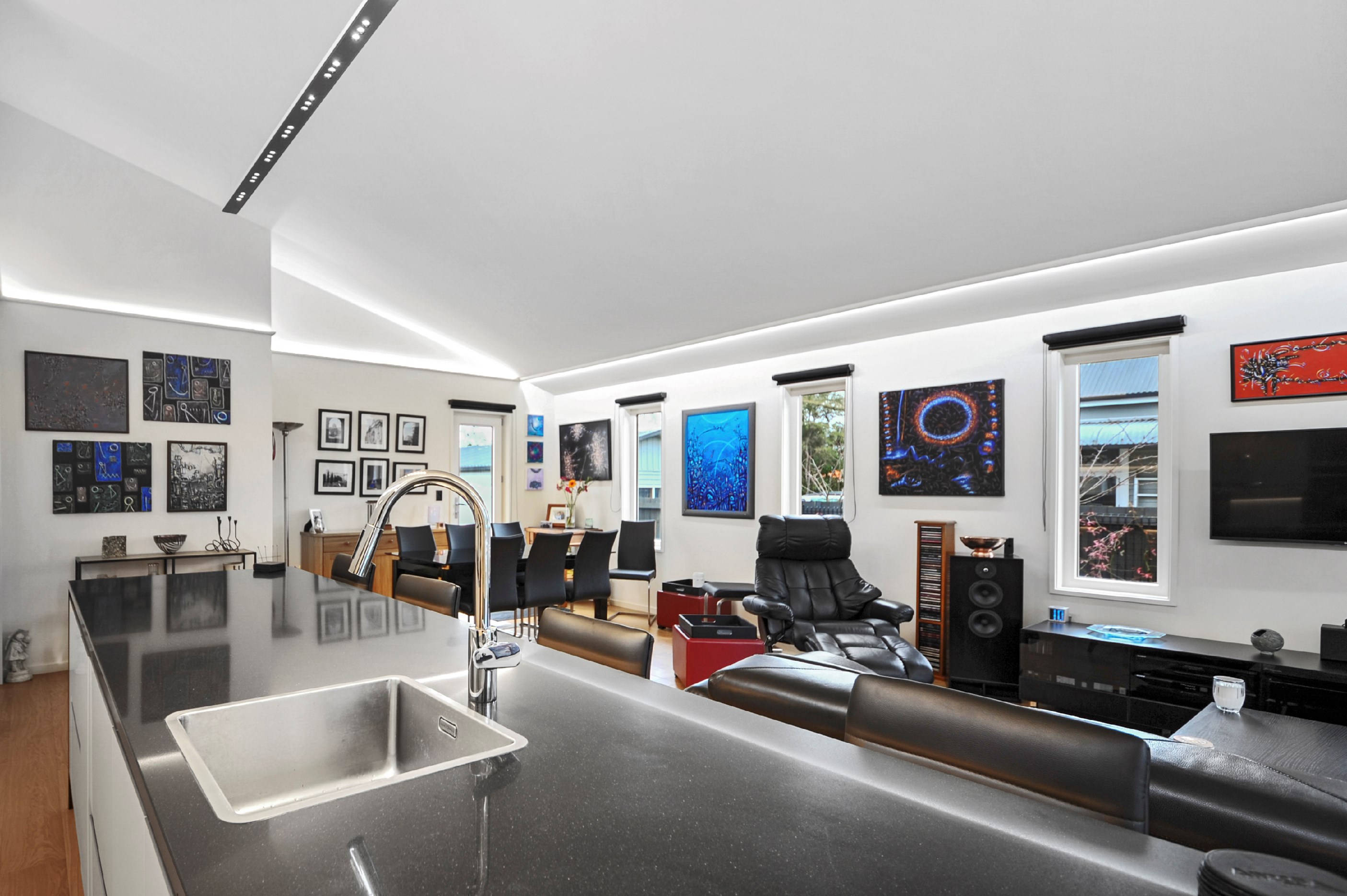As part of the home’s central hub, the kitchen connects to the dining and living in an open-plan layout. Feature lighting accentuates this area’s pitched ceiling, and adds to its sense of spaciousness. A large sliding door opens off the kitchen to a deck, the ideal spot to enjoy a barbecue with friends and family in summer.