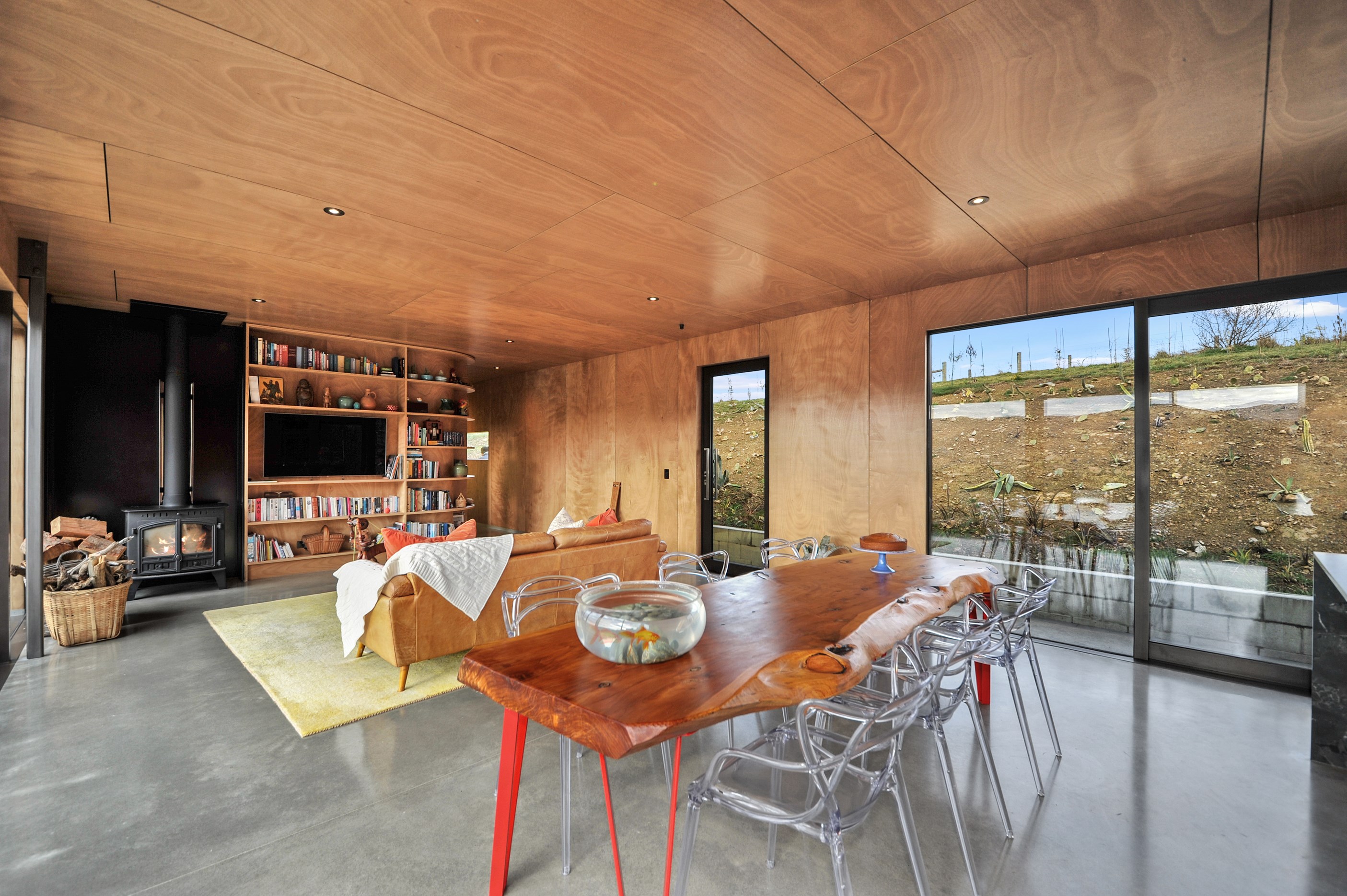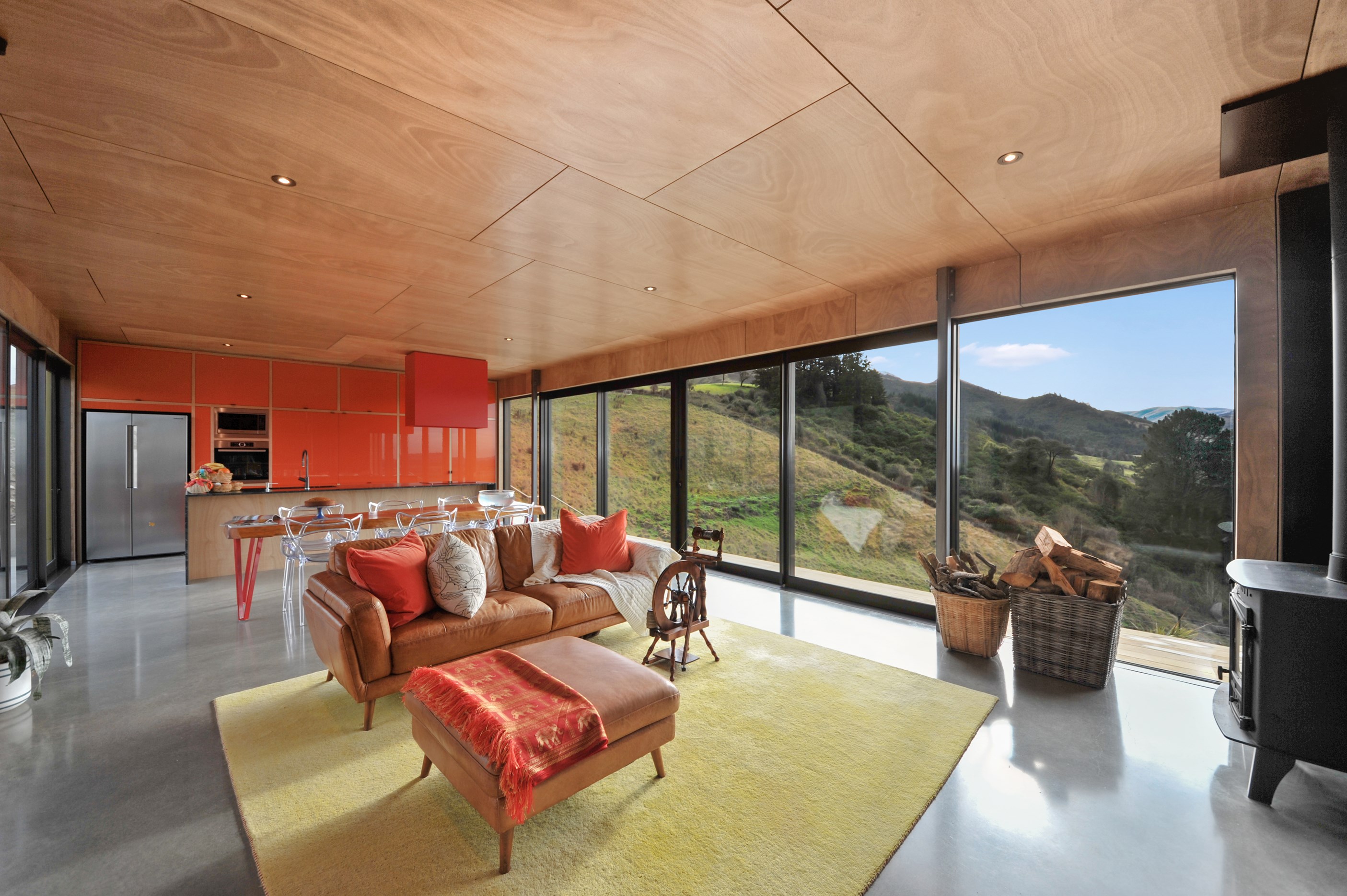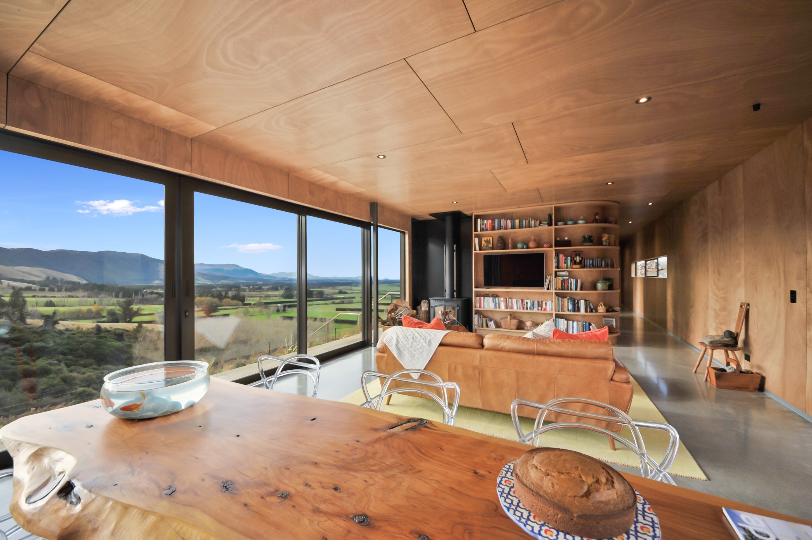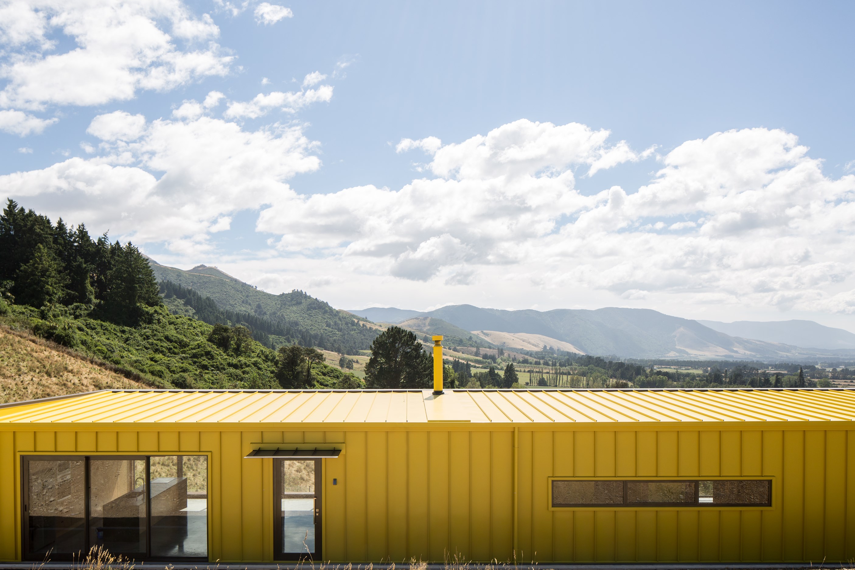 This bespoke home was designed and built around the client’s passion for New Zealand’s nature, the Kowhai tree and Philip Johnson's Glass House. Its off-the-grid nature means it has a fully insulated foundation and floor, hydronic underfloor heating pipes powered by a log burner, thermally broken windows and low-E glass. In addition, the house is able to be run off a back-up generator if there are power cuts in its remote location.
