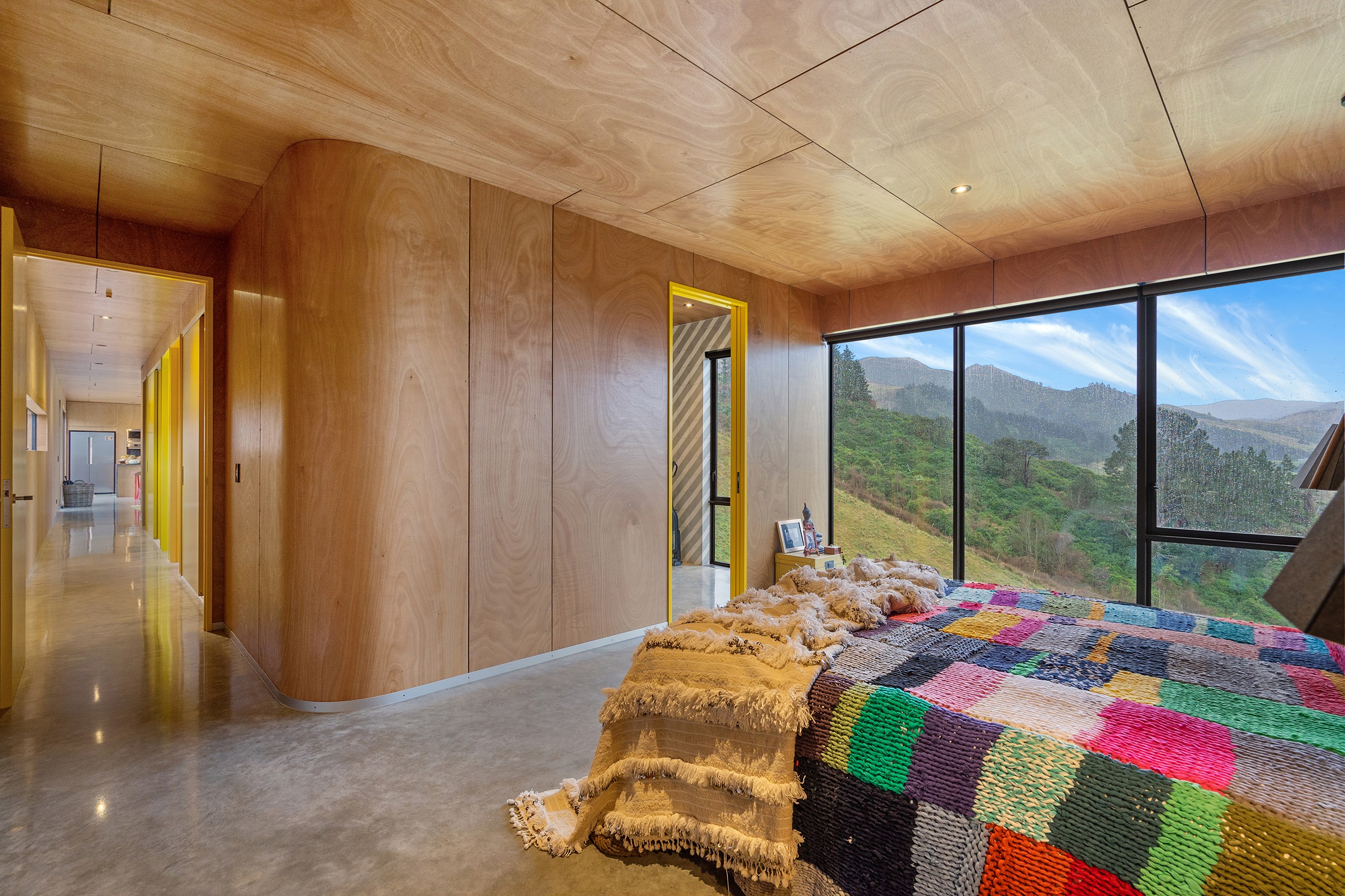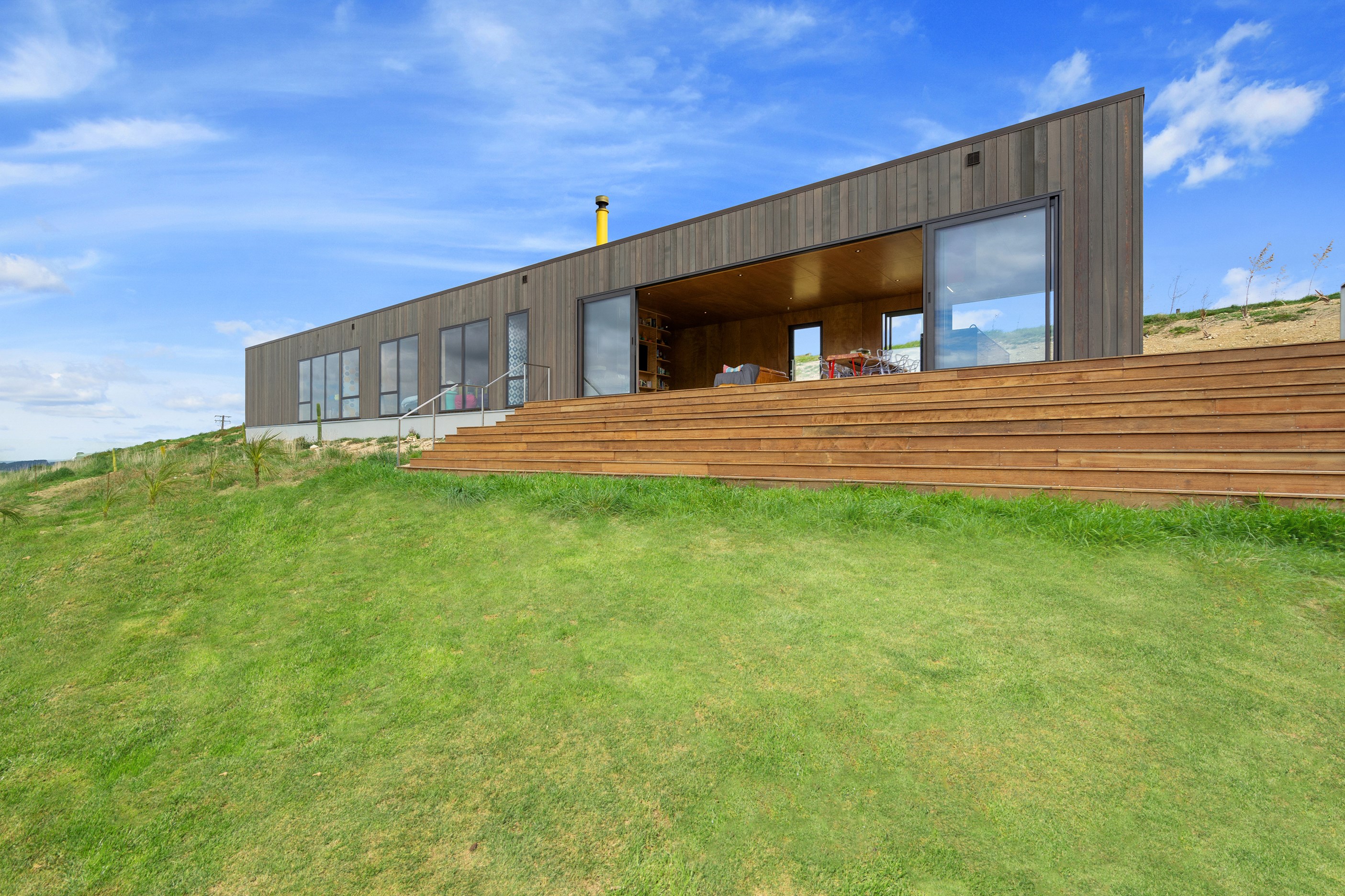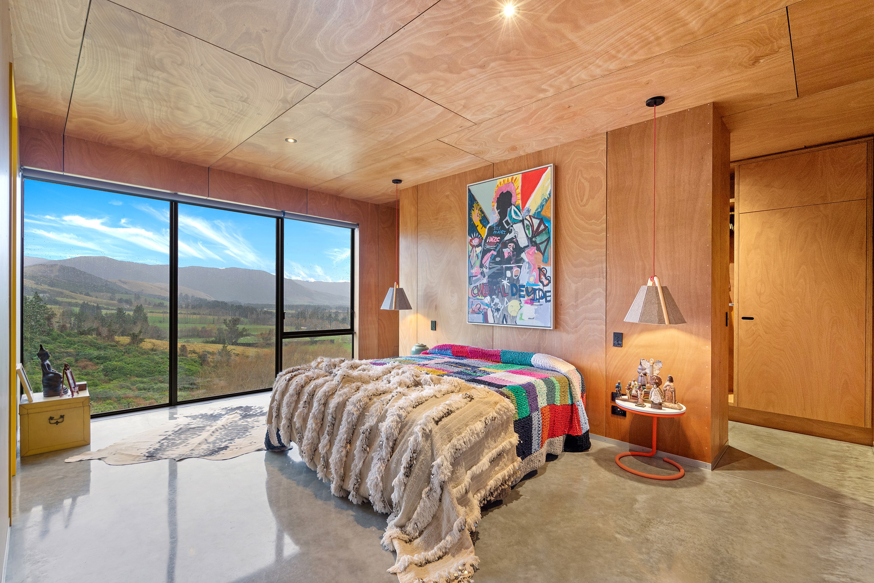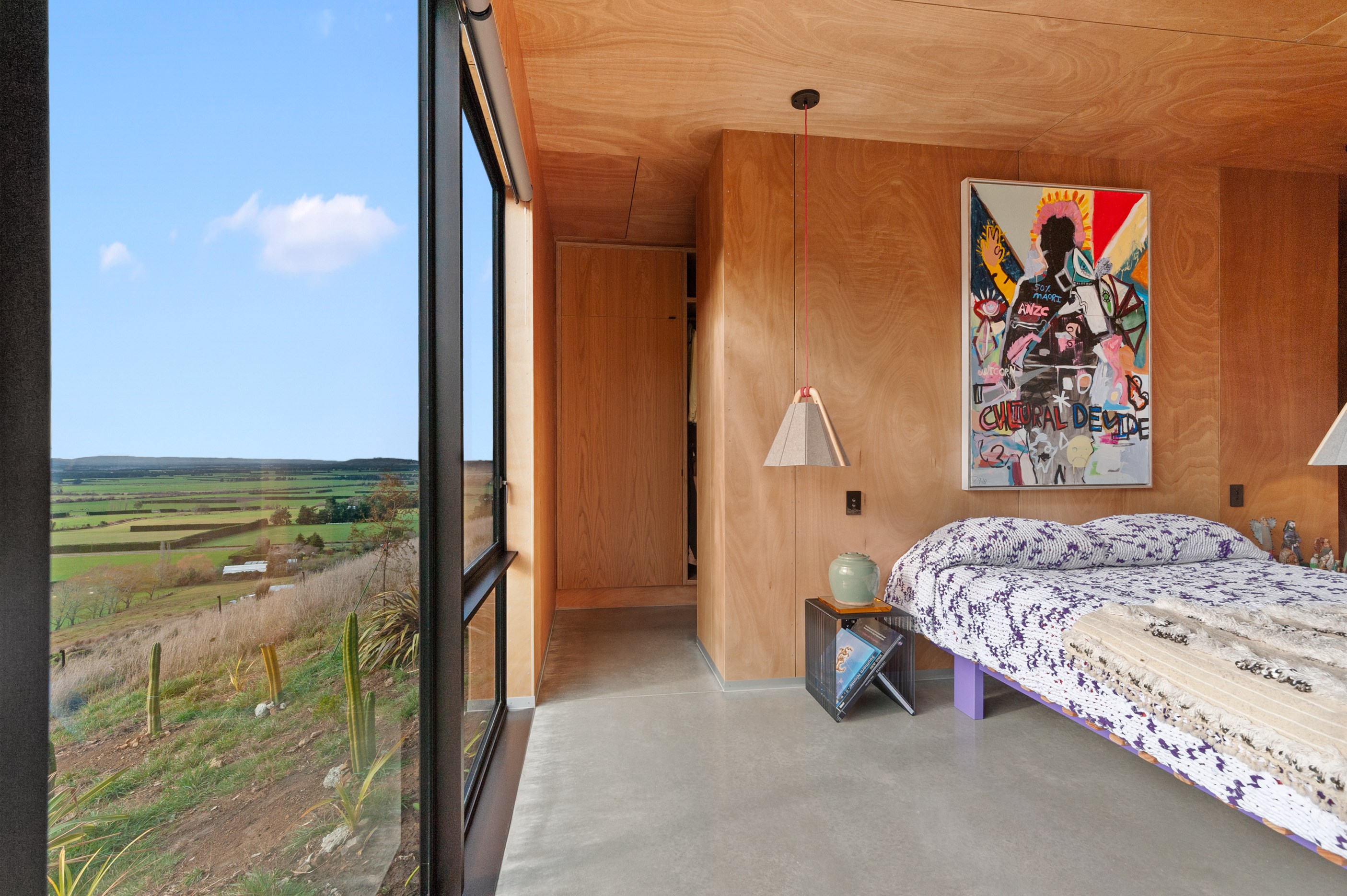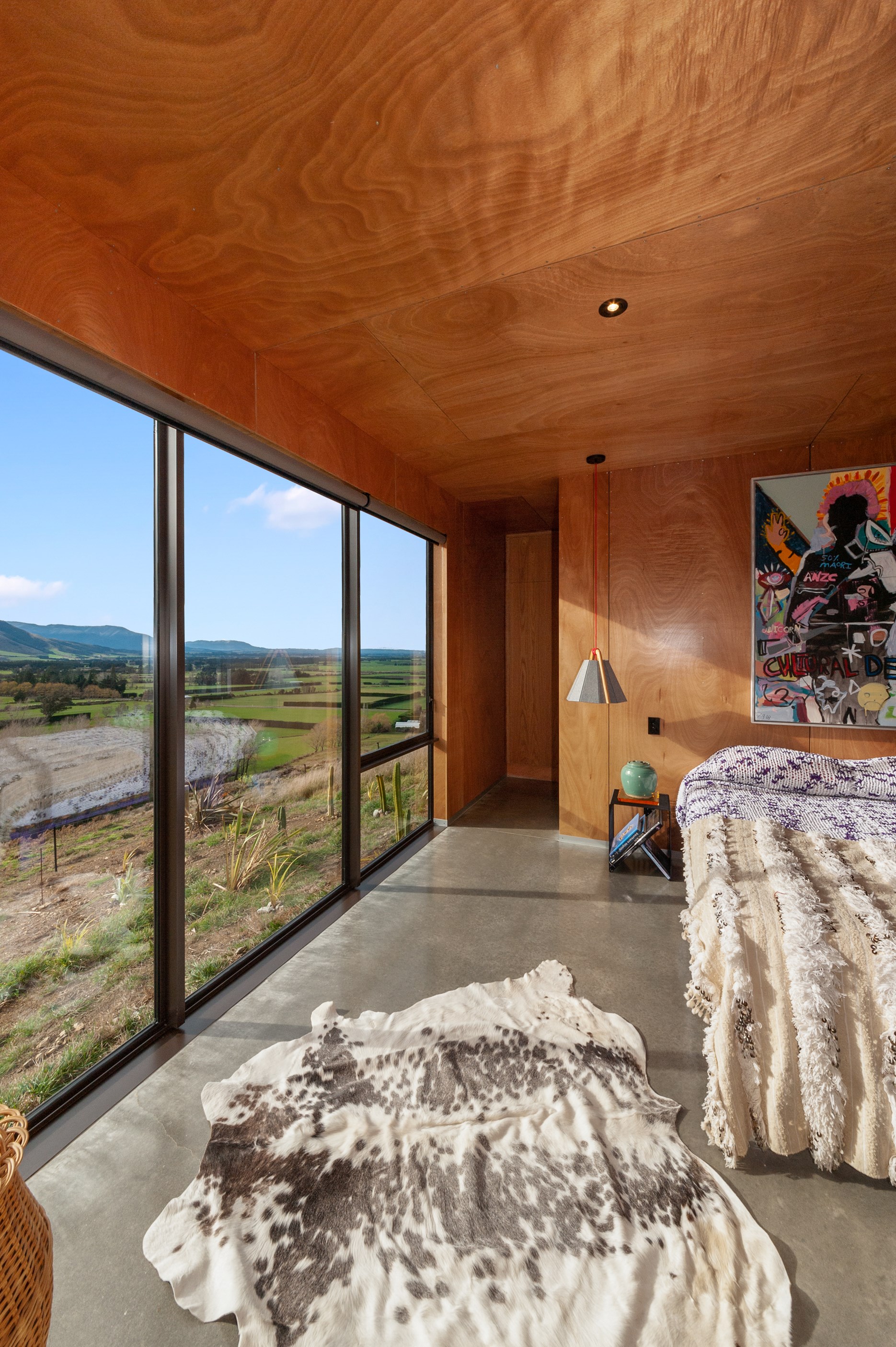 This bespoke home was designed and built around the client’s passion for New Zealand’s nature, the Kowhai tree and Philip Johnson's Glass House. Its off-the-grid nature means it has a fully insulated foundation and floor, hydronic underfloor heating pipes powered by a log burner, thermally broken windows and low-E glass. In addition, the house is able to be run off a back-up generator if there are power cuts in its remote location.