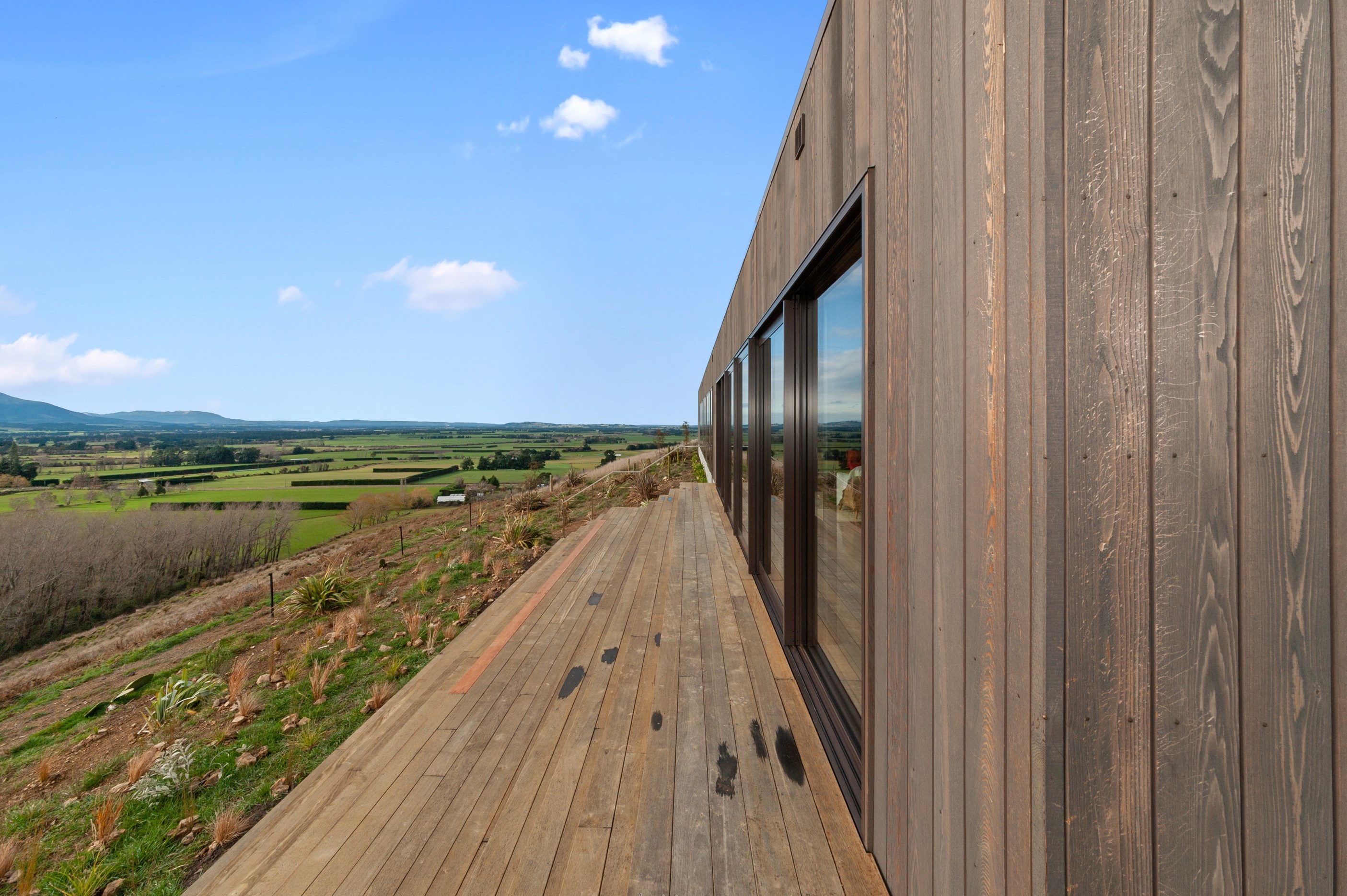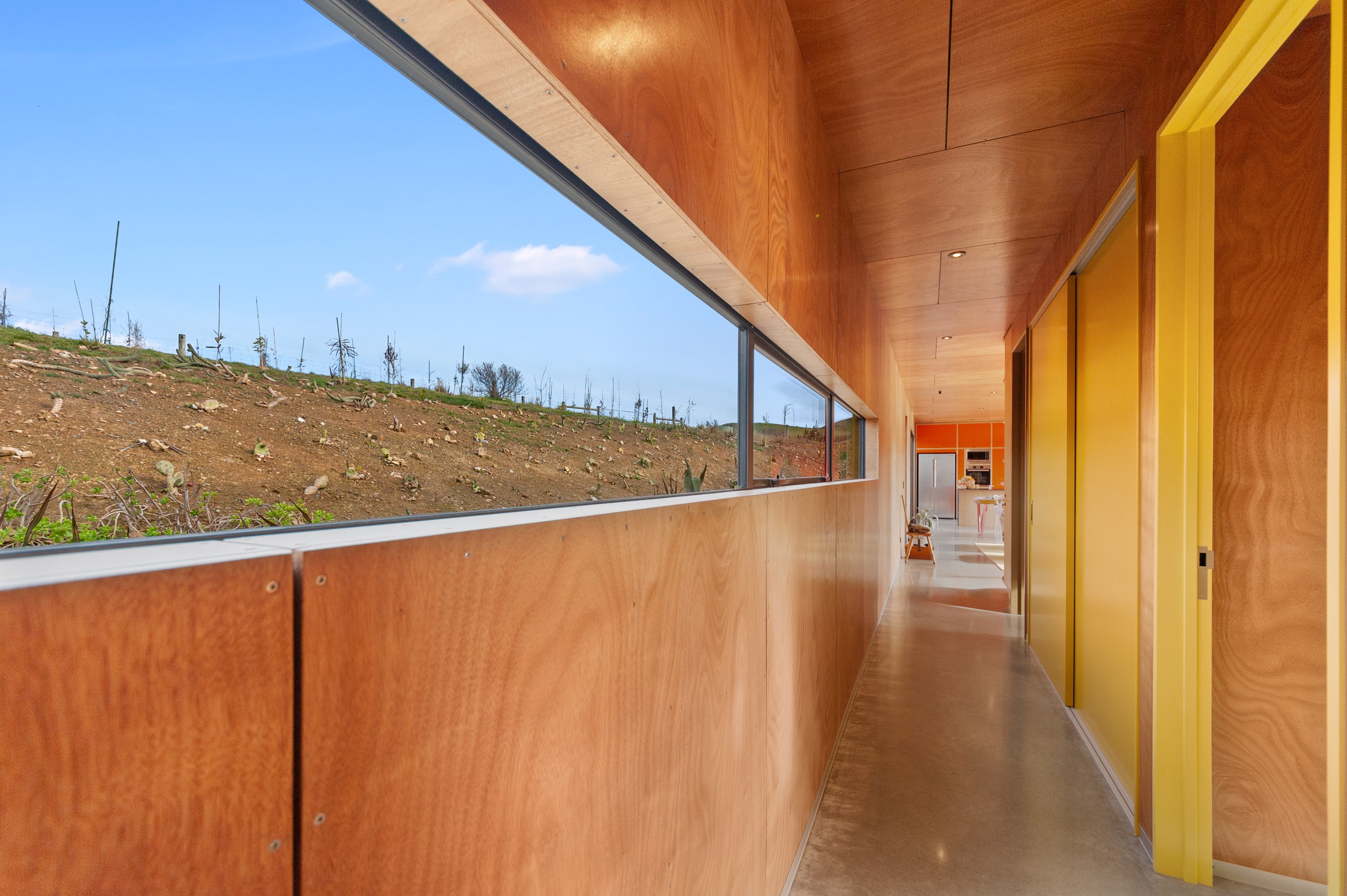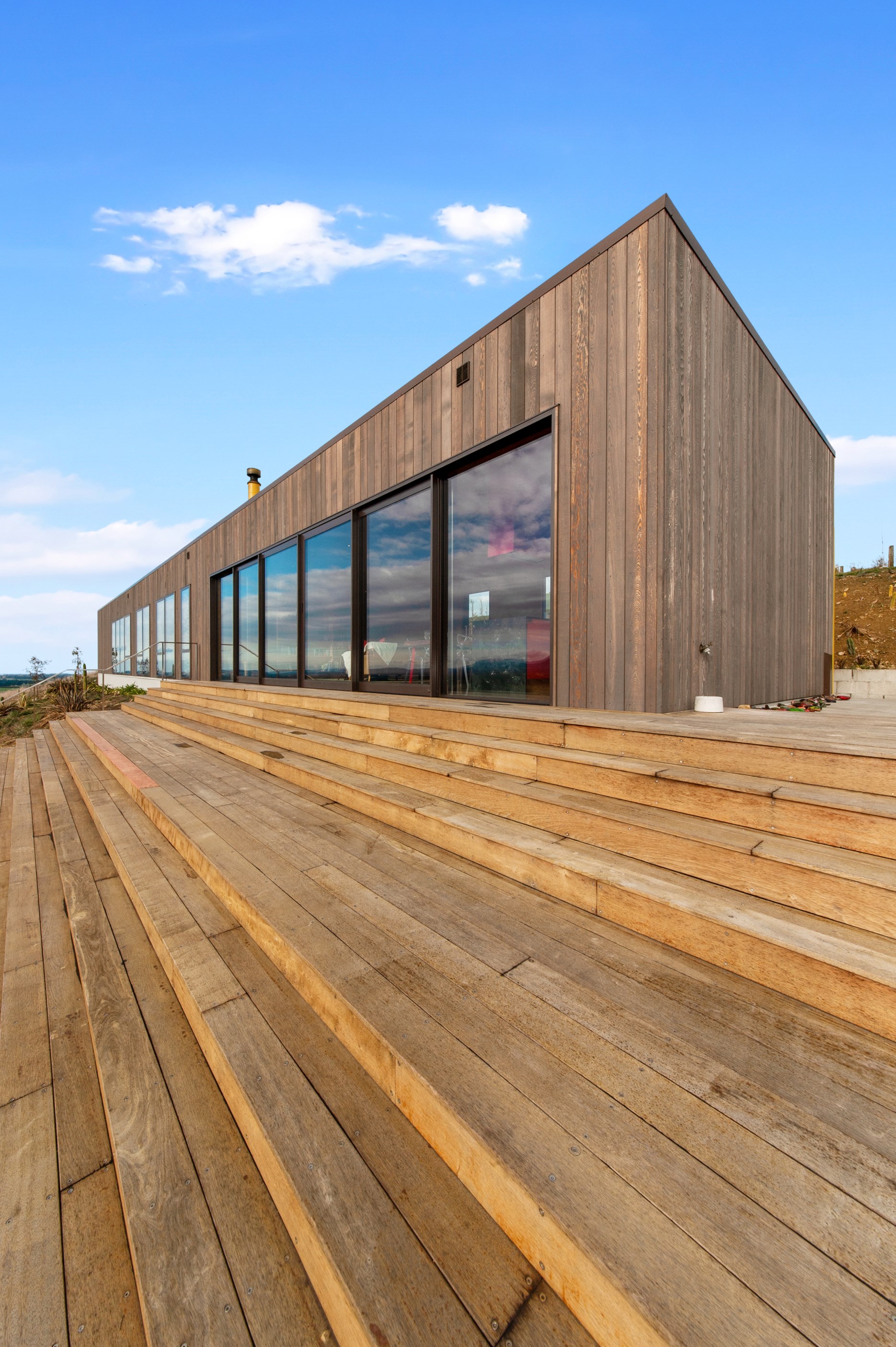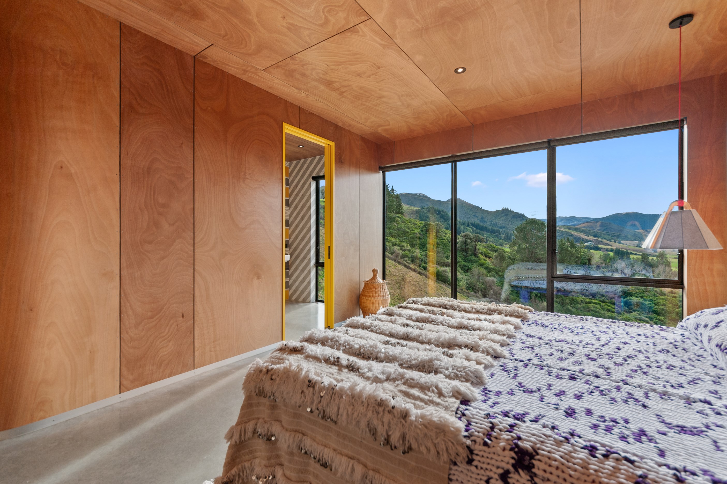 This bespoke home was designed and built around the client’s passion for New Zealand’s nature, the Kowhai tree and Philip Johnson's Glass House. Its off-the-grid nature means it has a fully insulated foundation and floor, hydronic underfloor heating pipes powered by a log burner, thermally broken windows and low-E glass. In addition, the house is able to be run off a back-up generator if there are power cuts in its remote location.