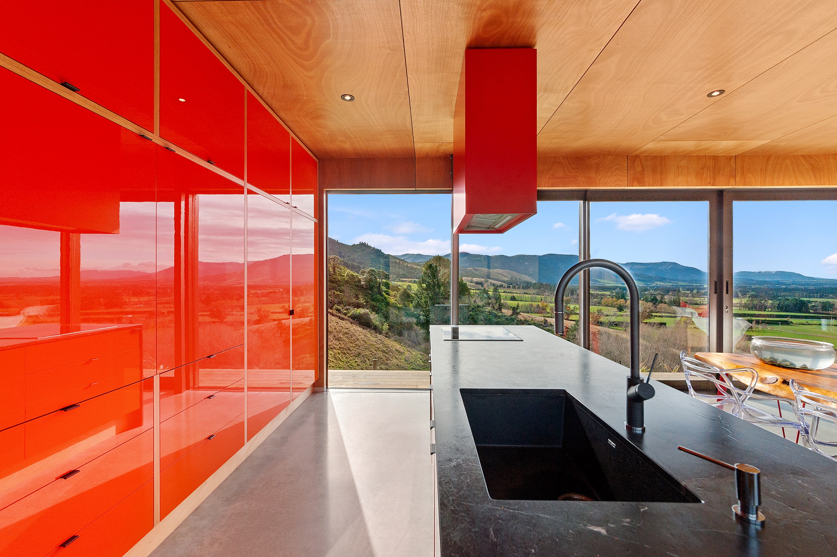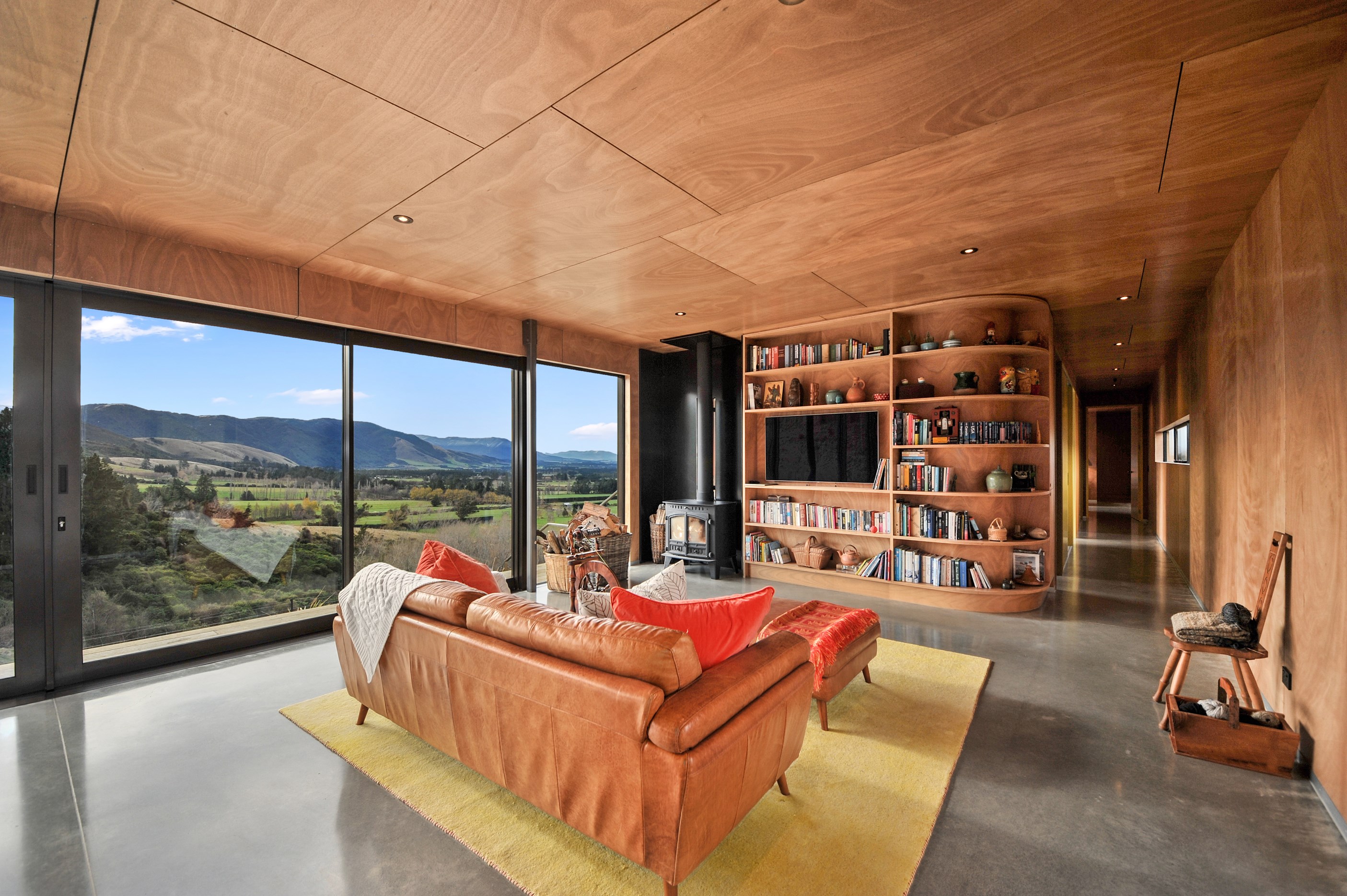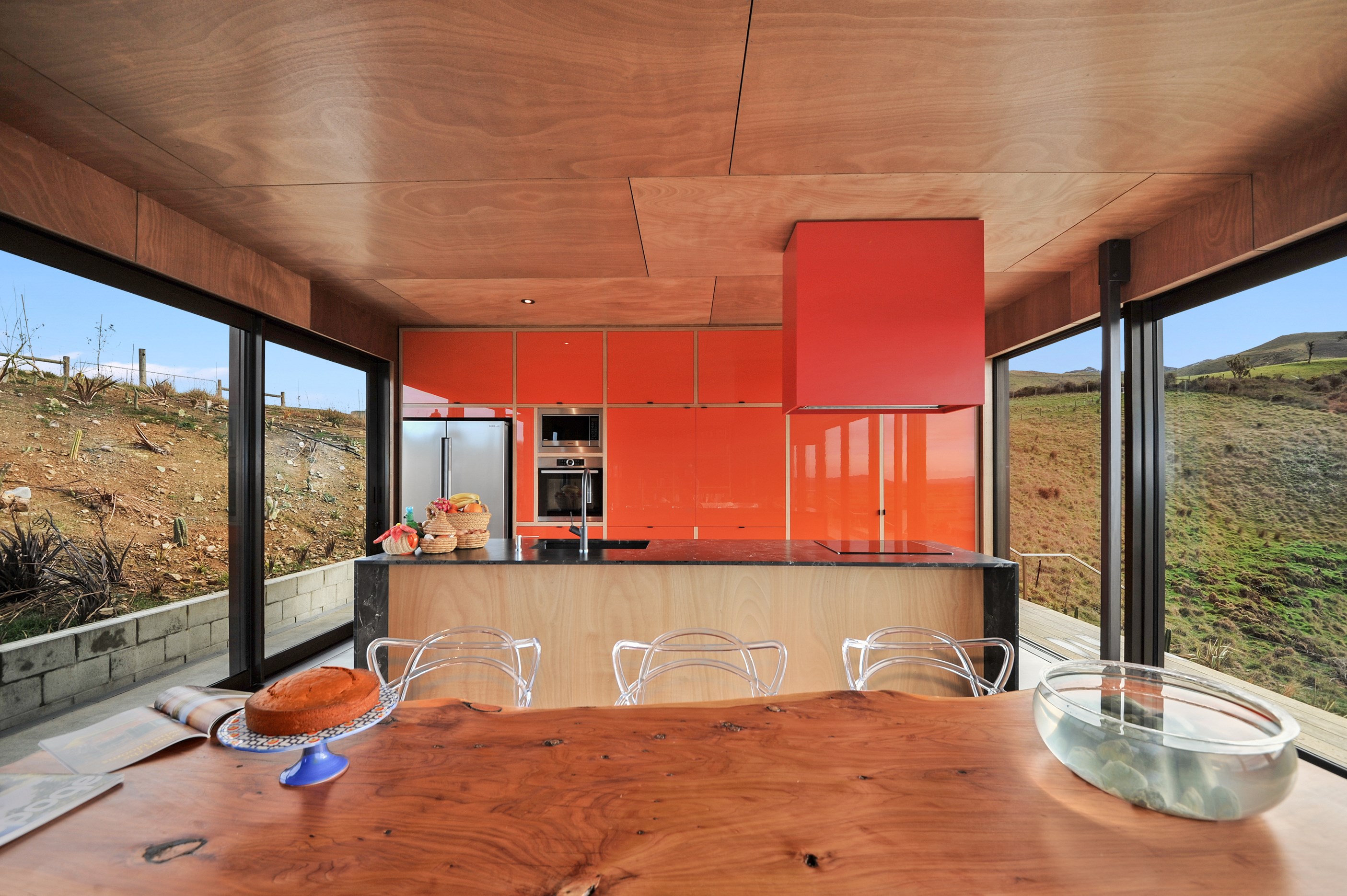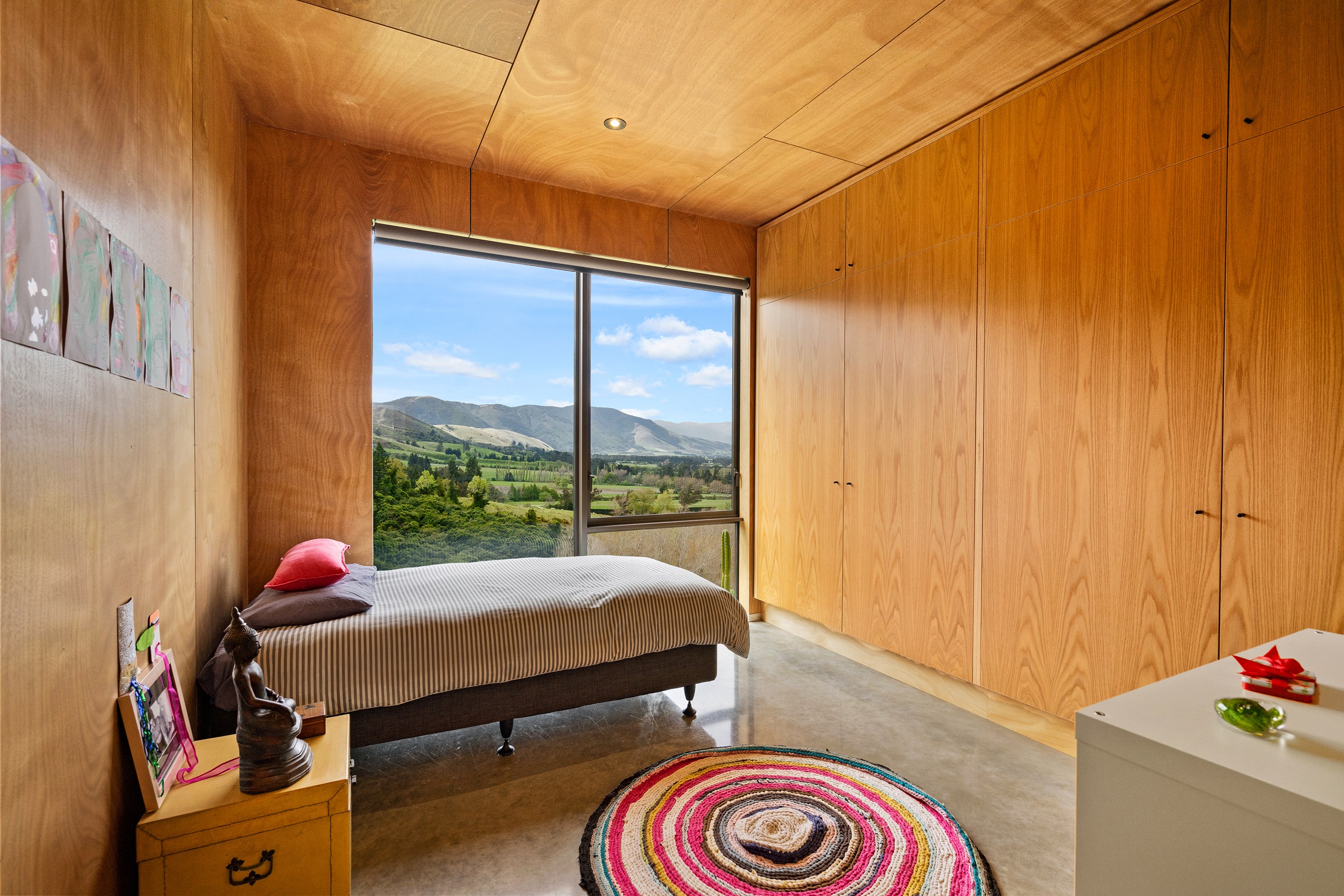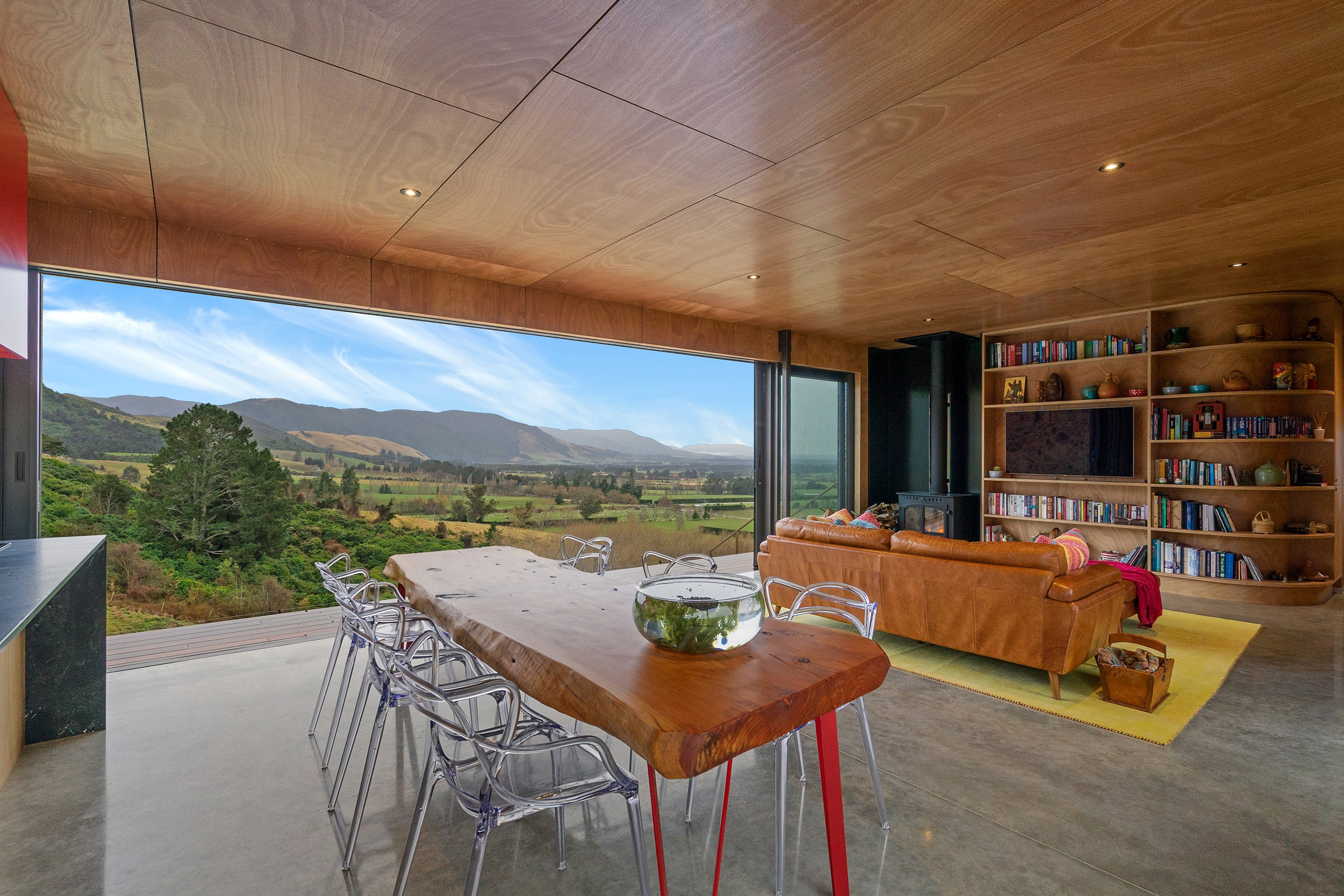 With plywood linings representing the branches of the Kowhai tree, the house extends to the vista, offering breath-taking 360 degree views out to the Canterbury plains and North Canterbury. Sit and relax on the decks which are designed to be non-intrusive and fit into the land. The exceptional kitchen consists of super glossy, bright orange cabinetry, mixed with plywood and custom joinery around curved walls – a masterpiece in distinctive design. Similarly, the bathroom tiles are laid on a curve. With three bedrooms, two bathrooms and a comfortable living room, this is a family home with an eye for comfort and a zest for life.