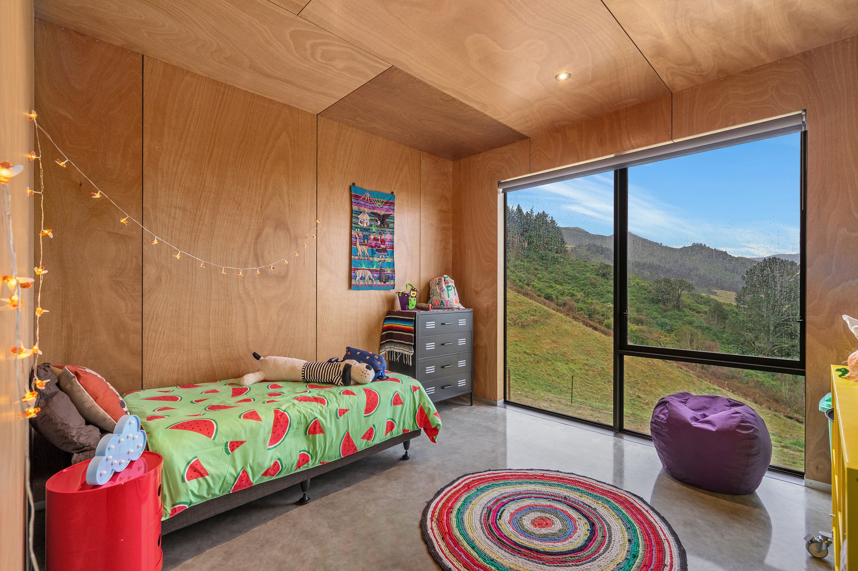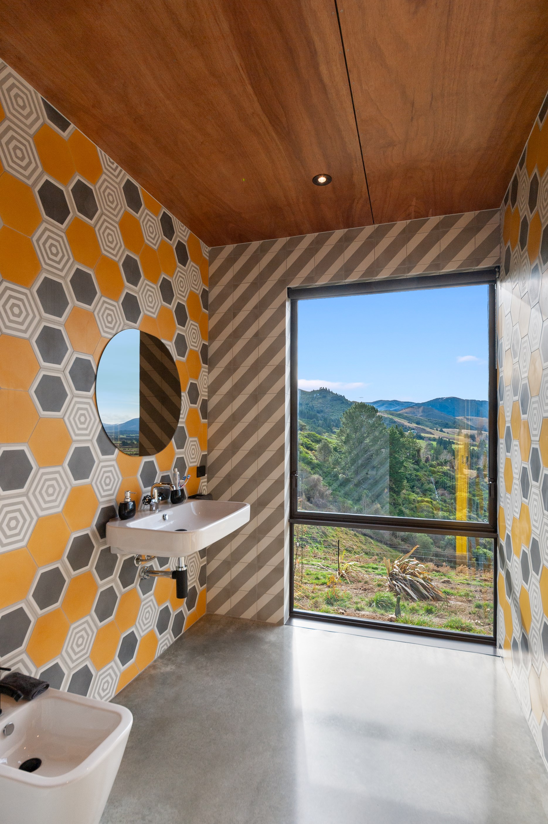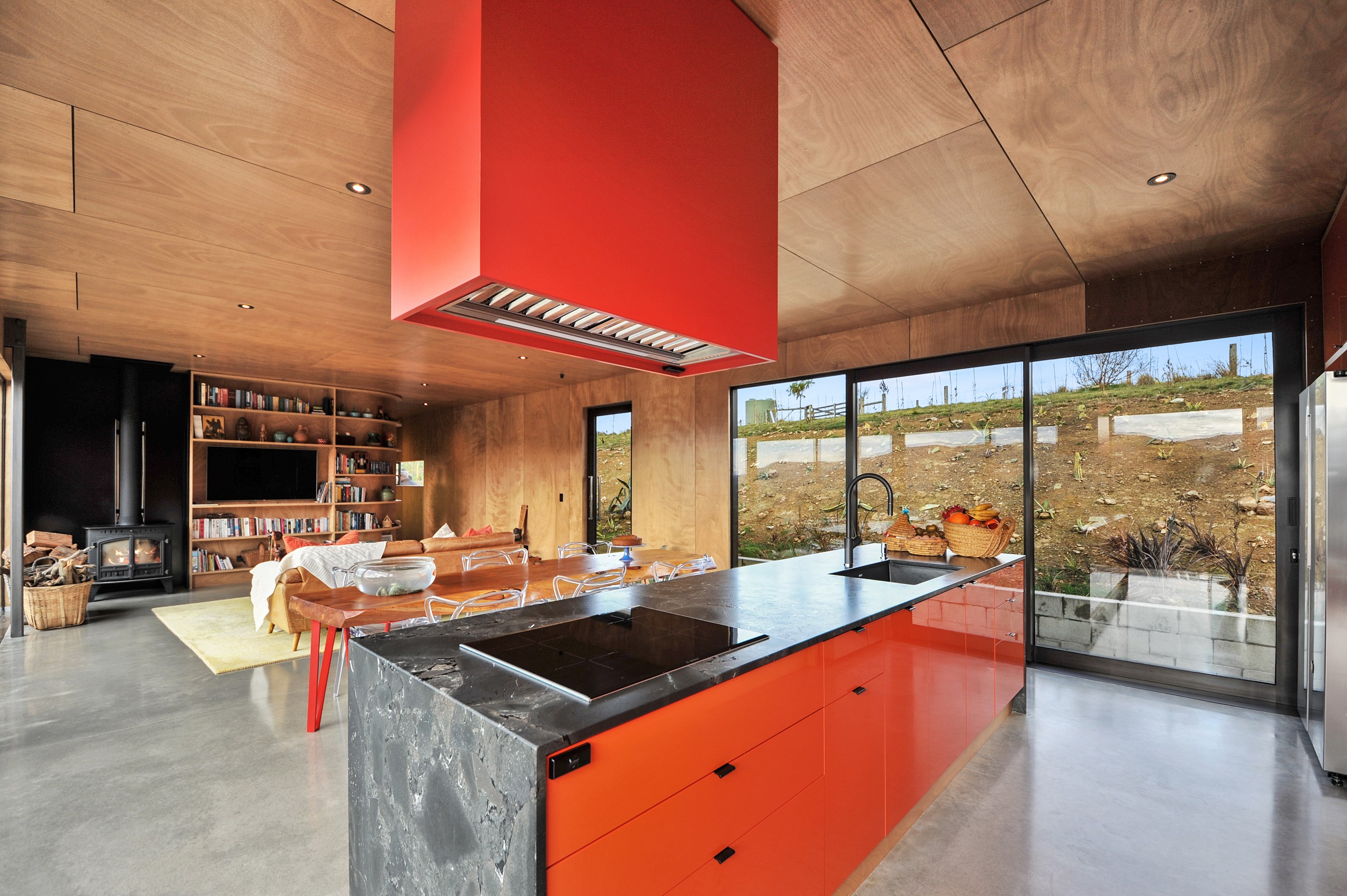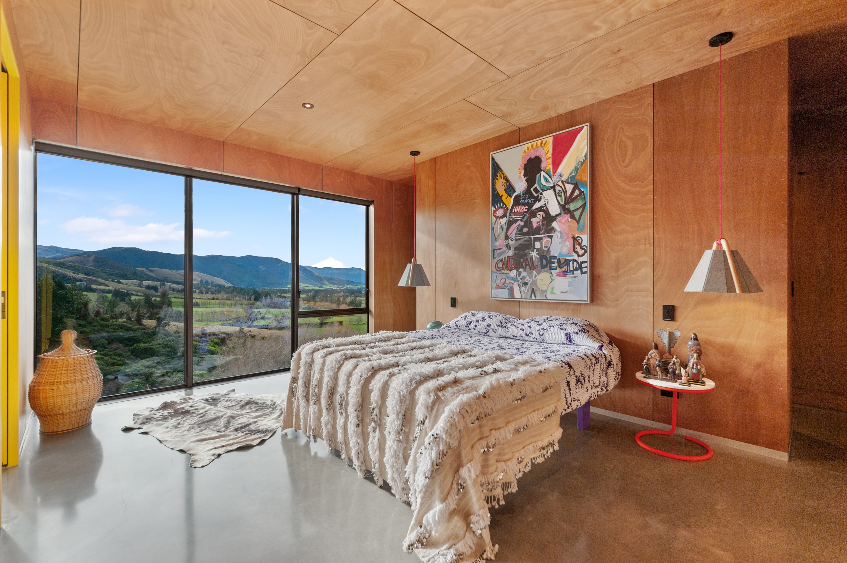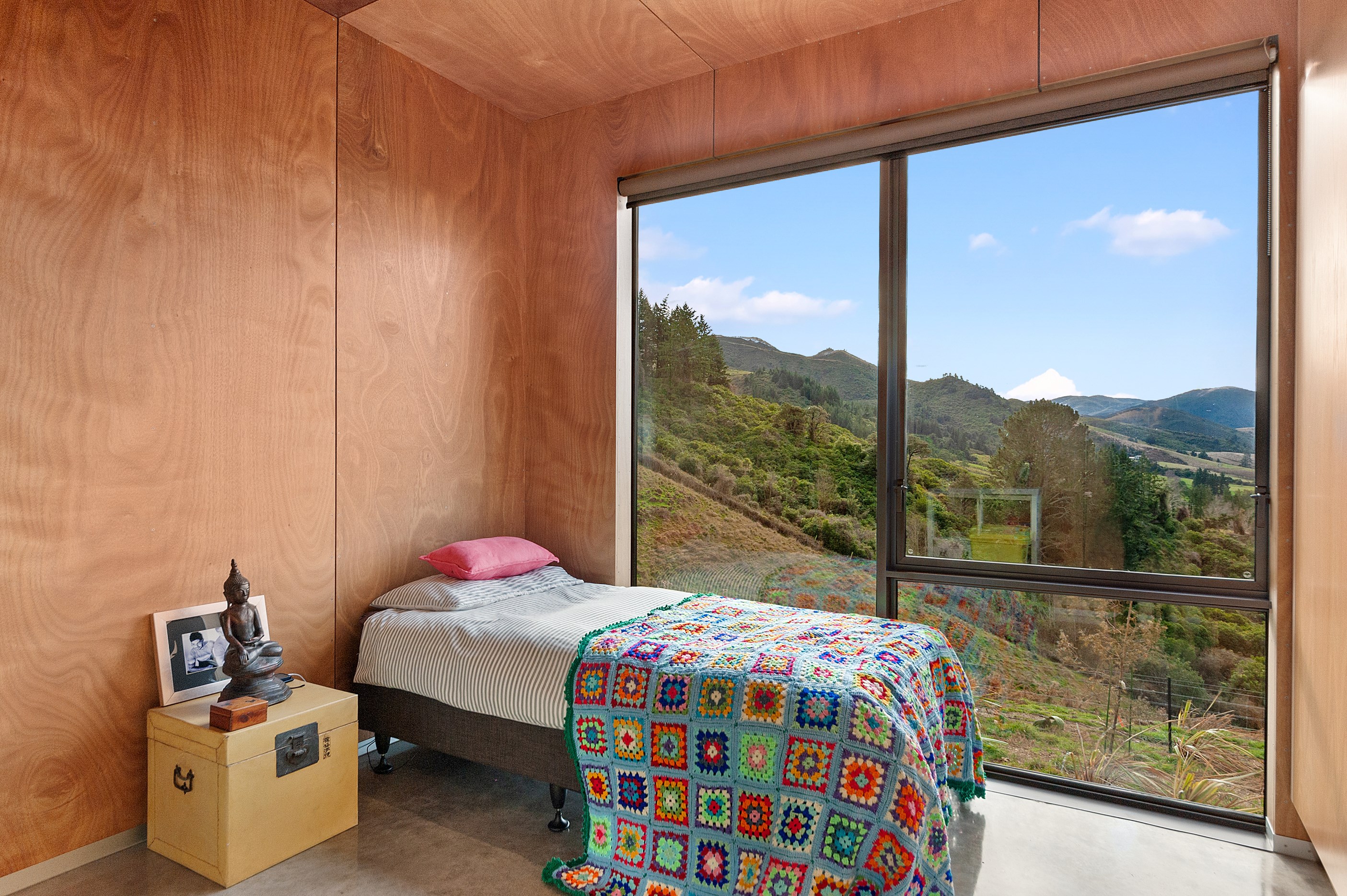 With plywood linings representing the branches of the Kowhai tree, the house extends to the vista, offering breath-taking 360 degree views out to the Canterbury plains and North Canterbury. Sit and relax on the decks which are designed to be non-intrusive and fit into the land. The exceptional kitchen consists of super glossy, bright orange cabinetry, mixed with plywood and custom joinery around curved walls – a masterpiece in distinctive design. Similarly, the bathroom tiles are laid on a curve. With three bedrooms, two bathrooms and a comfortable living room, this is a family home with an eye for comfort and a zest for life.