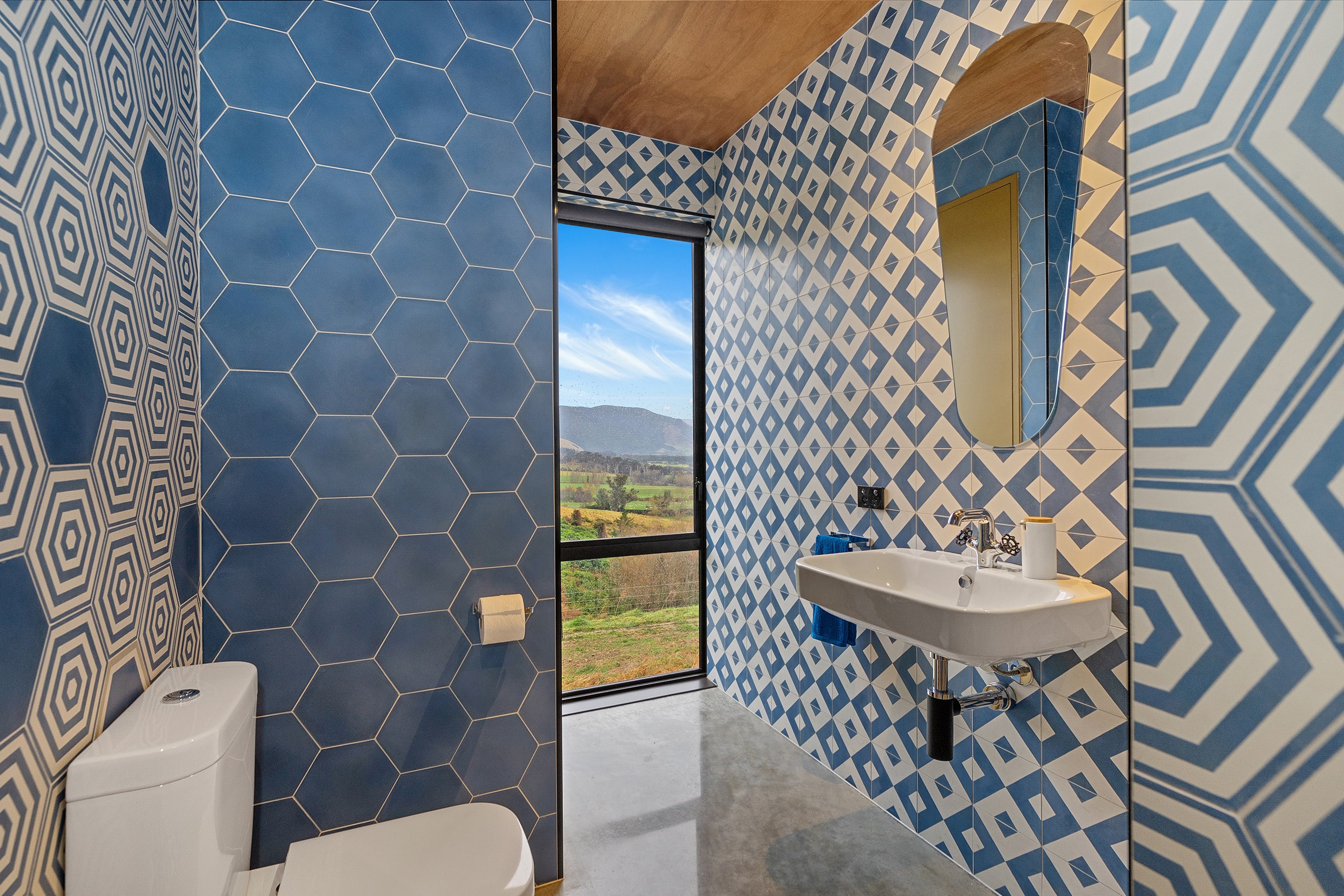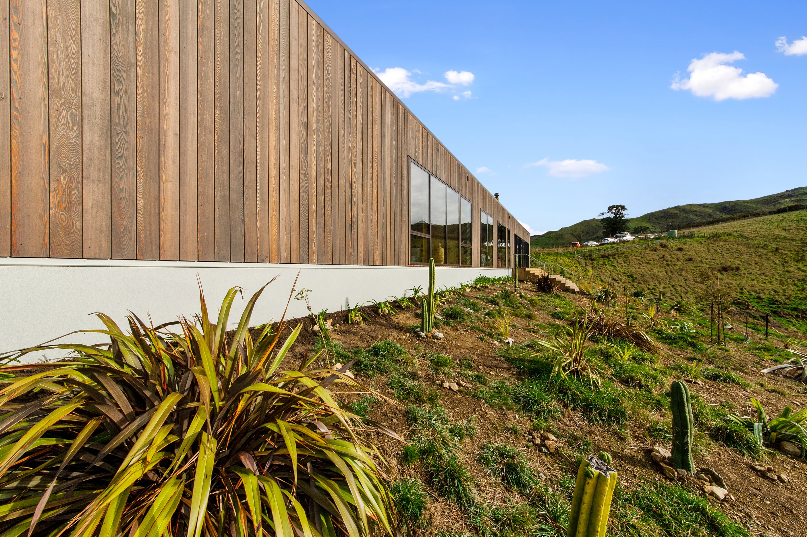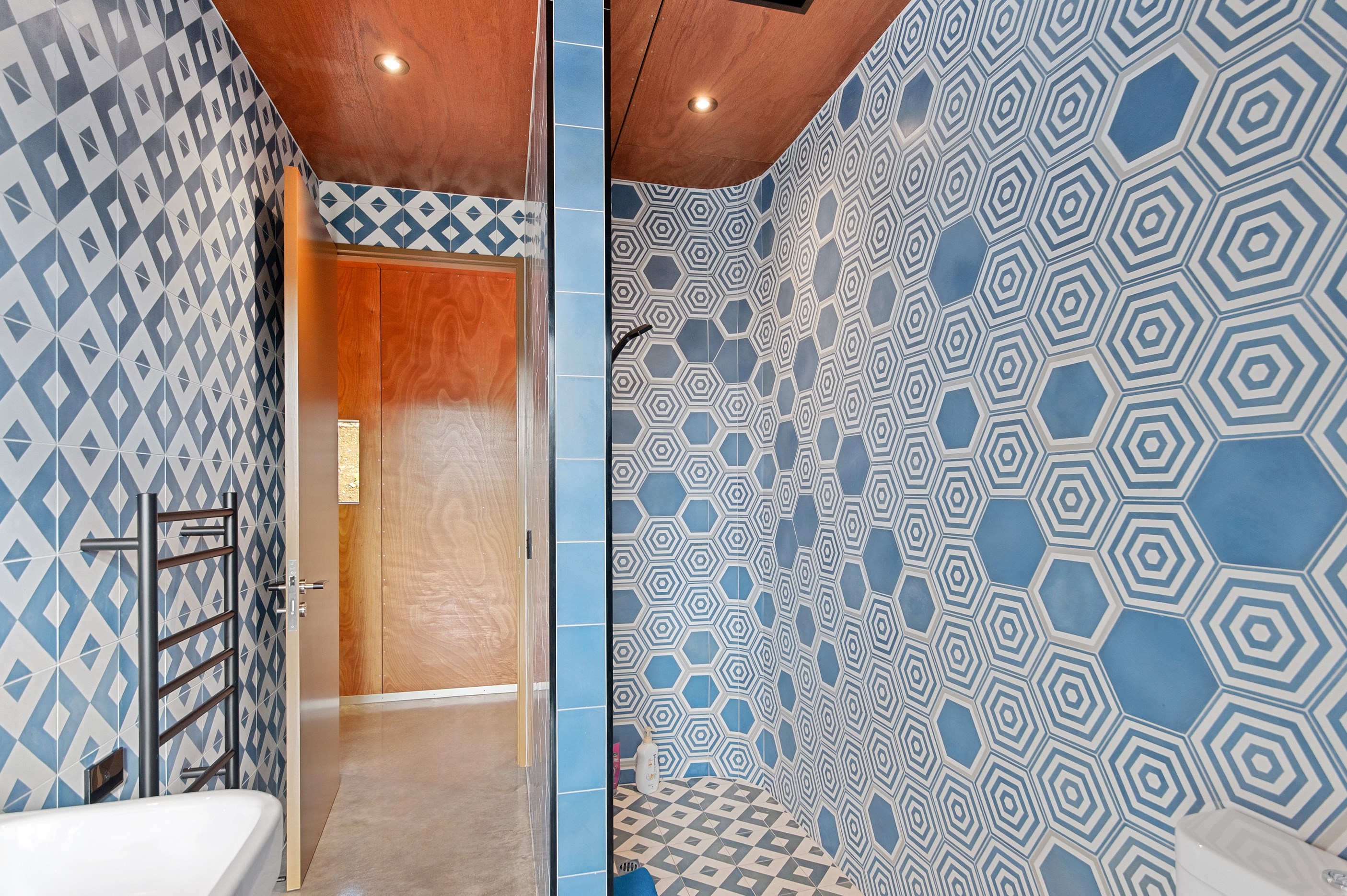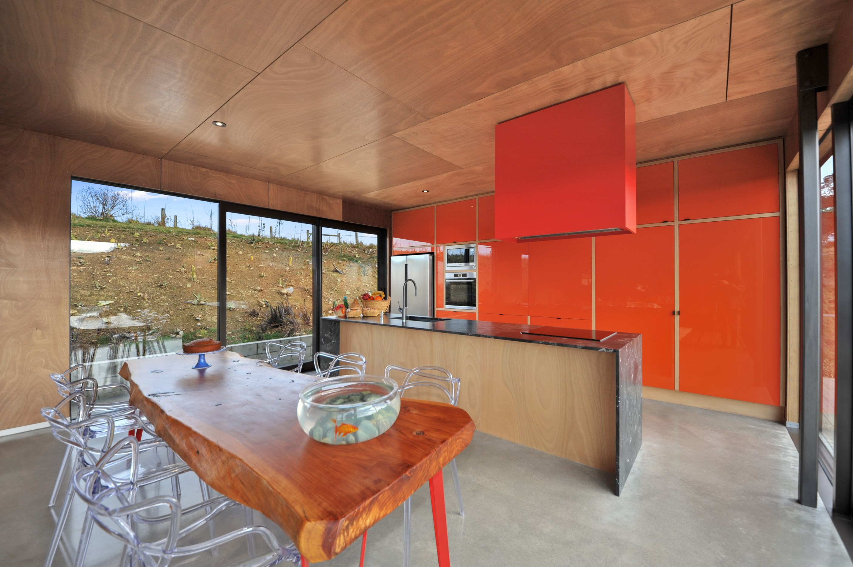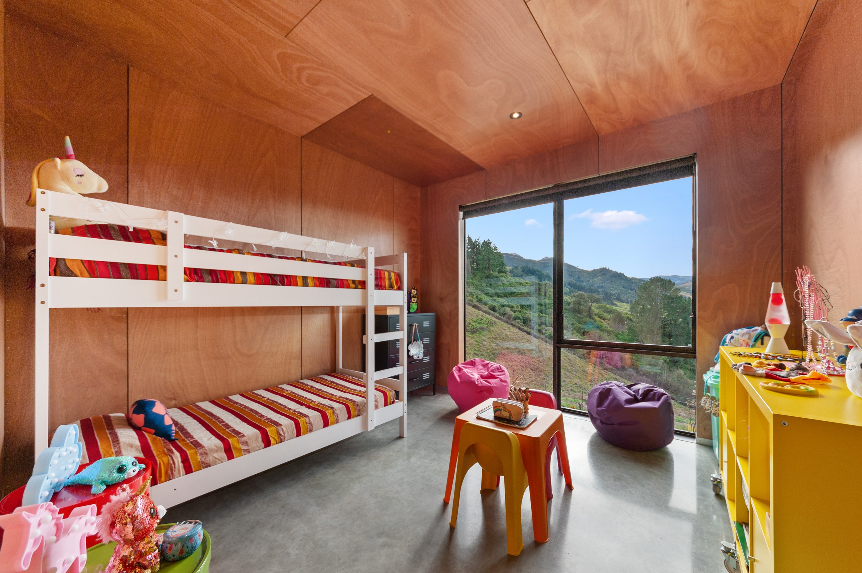 With plywood linings representing the branches of the Kowhai tree, the house extends to the vista, offering breath-taking 360 degree views out to the Canterbury plains and North Canterbury. Sit and relax on the decks which are designed to be non-intrusive and fit into the land. The exceptional kitchen consists of super glossy, bright orange cabinetry, mixed with plywood and custom joinery around curved walls – a masterpiece in distinctive design. Similarly, the bathroom tiles are laid on a curve. With three bedrooms, two bathrooms and a comfortable living room, this is a family home with an eye for comfort and a zest for life.