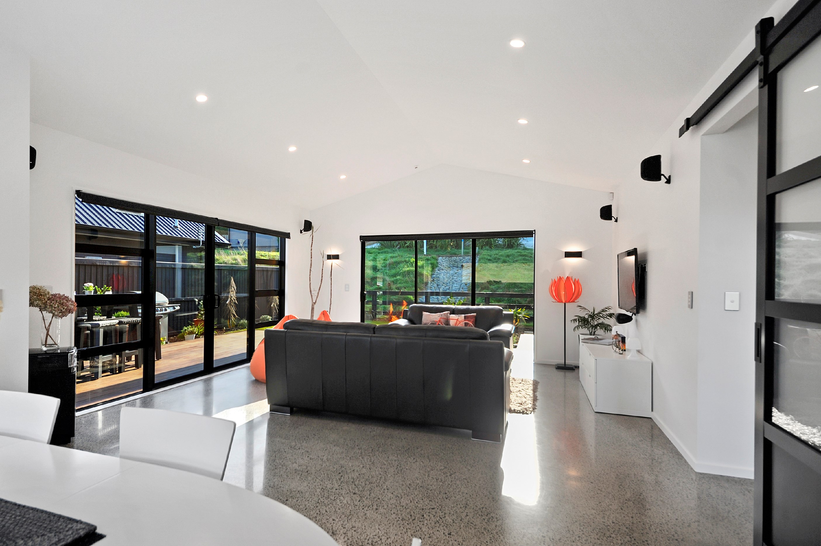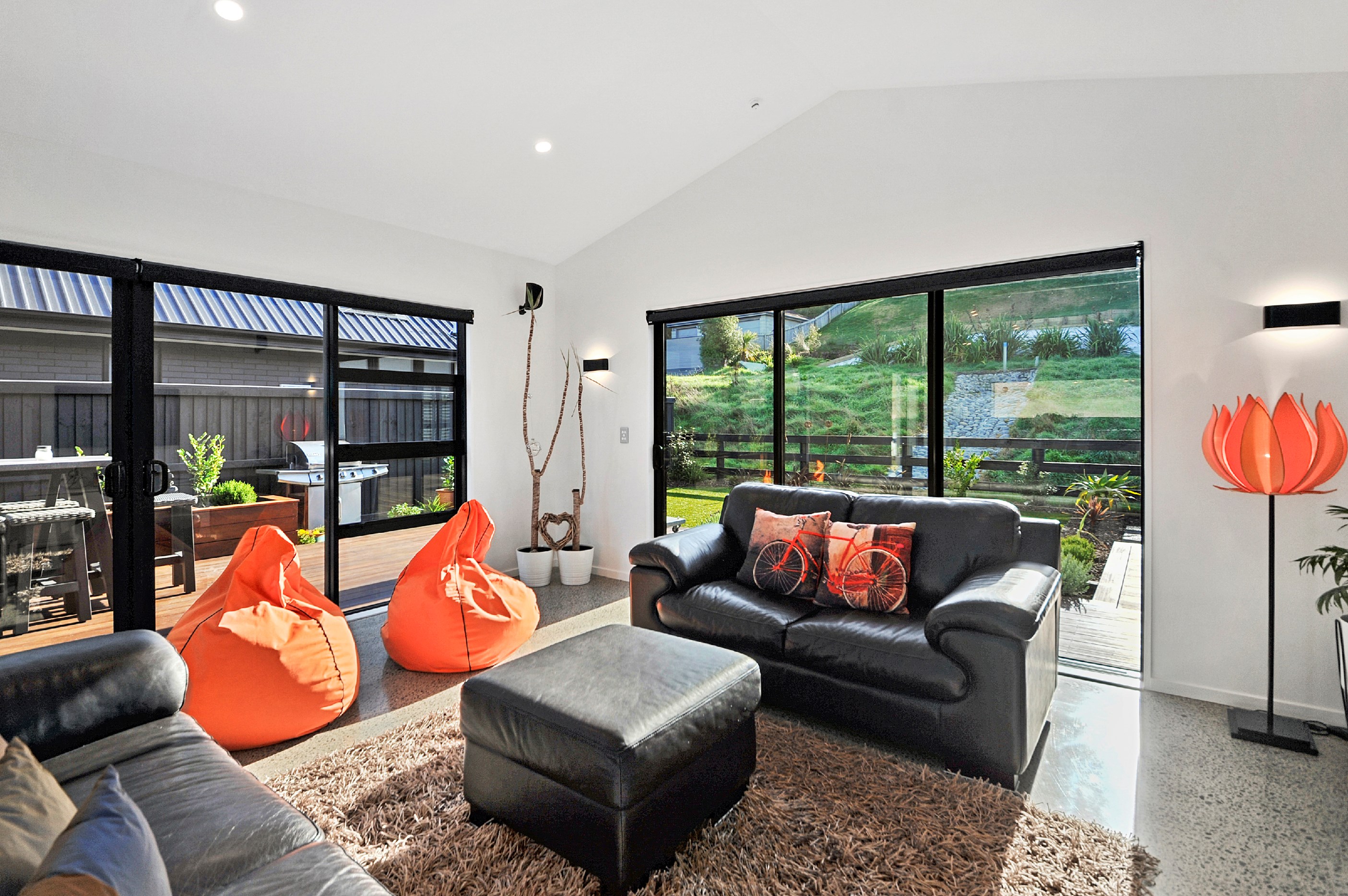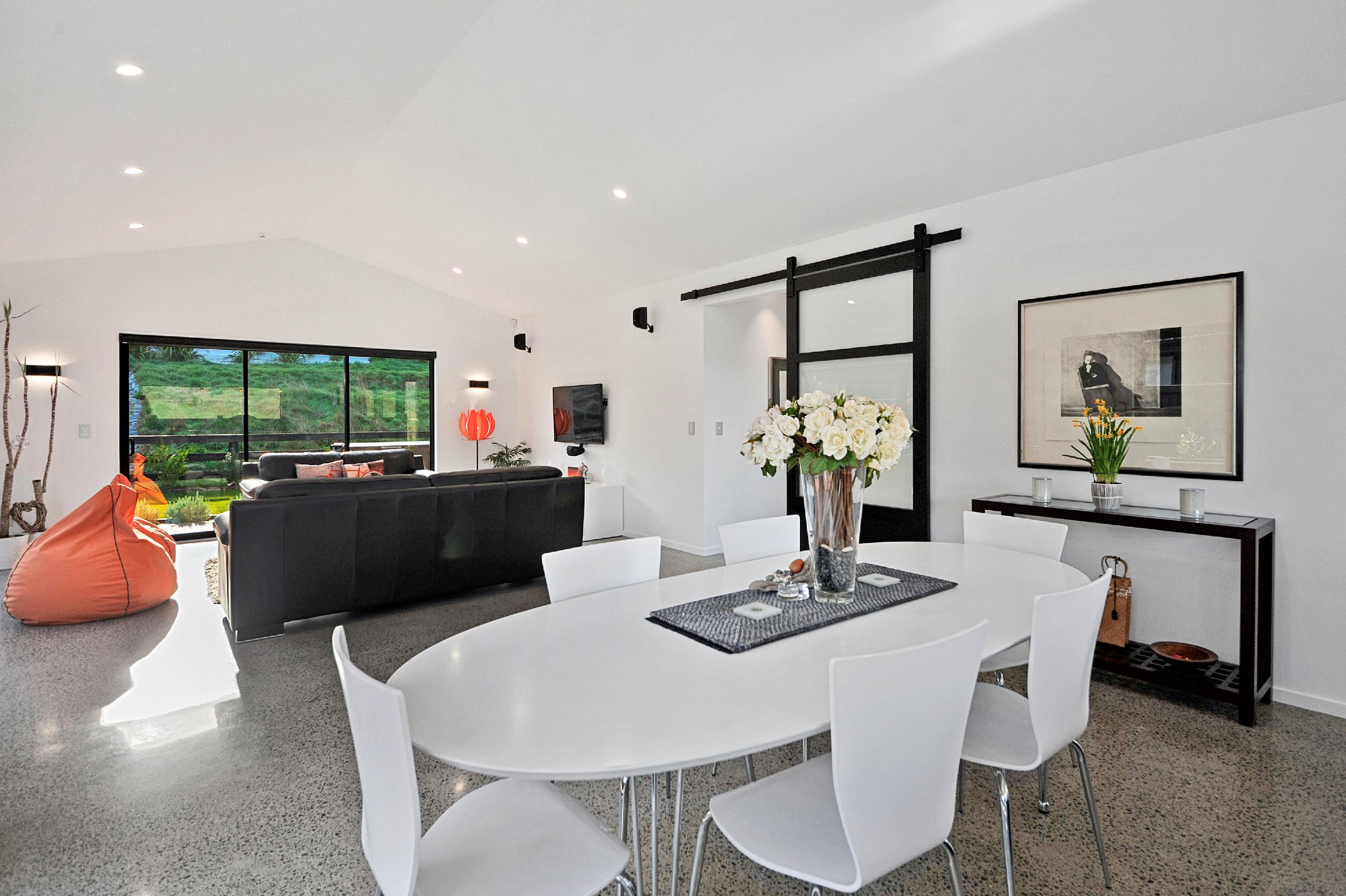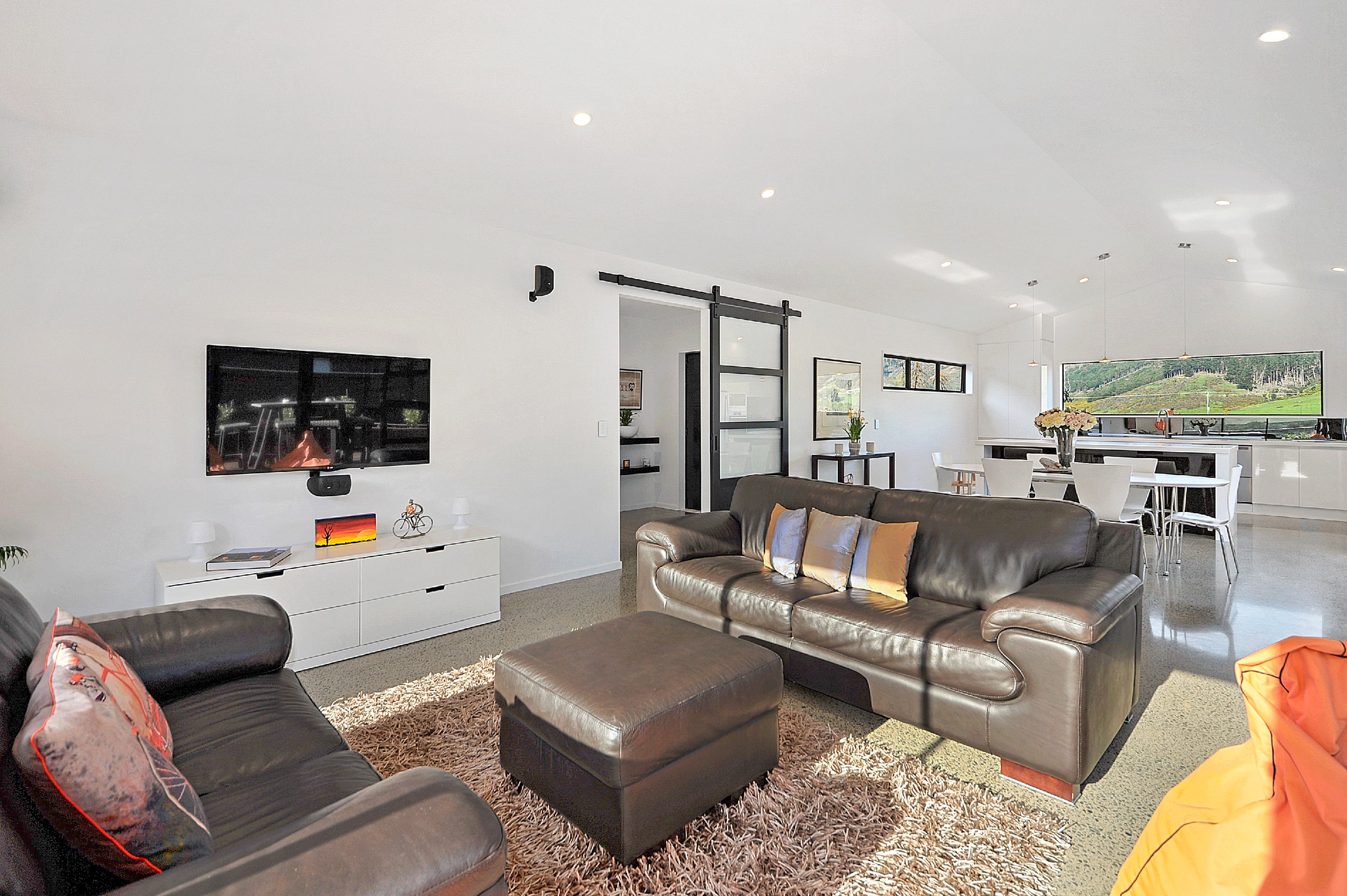 Concrete floors run throughout the living area and kitchen, and are offset by the white cabinetry. A mirrored splashback opens the space up, as does the wide window above the sink that presents the kitchen with a gorgeous green vista out across the surrounding area. Private from the main living area in a separate wing and connected by the entrance way, two bedrooms and two bathrooms make for harmonious living. The main bedroom opens out onto the deck. Exceptionally finished, this home is designed for easy living indoors and out. Its balance of convenience and style ensures it is a truly relaxed retreat.