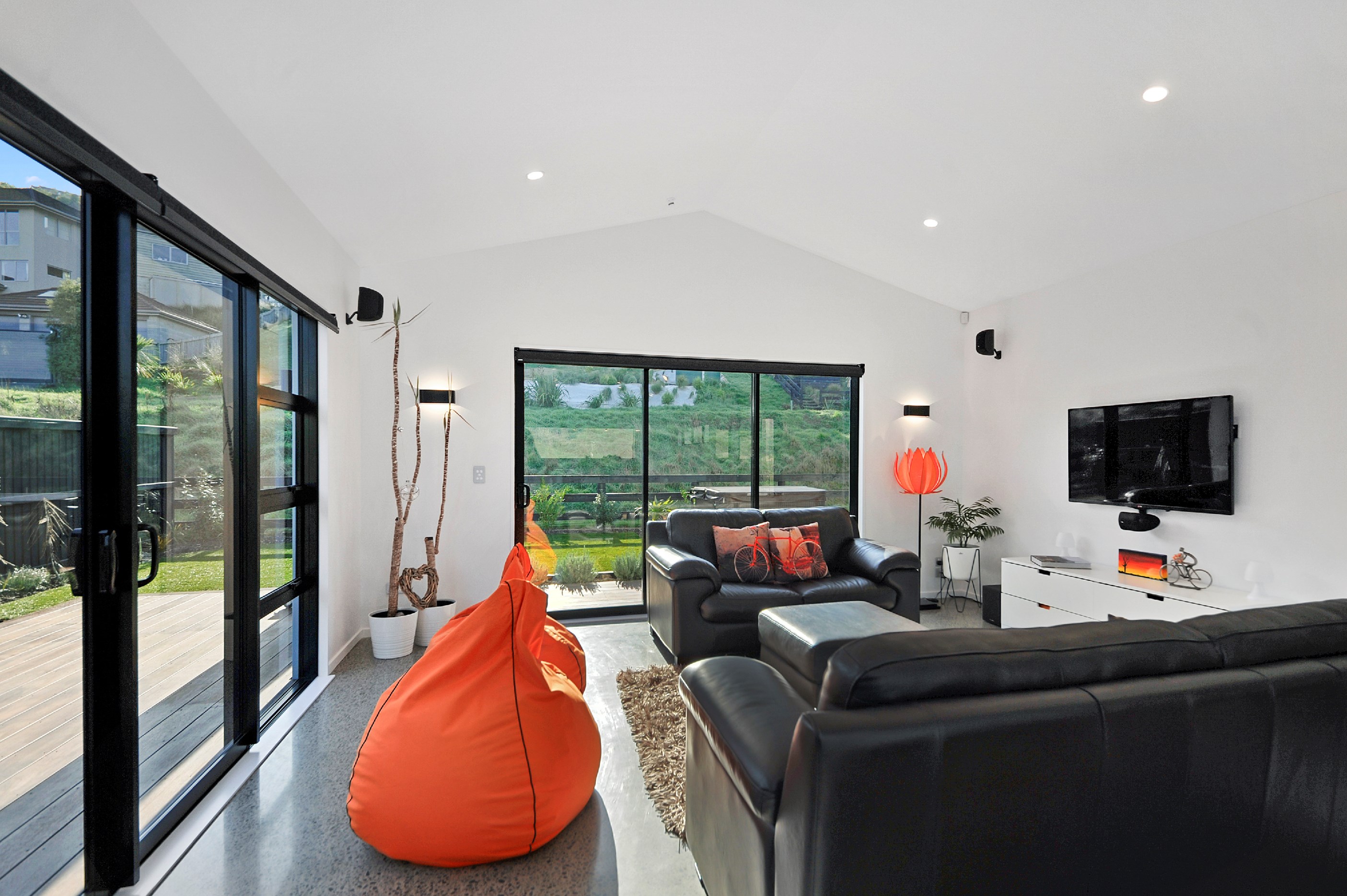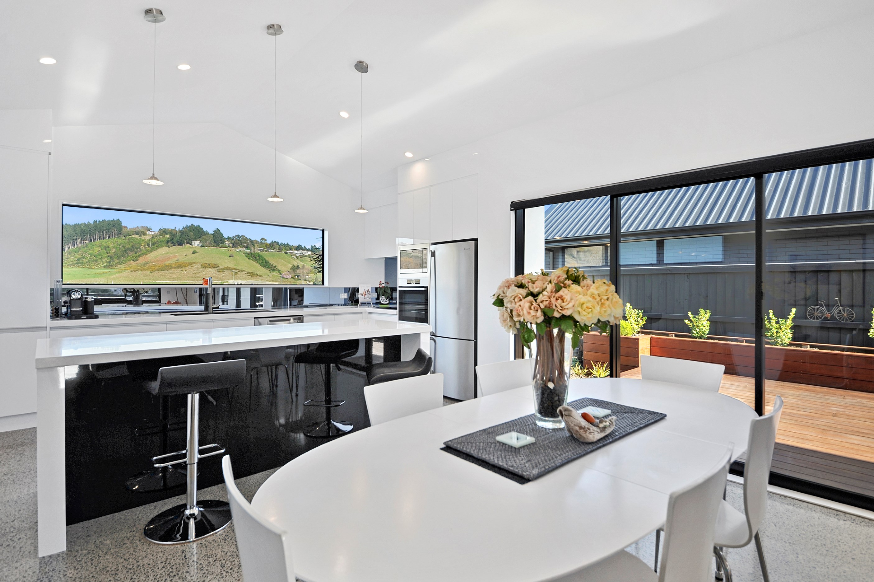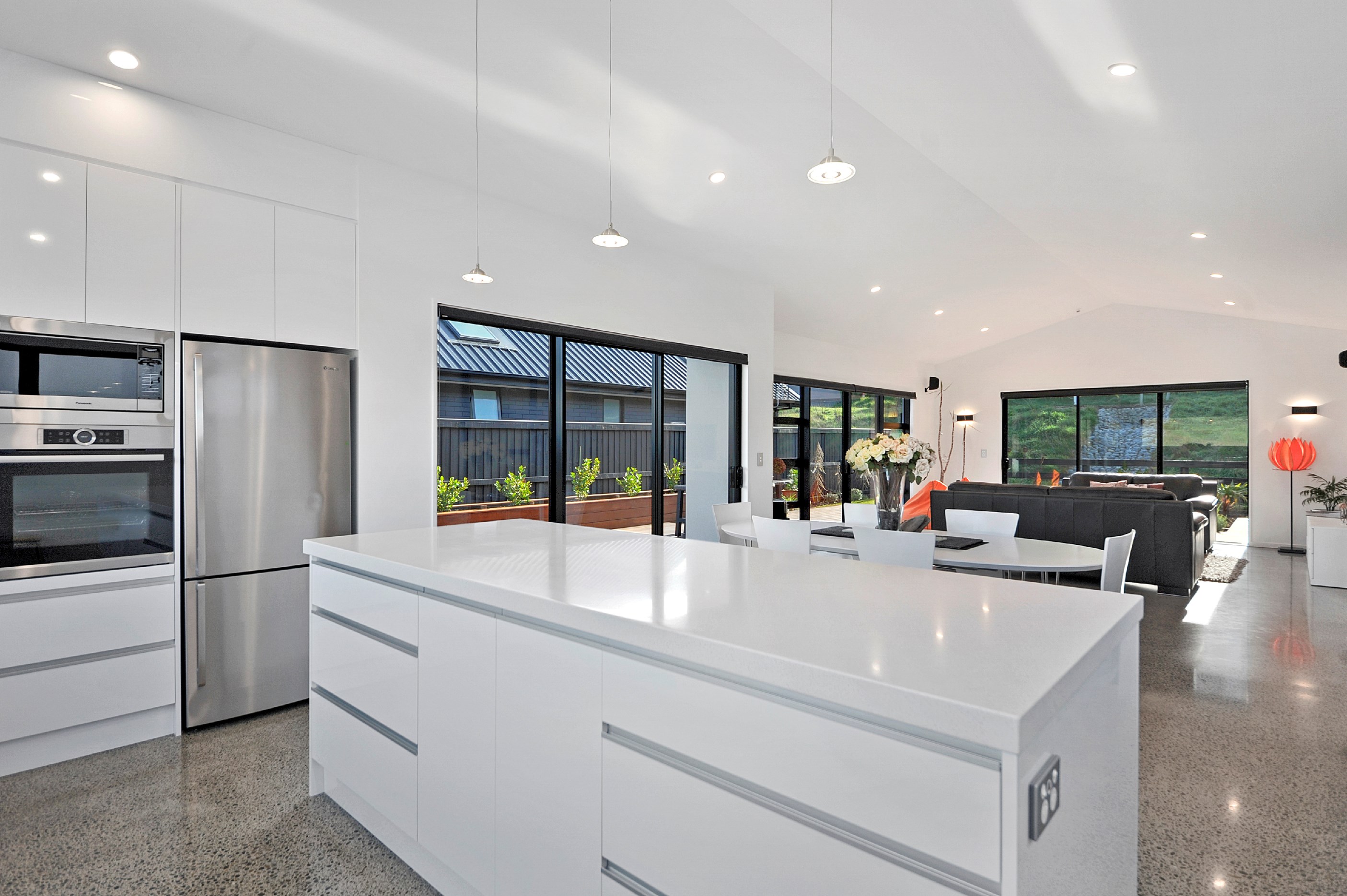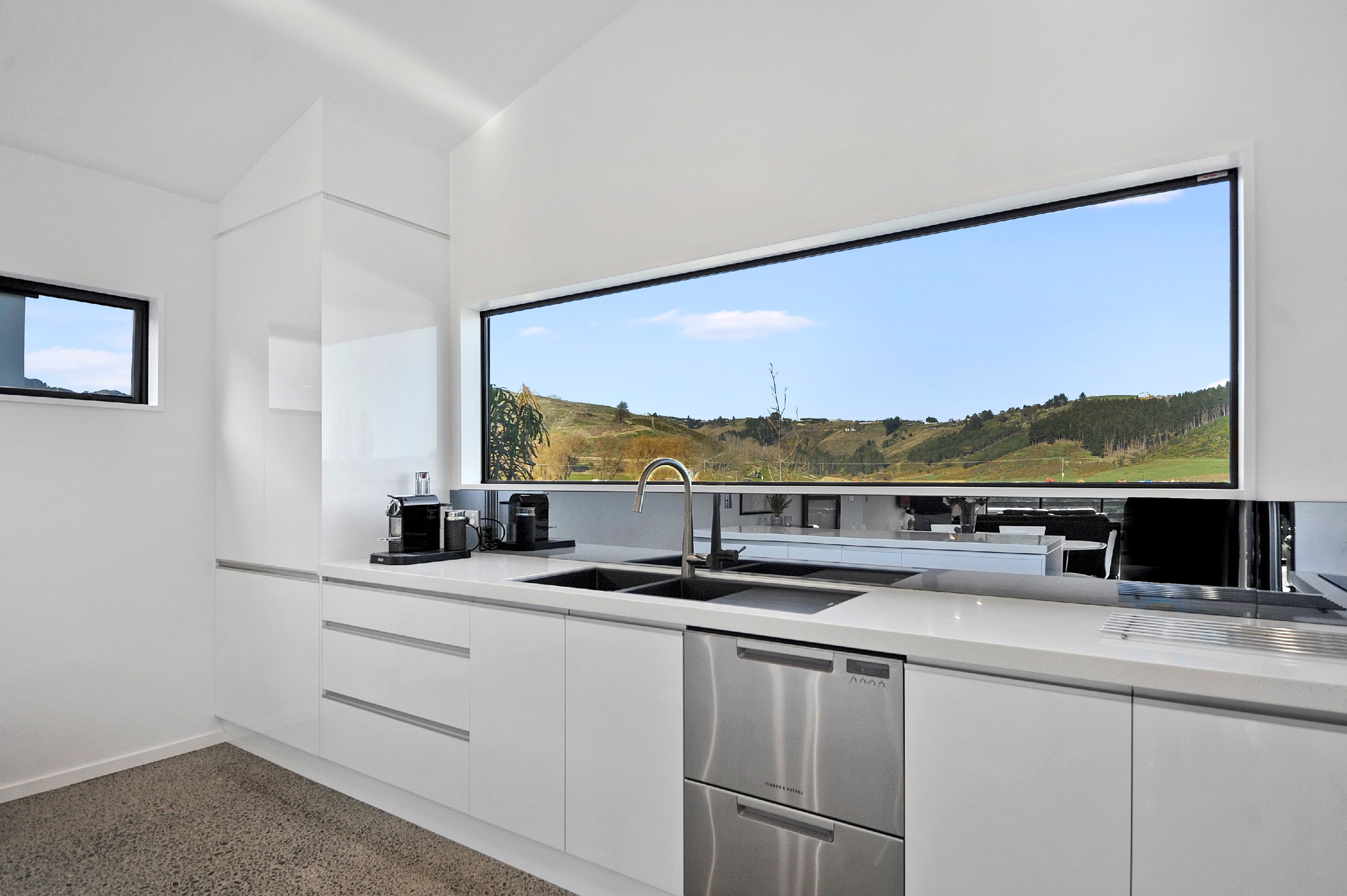 Concrete floors run throughout the living area and kitchen, and are offset by the white cabinetry. A mirrored splashback opens the space up, as does the wide window above the sink that presents the kitchen with a gorgeous green vista out across the surrounding area. Private from the main living area in a separate wing and connected by the entrance way, two bedrooms and two bathrooms make for harmonious living. The main bedroom opens out onto the deck. Exceptionally finished, this home is designed for easy living indoors and out. Its balance of convenience and style ensures it is a truly relaxed retreat.