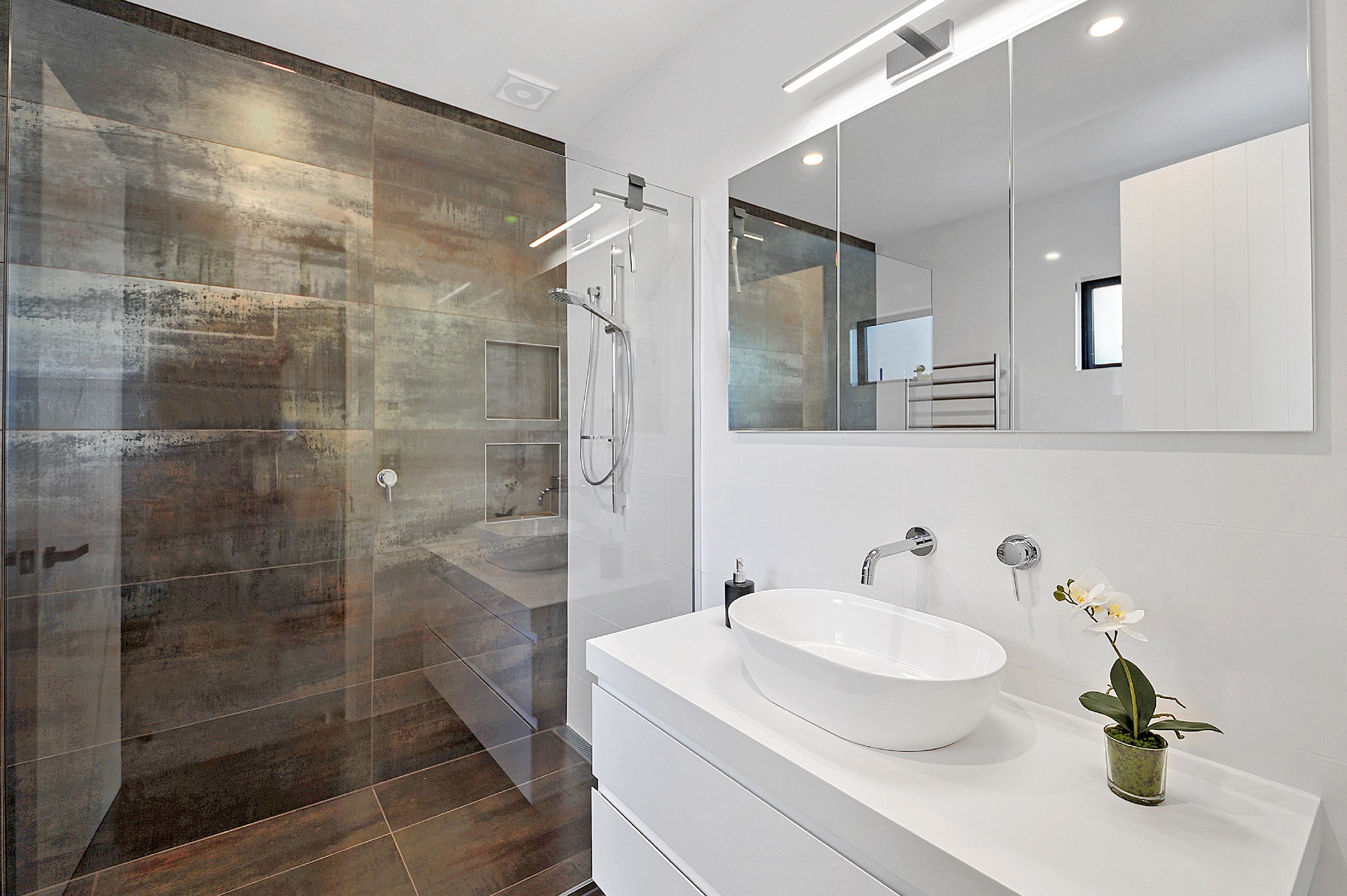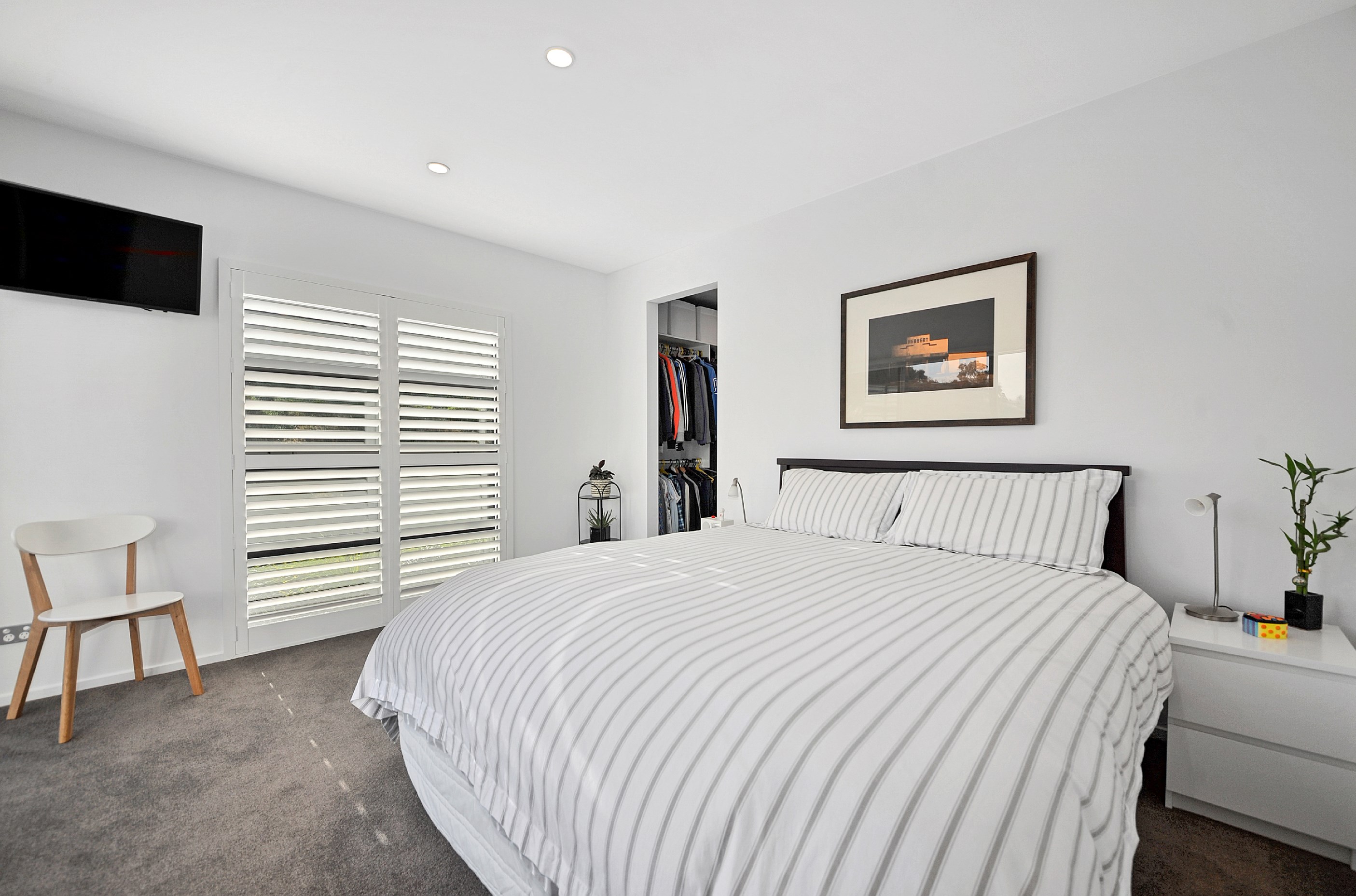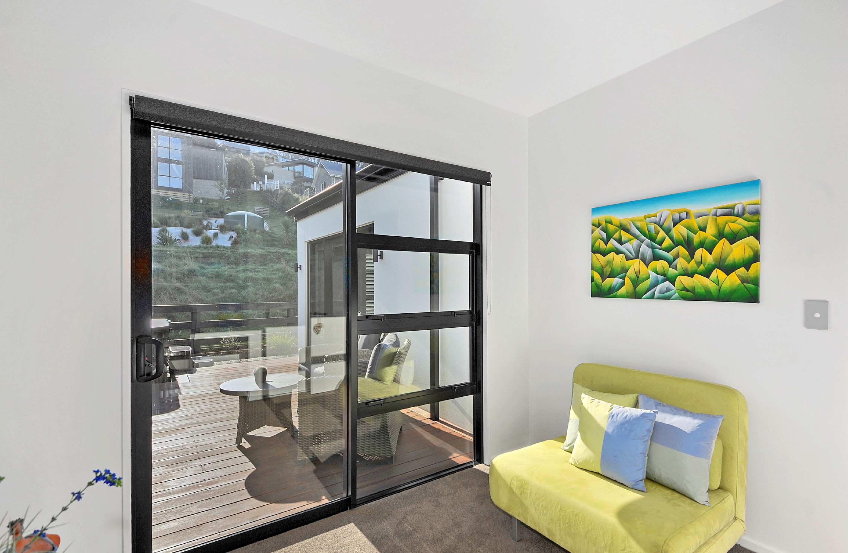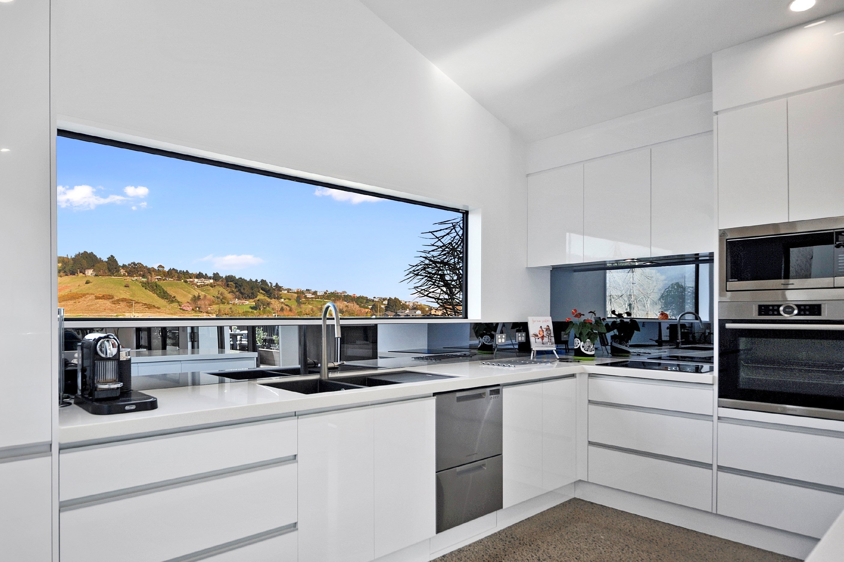 Concrete floors run throughout the living area and kitchen, and are offset by the white cabinetry. A mirrored splashback opens the space up, as does the wide window above the sink that presents the kitchen with a gorgeous green vista out across the surrounding area. Private from the main living area in a separate wing and connected by the entrance way, two bedrooms and two bathrooms make for harmonious living. The main bedroom opens out onto the deck. Exceptionally finished, this home is designed for easy living indoors and out. Its balance of convenience and style ensures it is a truly relaxed retreat.