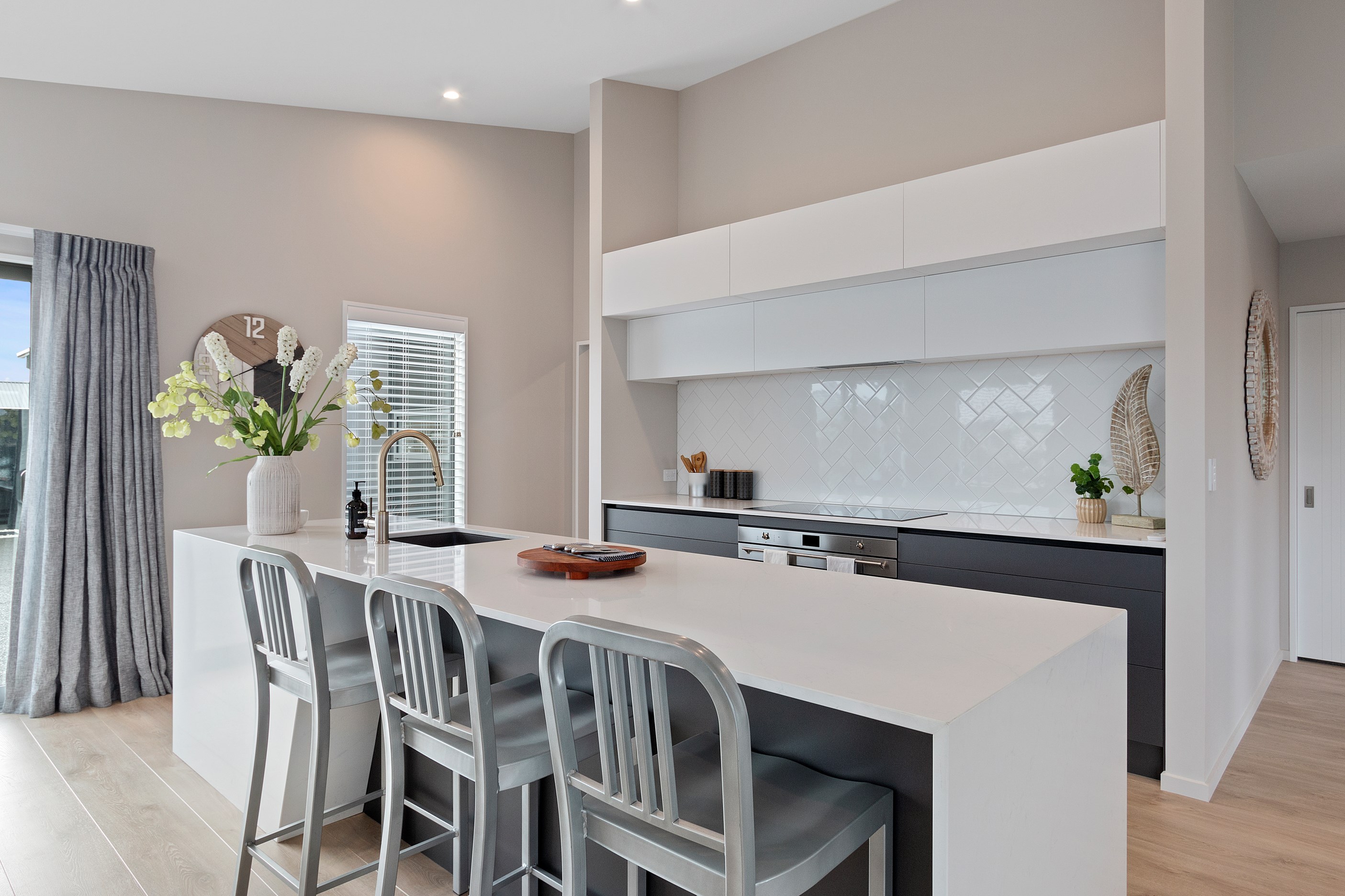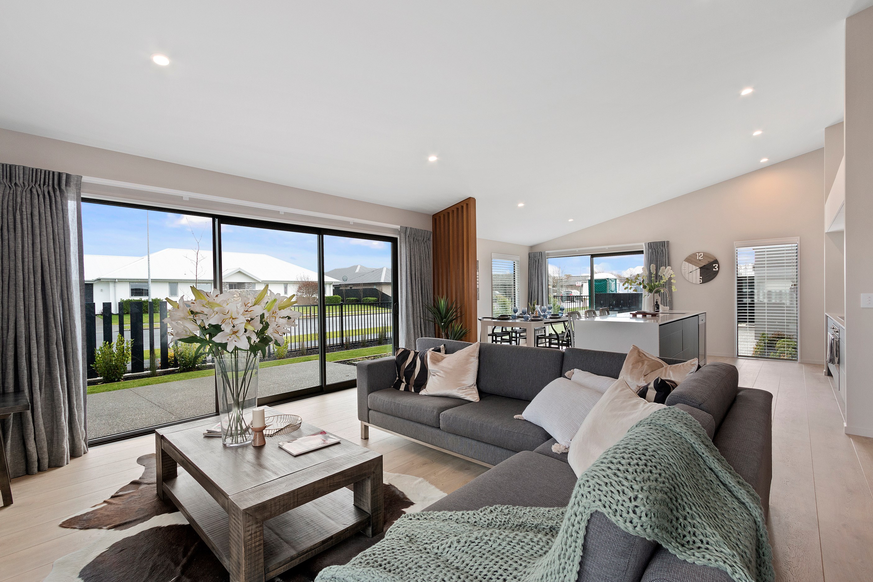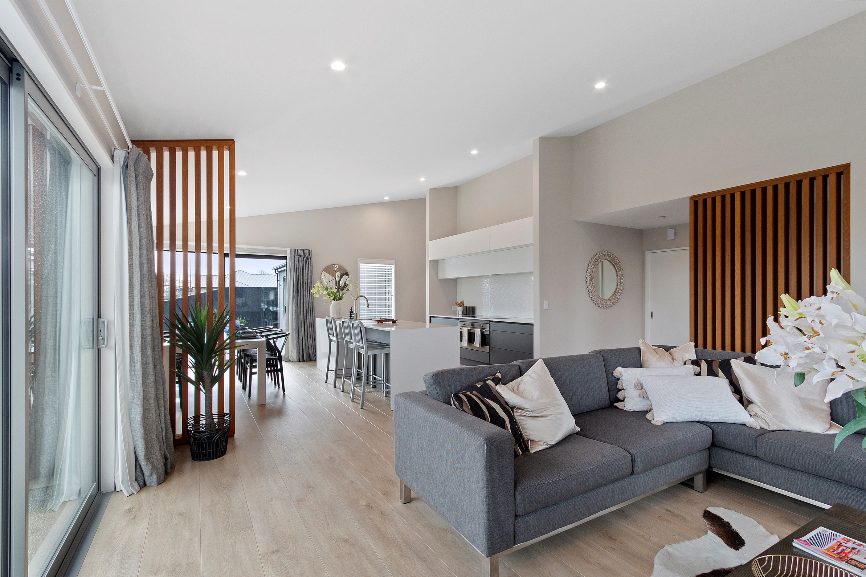 This modern three-bedroom home is both low maintenance and sophisticated, ideal for a growing family. Its distinctive design features are revealed on entry, with cedar batten partition walls within the open-plan kitchen/dining/living area giving the impression of separation, without compromising flow.