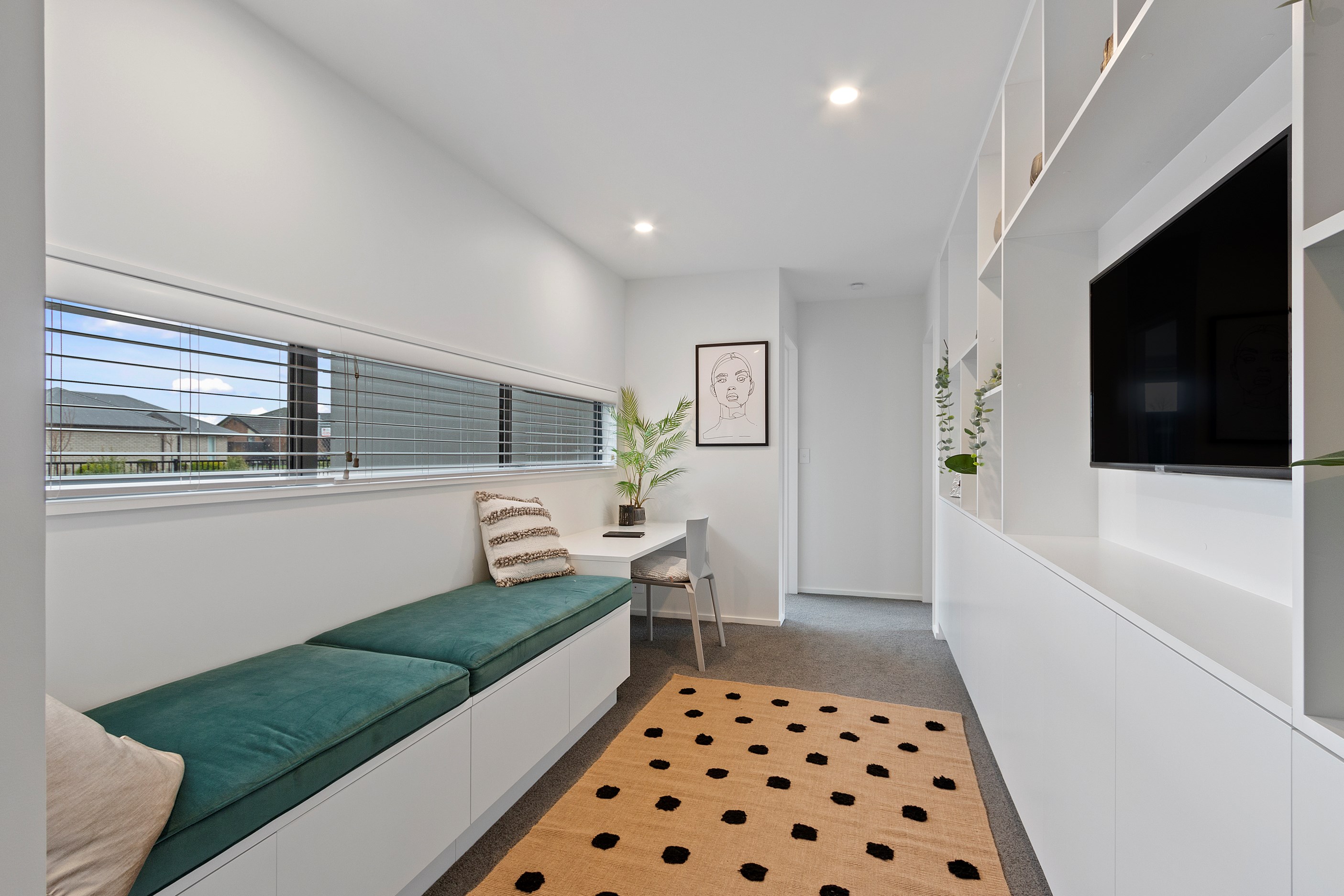 In the hall, the office area has custom cabinetry that extends into a window seat – a clever space-saving solution for children’s toys.