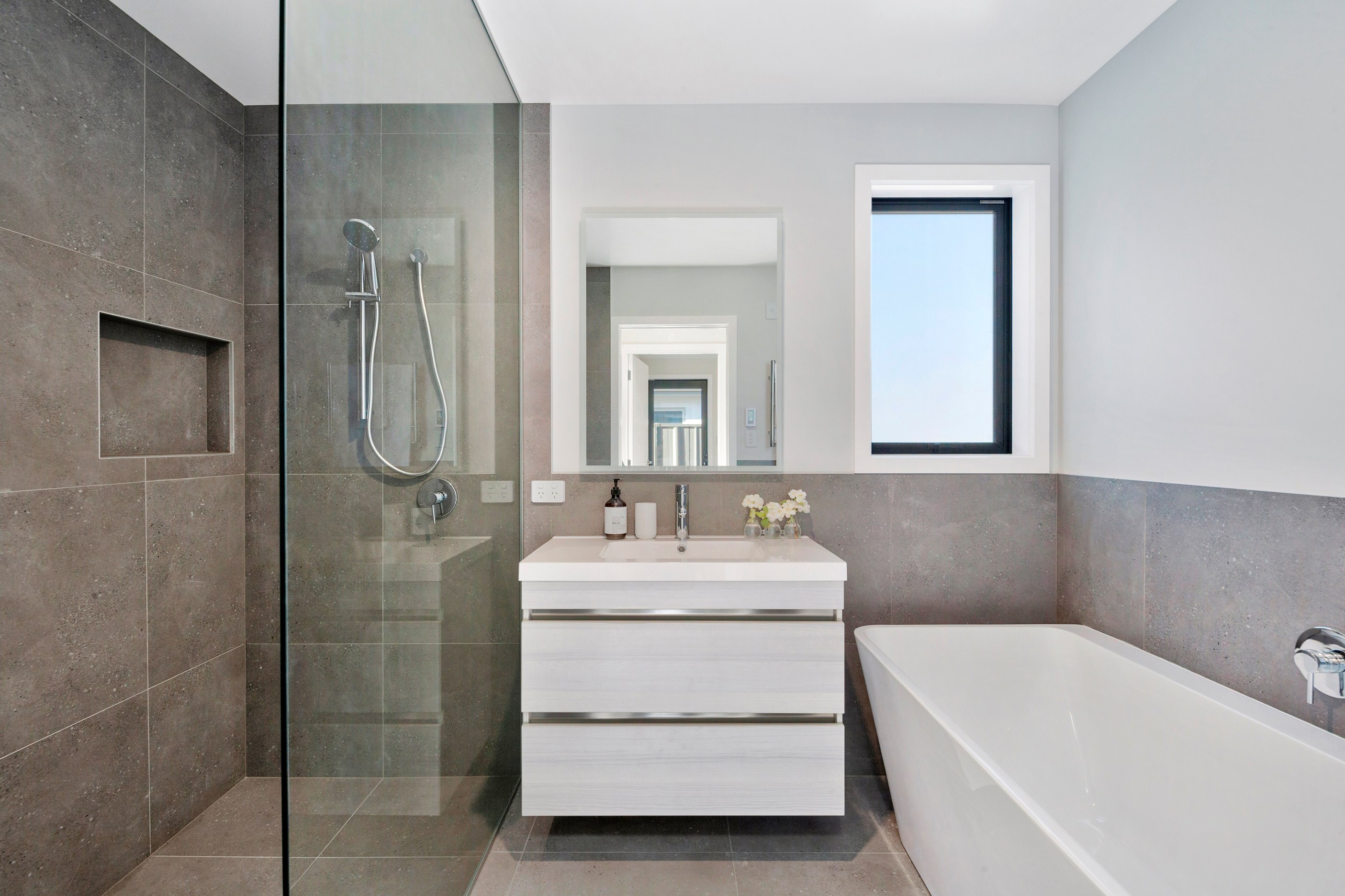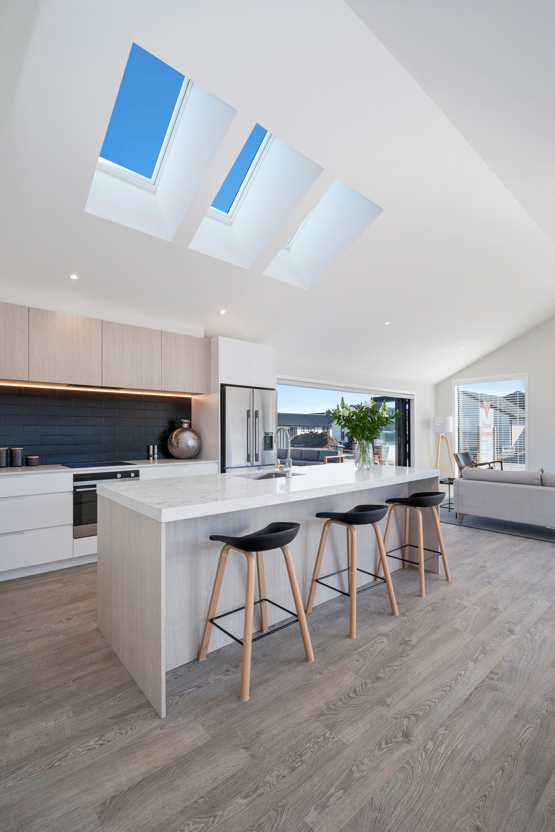 With three bedrooms and a study nook, this home is designed for a growing family. Two bathrooms, a separate toilet and a big laundry make modern living easy. The colour scheme and stylish flooring choices give the interior a warm and welcoming feel. A duck-egg blue main bedroom has an ensuite with tiles chosen to complement the soothing shade. The contrast with the dark floor tiles is consistent with the main bathroom. Skylights encourage natural light, and the raked ceiling engenders a feeling of space.
