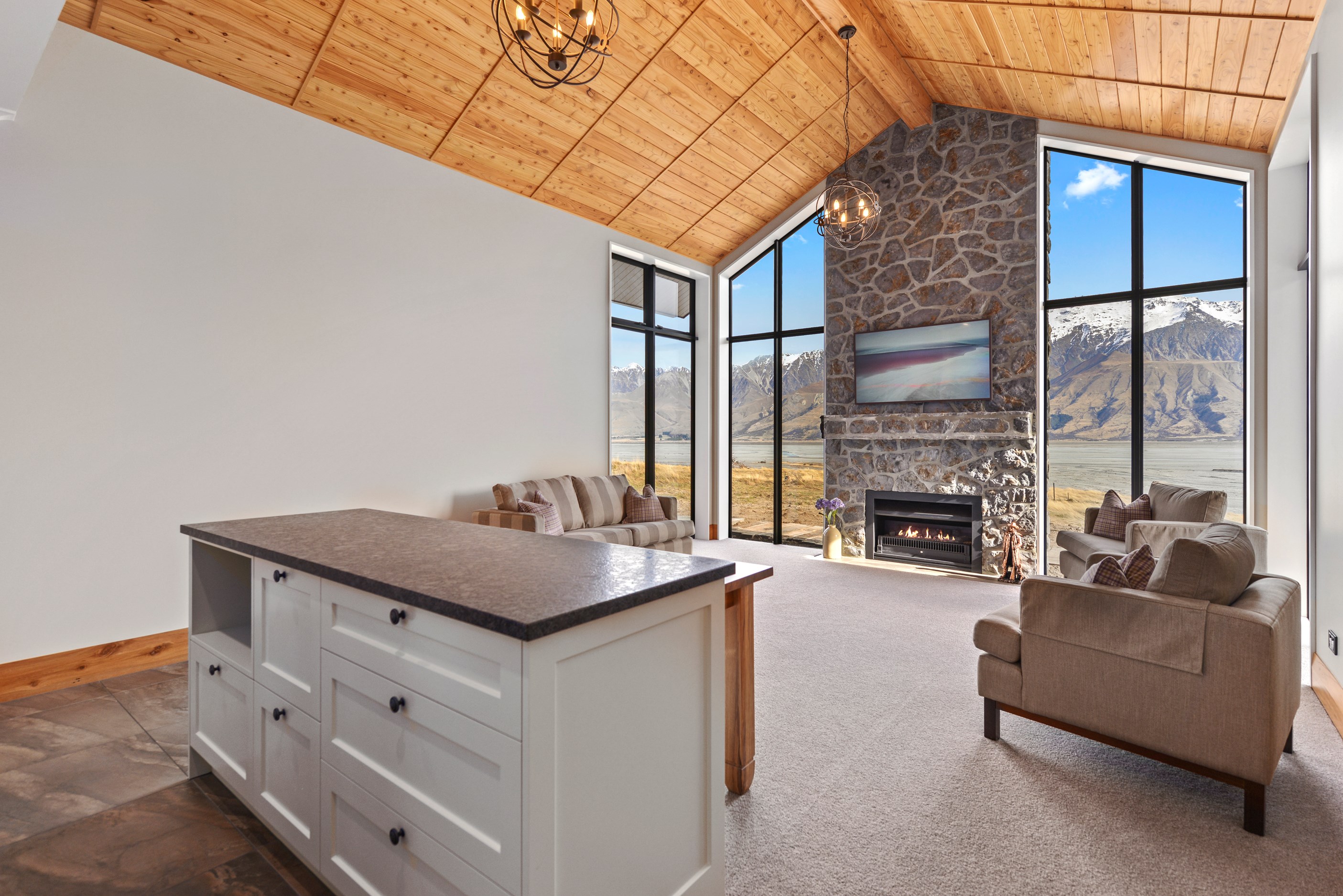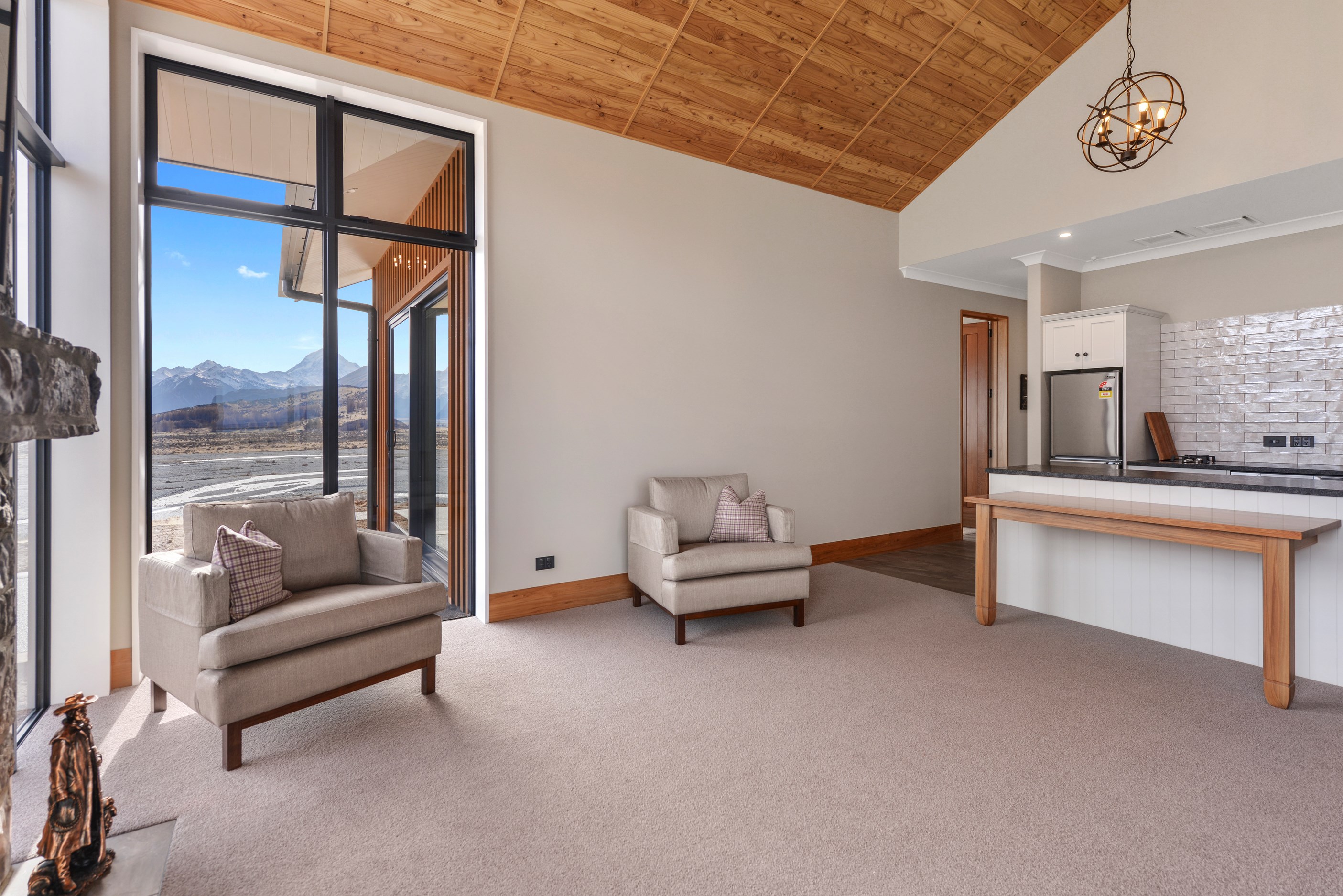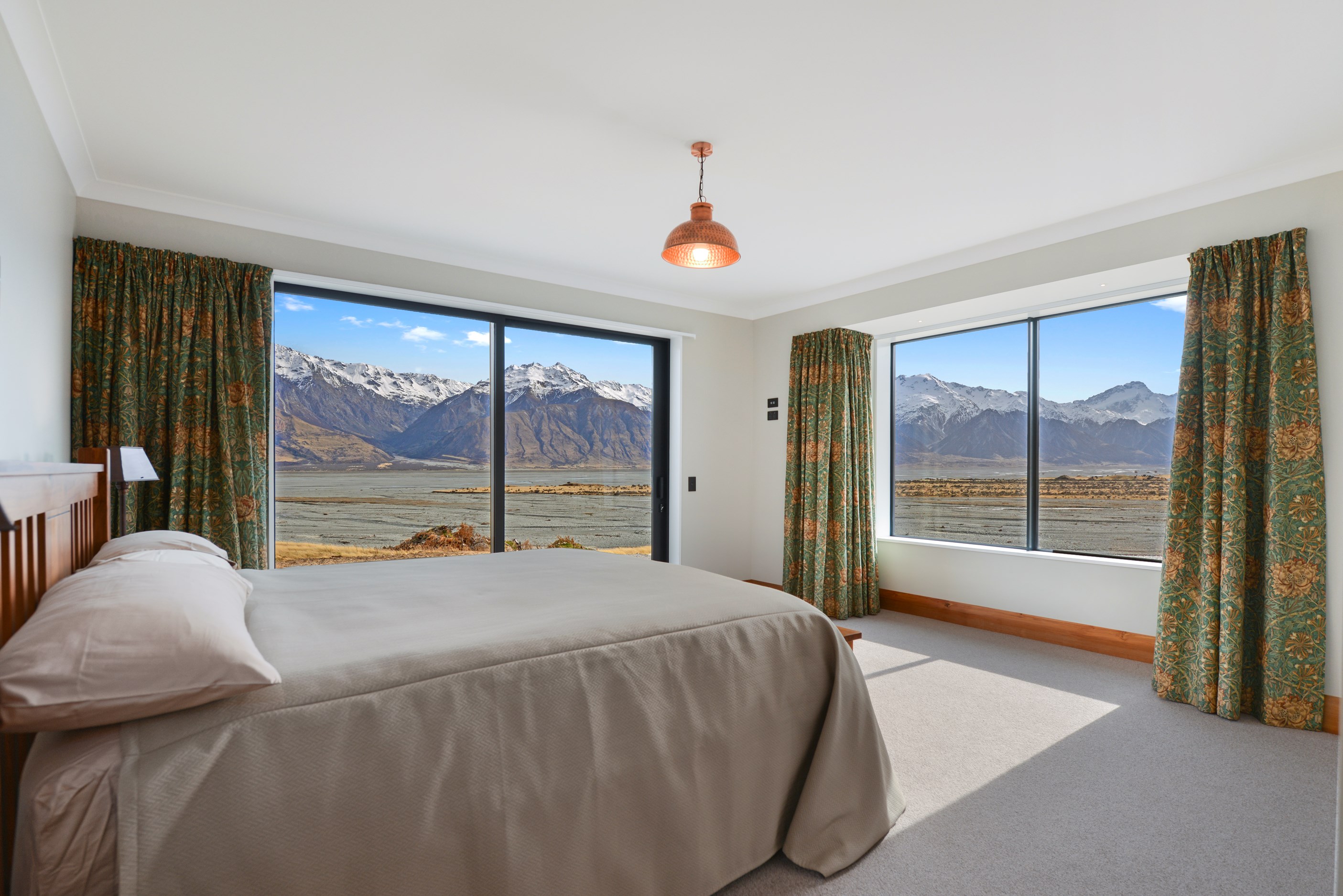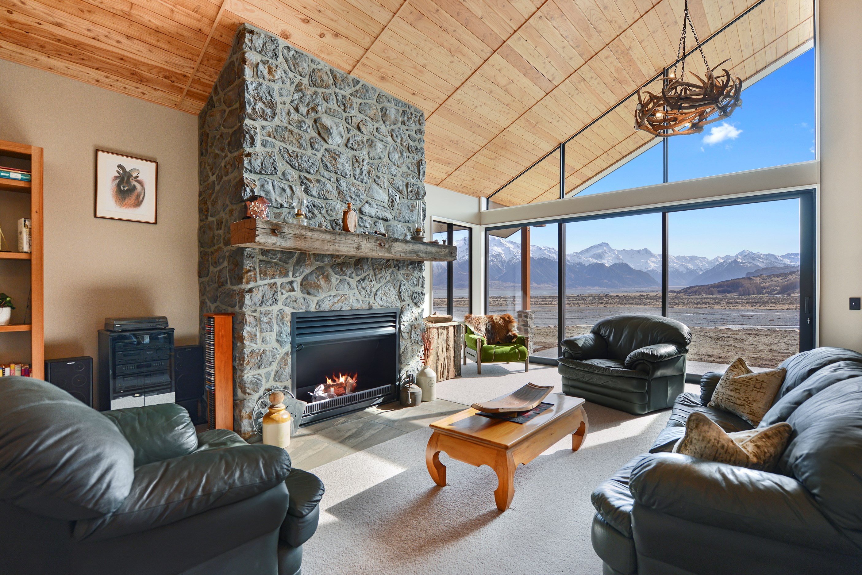 With breathtaking views of Aoraki, this high-country masterpiece utilises materials that resonate with its scenic environment. The exterior features stonework and cedar board-and-batten, mimicking the alpine terrain. Inside is just as exquisite. With five bedrooms and four bathrooms, the focal point of the home is the grand living area, complete with fireplace and striking stone mantelpiece.Here, floor-to-ceiling windows allow you to take in the glorious panorama while warming by the fire as sunlight streams in.