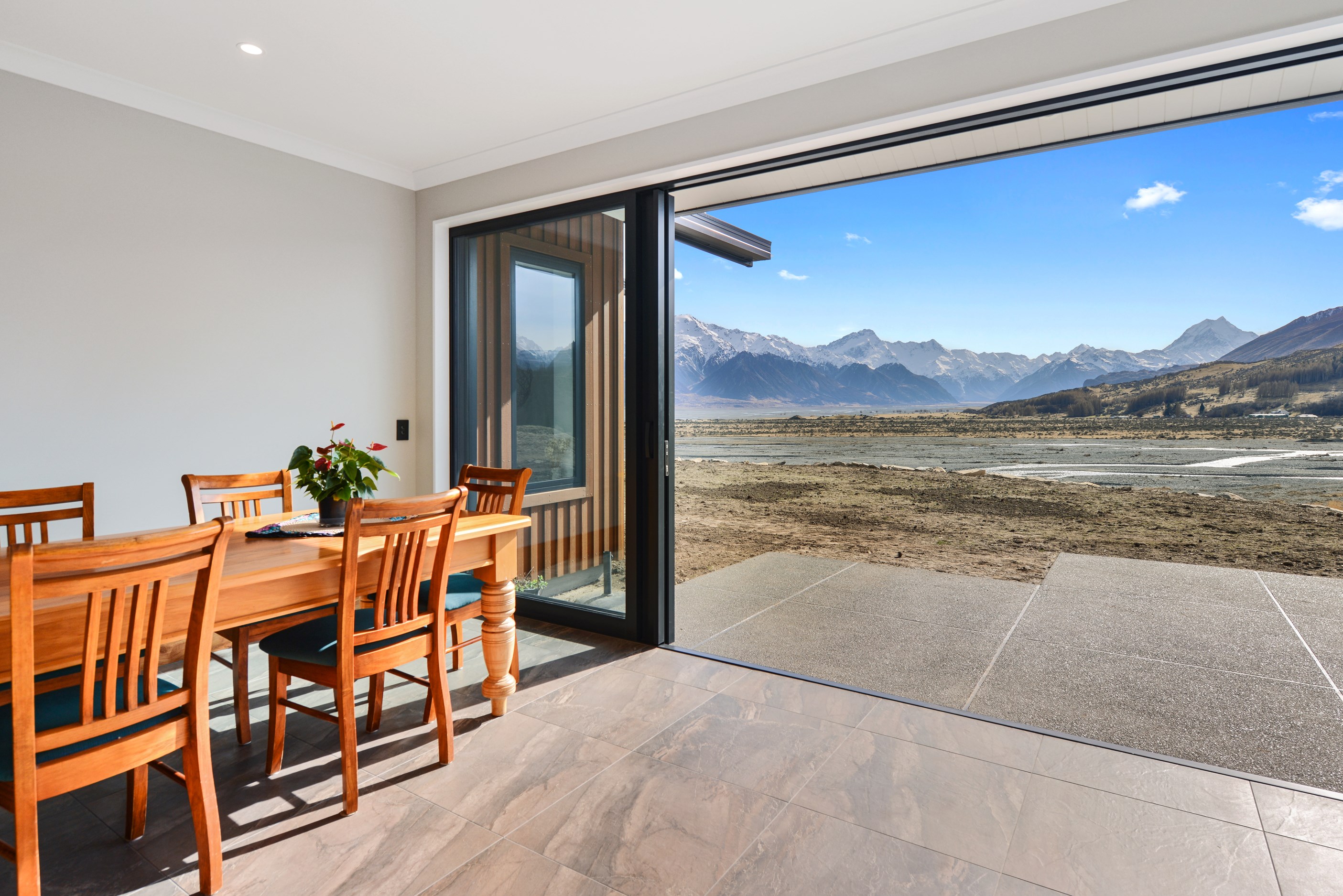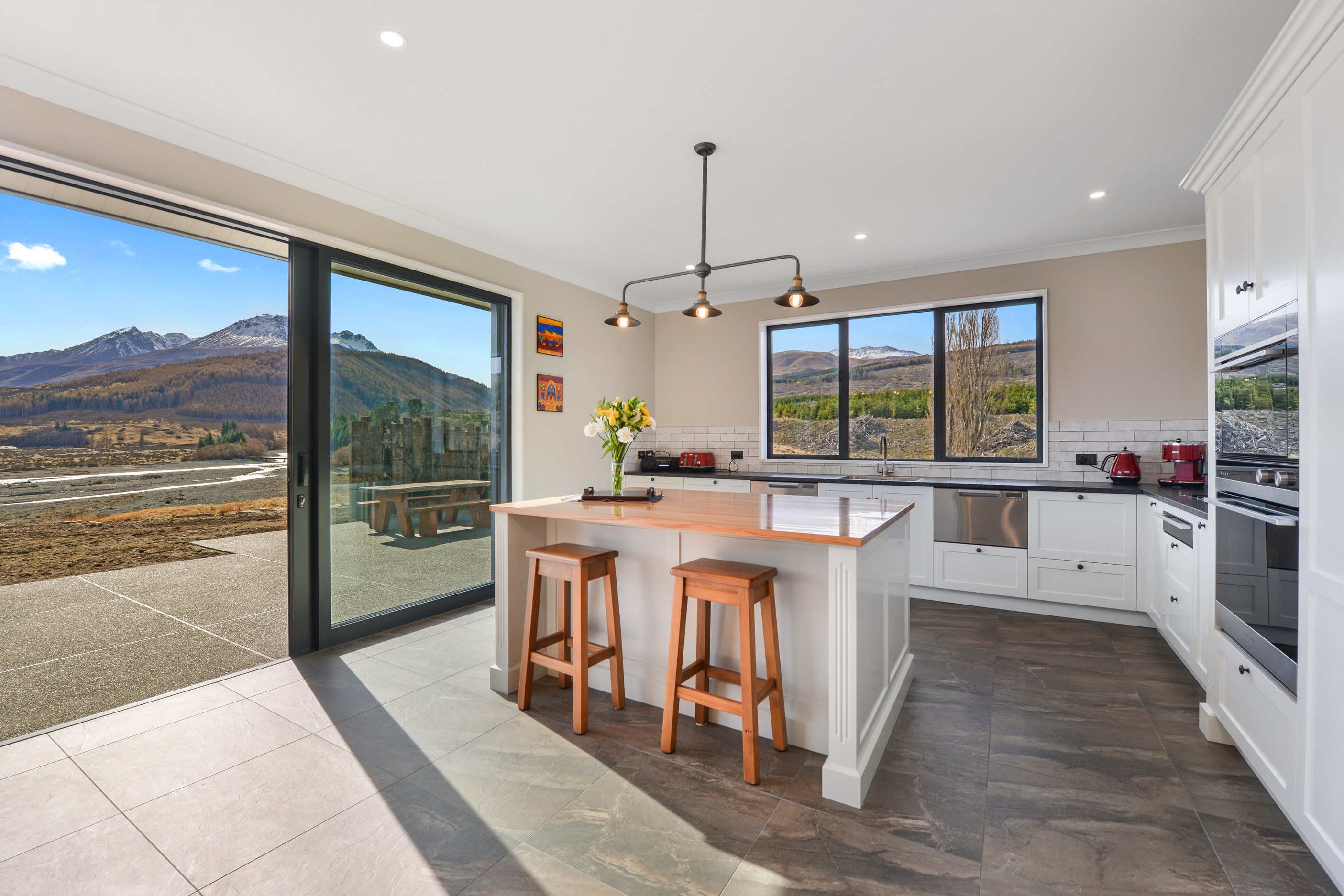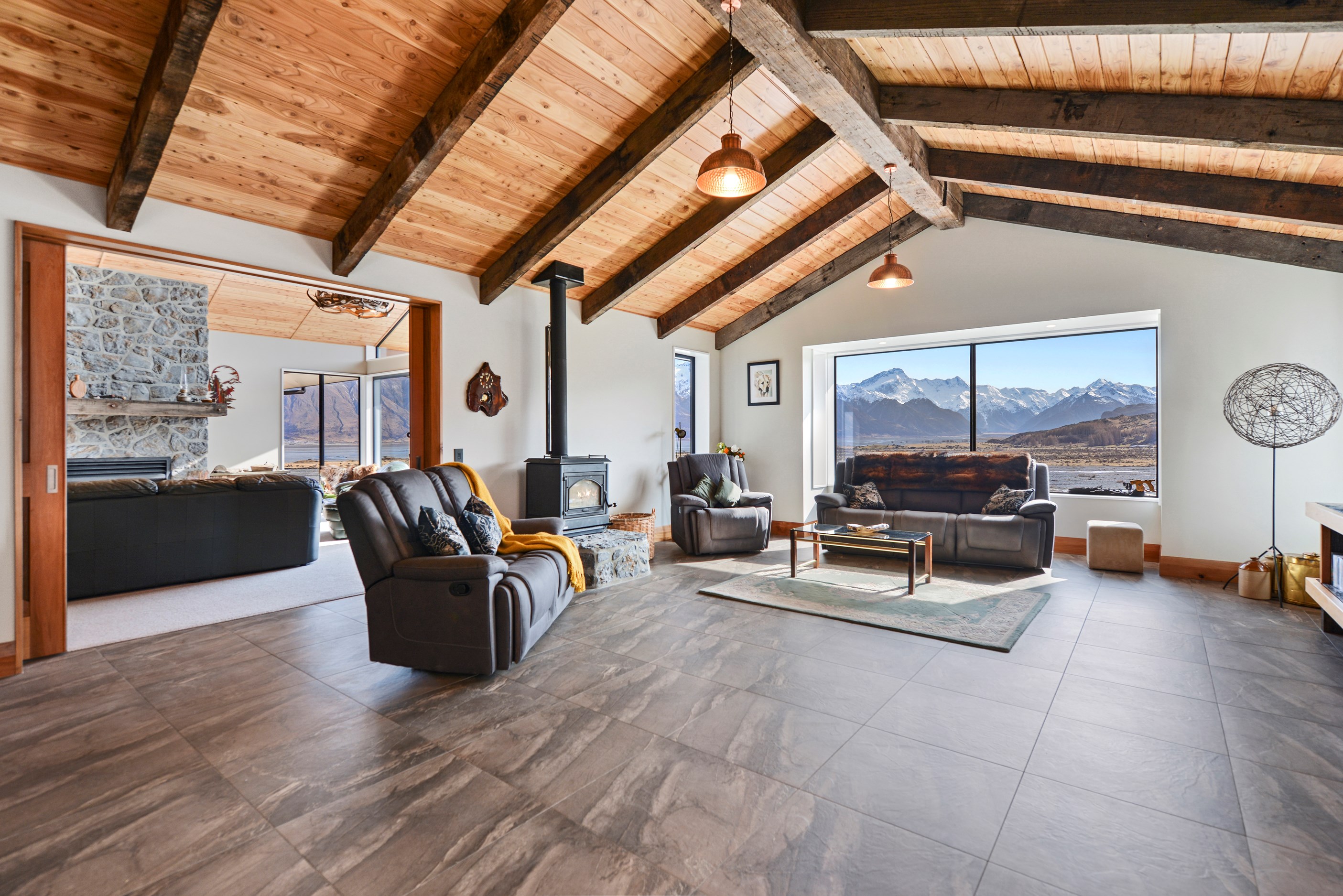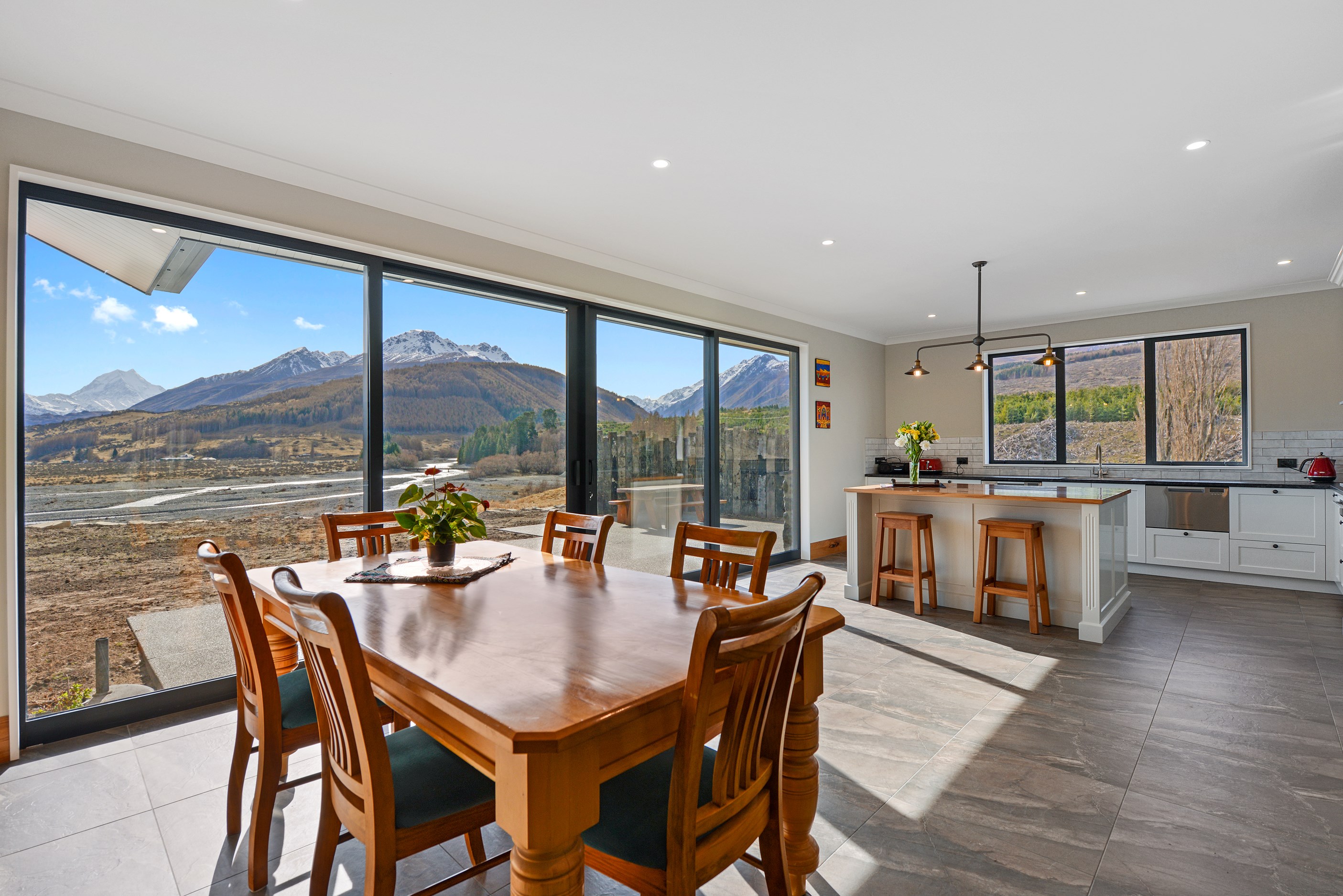 With breathtaking views of Aoraki, this high-country masterpiece utilises materials that resonate with its scenic environment. The exterior features stonework and cedar board-and-batten, mimicking the alpine terrain. Inside is just as exquisite. With five bedrooms and four bathrooms, the focal point of the home is the grand living area, complete with fireplace and striking stone mantelpiece.Here, floor-to-ceiling windows allow you to take in the glorious panorama while warming by the fire as sunlight streams in.