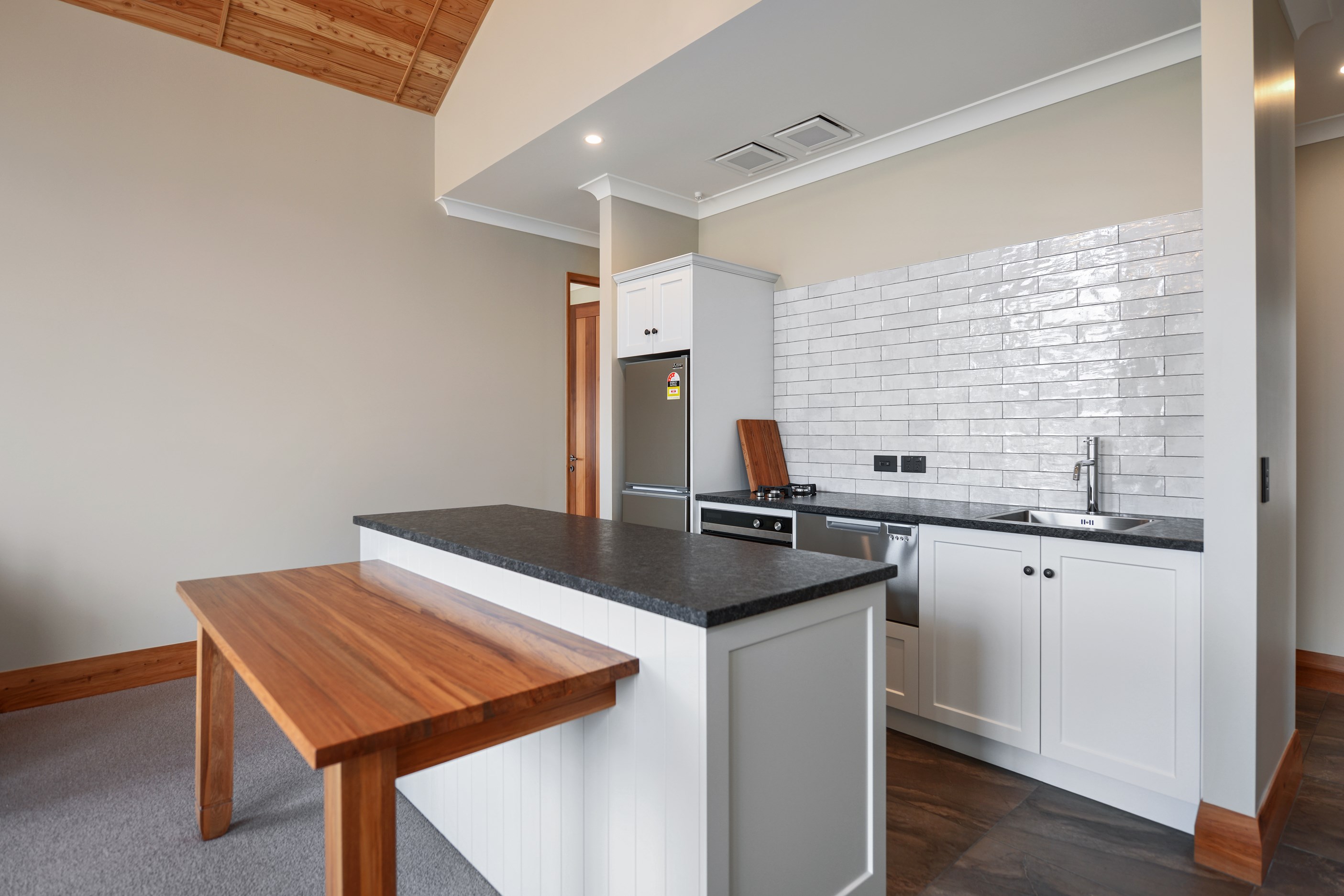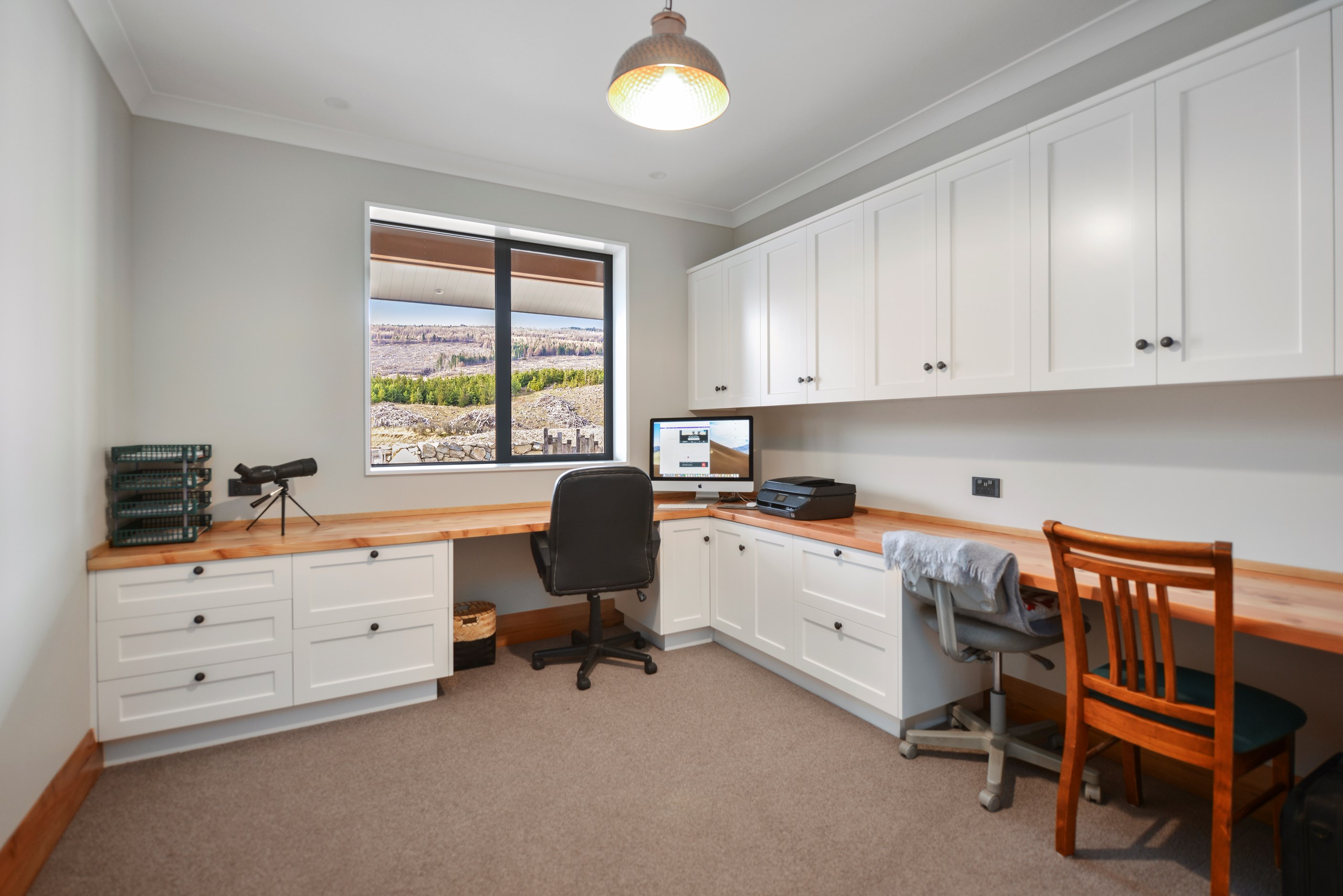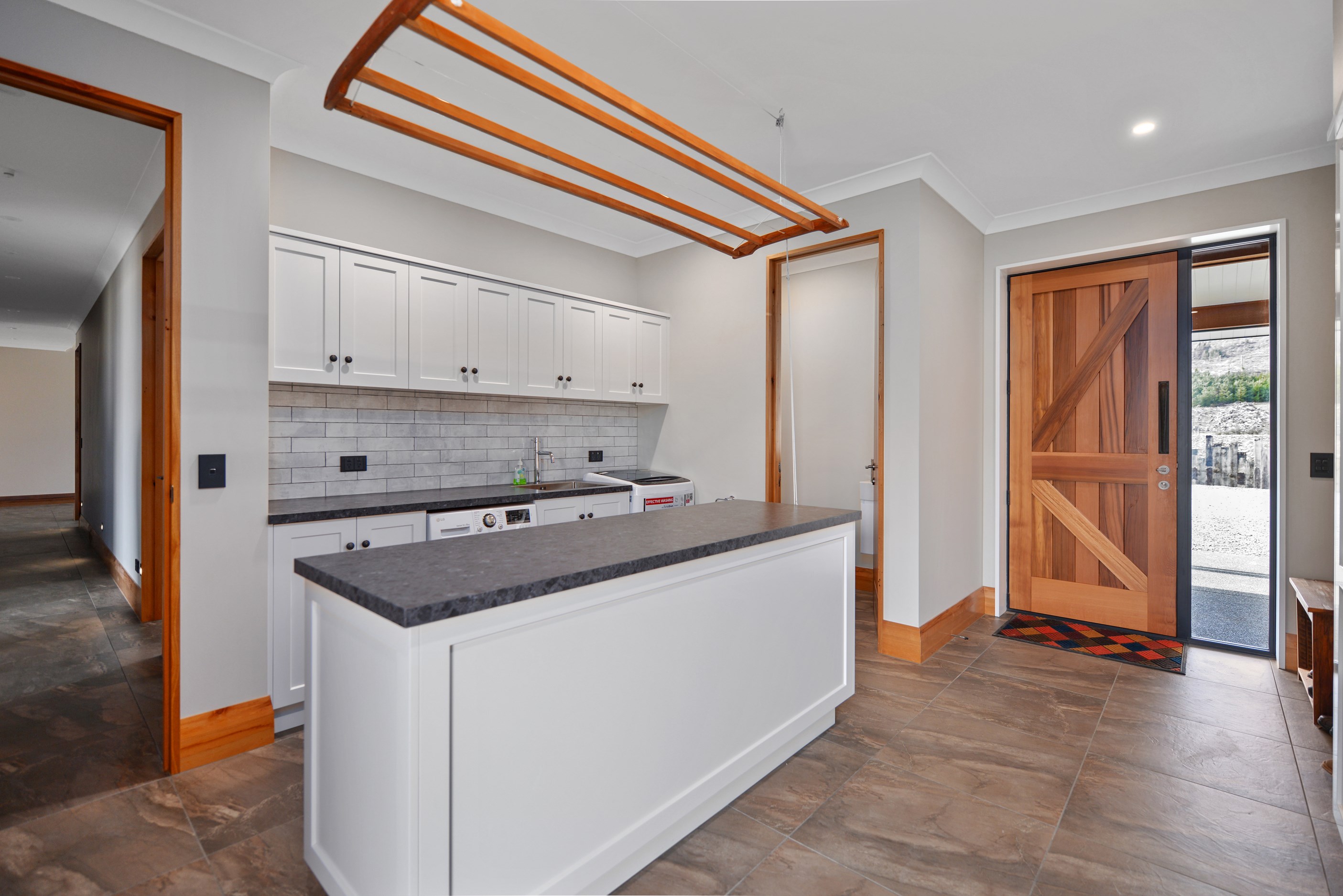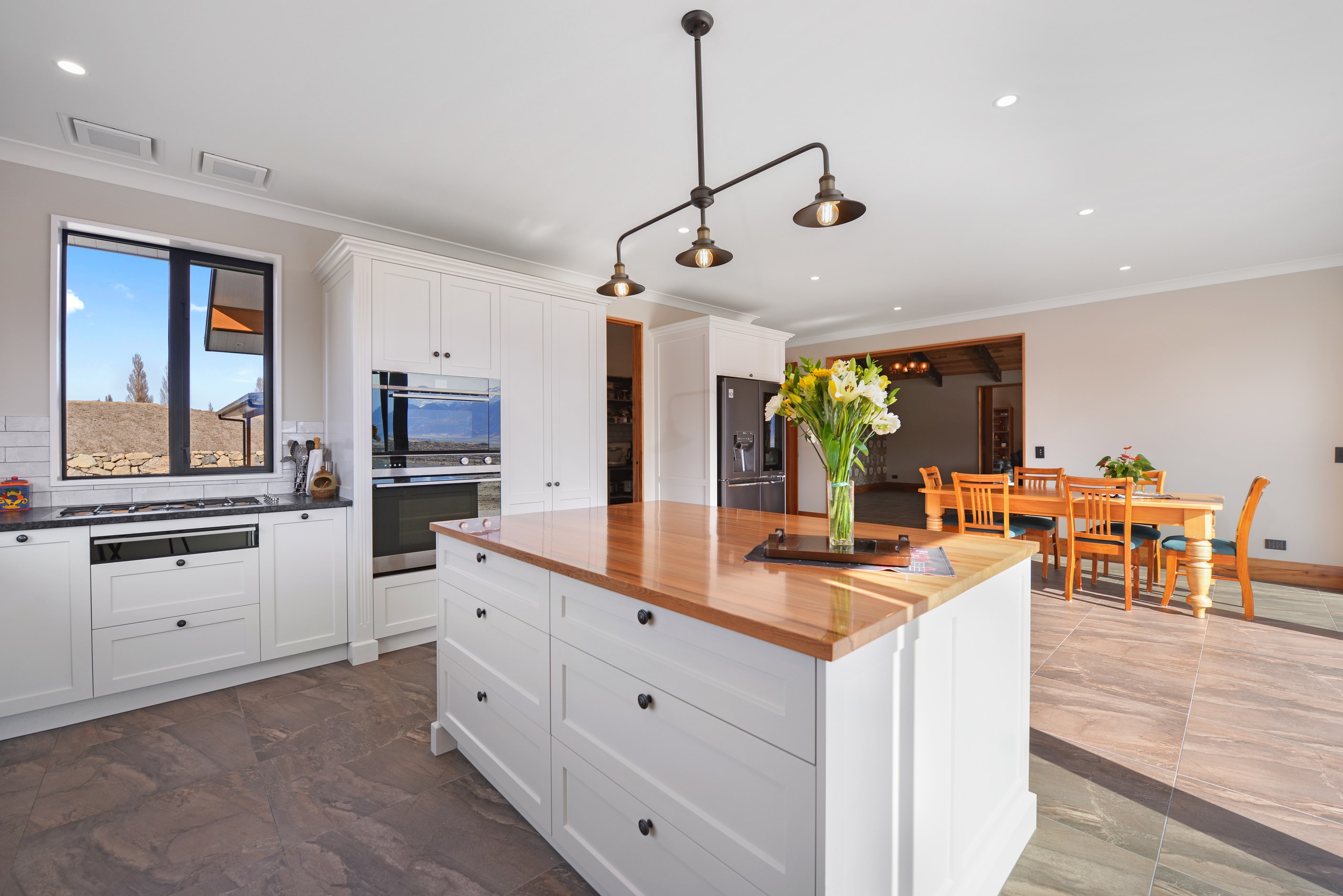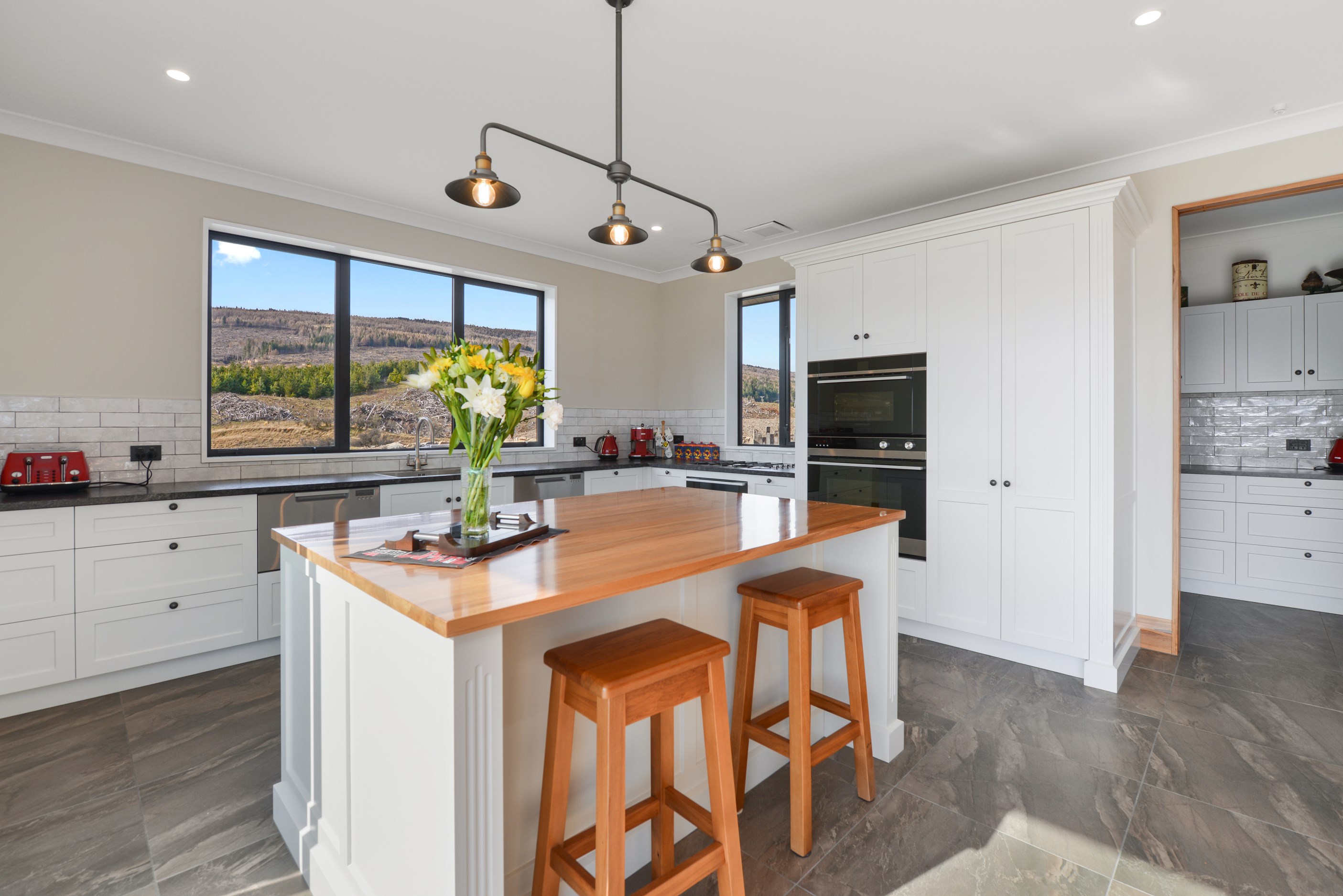 The wooden pitched ceiling and pendant light take this space to another level. Heritage-style cupboards, a stone benchtop and rimu island bench ensure the kitchen maintains a true high country feel. Timber elements are found throughout the interior, providing unity and touching on the rugged nature of the home’s location. High-end fixtures ensure this new build is contemporary, efficient and future-proof. Grand and majestic, just like its surroundings, this beautiful home truly pays homage to its setting.