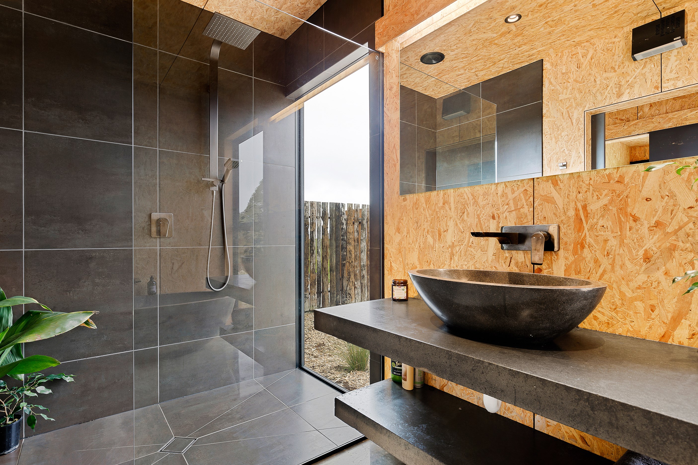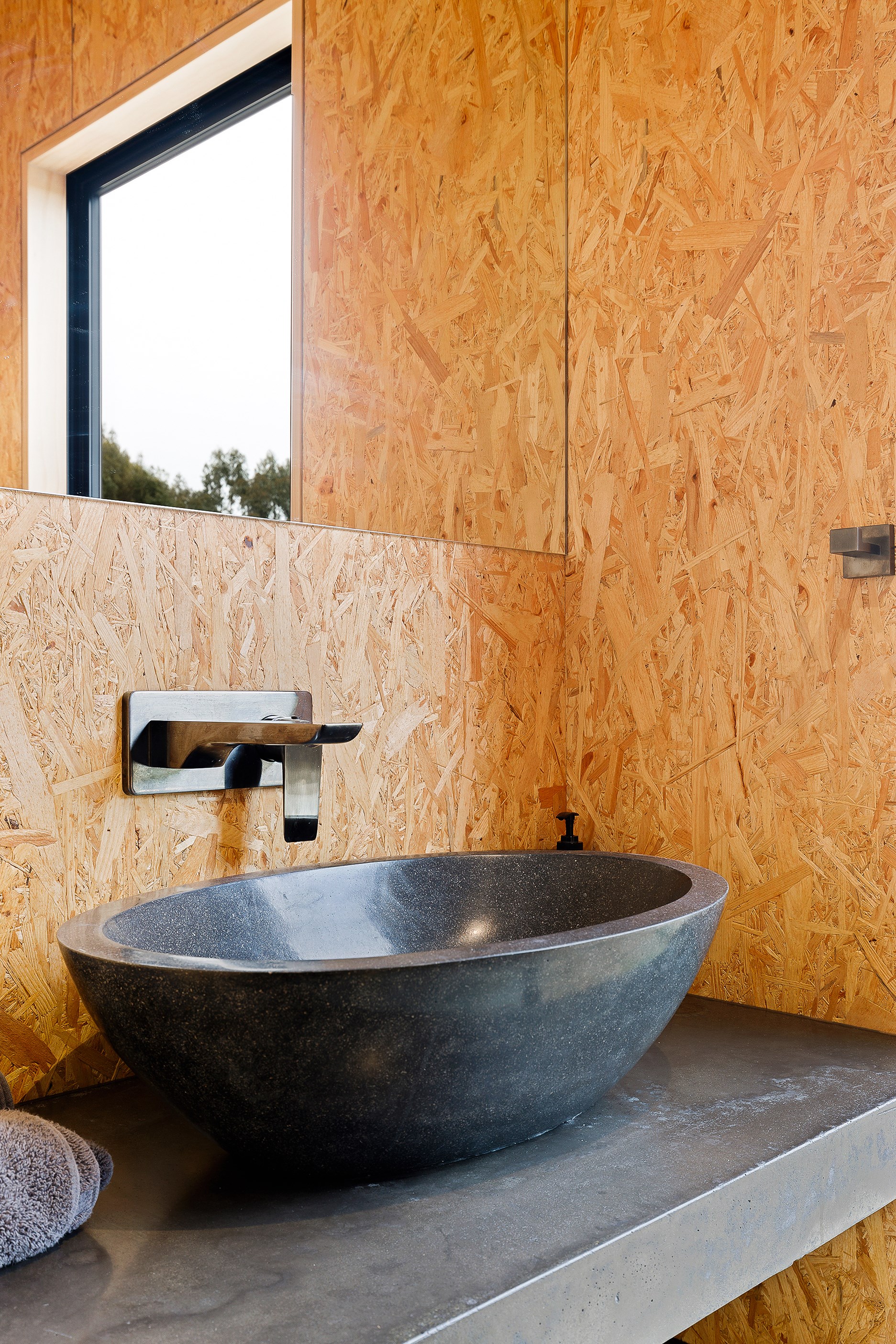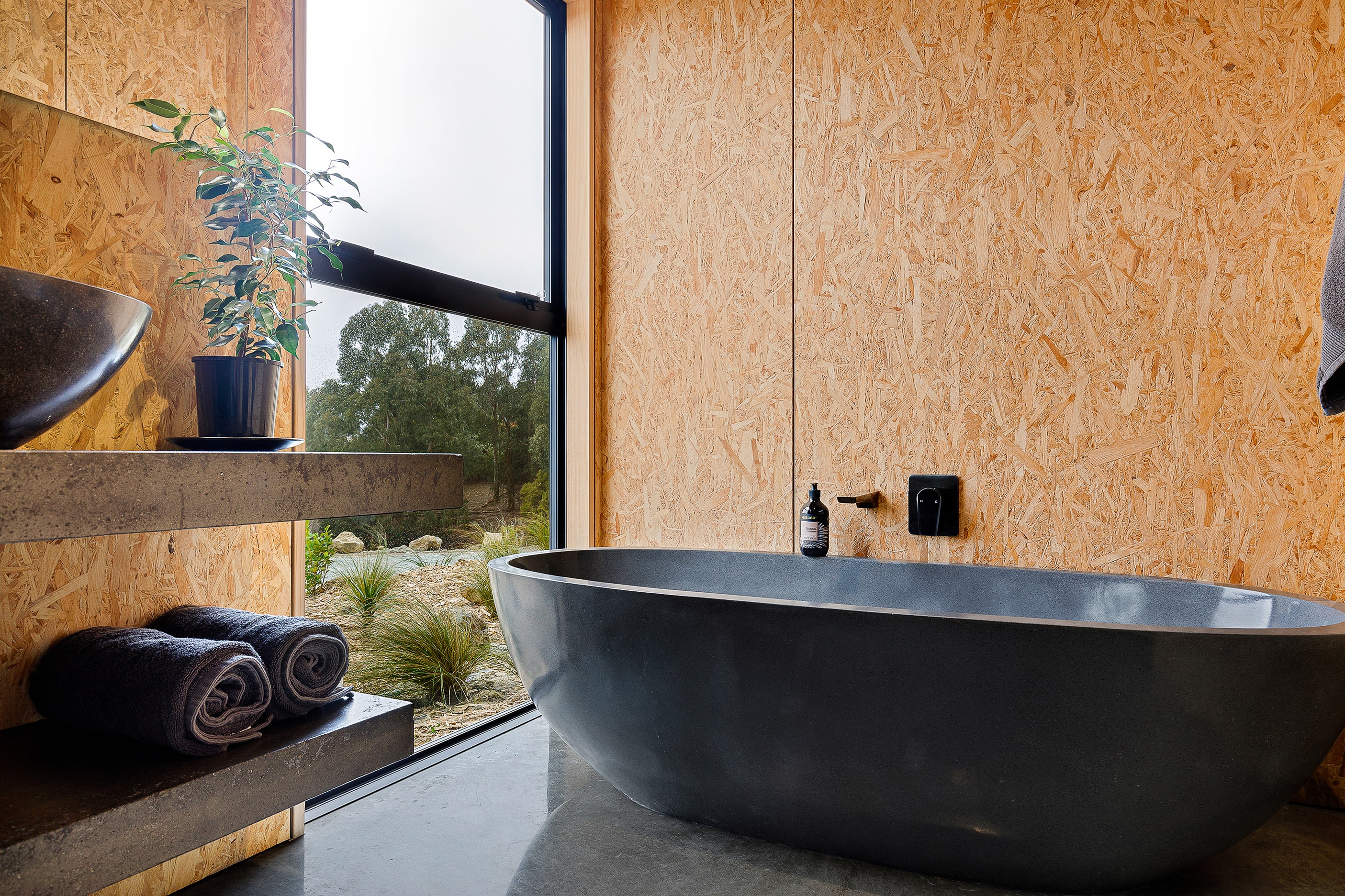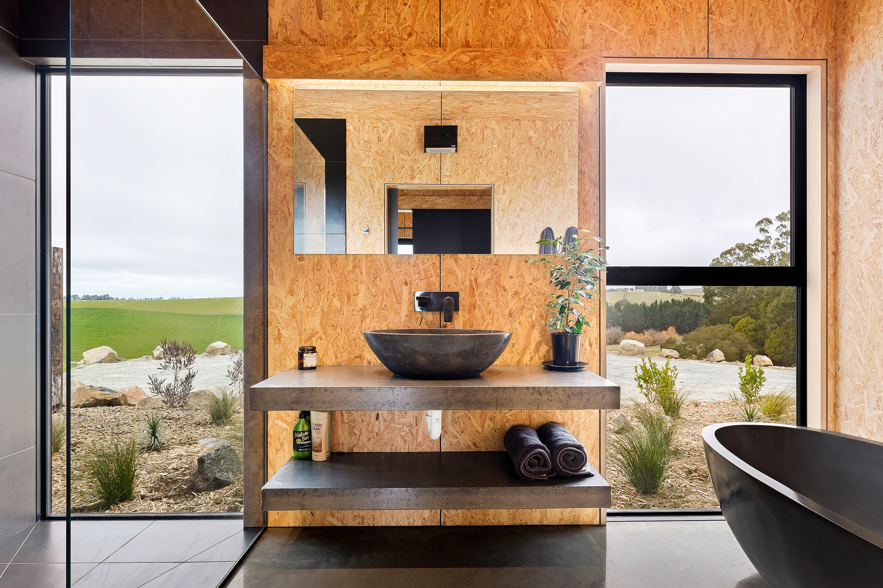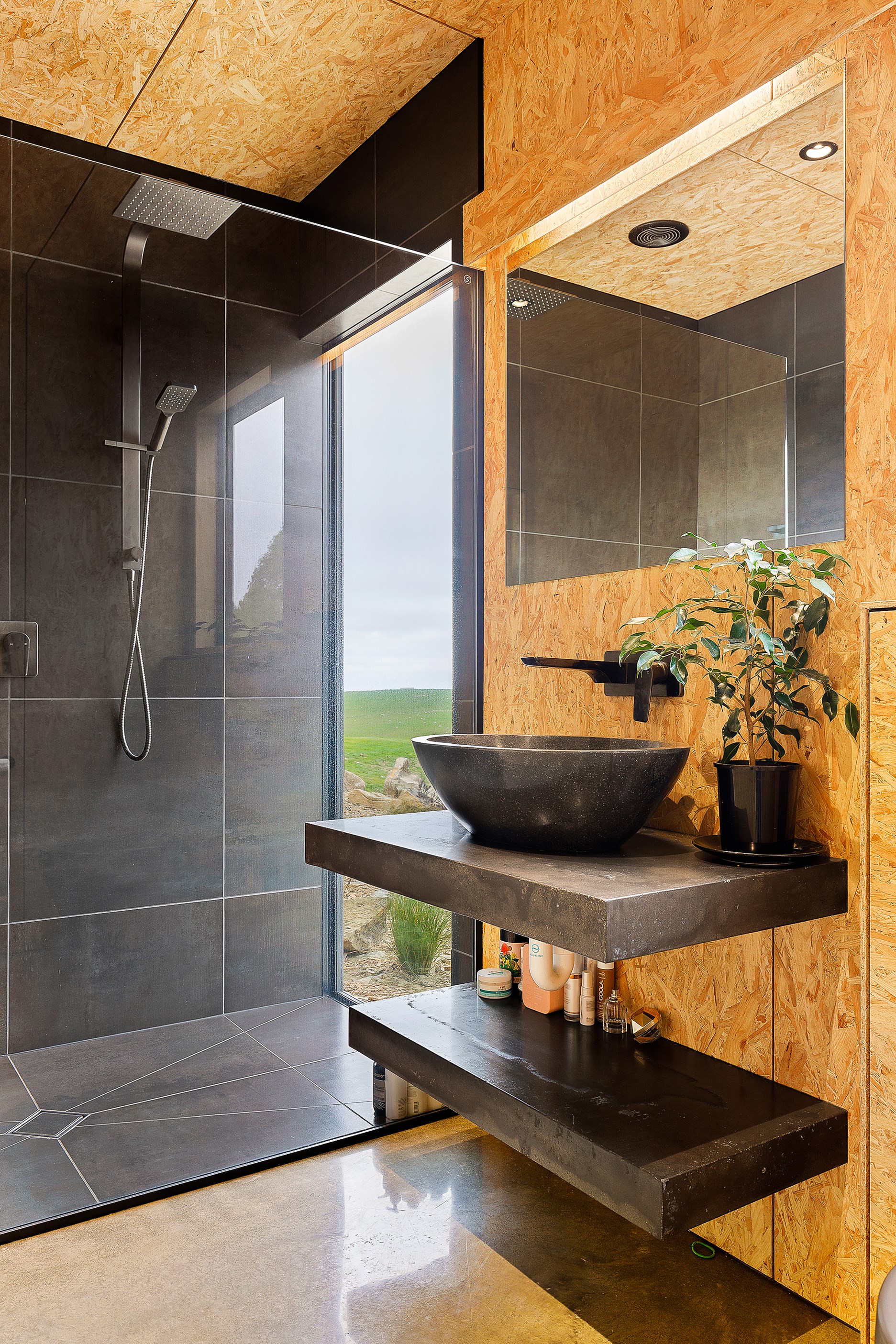 With its gabled rectangular form and black iron cladding, this clever new build makes a striking statement yet complements its natural environment. Internally, the house has been lined in chipboard with negative detailing. Polished concrete floors not only look stylish but absorb the sunlight that floods in, keeping the north-facing home warm. The bathroom also features chipboard and two windows to capture the outlook. One of these is positioned at the end of the shower to bring the rural views inside.