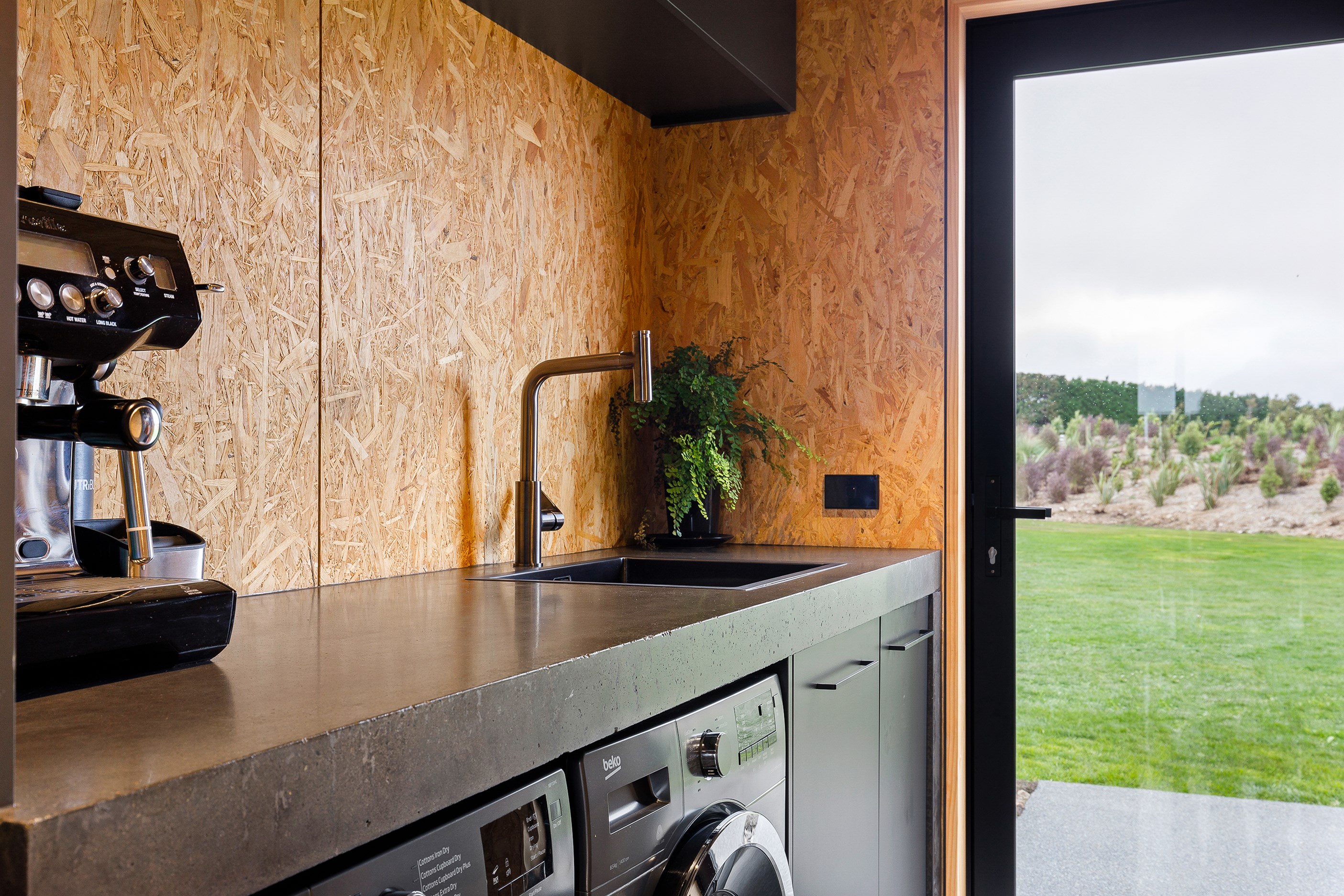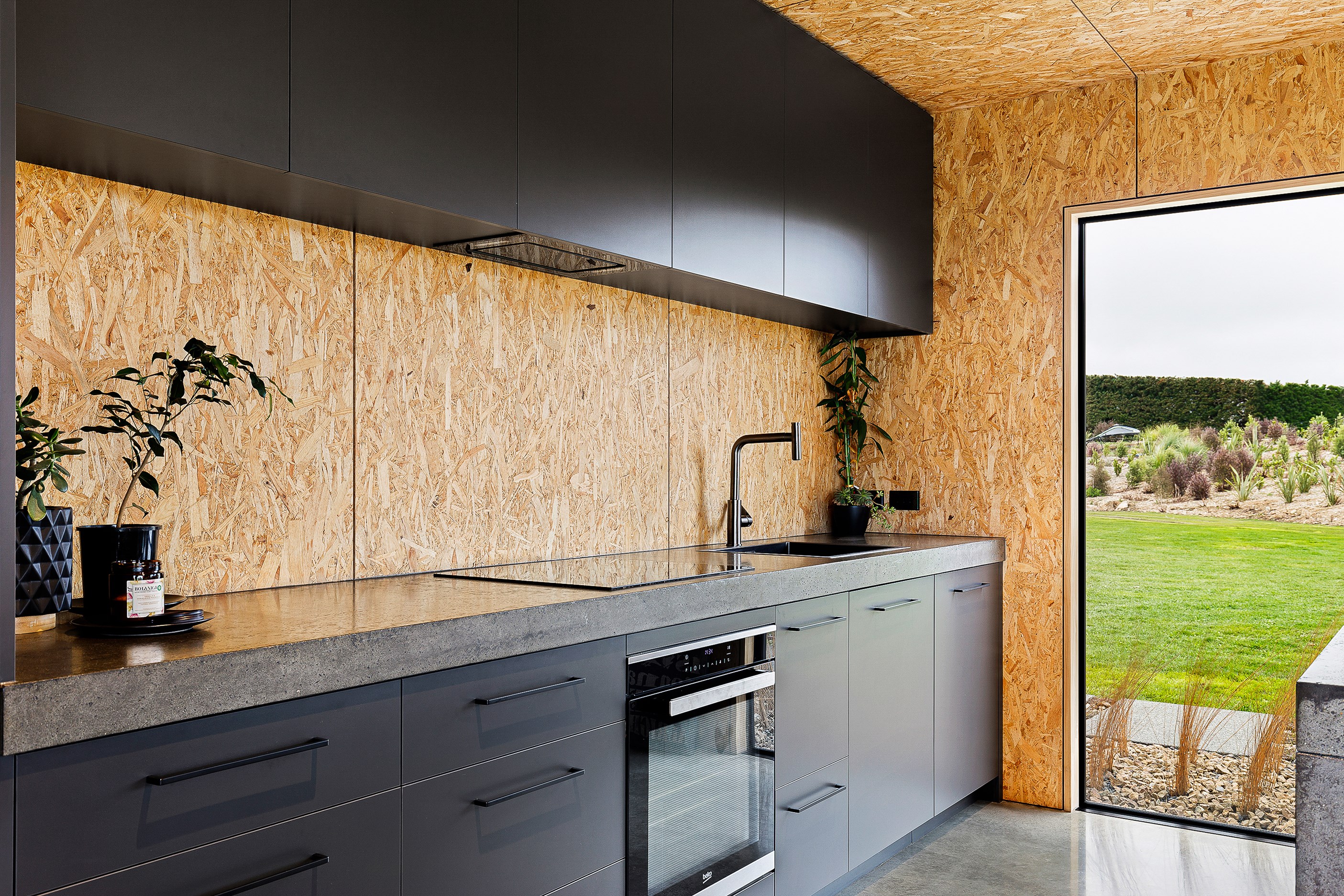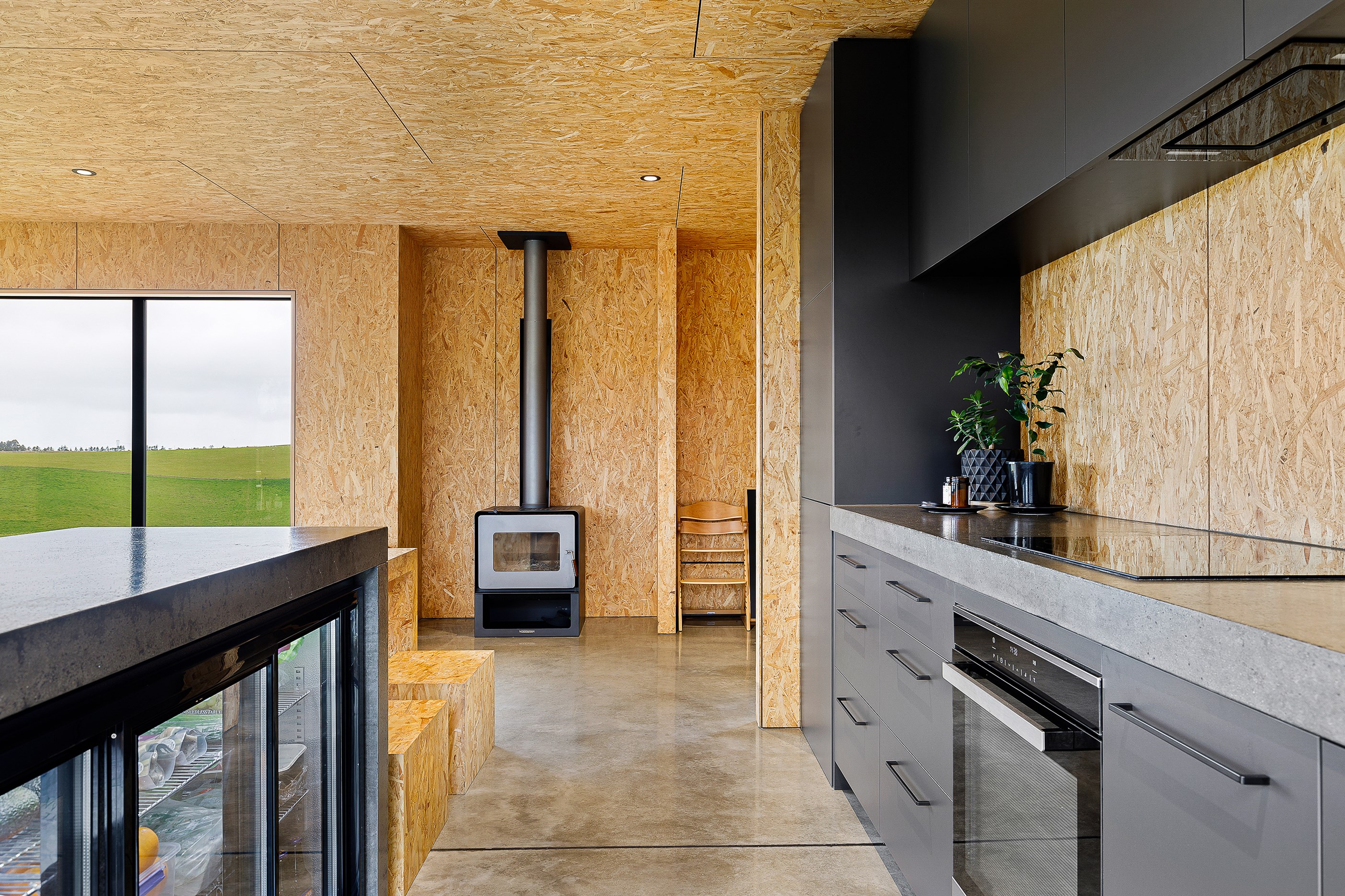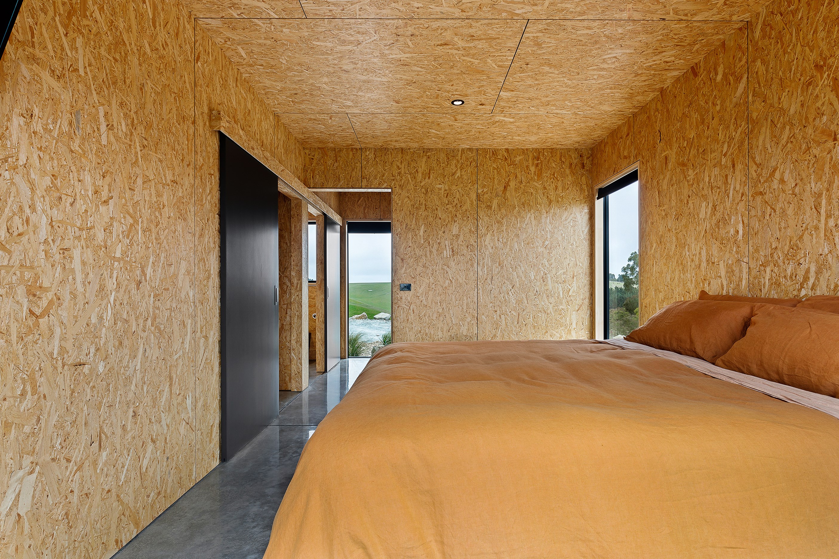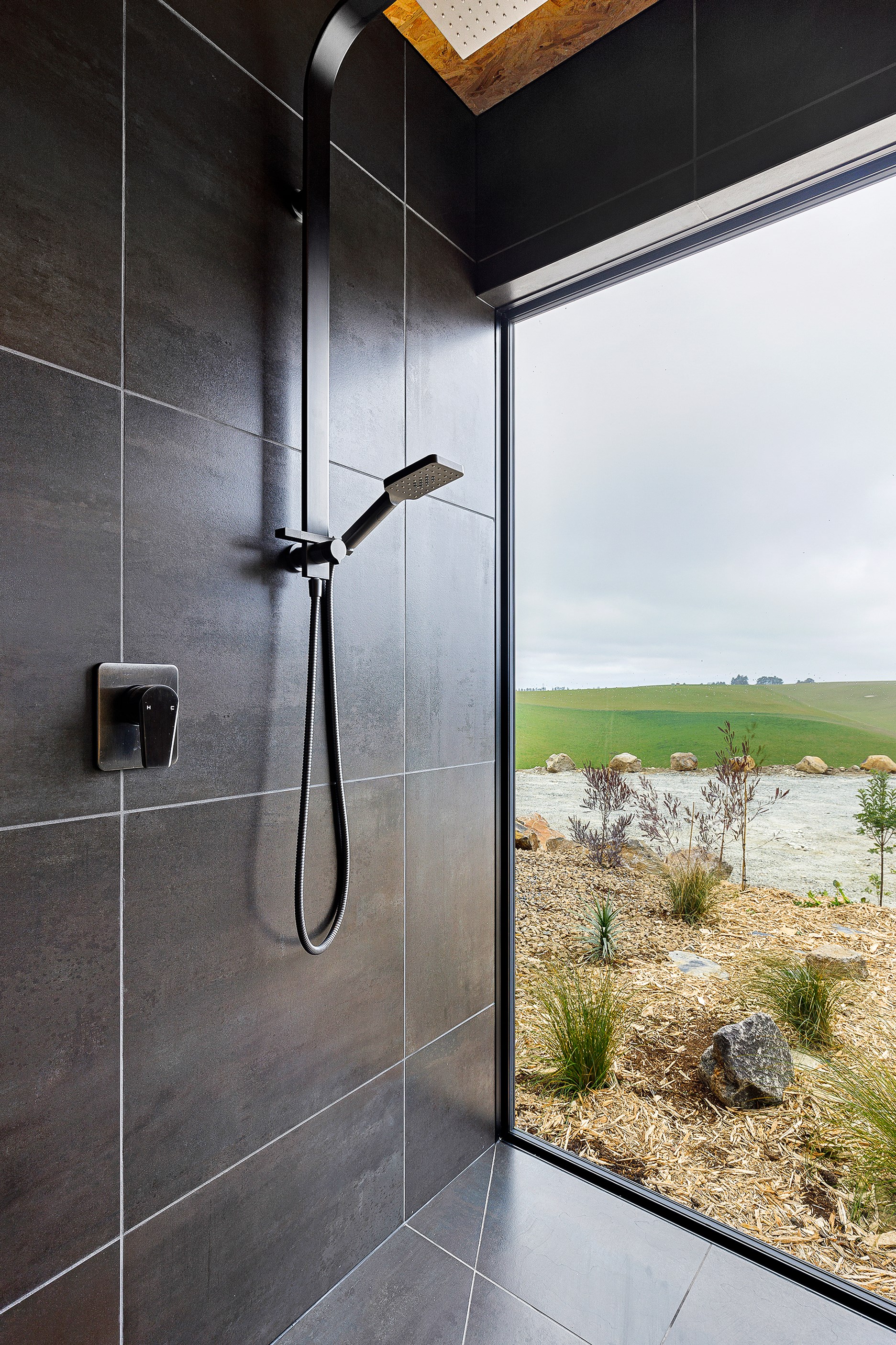 With its gabled rectangular form and black iron cladding, this clever new build makes a striking statement yet complements its natural environment. Internally, the house has been lined in chipboard with negative detailing. Polished concrete floors not only look stylish but absorb the sunlight that floods in, keeping the north-facing home warm. The bathroom also features chipboard and two windows to capture the outlook. One of these is positioned at the end of the shower to bring the rural views inside.