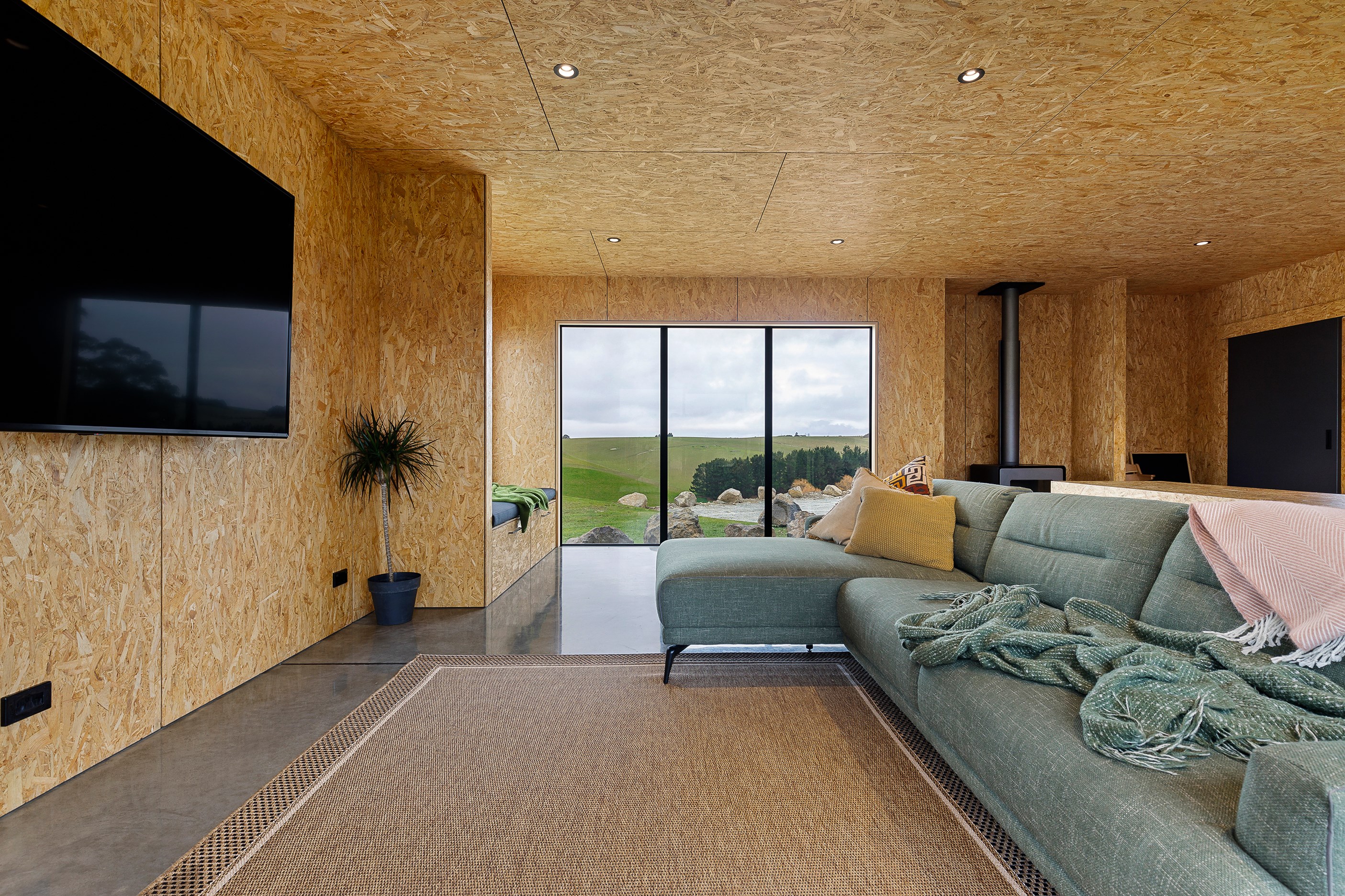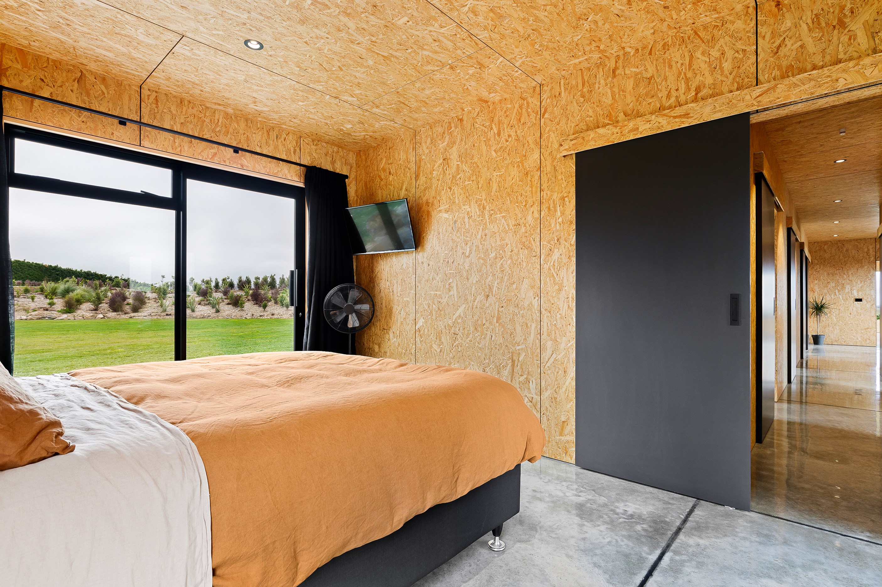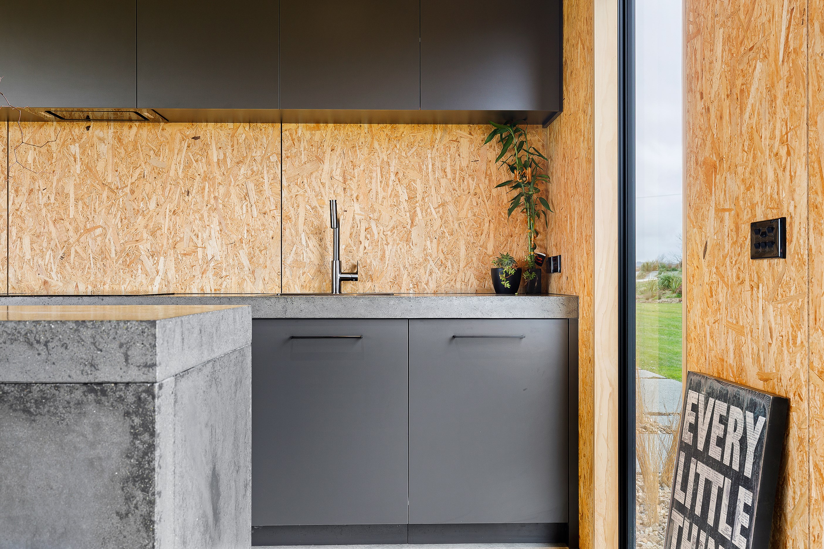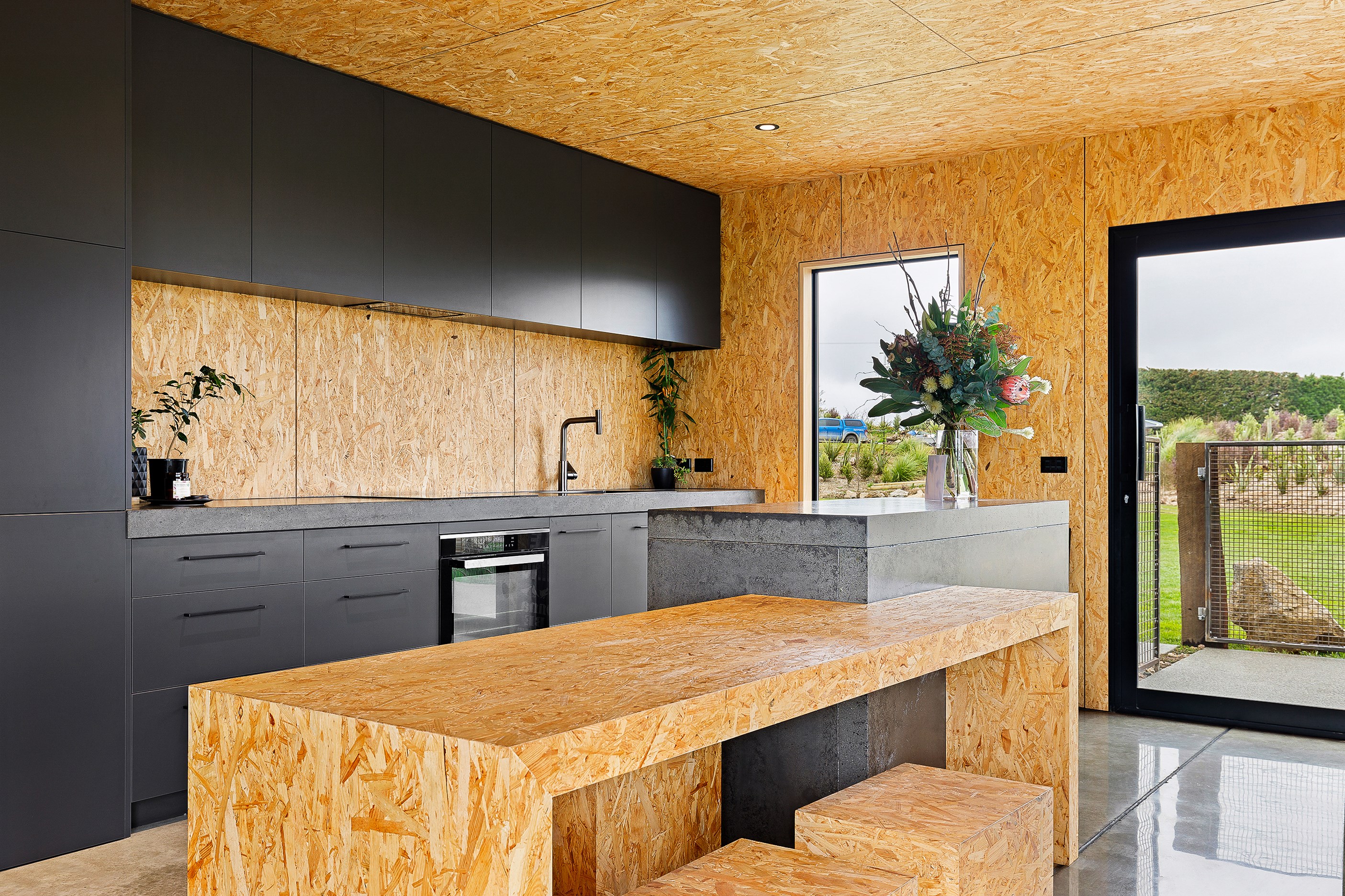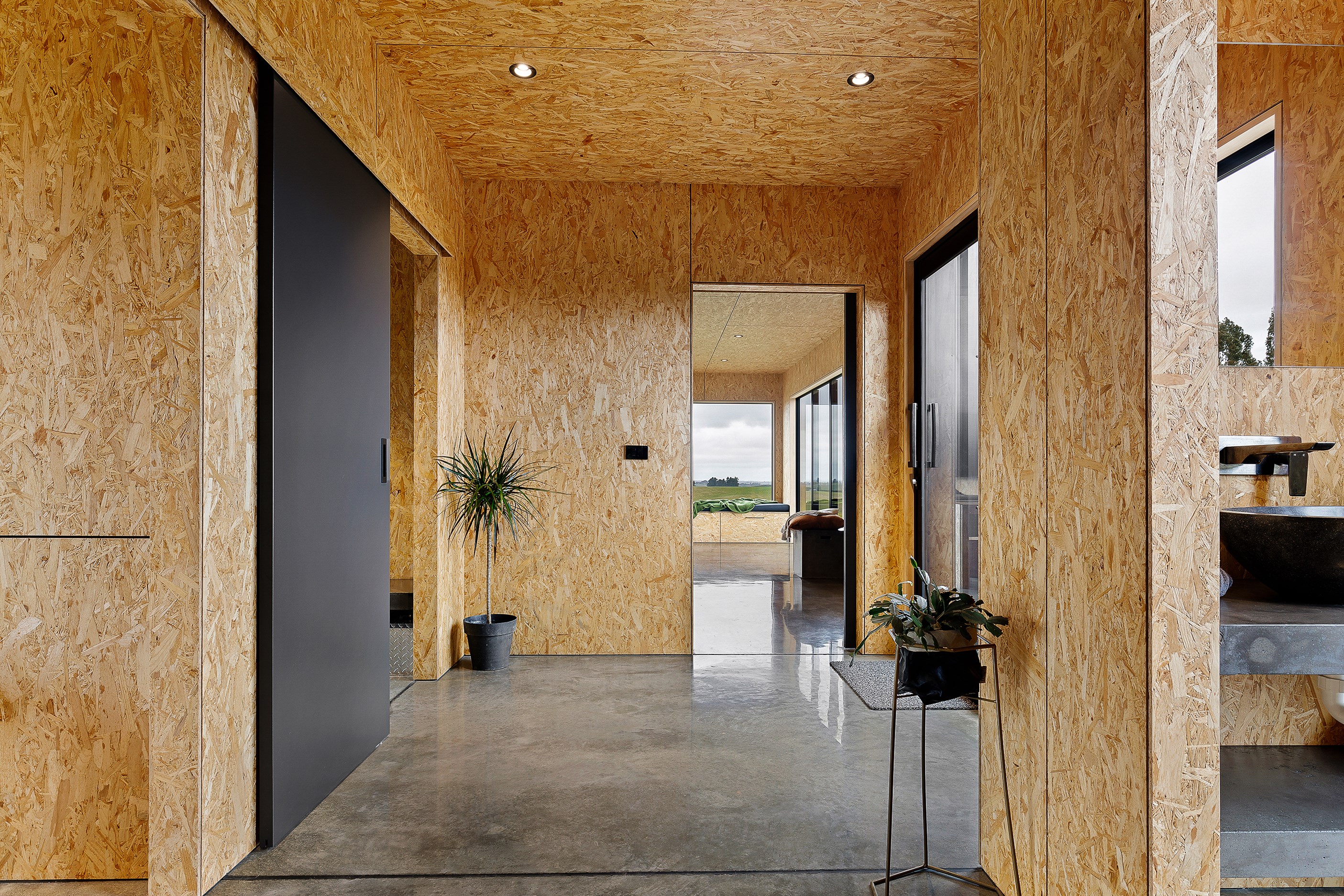 With its gabled rectangular form and black iron cladding, this clever new build makes a striking statement yet complements its natural environment. Internally, the house has been lined in chipboard with negative detailing. Polished concrete floors not only look stylish but absorb the sunlight that floods in, keeping the north-facing home warm. The bathroom also features chipboard and two windows to capture the outlook. One of these is positioned at the end of the shower to bring the rural views inside.