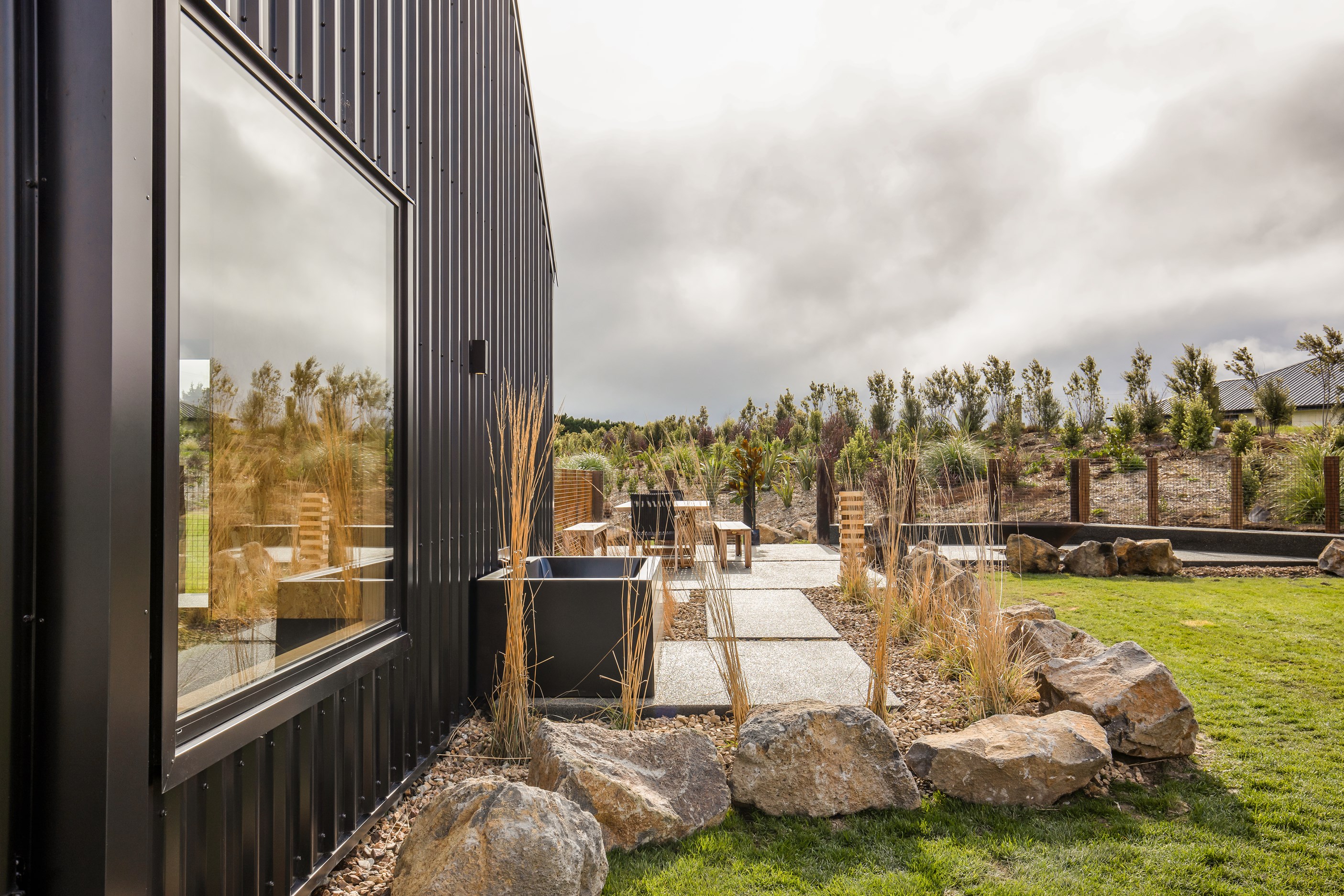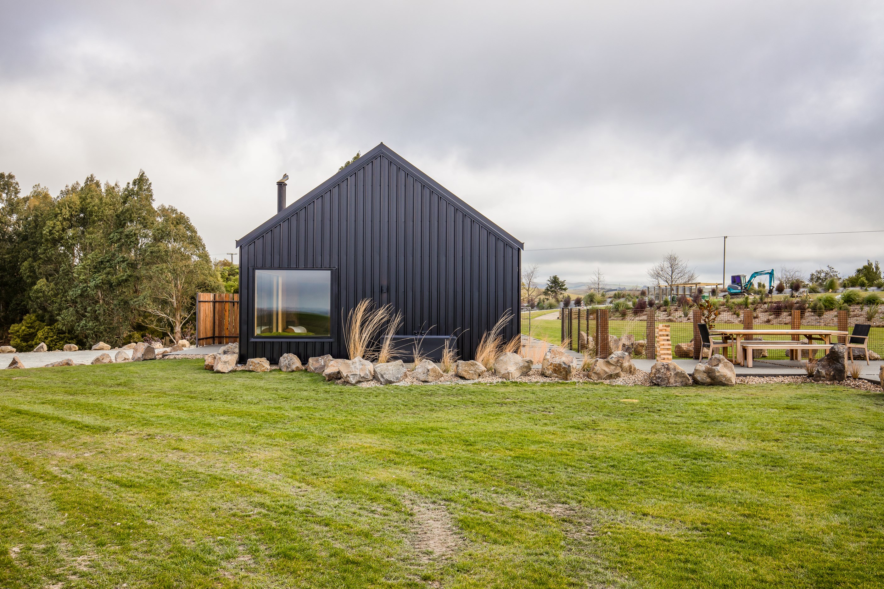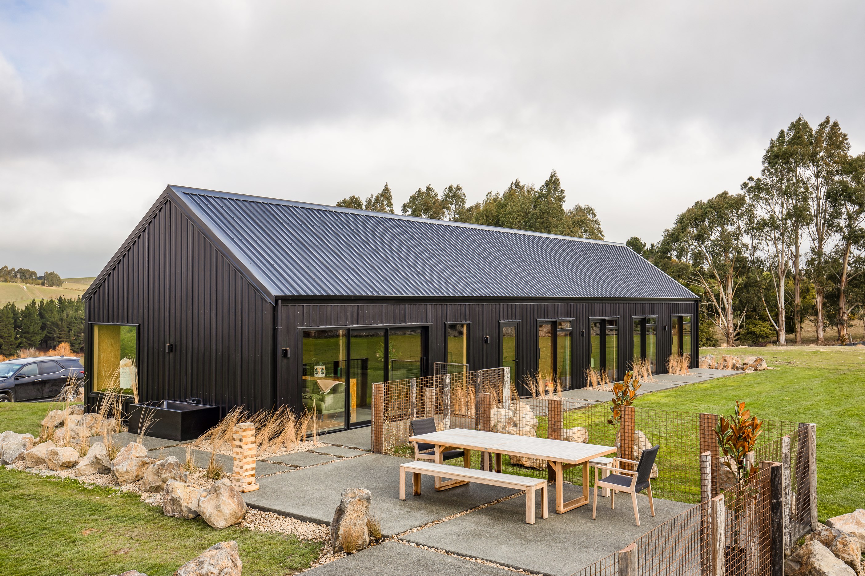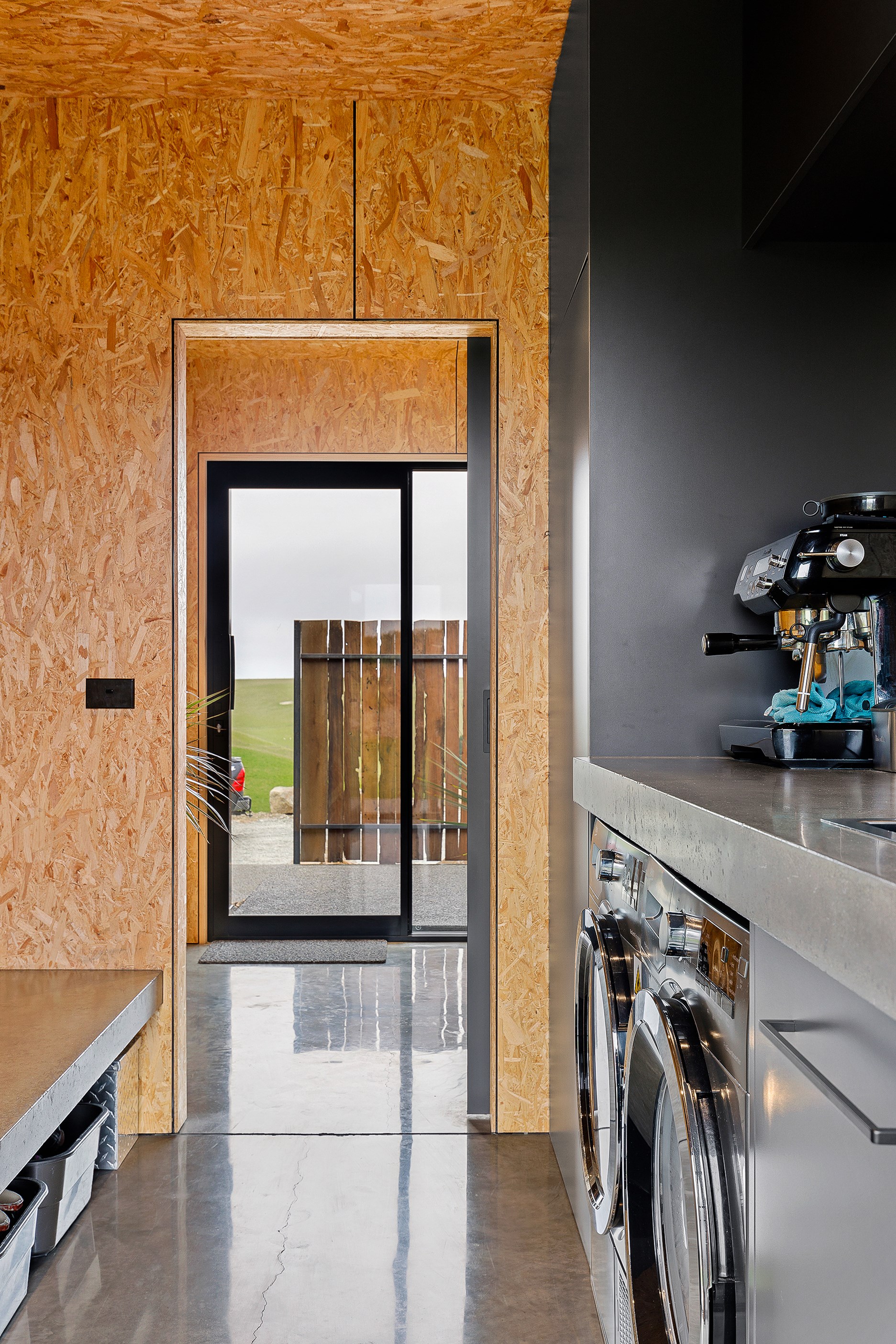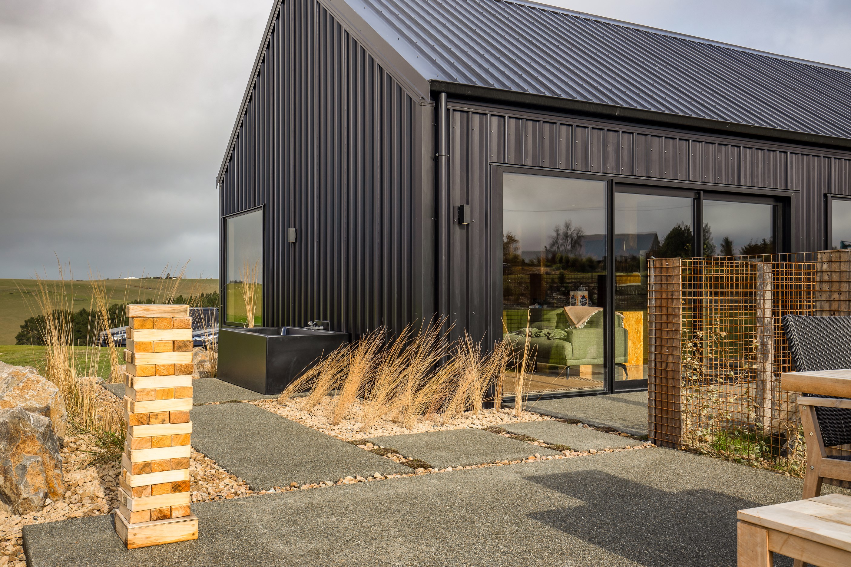 With its gabled rectangular form and black iron cladding, this clever new build makes a striking statement yet complements its natural environment. Internally, the house has been lined in chipboard with negative detailing. Polished concrete floors not only look stylish but absorb the sunlight that floods in, keeping the north-facing home warm. The bathroom also features chipboard and two windows to capture the outlook. One of these is positioned at the end of the shower to bring the rural views inside.