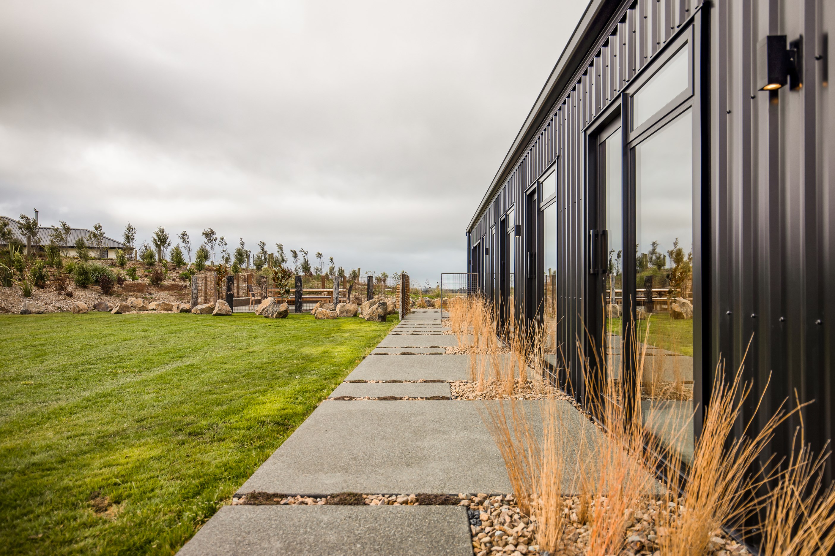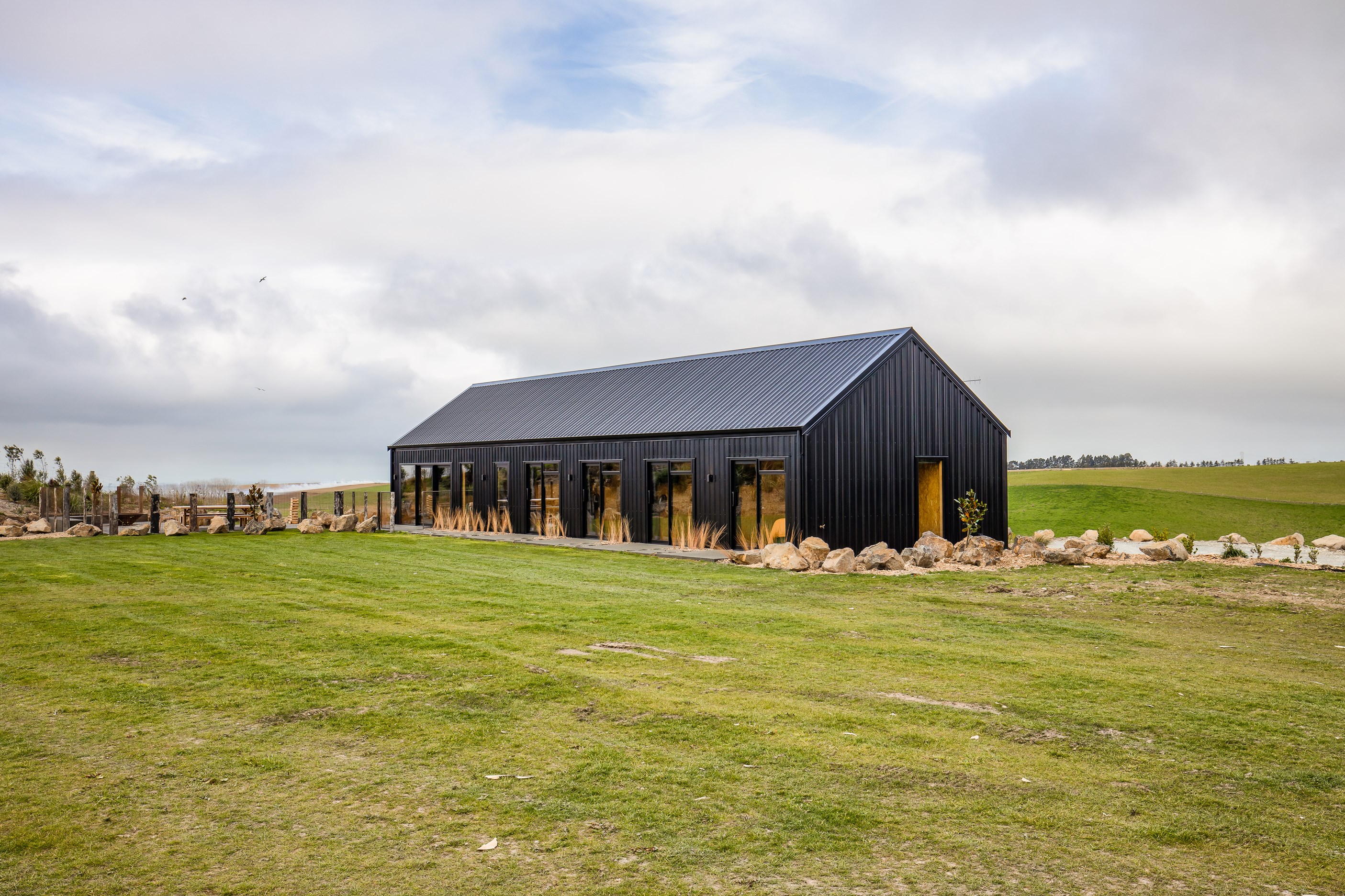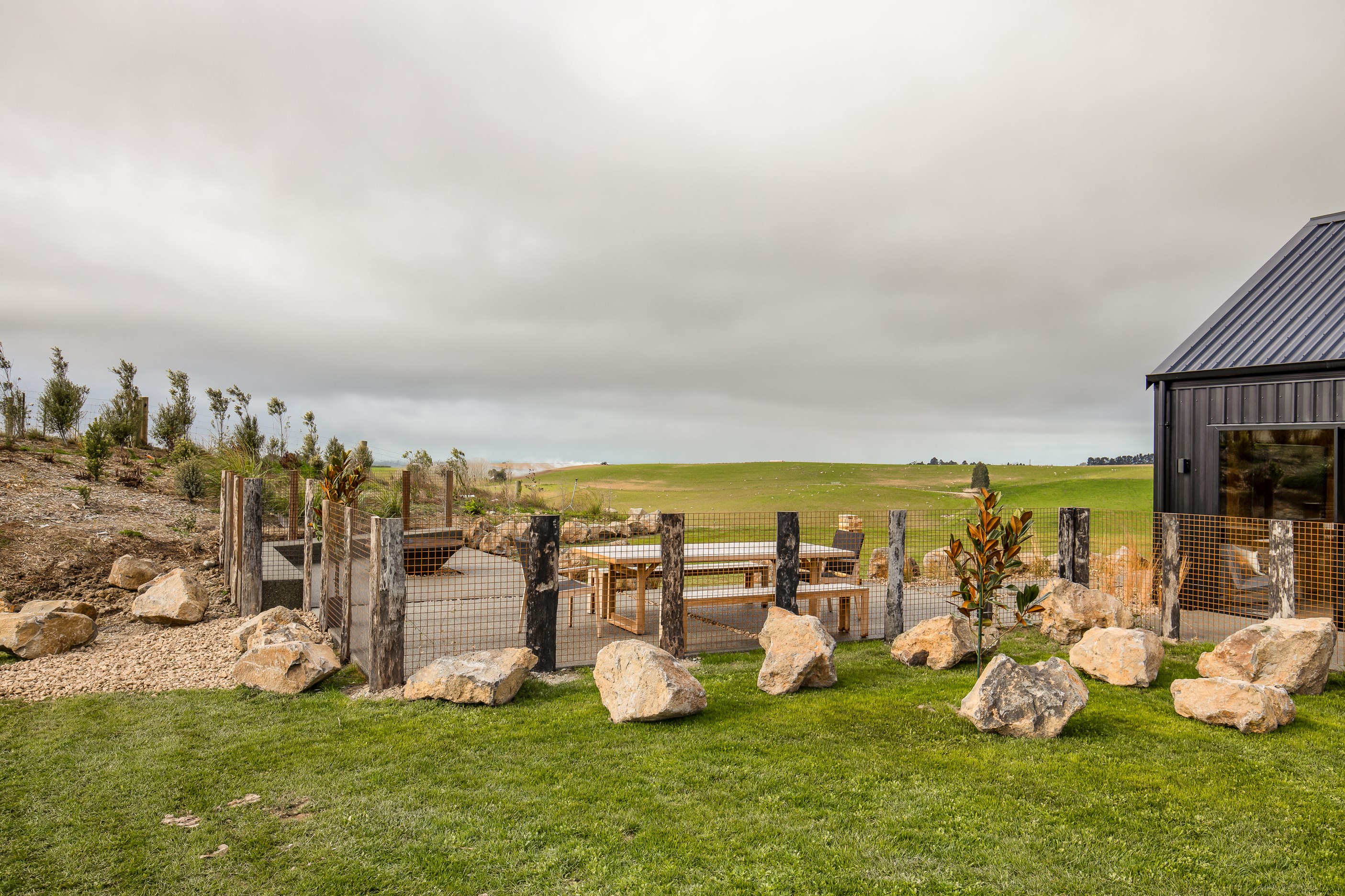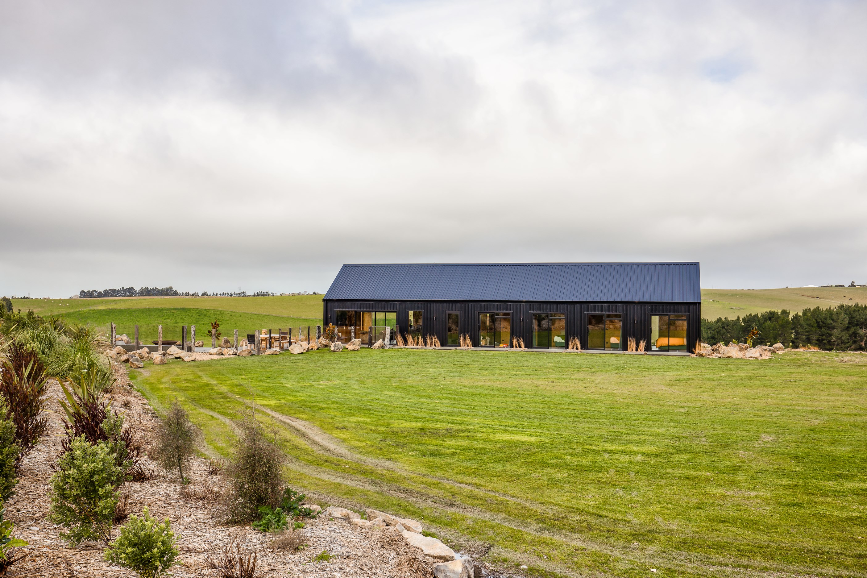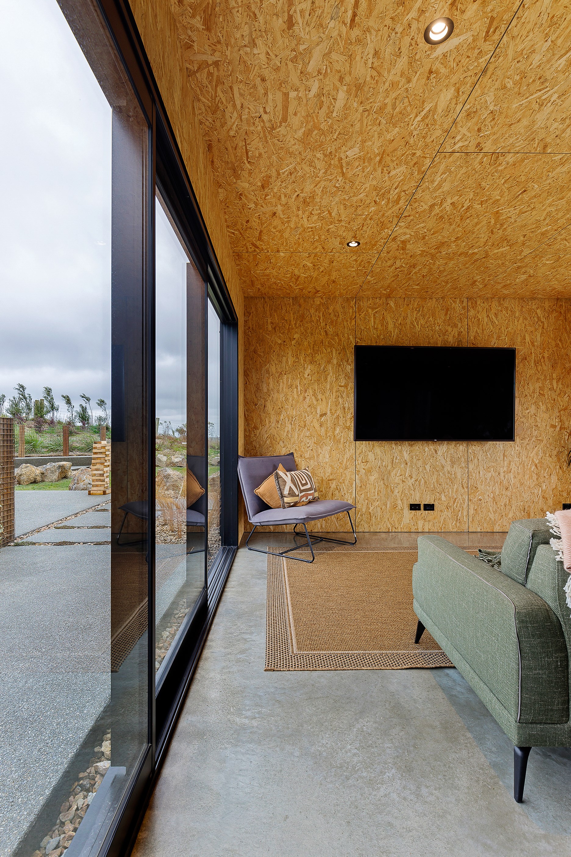 With its gabled rectangular form and black iron cladding, this clever new build makes a striking statement yet complements its natural environment. Internally, the house has been lined in chipboard with negative detailing. Polished concrete floors not only look stylish but absorb the sunlight that floods in, keeping the north-facing home warm. The bathroom also features chipboard and two windows to capture the outlook. One of these is positioned at the end of the shower to bring the rural views inside.