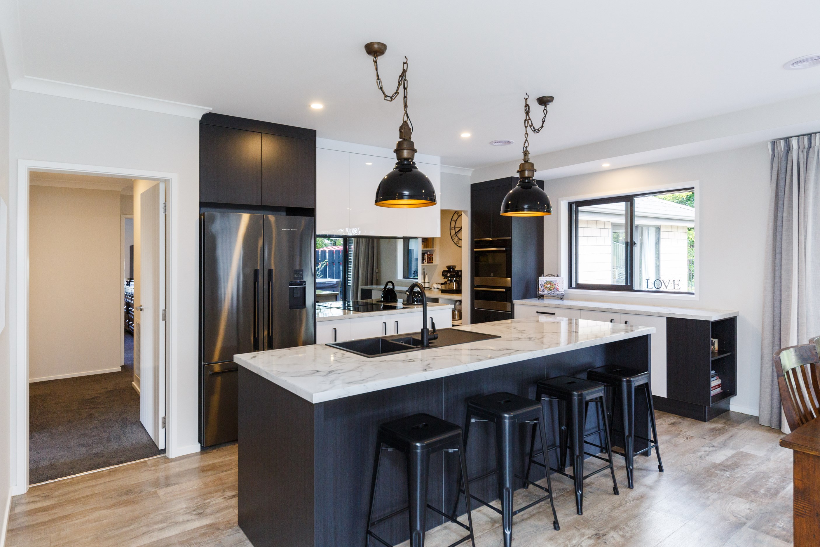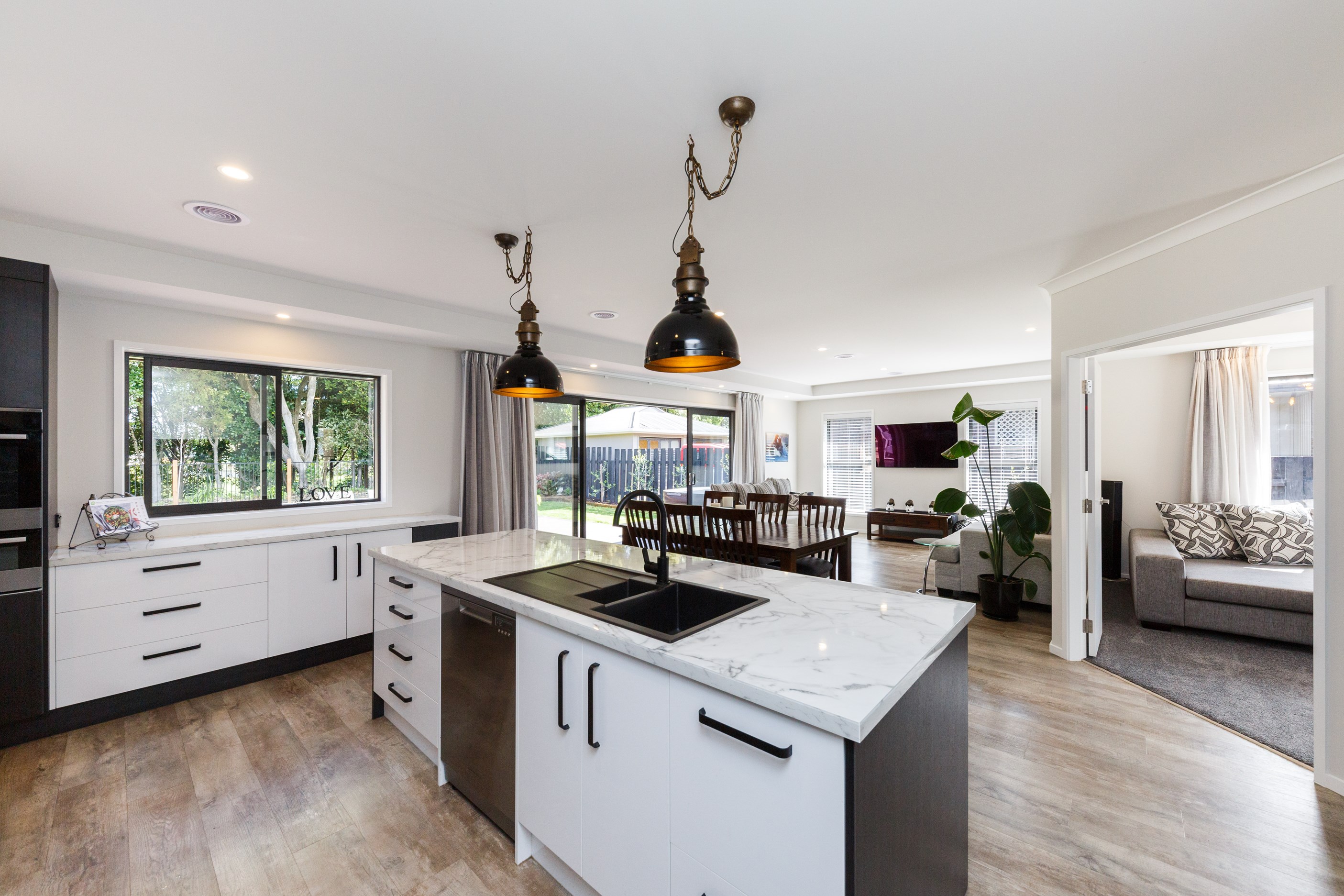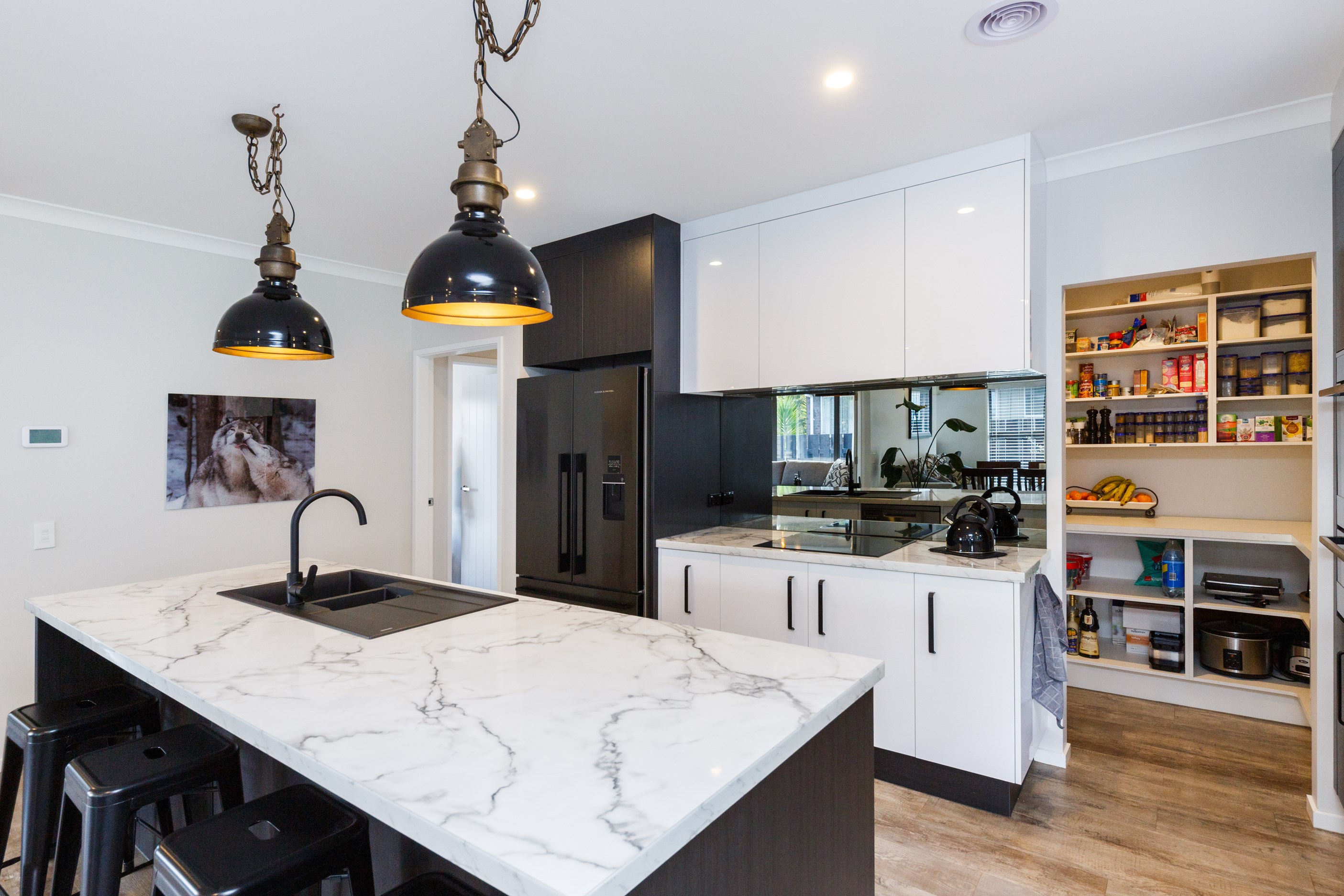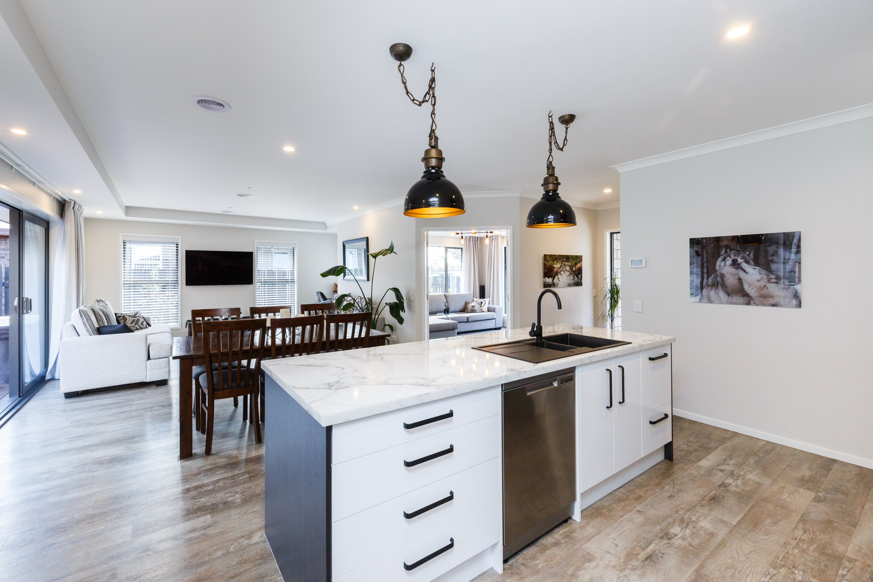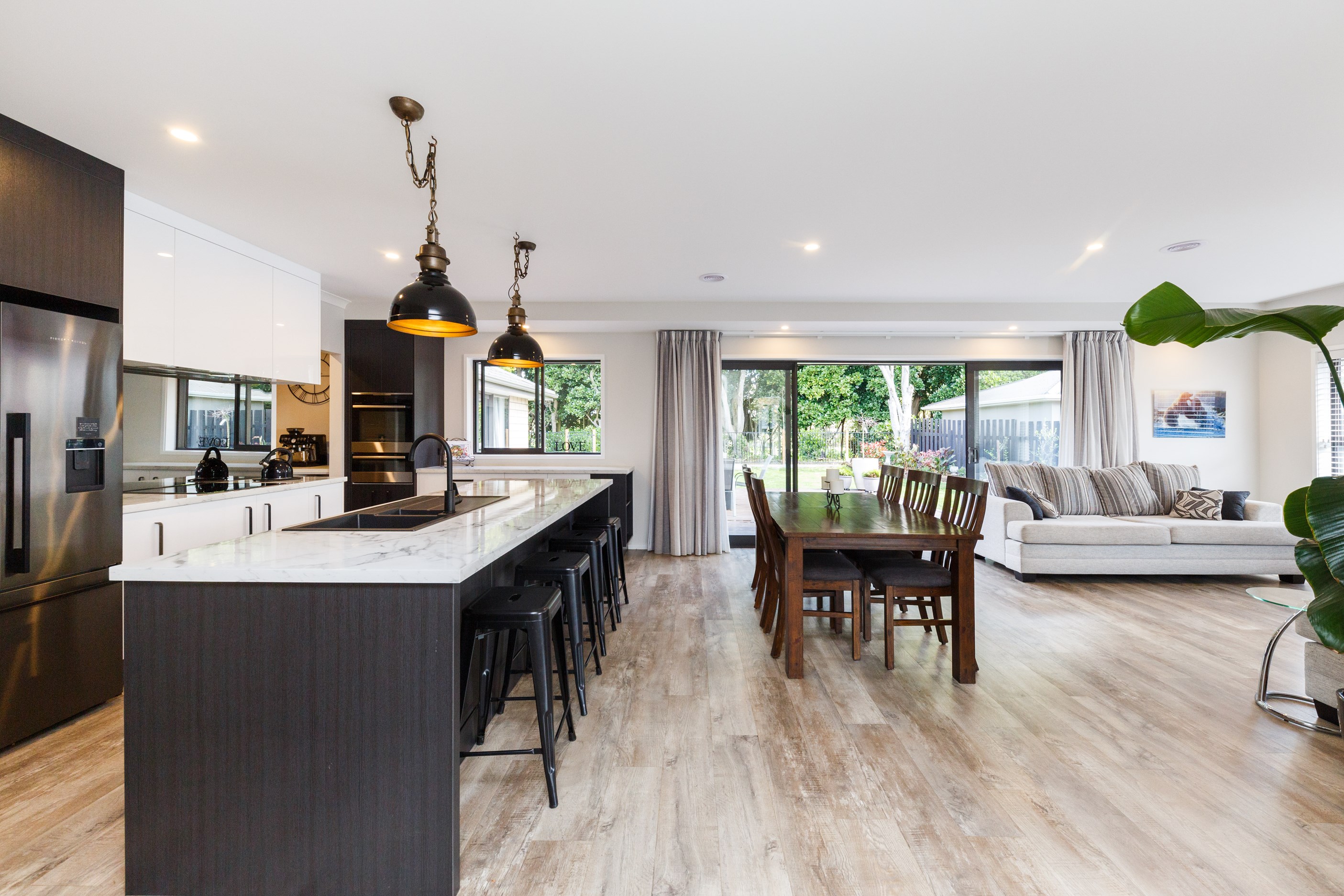 The open-plan living area has a vaulted ceiling to add a sense of space and allow for a steady flow of natural light. A designer kitchen features modern, sleek lines and statement black tapware, and has a walk-in pantry. A second lounge ensures everyone has plenty of space in which to entertain and relax, while an offi ce means that studying or working from home is never a problem.