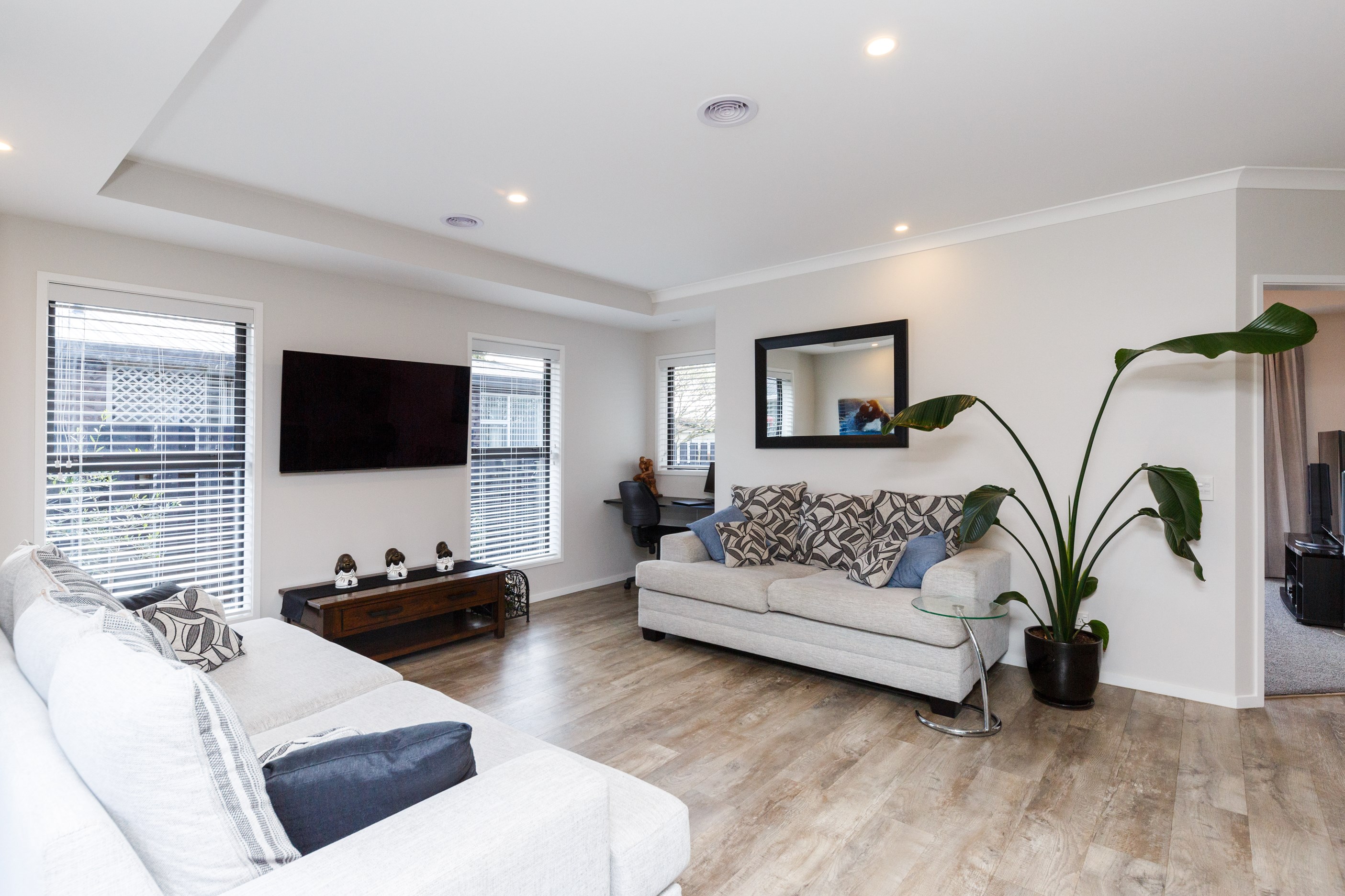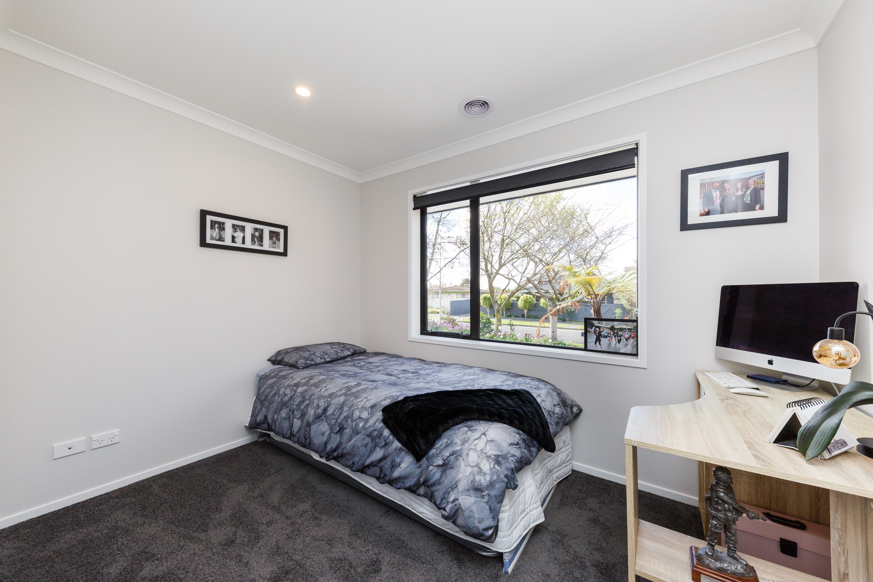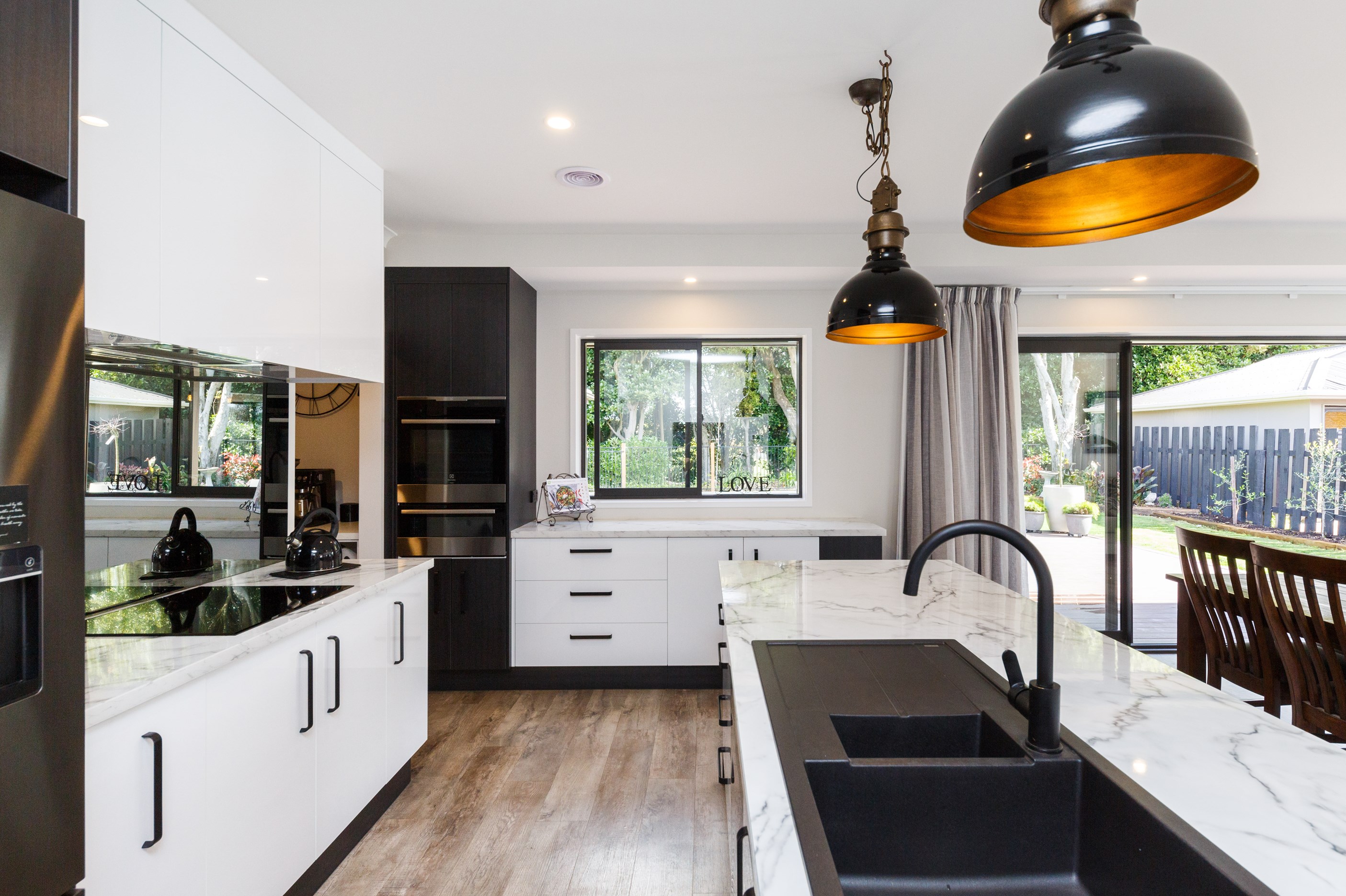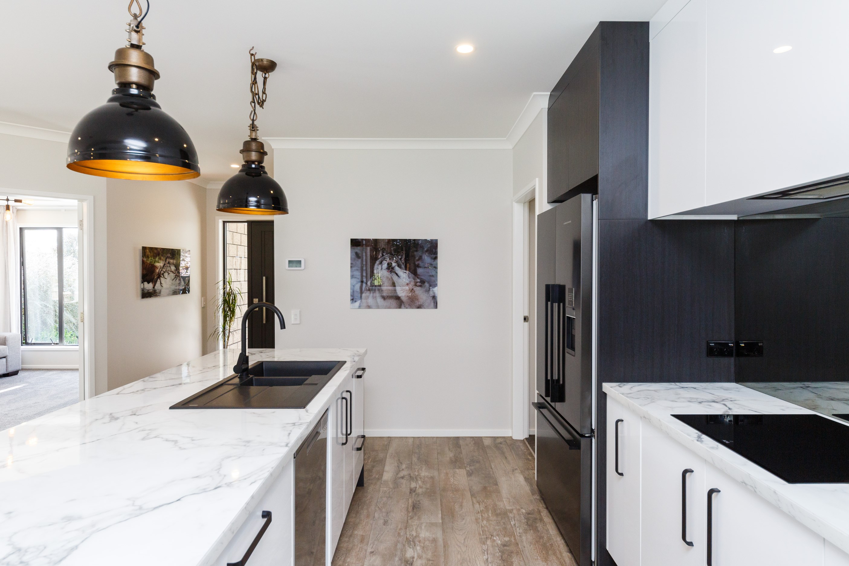 The open-plan living area has a vaulted ceiling to add a sense of space and allow for a steady flow of natural light. A designer kitchen features modern, sleek lines and statement black tapware, and has a walk-in pantry. A second lounge ensures everyone has plenty of space in which to entertain and relax, while an offi ce means that studying or working from home is never a problem.