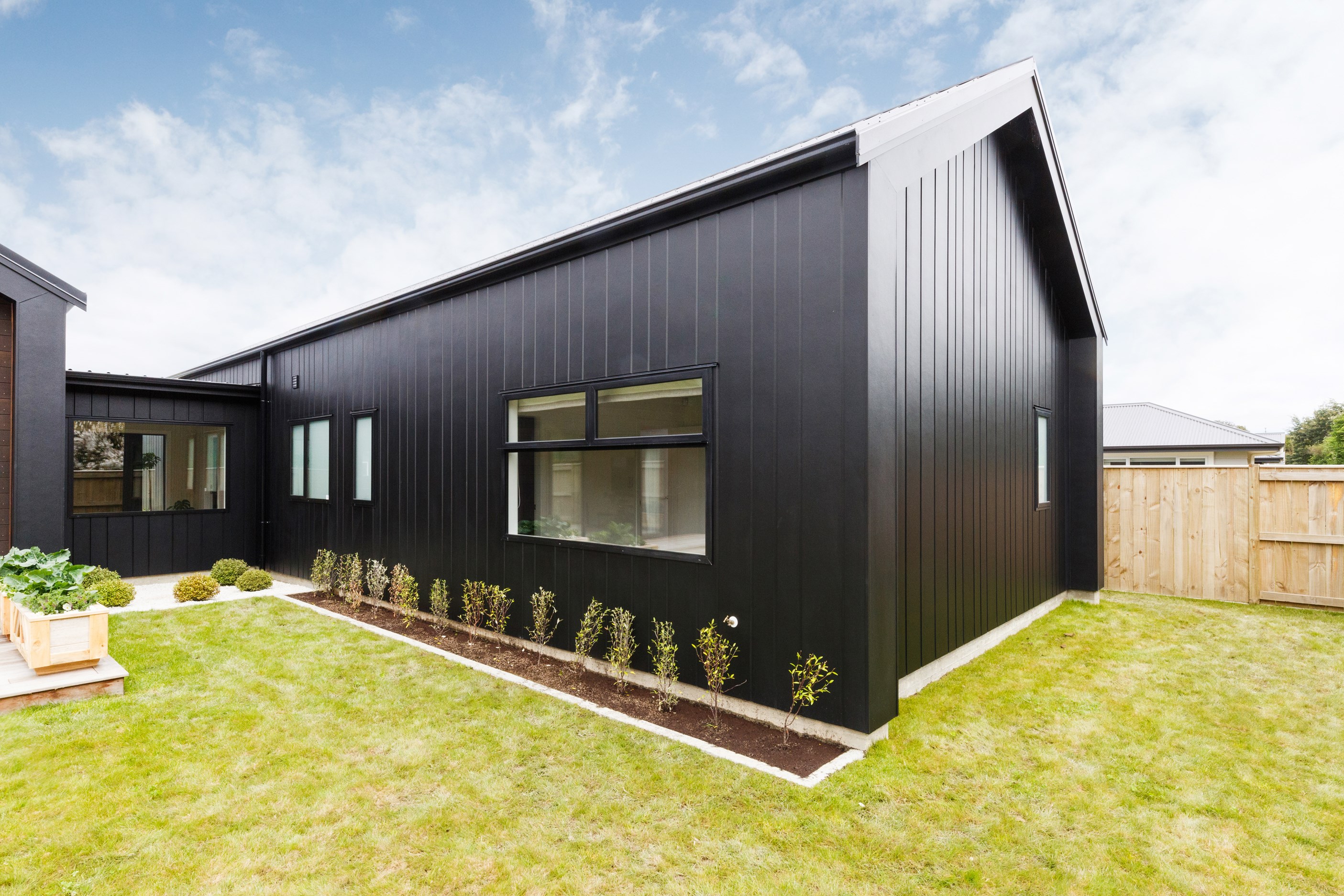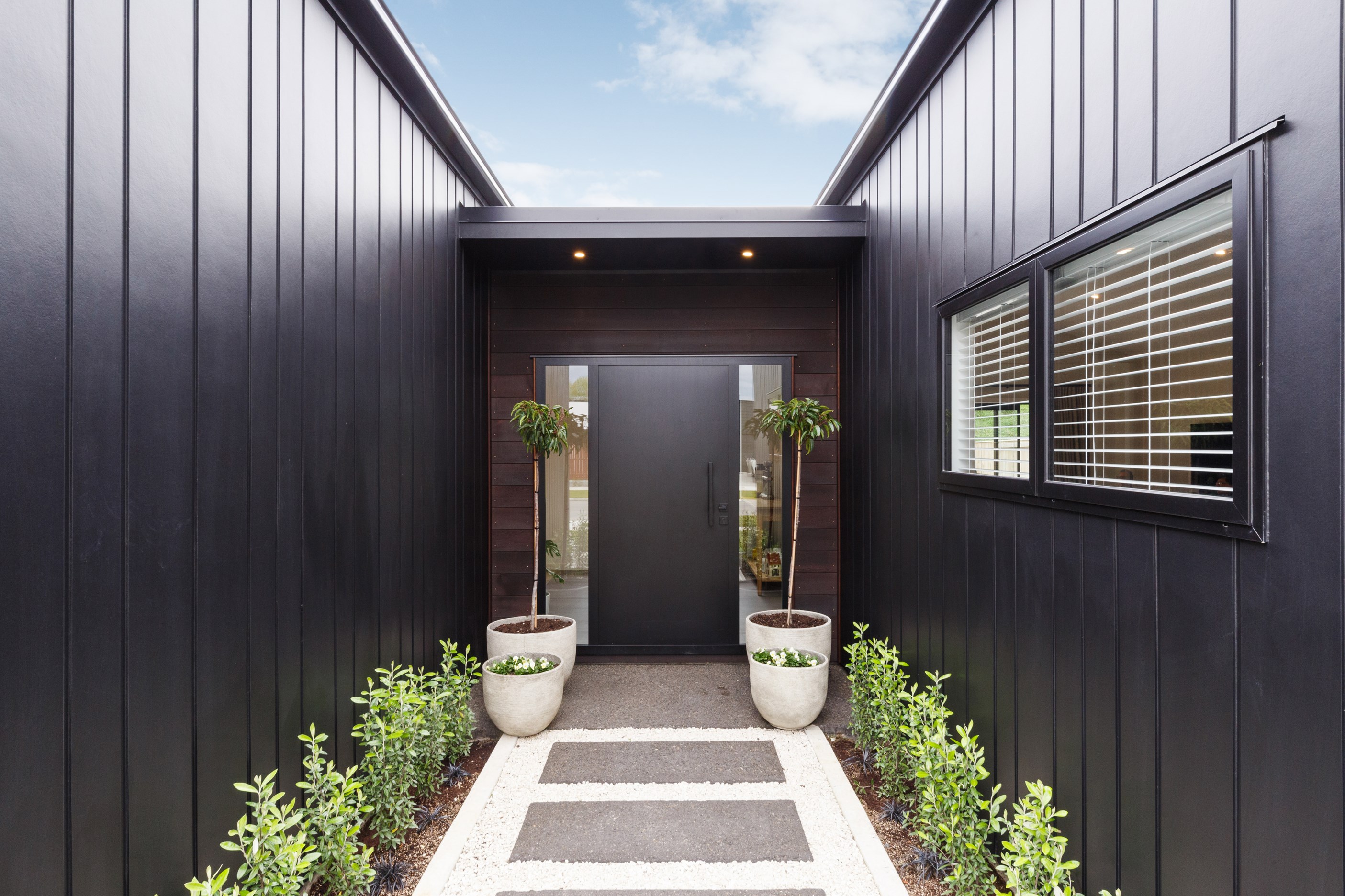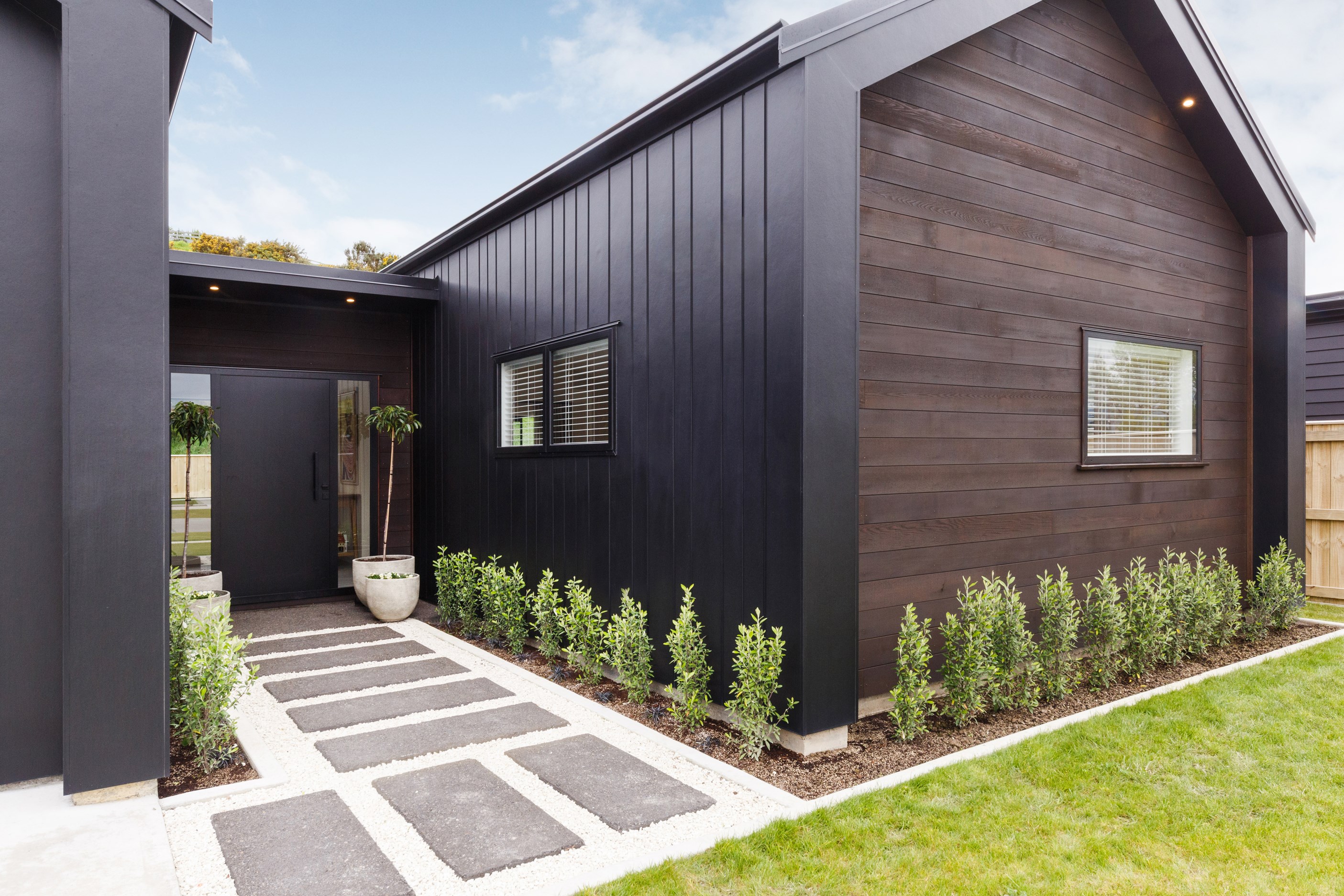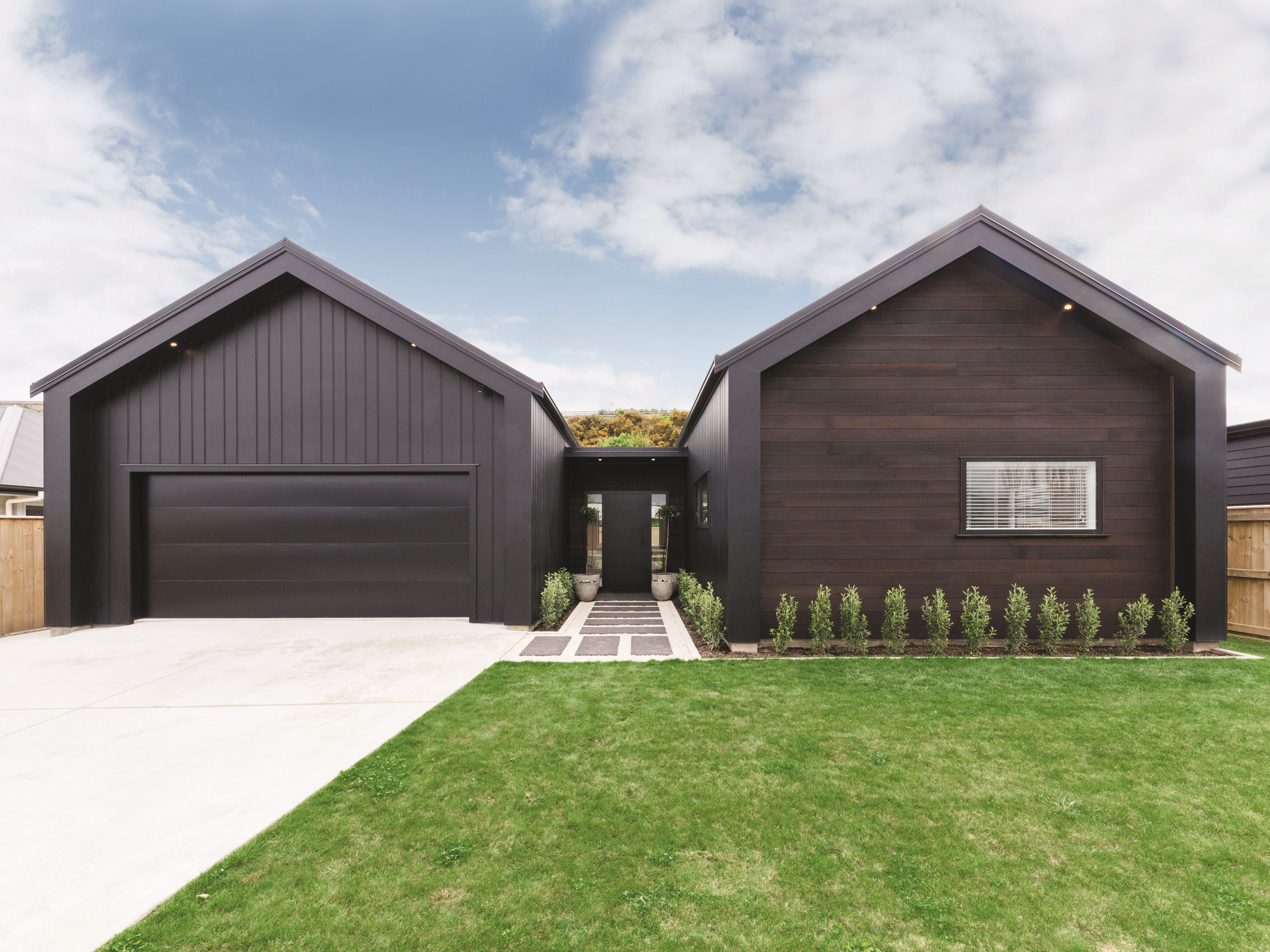 Two distinct pavilions greet visitors to this dark and distinctive Palmerston North home. Linea Oblique weatherboard and New Zealand cedar cladding bring drama to the external walls and create a stylish architectural facade in the new subdivision.