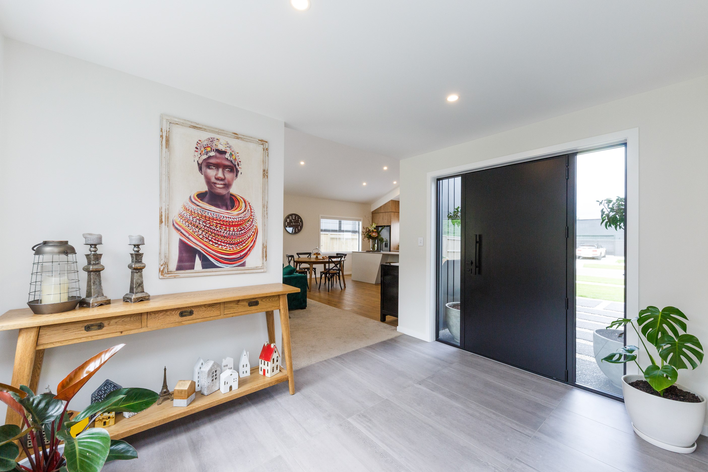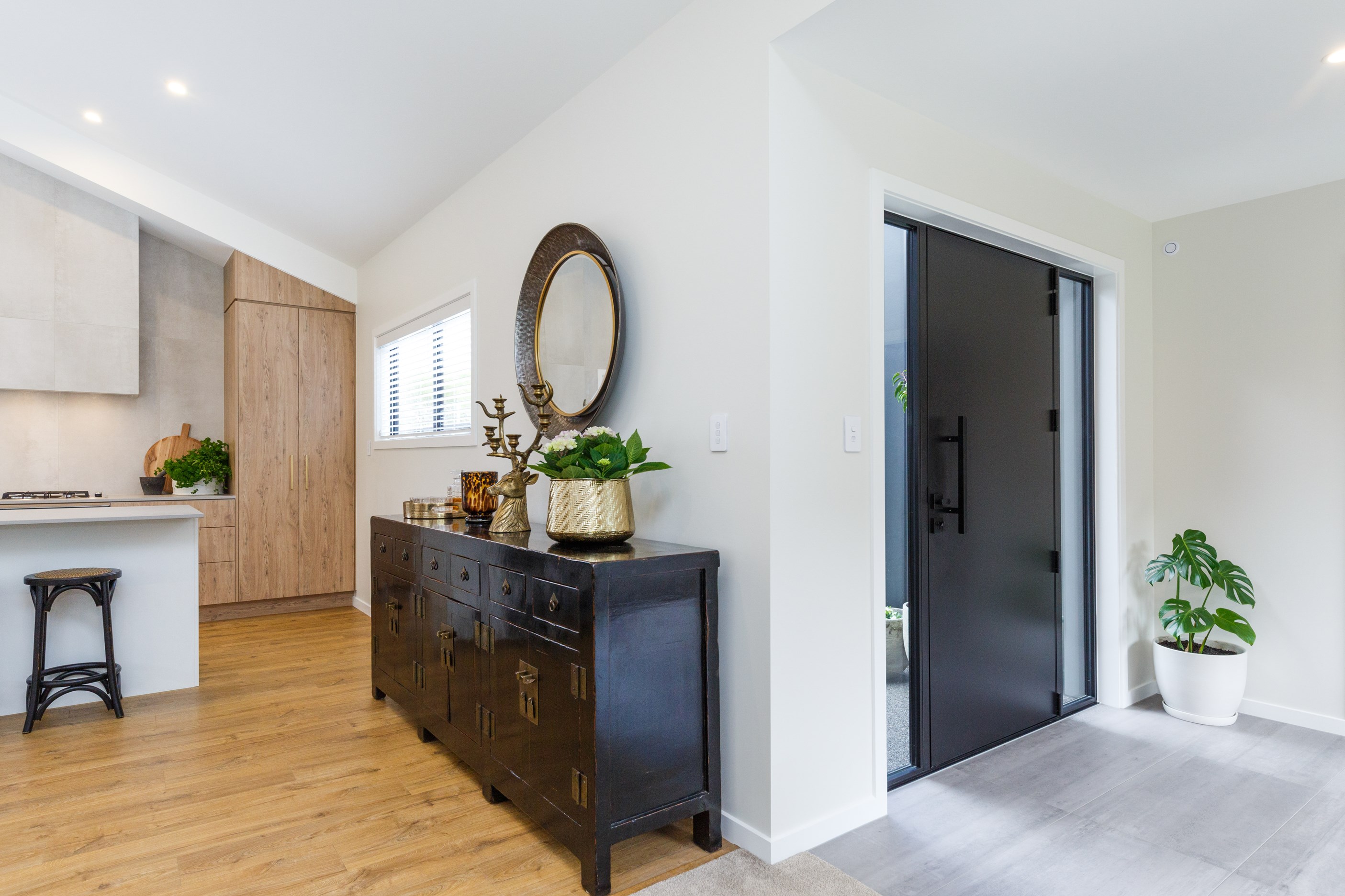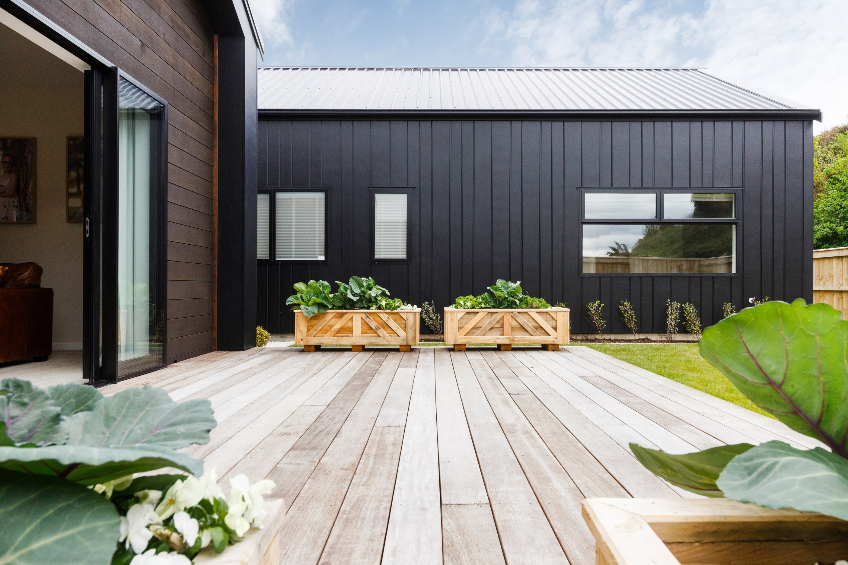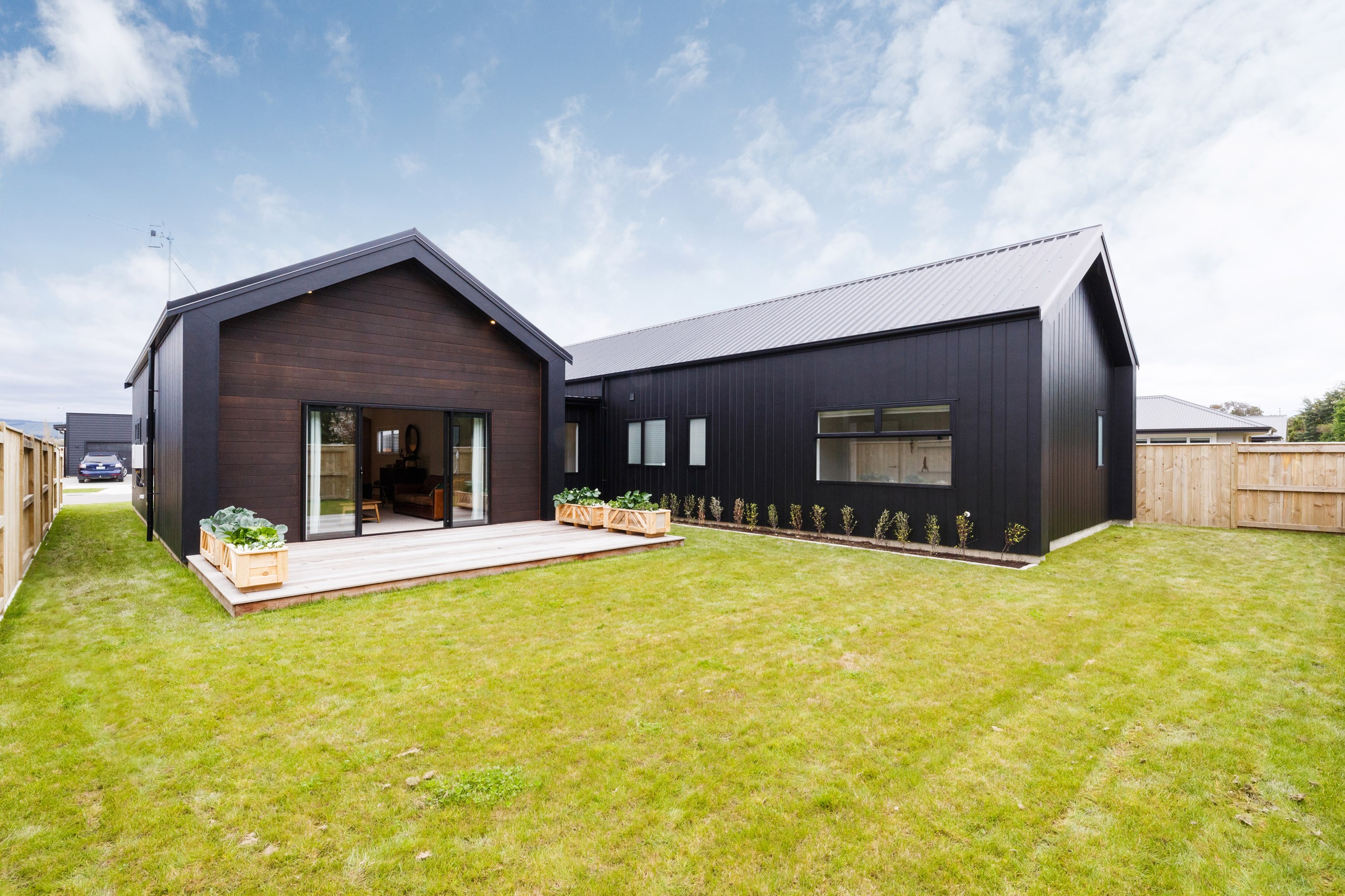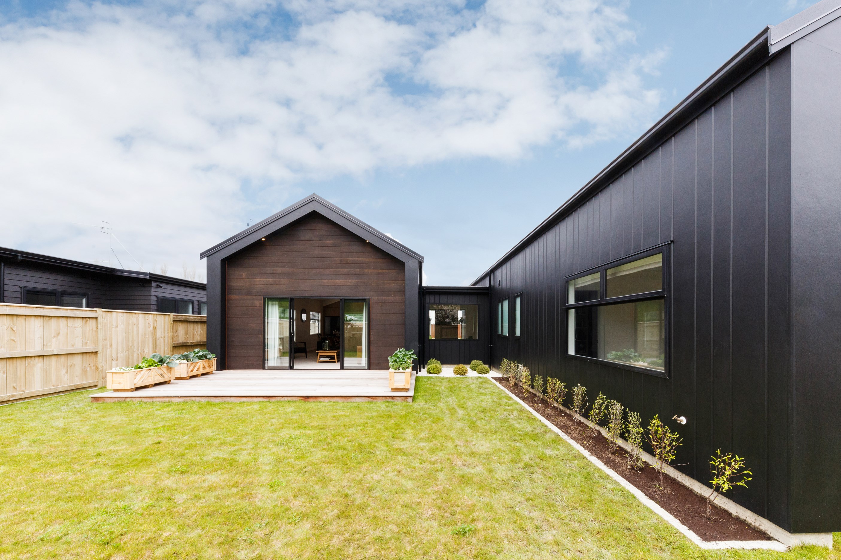 Two distinct pavilions greet visitors to this dark and distinctive Palmerston North home. Linea Oblique weatherboard and New Zealand cedar cladding bring drama to the external walls and create a stylish architectural facade in the new subdivision.